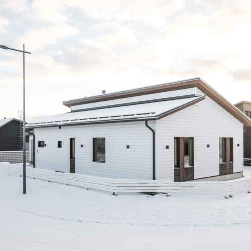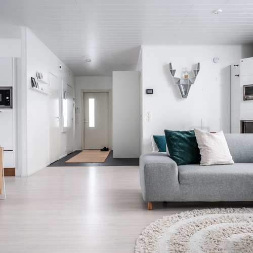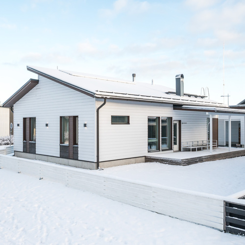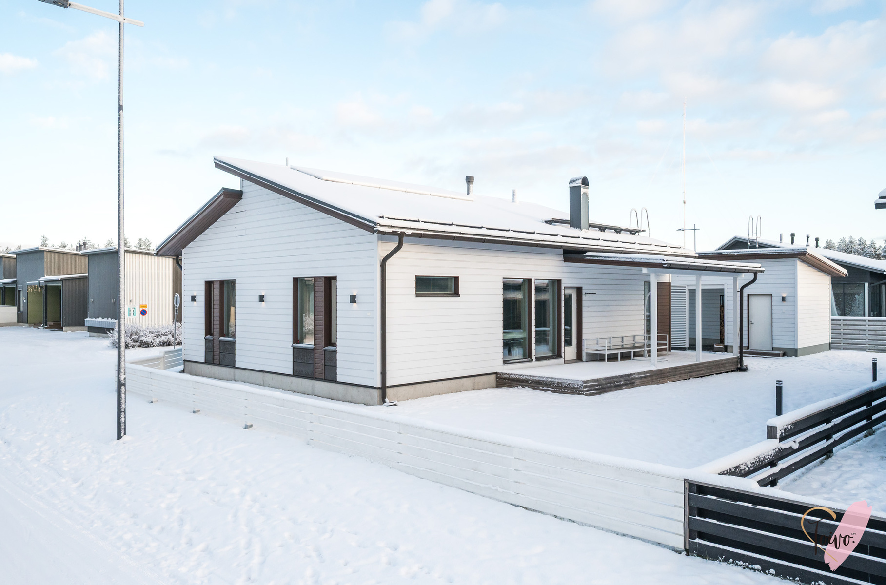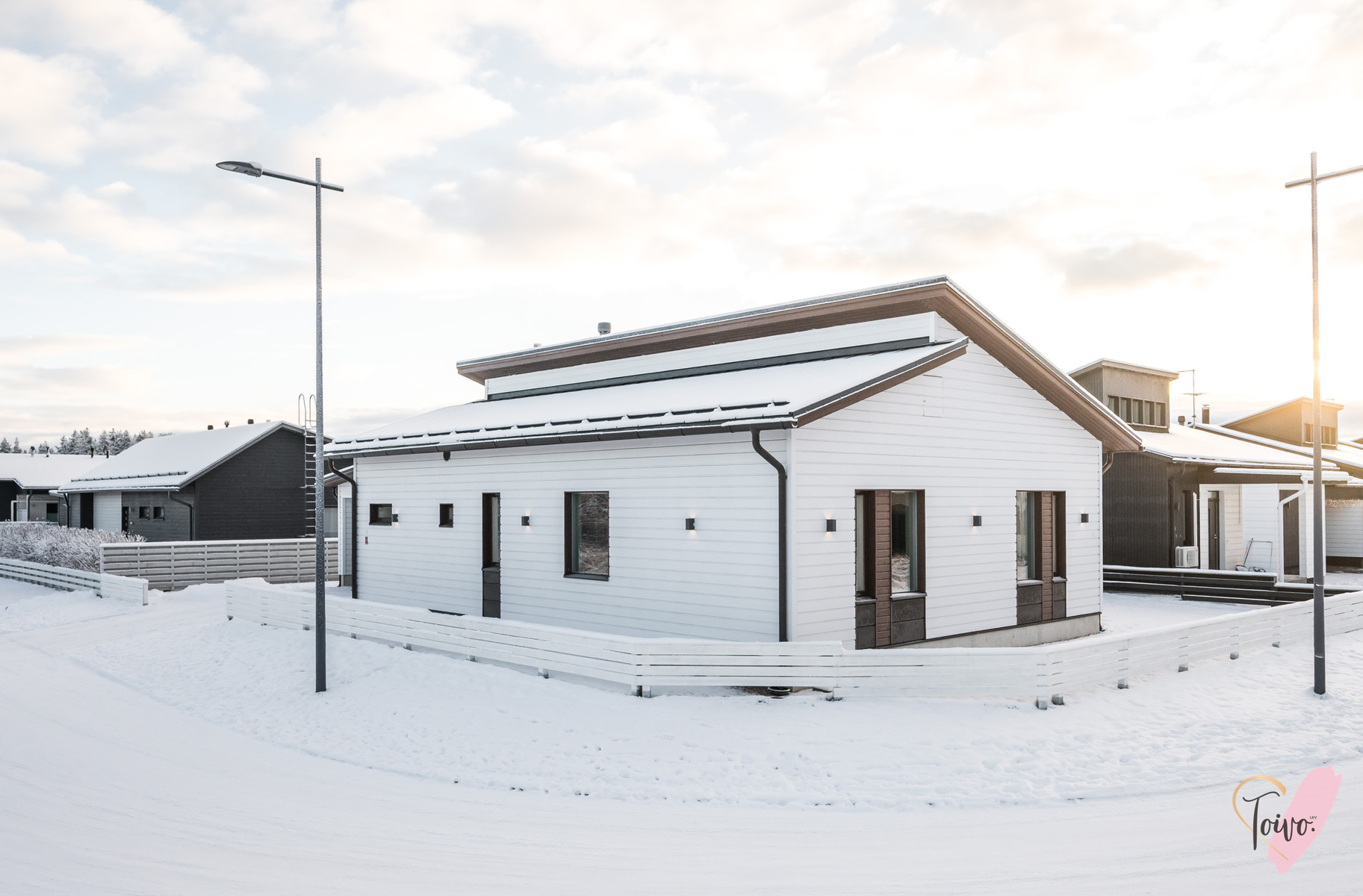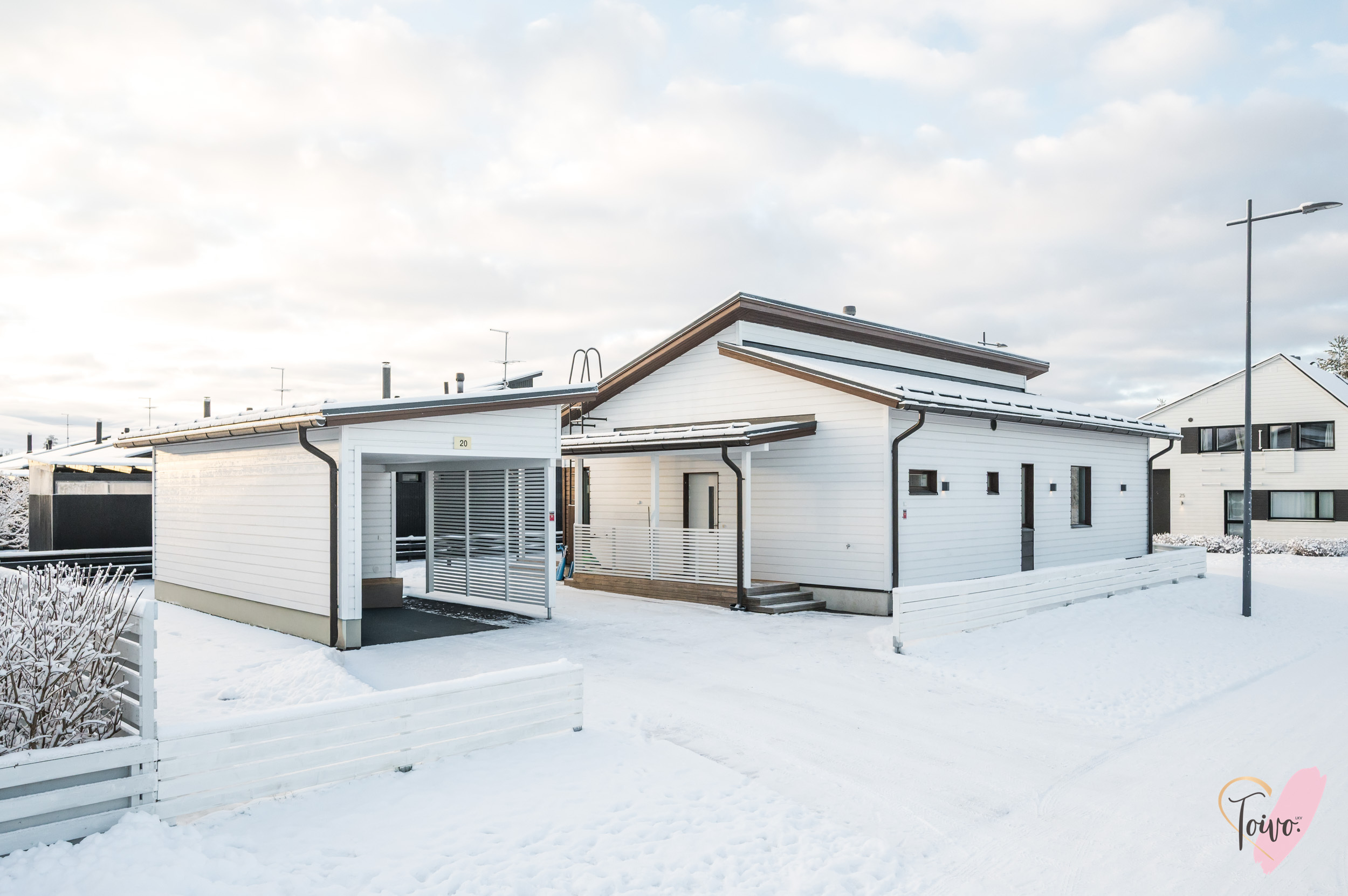 Tämän kodin valkoinen, selkeälinjainen julkisivu toivottaa tulijan lämpimästi tervetulleeksi jo pihapiirissä. Auton saa ajettua kätevästi autokatokseen aivan sisäänkäynnin viereen, mikä tekee kotiin saapumisesta helppoa vuoden ympäri.