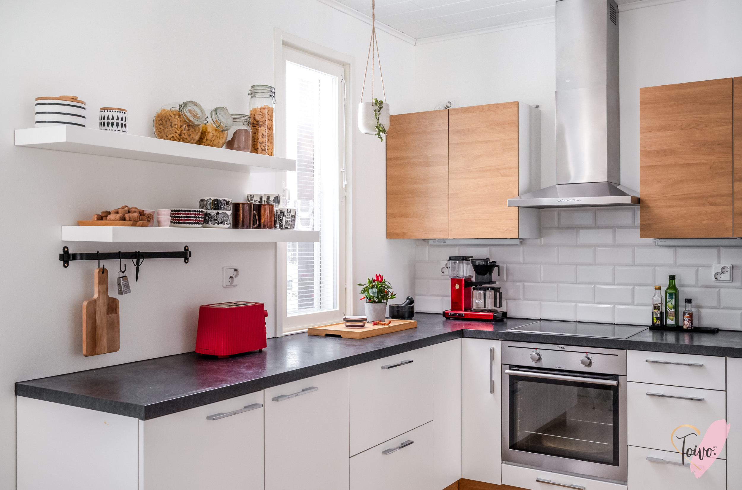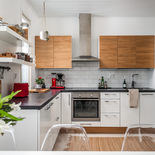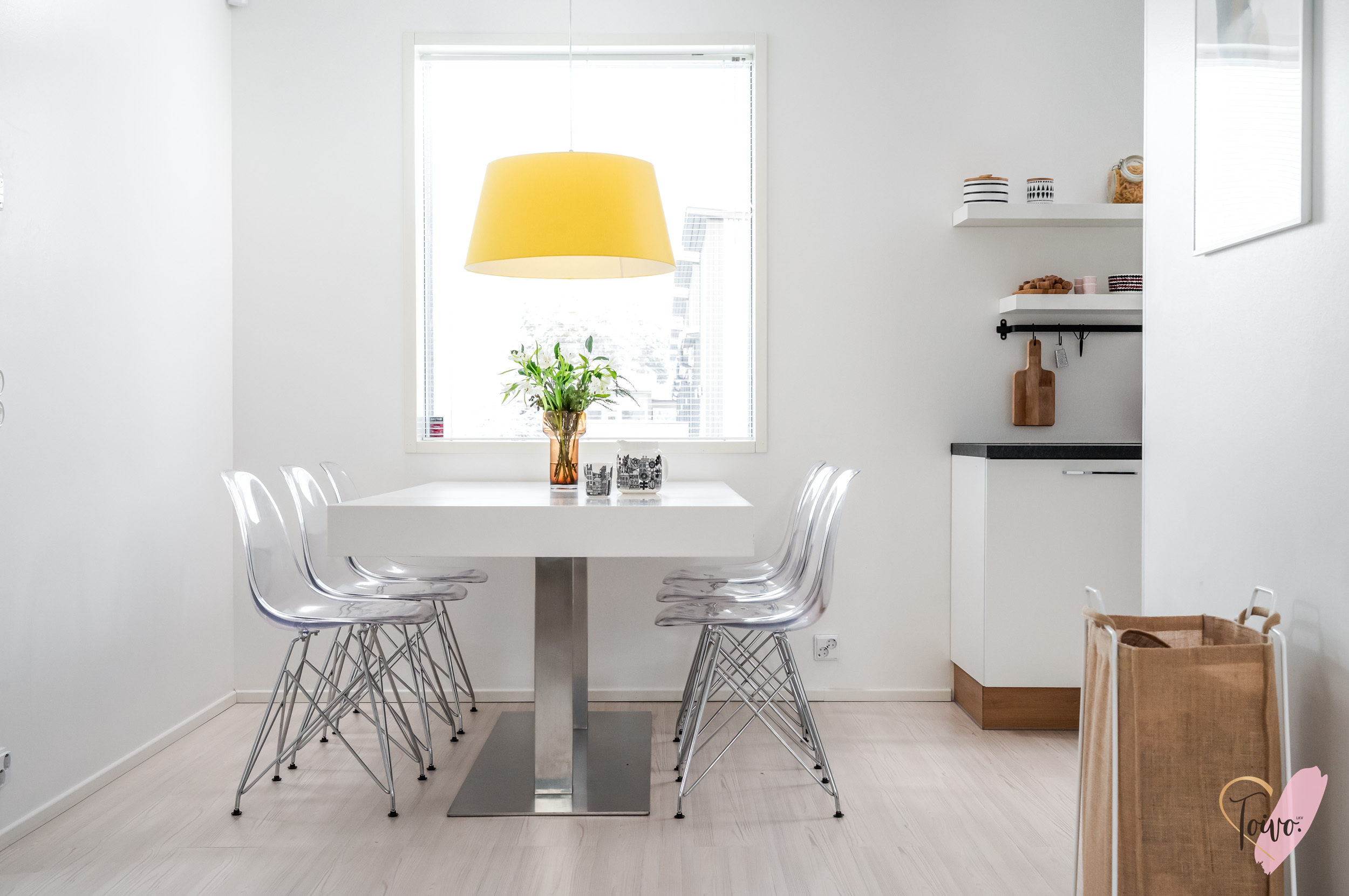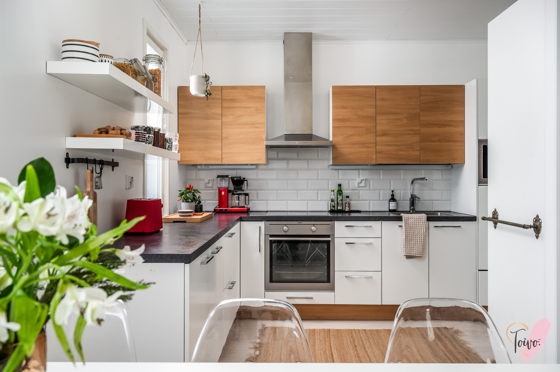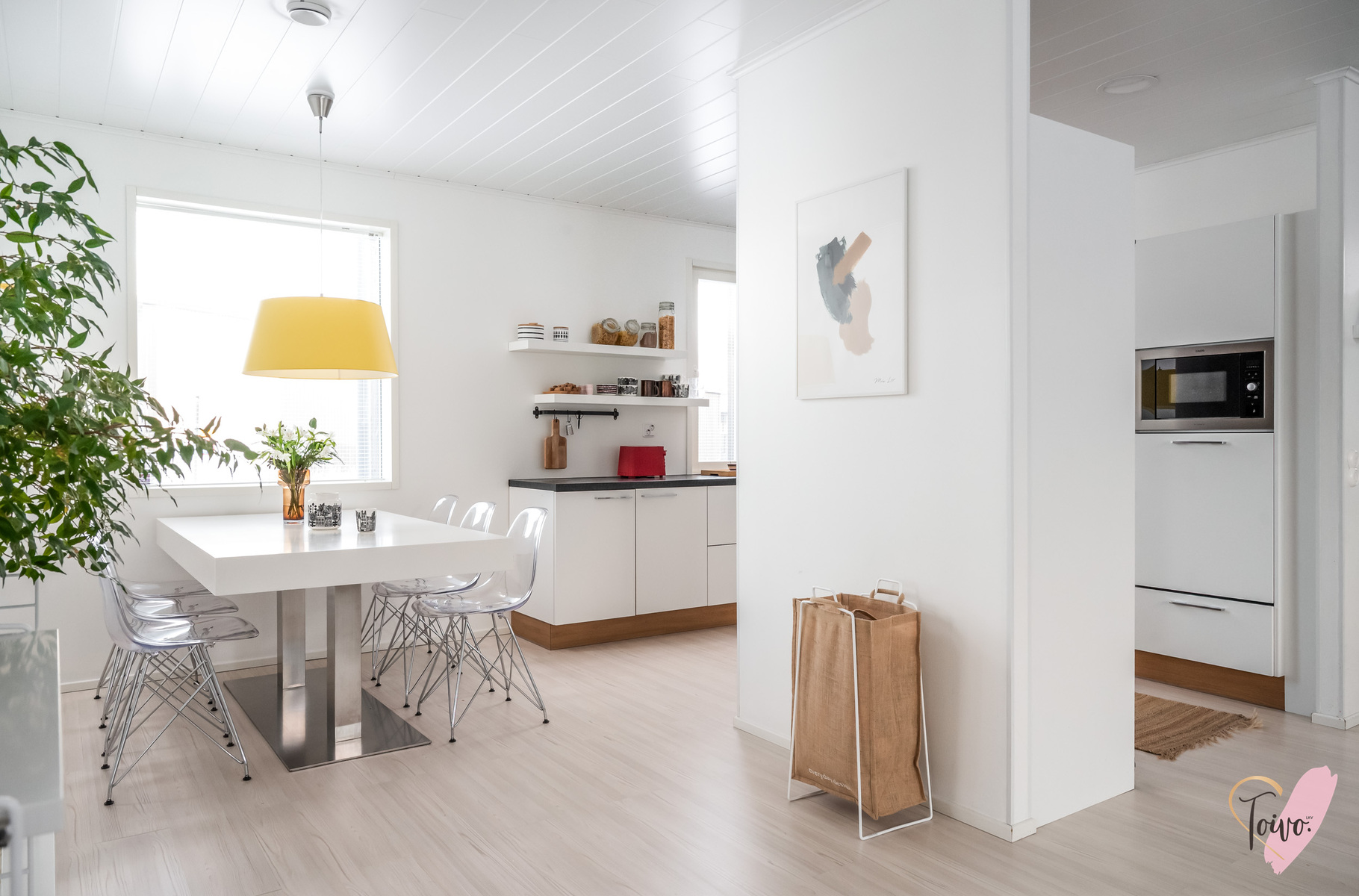 Ruokailutila on omassa rauhassaan ikkunoiden alla, josta on mukava seurata pihan tapahtumia tai jutustella keittiöön ja olohuoneeseen. Keittiön kaapistot on sijoiteltu kahdelle seinälle niin, että säilytys- ja laskutilaa on runsaasti. Valkoisen ja tammen sävyinen kalustus on ajaton sekä rauhallinen ratkaisu ja kylmälaitteet ovat kätevästi omalla seinällään keittiön ja ruokailutilan välissä.