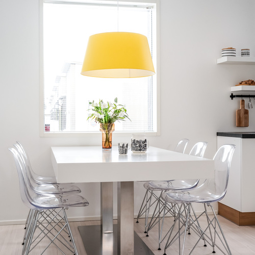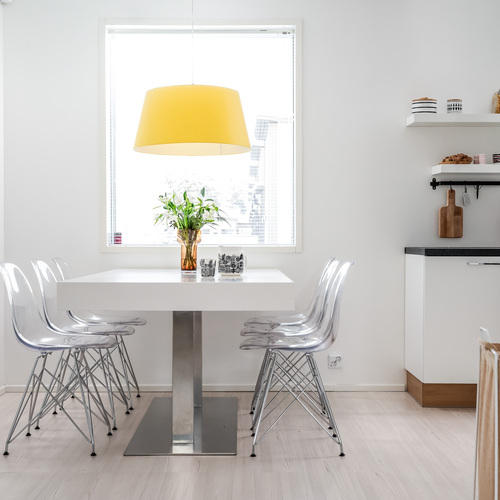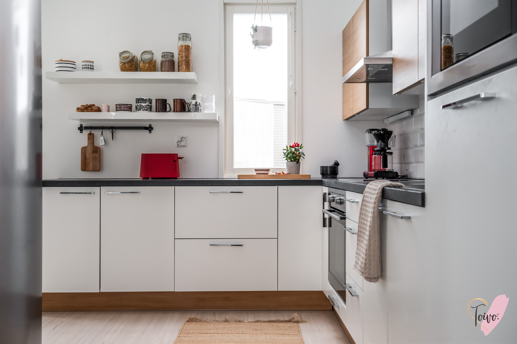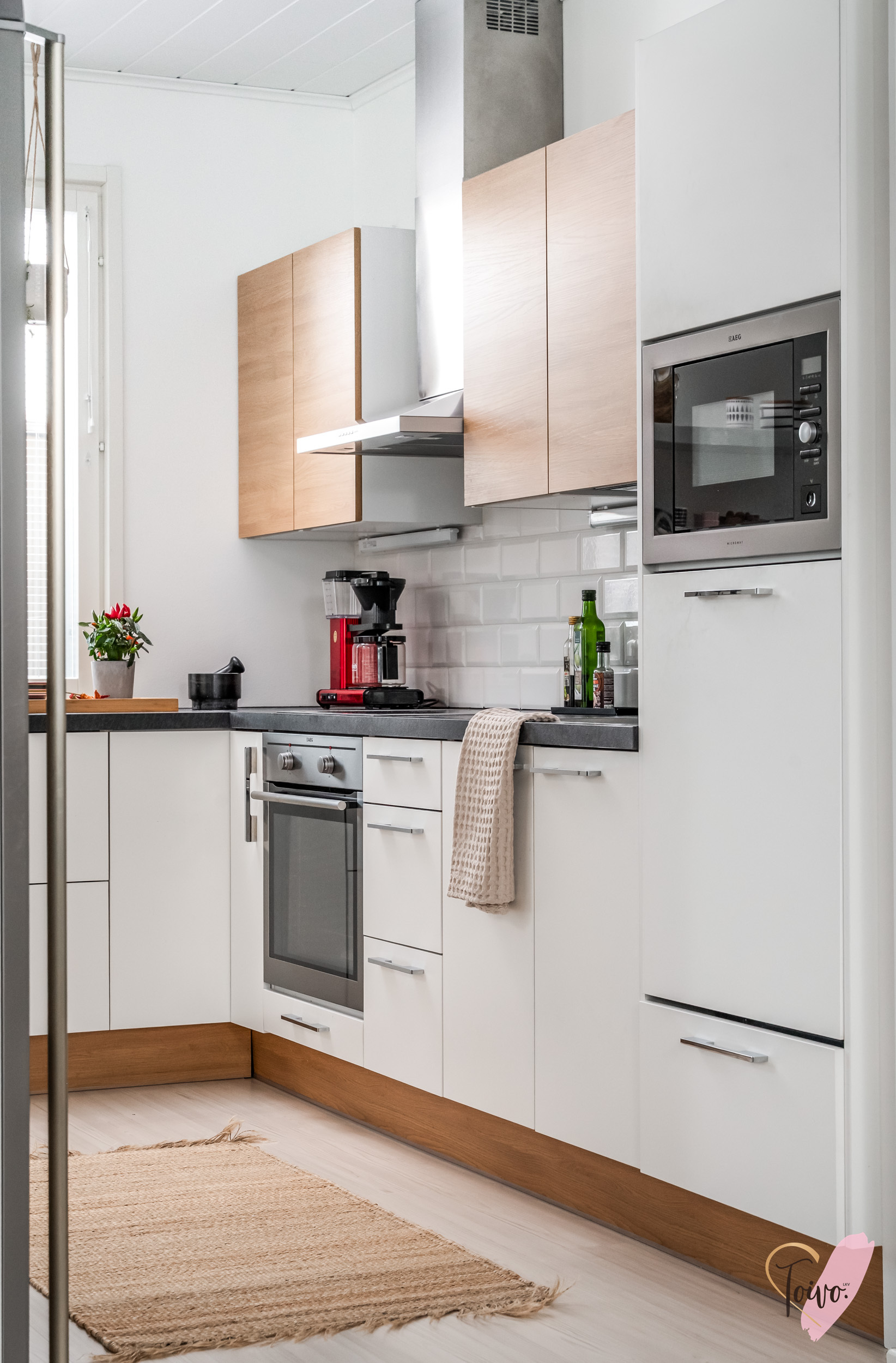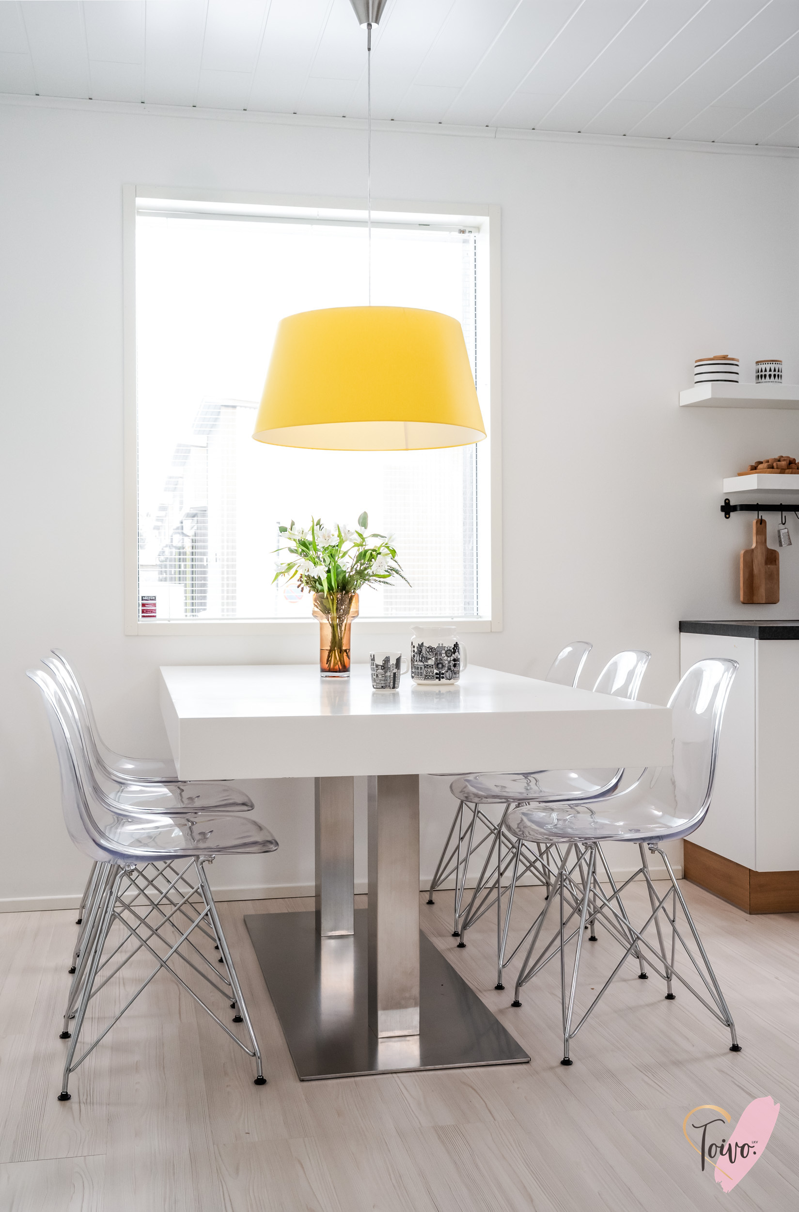 Ruokailutila on omassa rauhassaan ikkunoiden alla, josta on mukava seurata pihan tapahtumia tai jutustella keittiöön ja olohuoneeseen. Keittiön kaapistot on sijoiteltu kahdelle seinälle niin, että säilytys- ja laskutilaa on runsaasti. Valkoisen ja tammen sävyinen kalustus on ajaton sekä rauhallinen ratkaisu ja kylmälaitteet ovat kätevästi omalla seinällään keittiön ja ruokailutilan välissä.