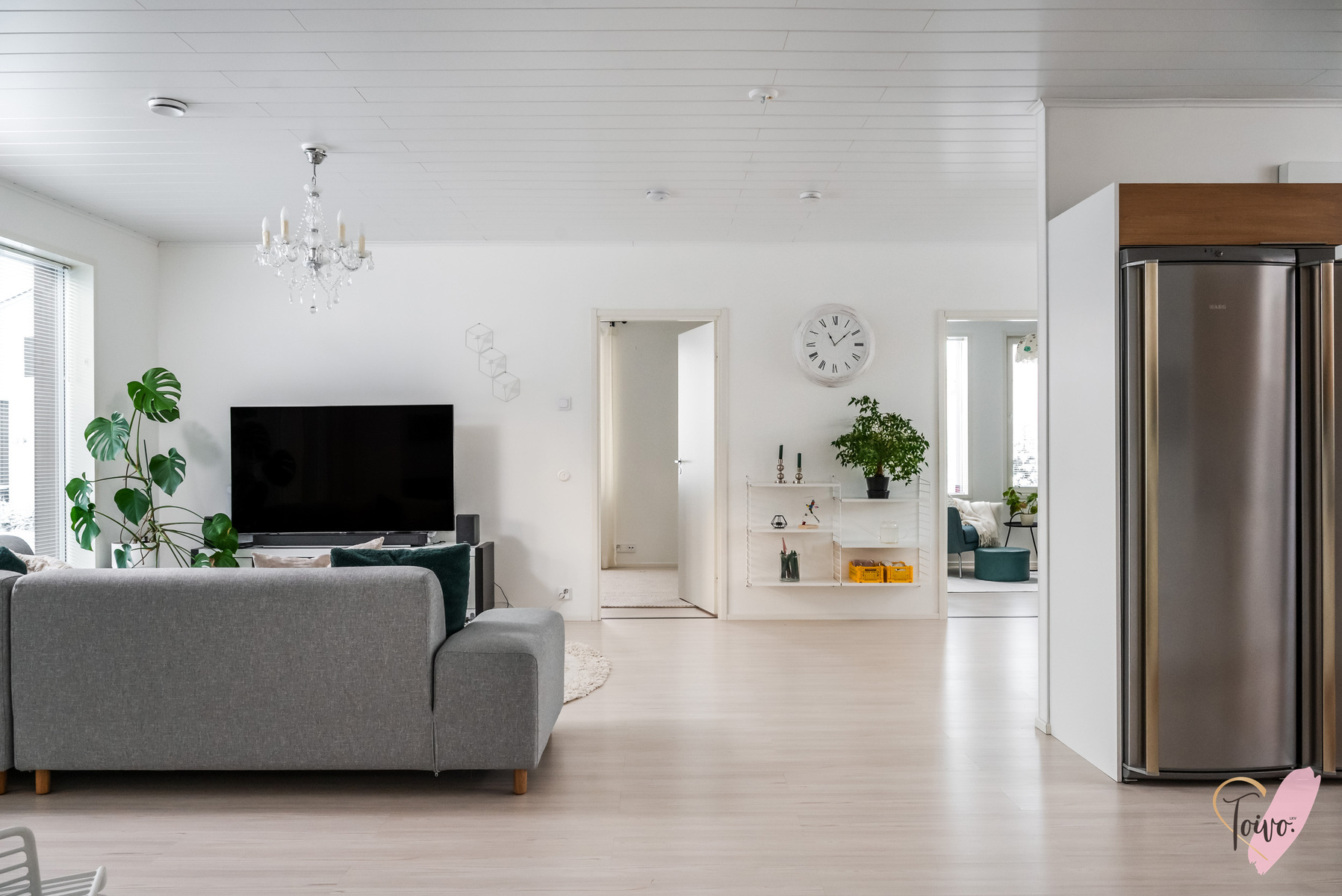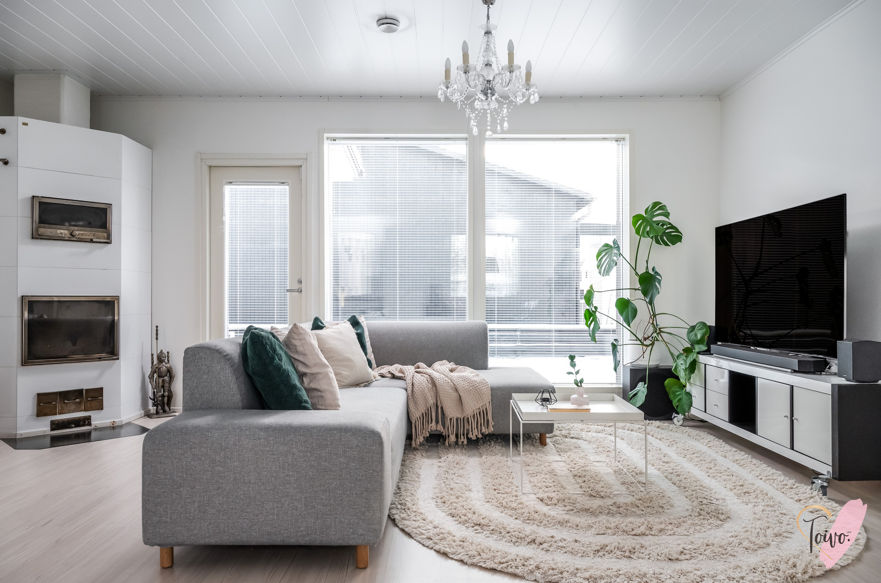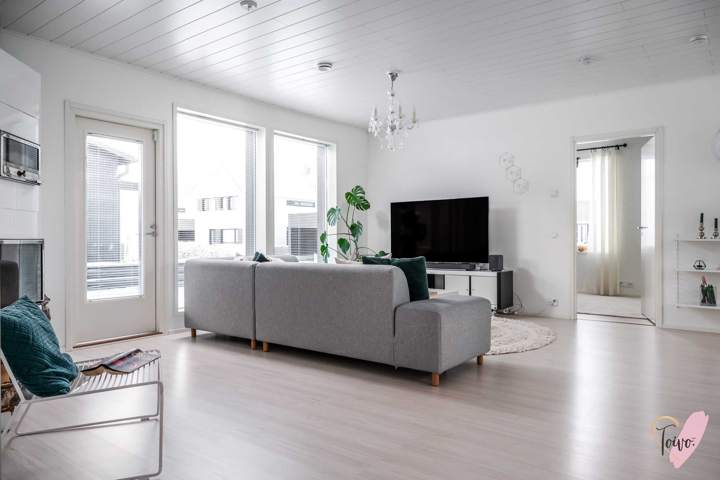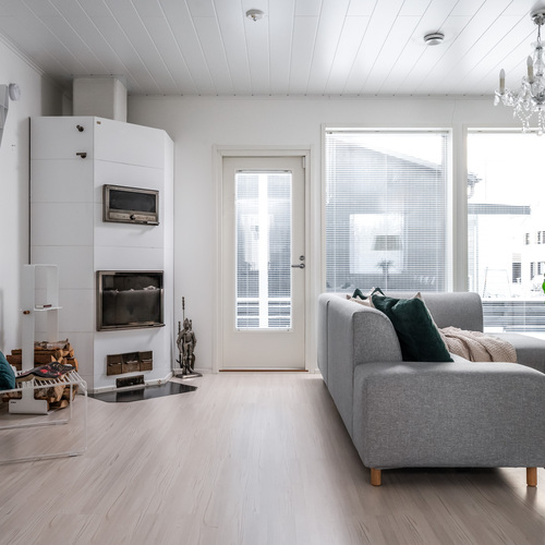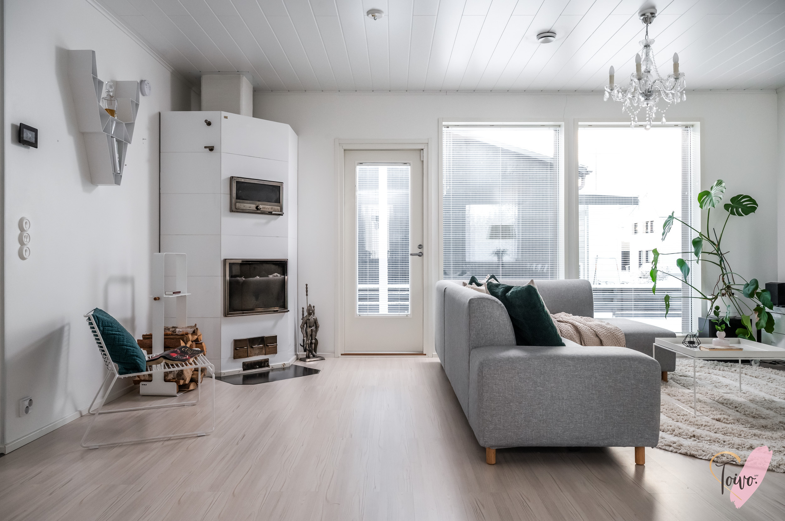 Kodin sydän avautuu eteisestä eteenpäin, kun valoisa ja avara olohuone levittäytyy ympärilleen. Suuret ikkunat tuovat sisään luonnonvaloa ja korostavat vaaleita pintoja kauniisti. Kulmaan sijoitettu varaava takka–leivinuuni tuo huonetilaan lämpöä ja tunnelmaa, joten talvi-iltojen rauha tuntuu täällä erityisen mukavalta. Olohuonetta vastapäätä sijaitseva keittiö jatkaa avointa, kodikasta kokonaisuutta.