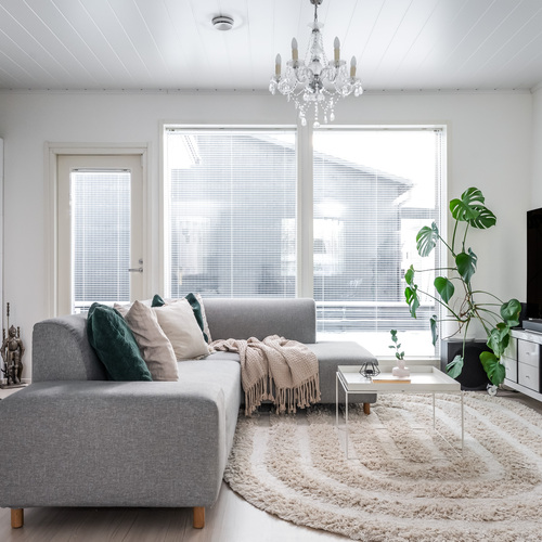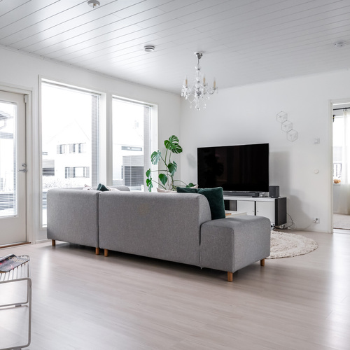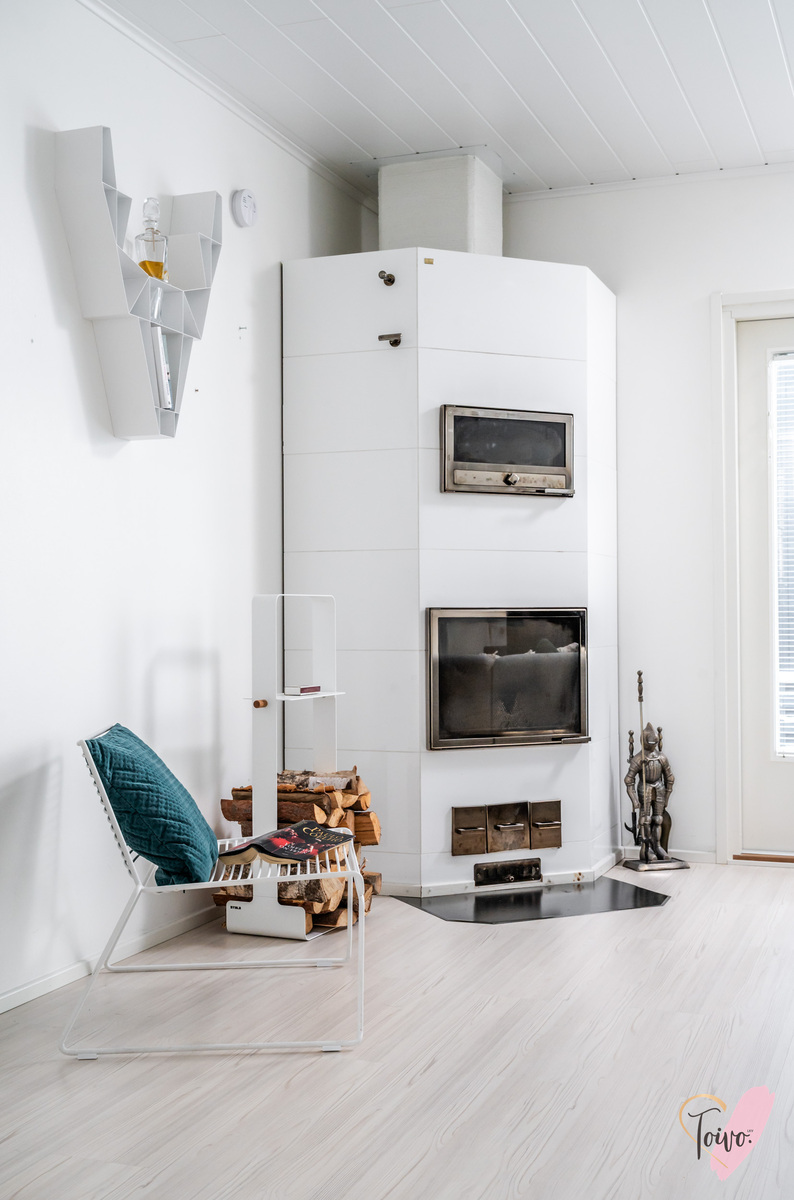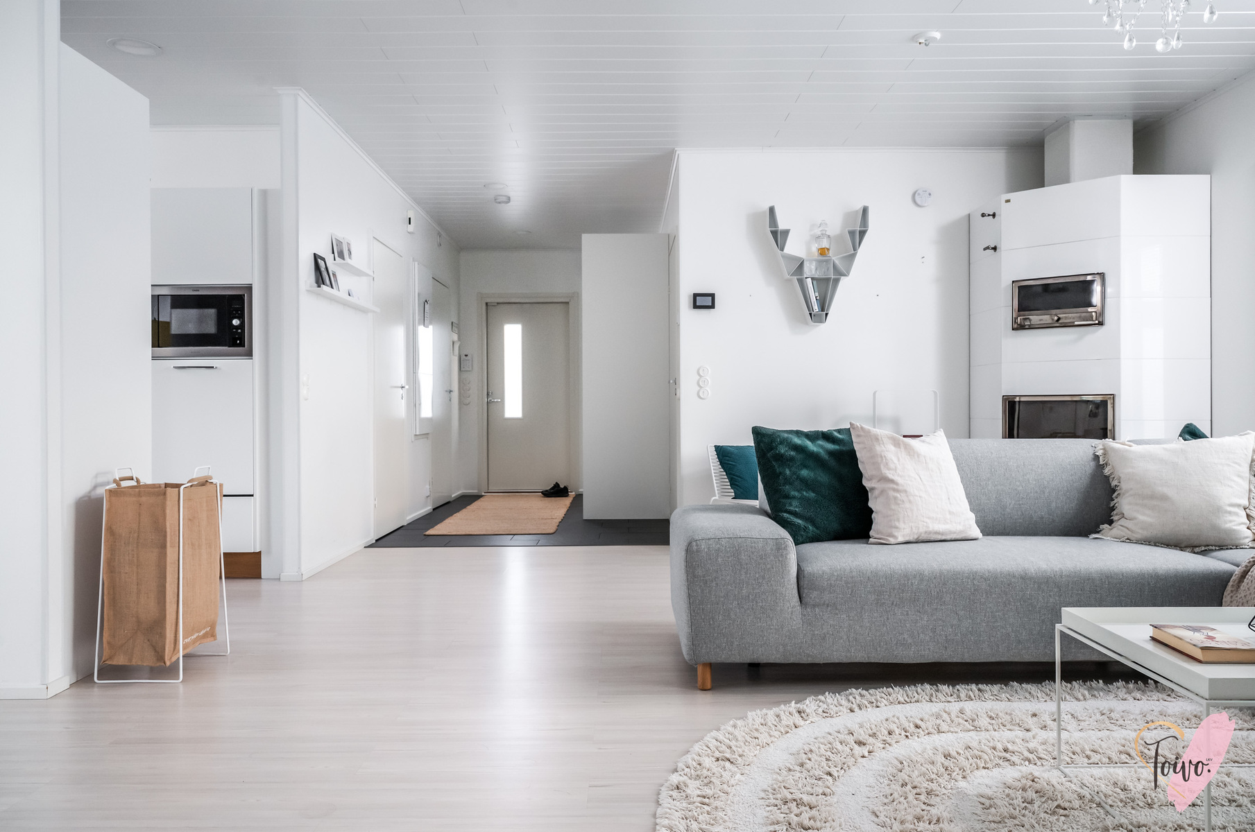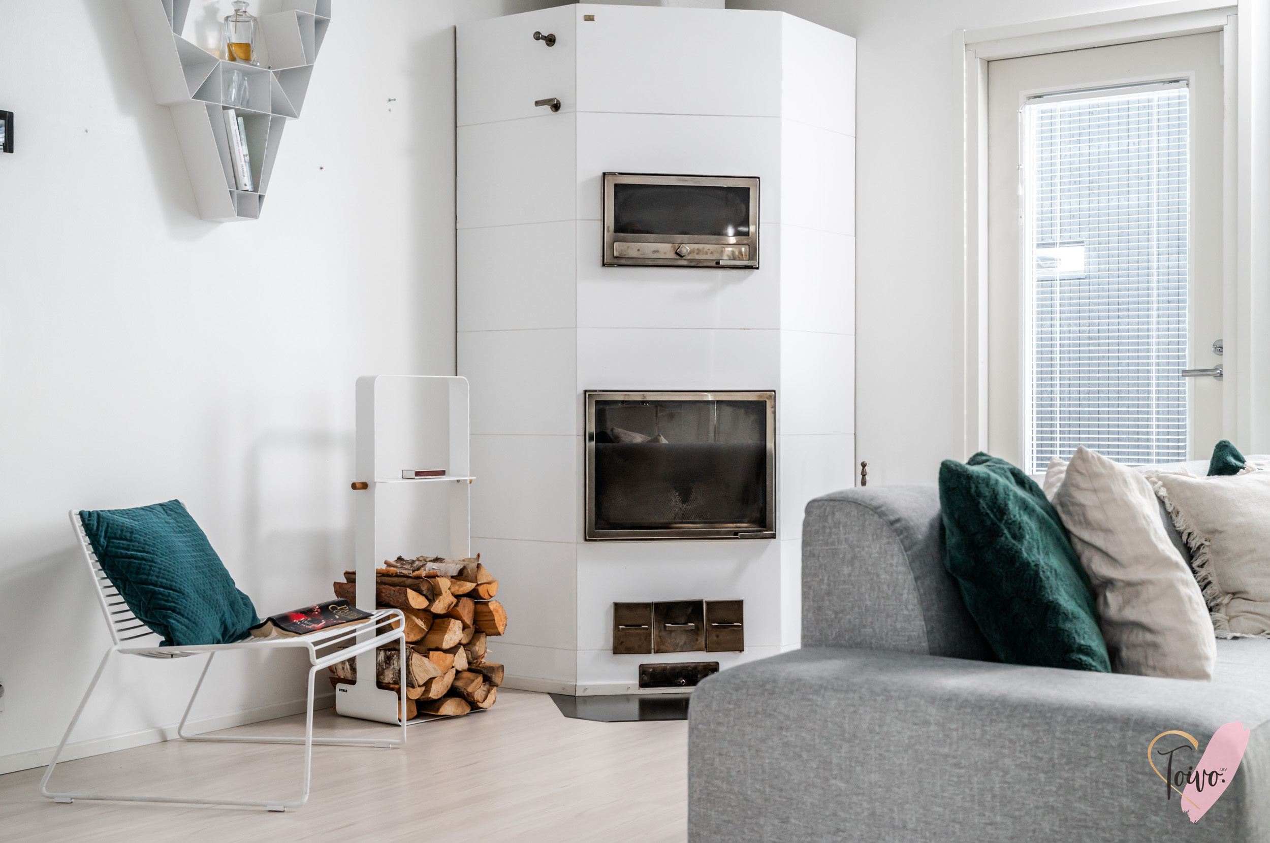 Kodin sydän avautuu eteisestä eteenpäin, kun valoisa ja avara olohuone levittäytyy ympärilleen. Suuret ikkunat tuovat sisään luonnonvaloa ja korostavat vaaleita pintoja kauniisti. Kulmaan sijoitettu varaava takka–leivinuuni tuo huonetilaan lämpöä ja tunnelmaa, joten talvi-iltojen rauha tuntuu täällä erityisen mukavalta. Olohuonetta vastapäätä sijaitseva keittiö jatkaa avointa, kodikasta kokonaisuutta.
