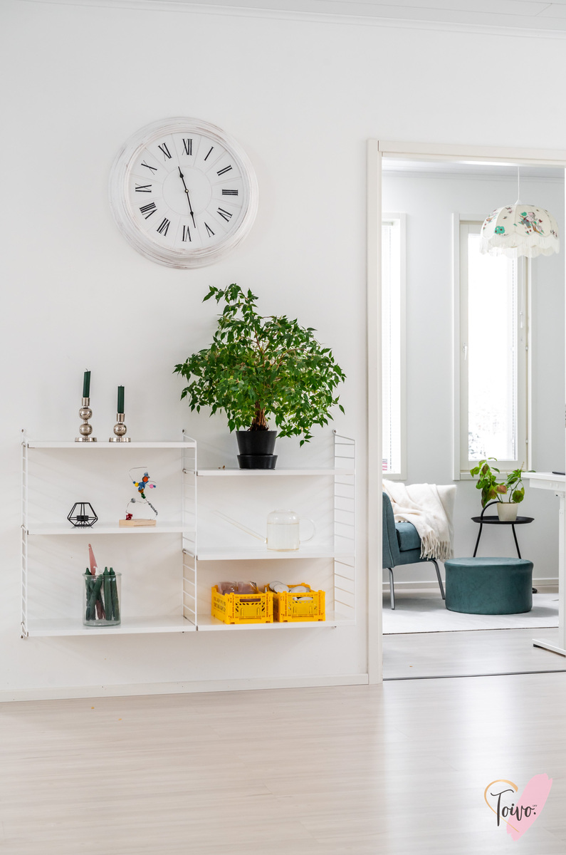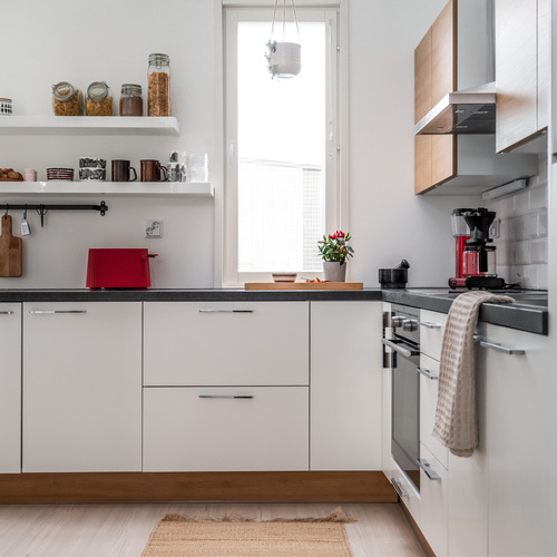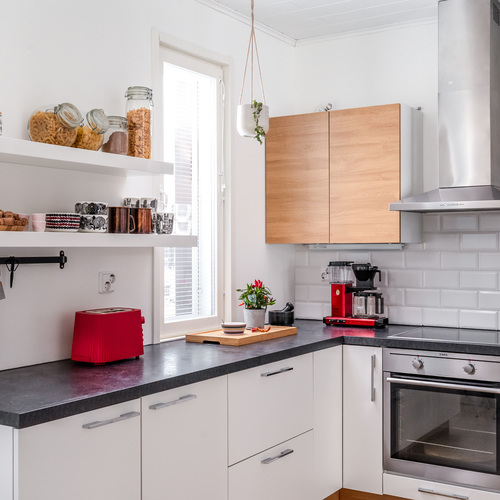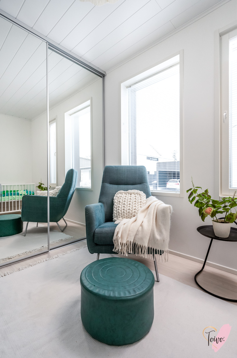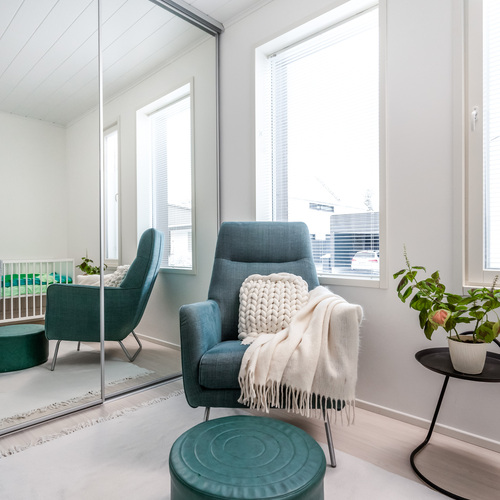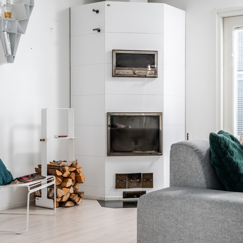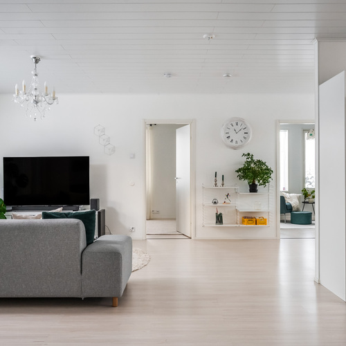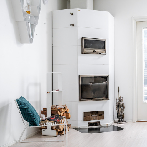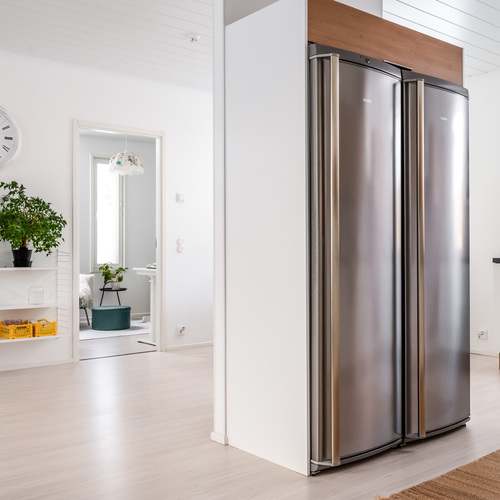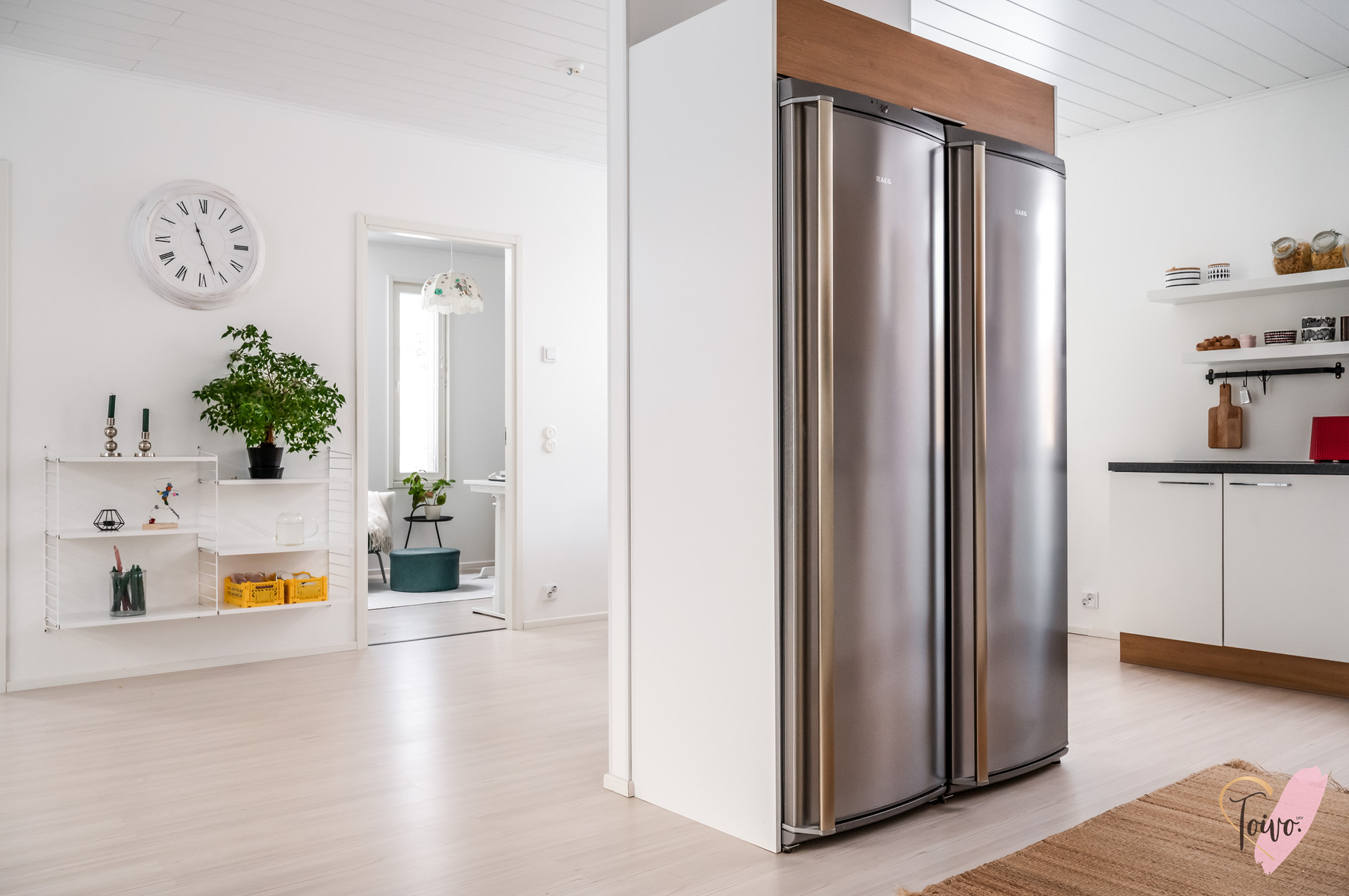 Kodin sydän avautuu eteisestä eteenpäin, kun valoisa ja avara olohuone levittäytyy ympärilleen. Suuret ikkunat tuovat sisään luonnonvaloa ja korostavat vaaleita pintoja kauniisti. Kulmaan sijoitettu varaava takka–leivinuuni tuo huonetilaan lämpöä ja tunnelmaa, joten talvi-iltojen rauha tuntuu täällä erityisen mukavalta. Olohuonetta vastapäätä sijaitseva keittiö jatkaa avointa, kodikasta kokonaisuutta.