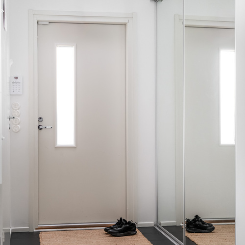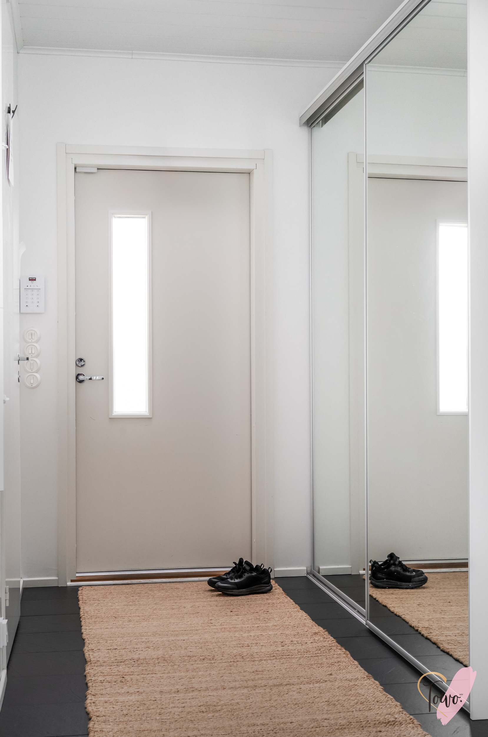 Sisällä avautuva eteinen on tilava ja käytännöllinen. Peililiukuovien taakse kätkeytyvä runsas säilytystila pitää arjen sujuvana ja näkymät selkeinä.