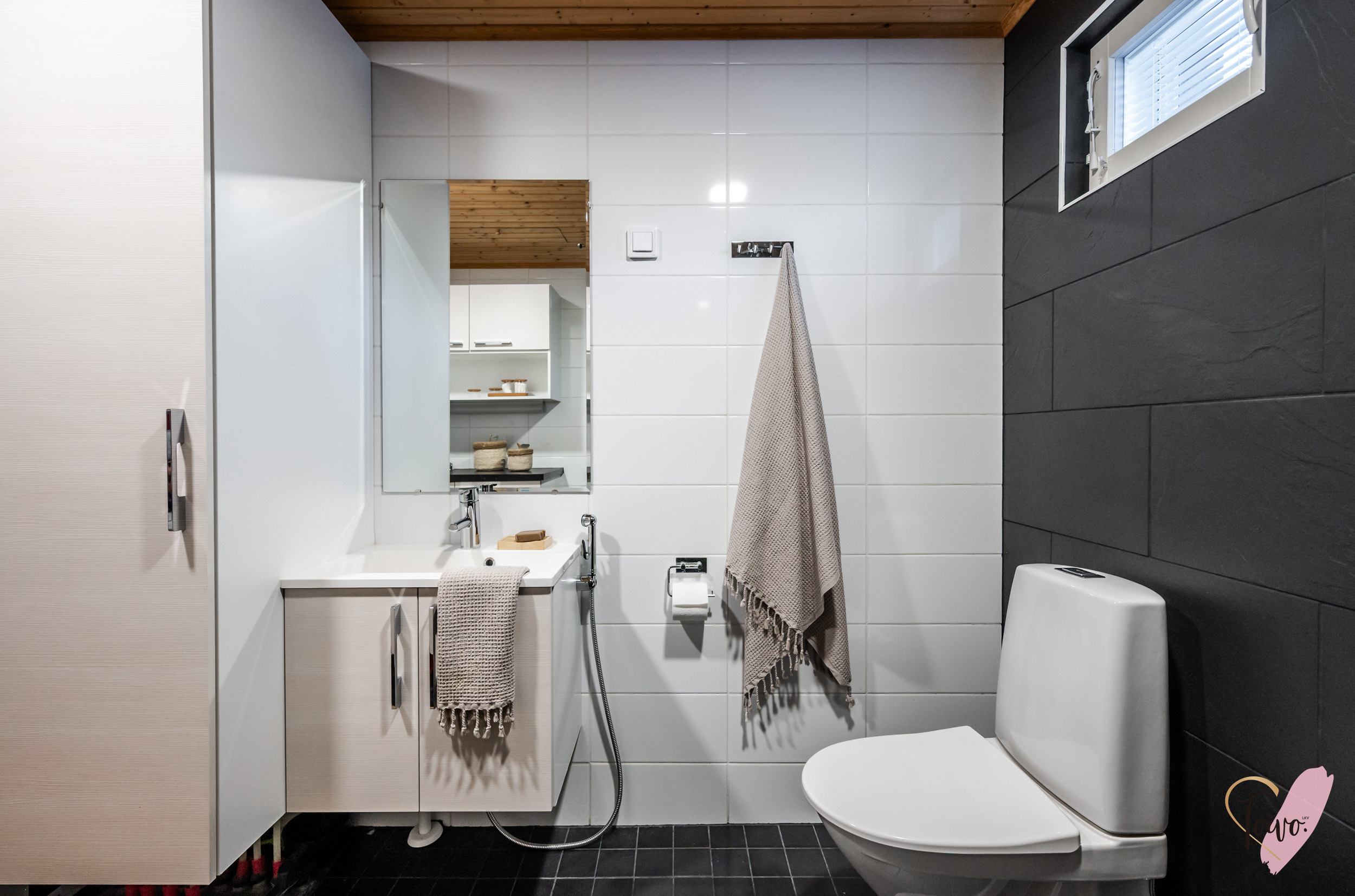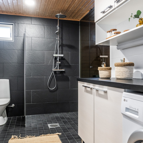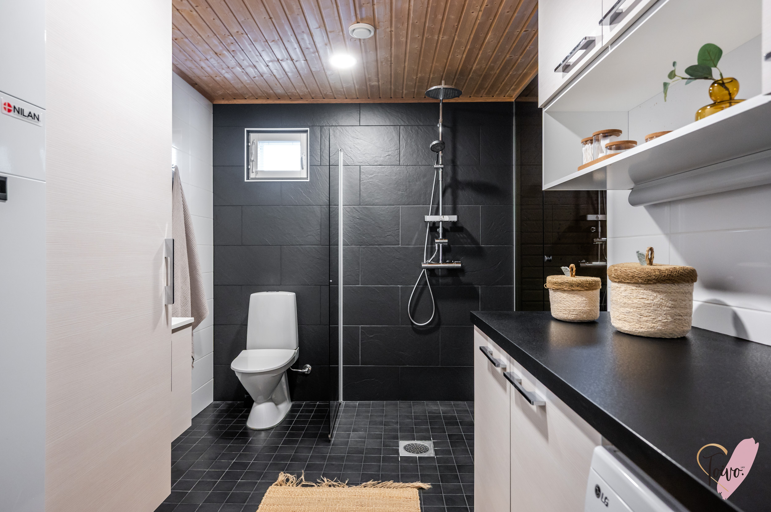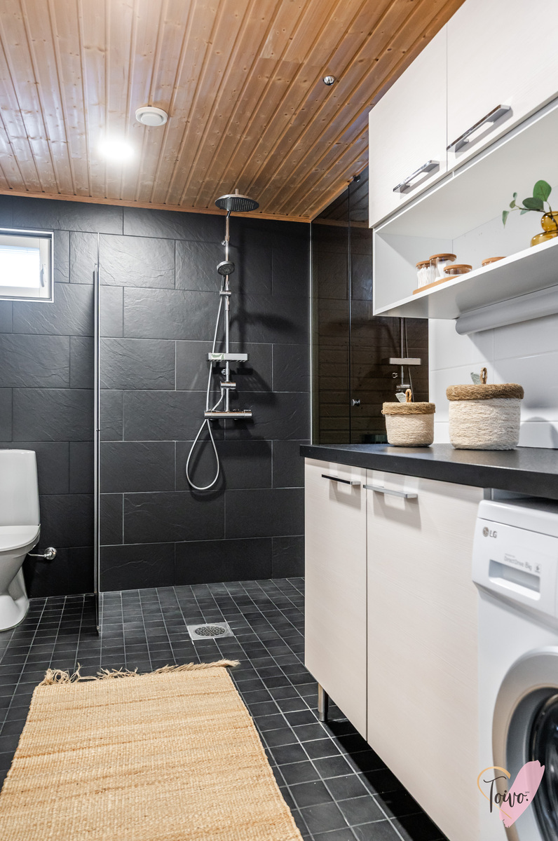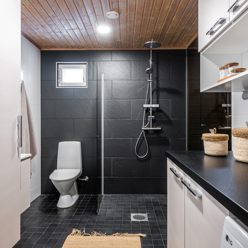 Kylpyhuone ja kodinhoitotila muodostavat toimivan kokonaisuuden, jossa säilytys ja arjen toiminnot on huomioitu. Tilassa sijaitsee myös toinen wc-istuin sekä allaskalusteet arkea helpottamassa. Suihku on kätevän kääntyvän lasiseinän takana ja sauna viimeistelee tummansävyisen, rauhoittavan kokonaisuuden. Kodin erillinen wc sijaitsee eteise yhteydessä heti ulko-oven vieressä.