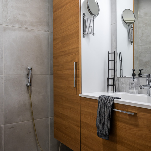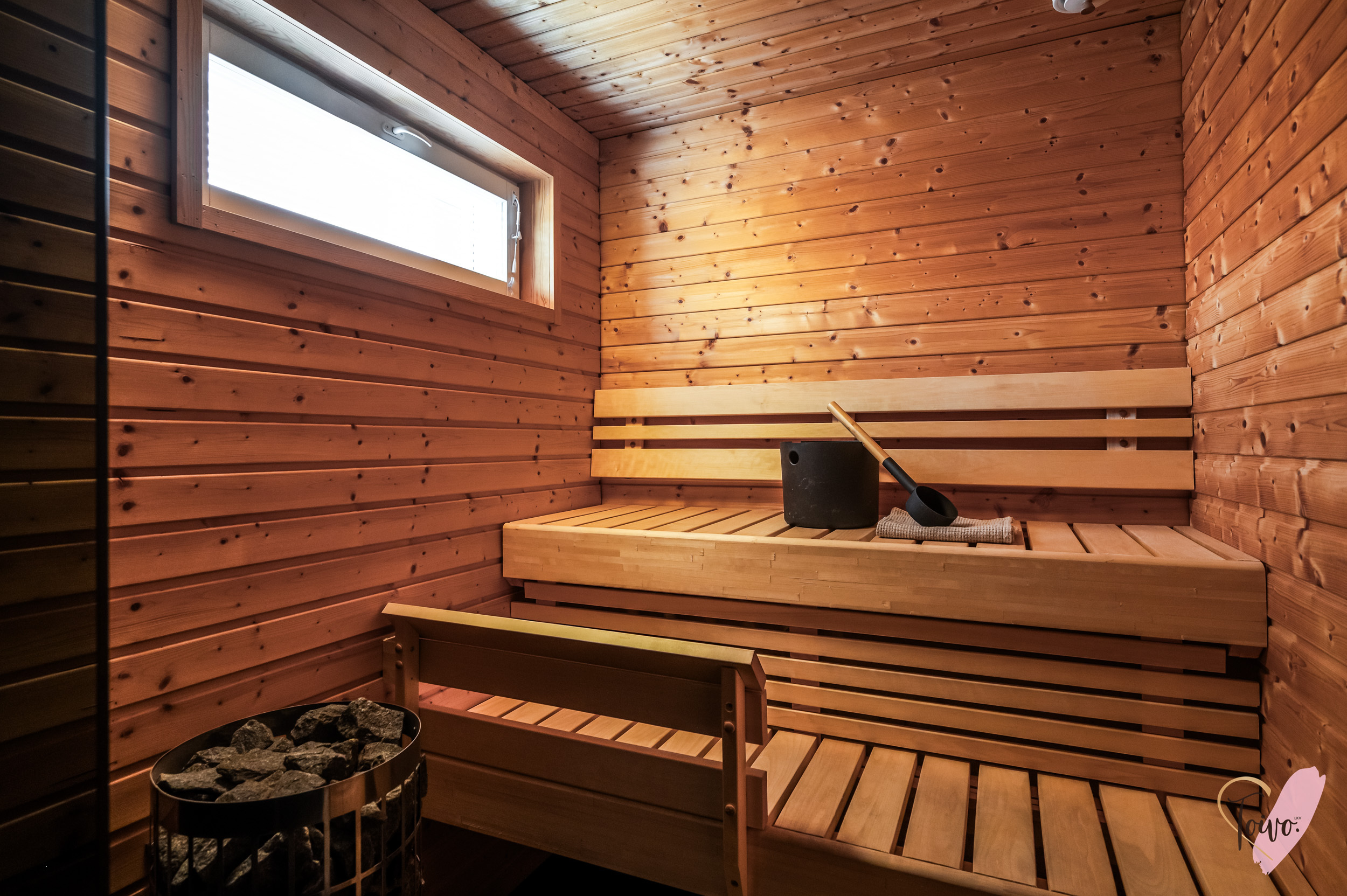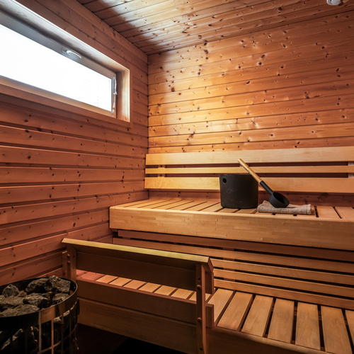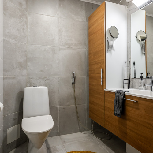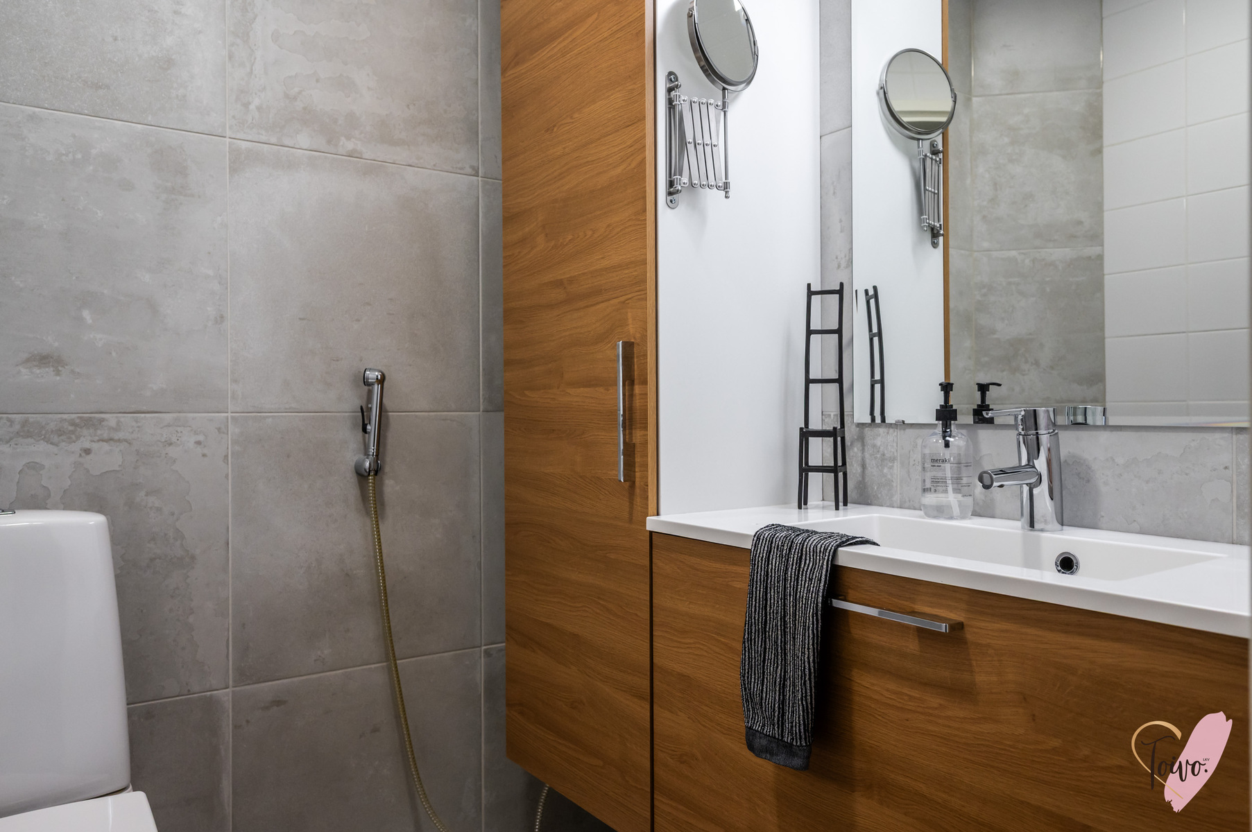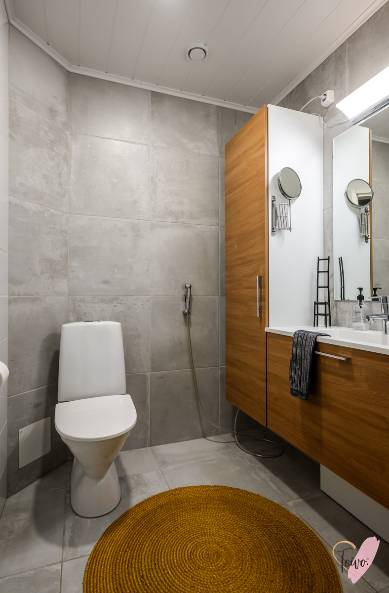 Kylpyhuone ja kodinhoitotila muodostavat toimivan kokonaisuuden, jossa säilytys ja arjen toiminnot on huomioitu. Tilassa sijaitsee myös toinen wc-istuin sekä allaskalusteet arkea helpottamassa. Suihku on kätevän kääntyvän lasiseinän takana ja sauna viimeistelee tummansävyisen, rauhoittavan kokonaisuuden. Kodin erillinen wc sijaitsee eteise yhteydessä heti ulko-oven vieressä.