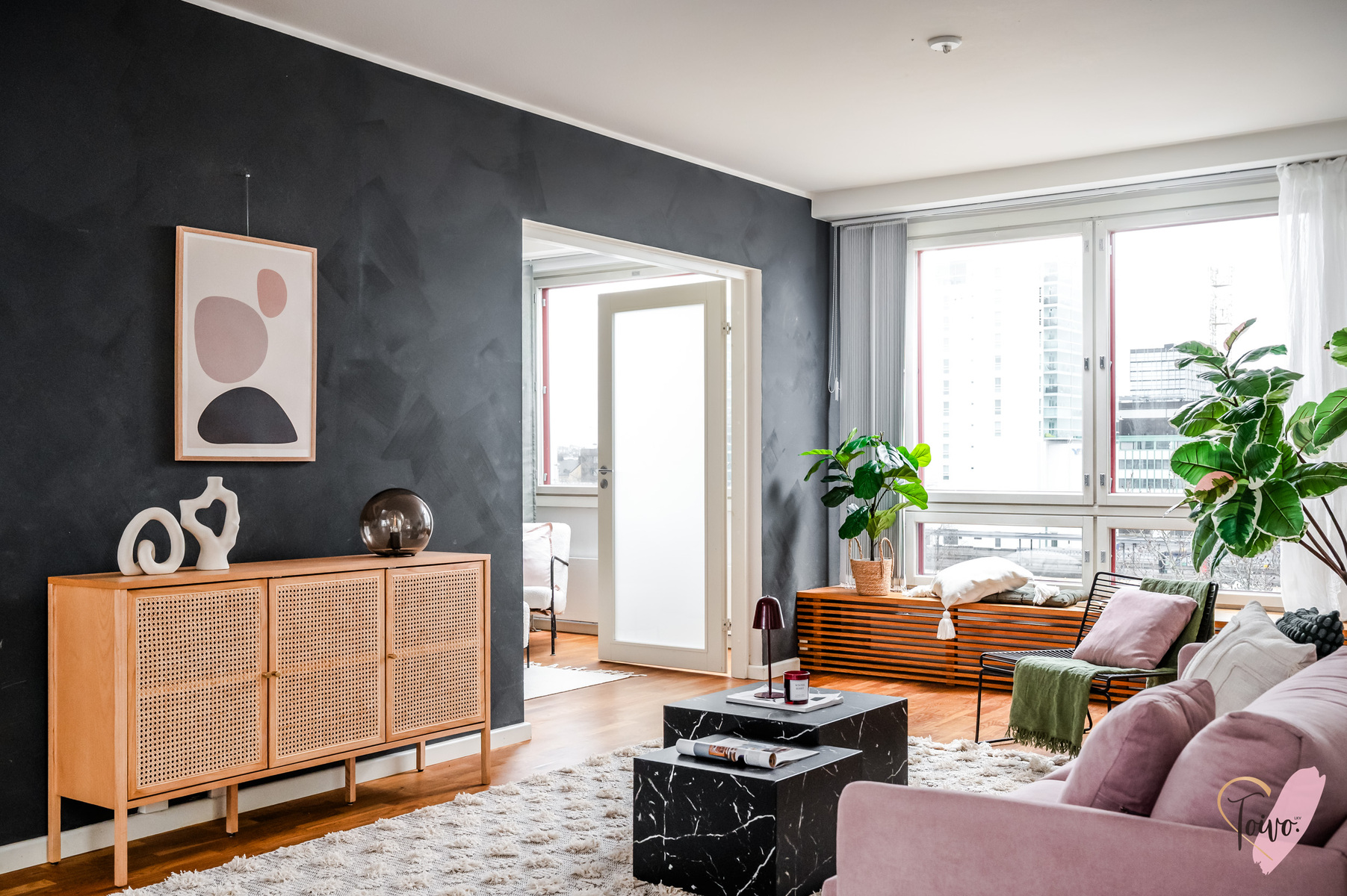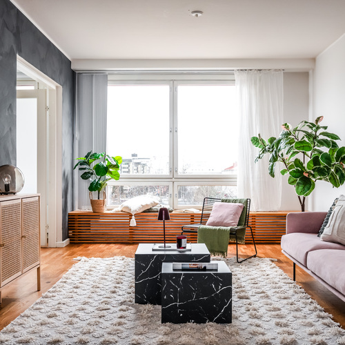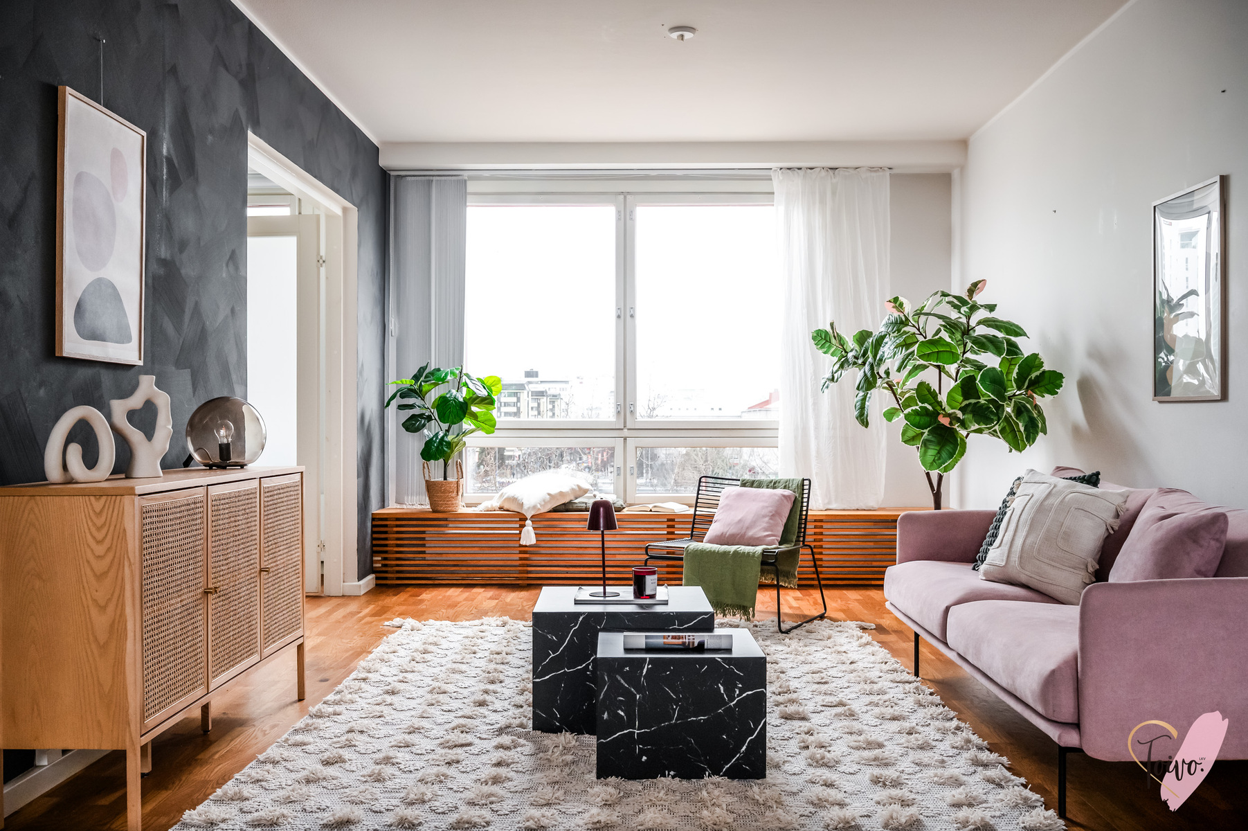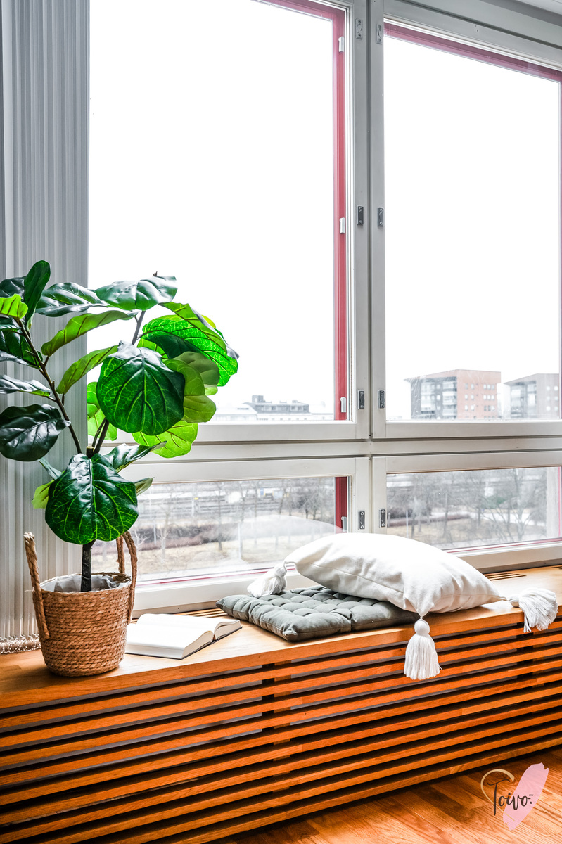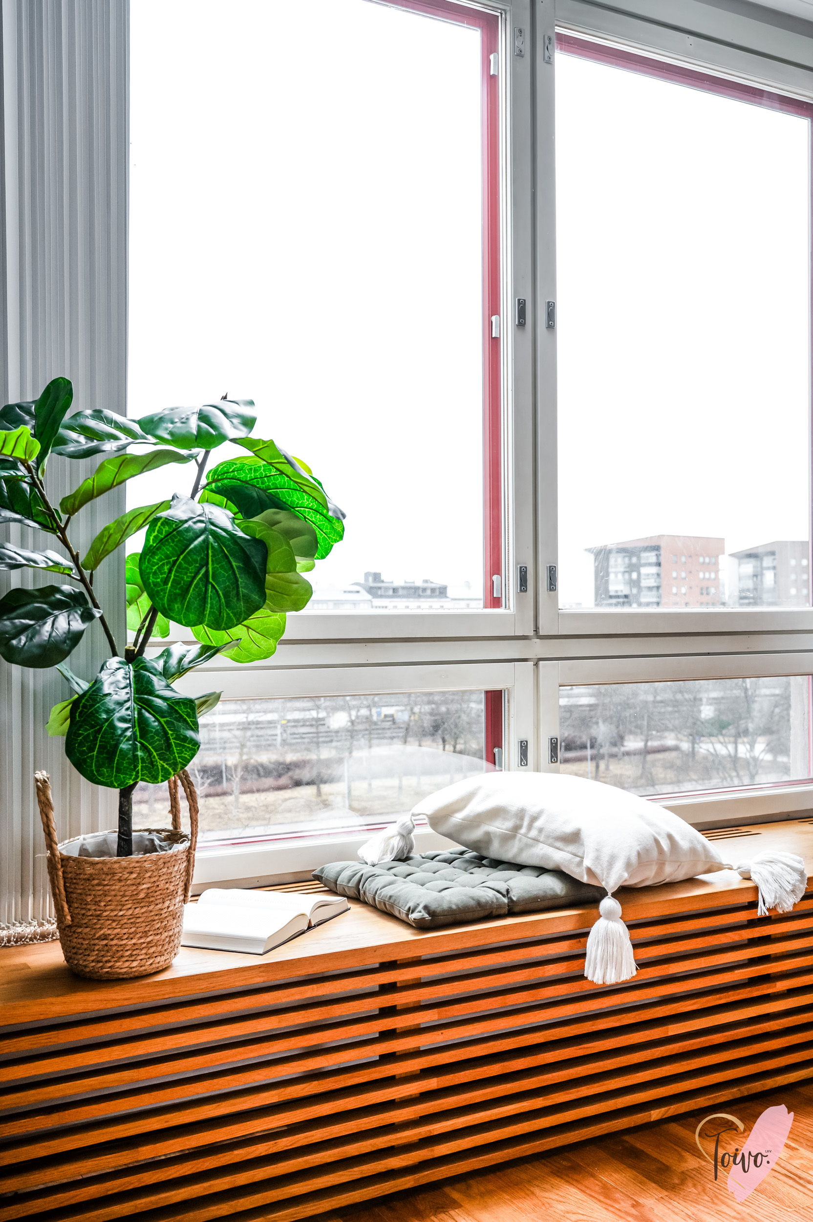 Olohuone on kerrassaan upea, sillä tilaa on! Maisema avautuu yli Rautatieaseman Hallituskatua pitkin ihan Otto Karhin puistolle saakka. Ikkunan ääressä olevalla penkillä on ihana istuskella, hörppiä teetä ja katsoa asemalta lähteviä ja saapuvia matkustajia.