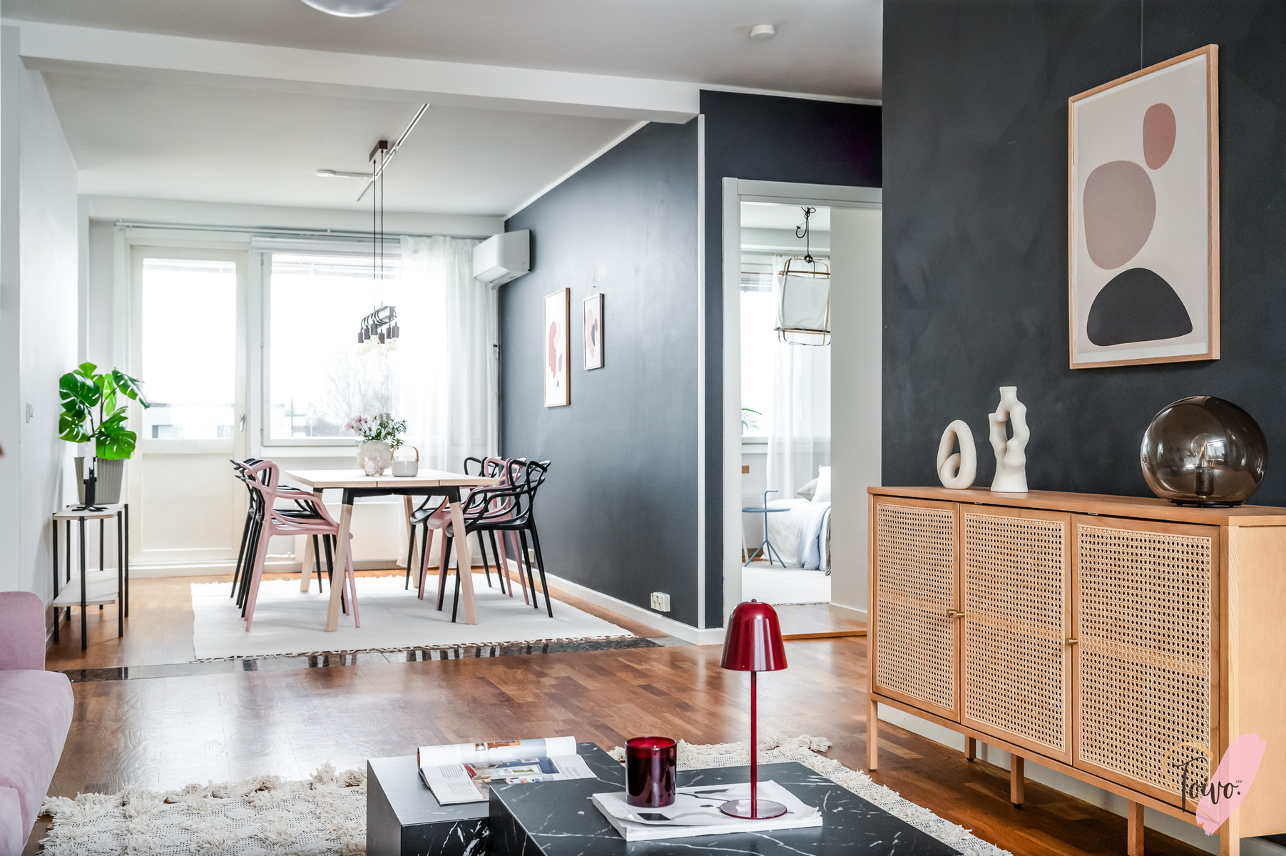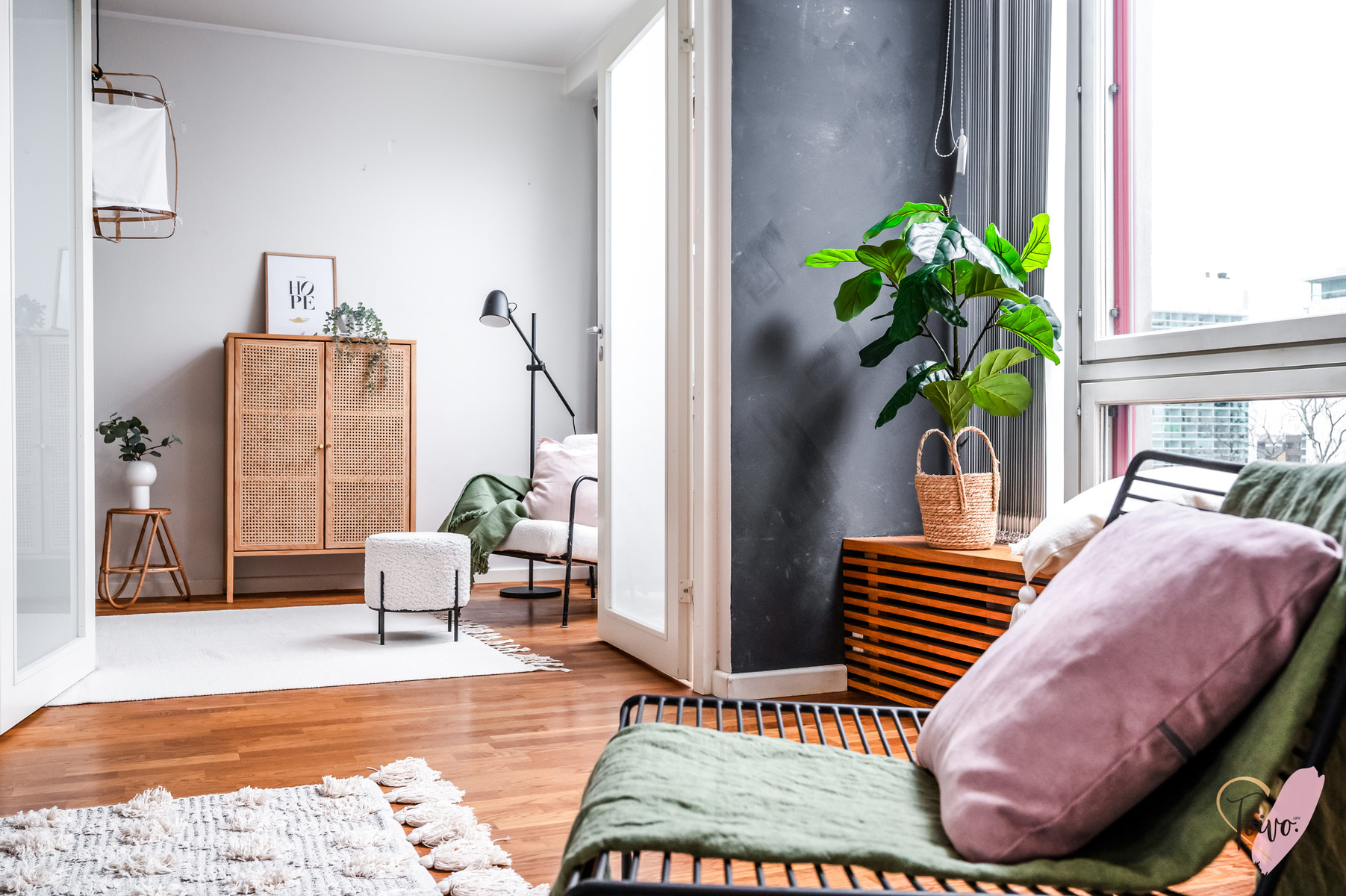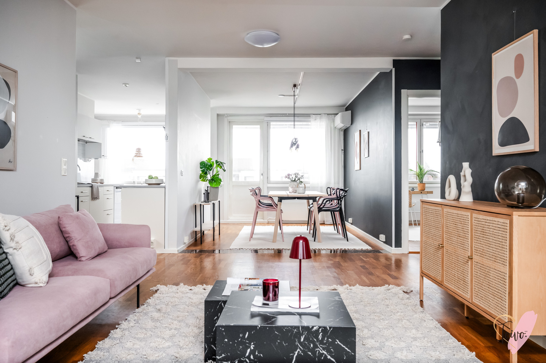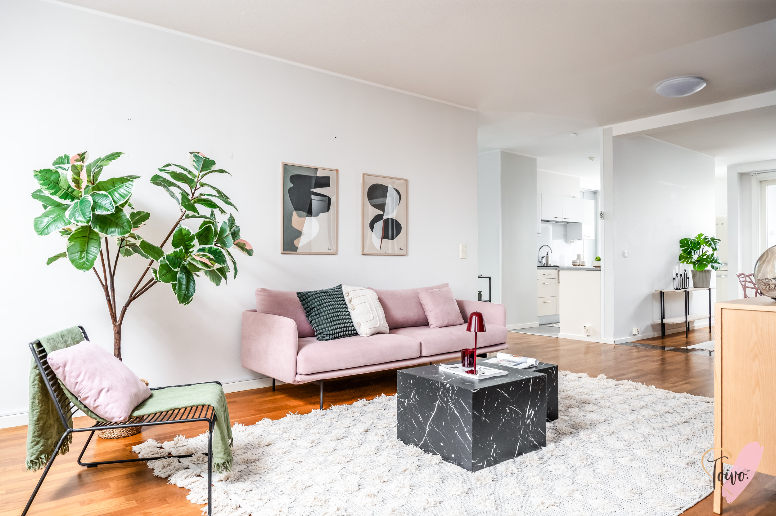 Olohuone on kerrassaan upea, sillä tilaa on! Maisema avautuu yli Rautatieaseman Hallituskatua pitkin ihan Otto Karhin puistolle saakka. Ikkunan ääressä olevalla penkillä on ihana istuskella, hörppiä teetä ja katsoa asemalta lähteviä ja saapuvia matkustajia.