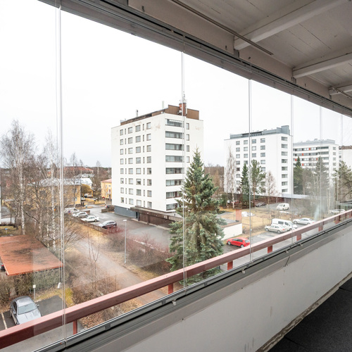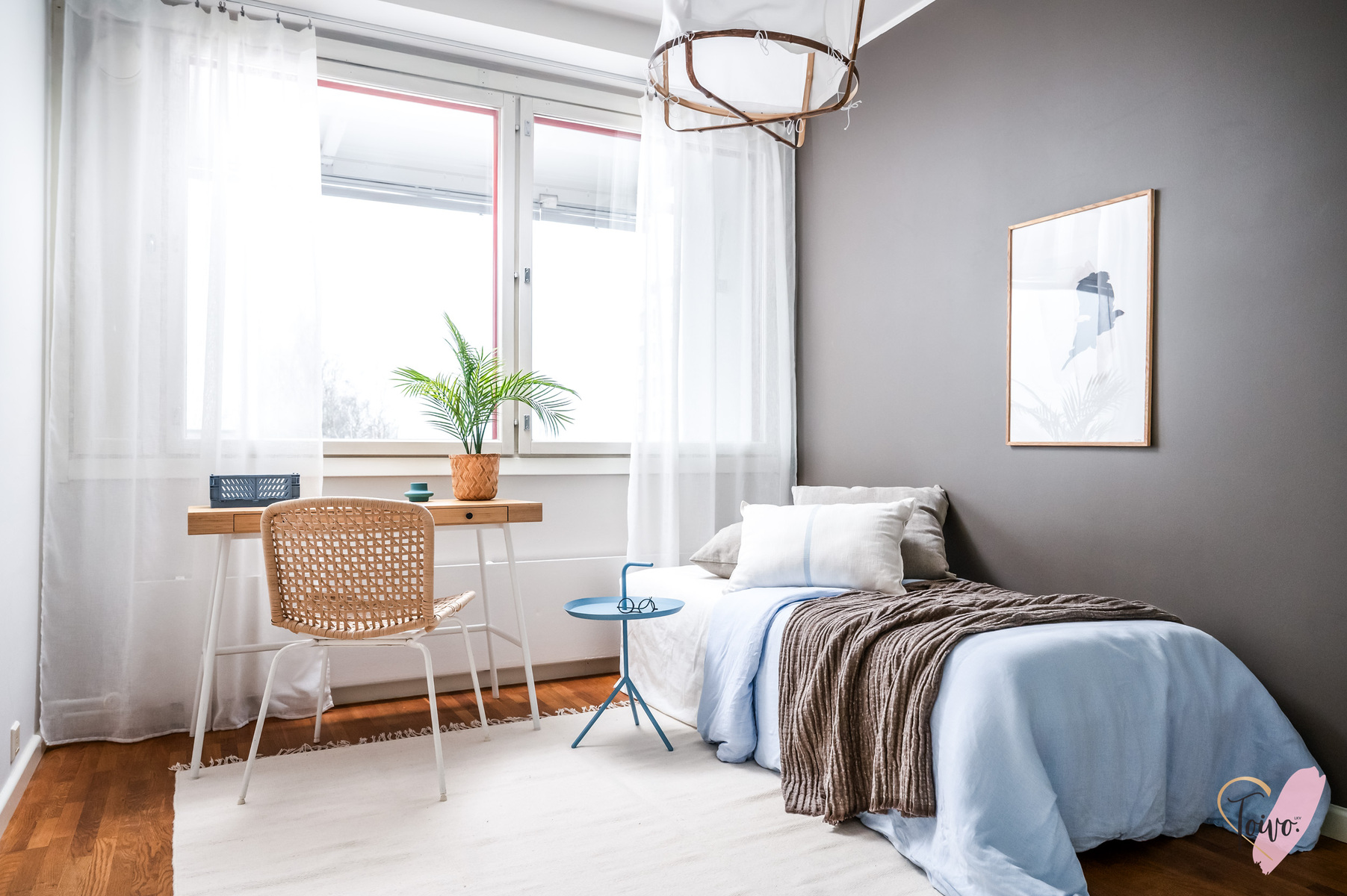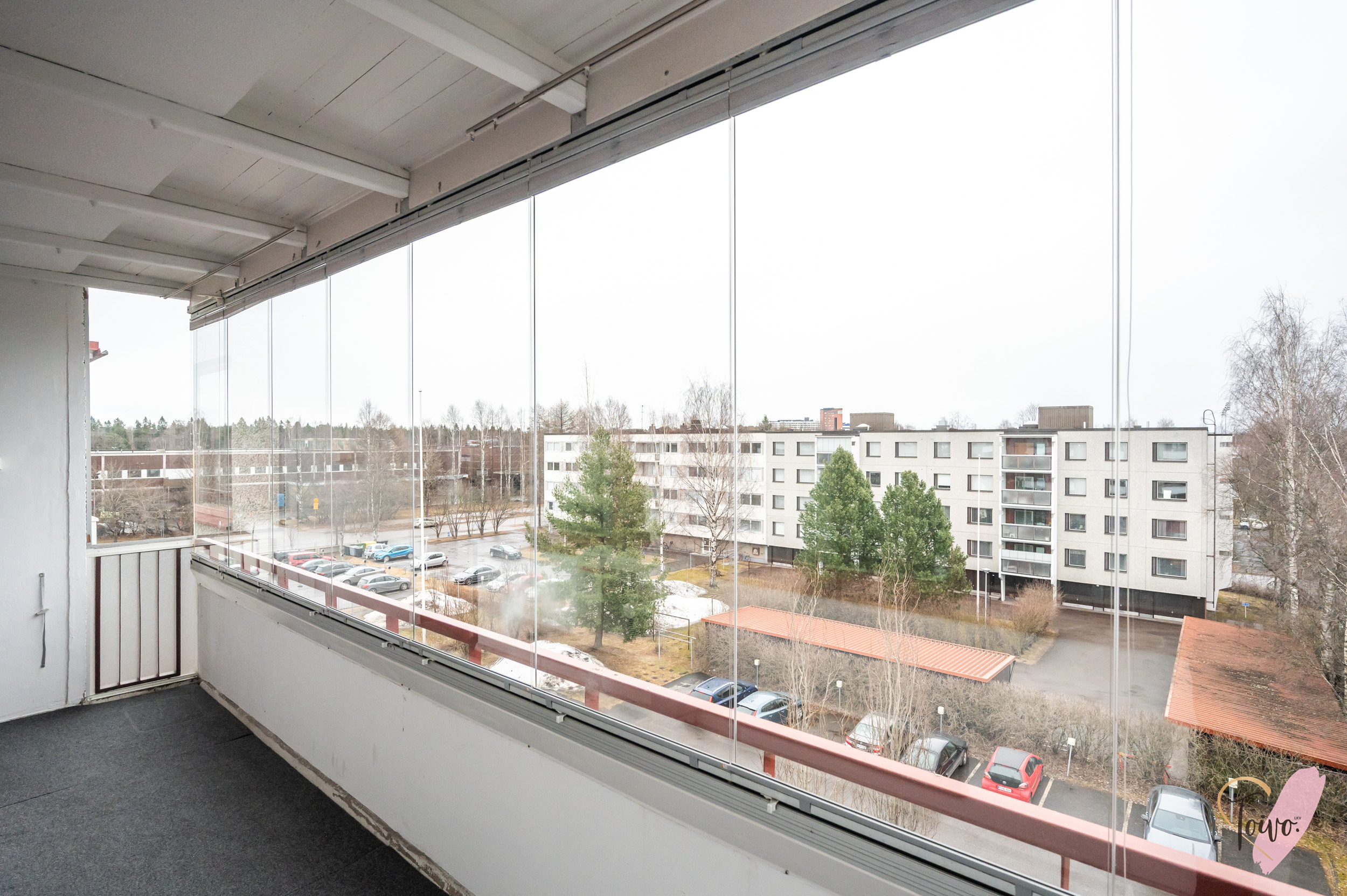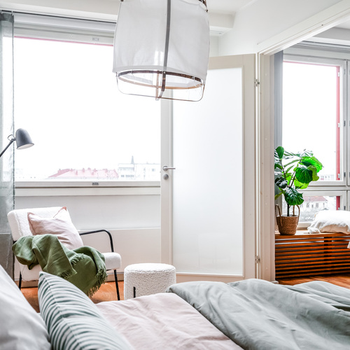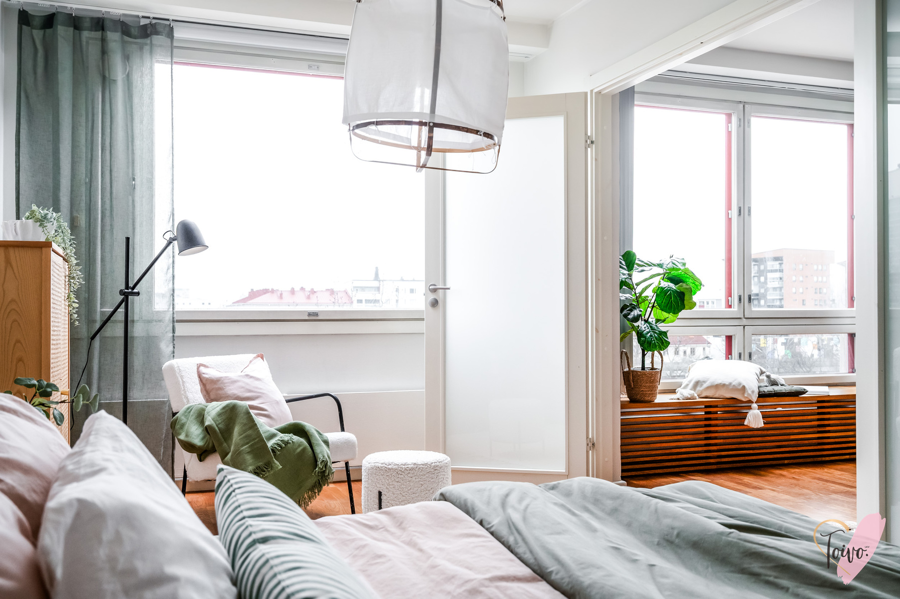 Kodin molemmat makuuhuoneet ovat myös erityisen tilavia ja huoneiden välissä palvelee vaatehuone. Tämä koti hurmaa avaruudellaan ja sillä, että maisema avautuu pitkälle moneen suuntaan. Huoneistossa on myös ilmalämpöpumppu, jonka avulla kesäkuumallakin huoneiston saa pidettyä ihanan viileänä. Tässä kodissa, asut siis rauhallisessa Raksilassa, mutta silti näet kaupungin sykkeen.