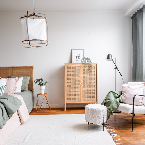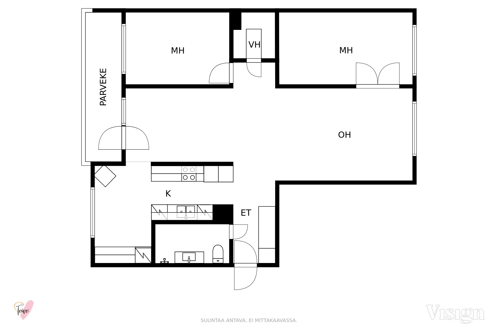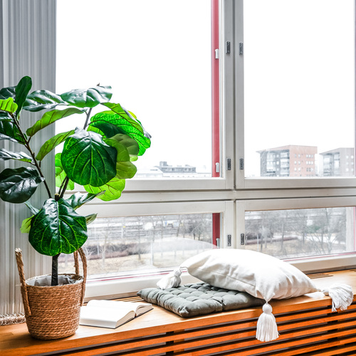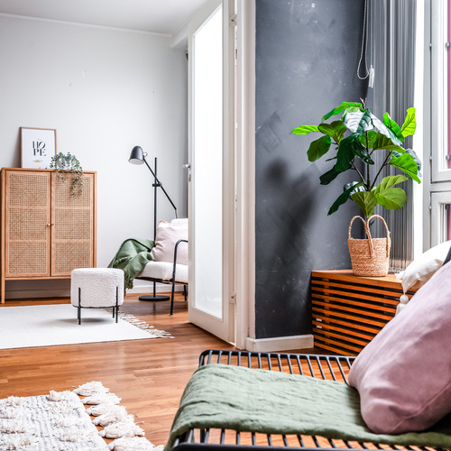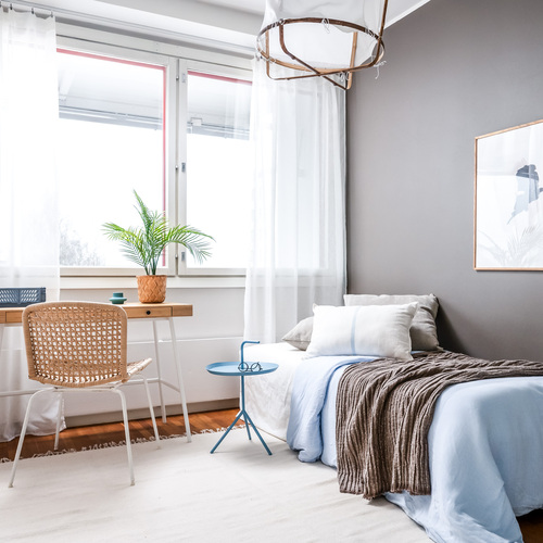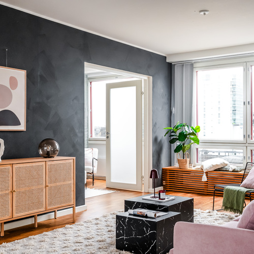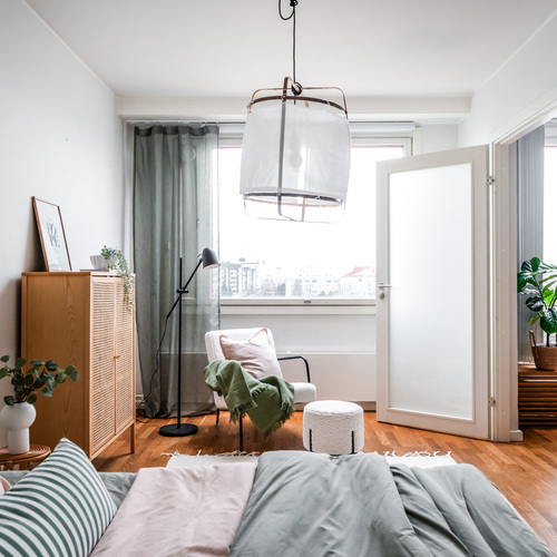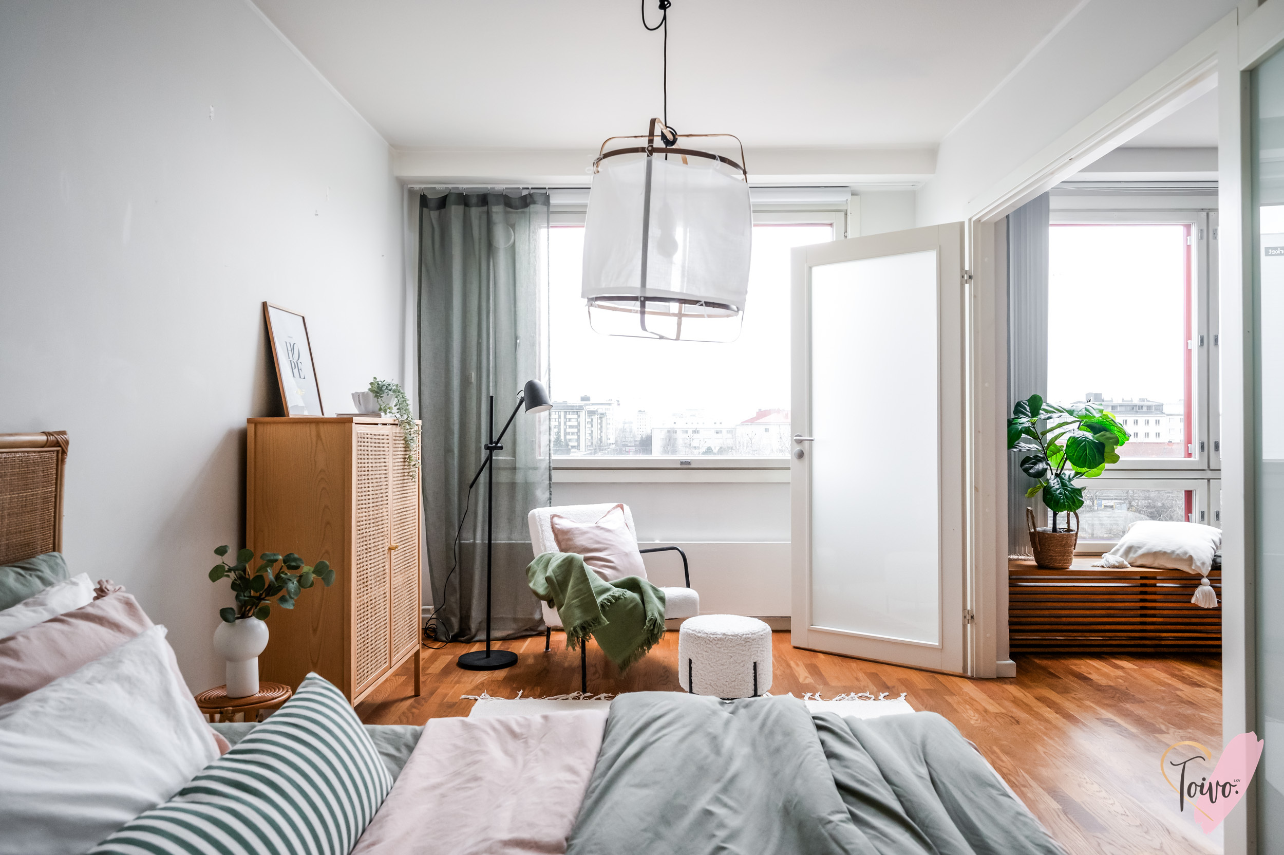 Kodin molemmat makuuhuoneet ovat myös erityisen tilavia ja huoneiden välissä palvelee vaatehuone. Tämä koti hurmaa avaruudellaan ja sillä, että maisema avautuu pitkälle moneen suuntaan. Huoneistossa on myös ilmalämpöpumppu, jonka avulla kesäkuumallakin huoneiston saa pidettyä ihanan viileänä. Tässä kodissa, asut siis rauhallisessa Raksilassa, mutta silti näet kaupungin sykkeen.