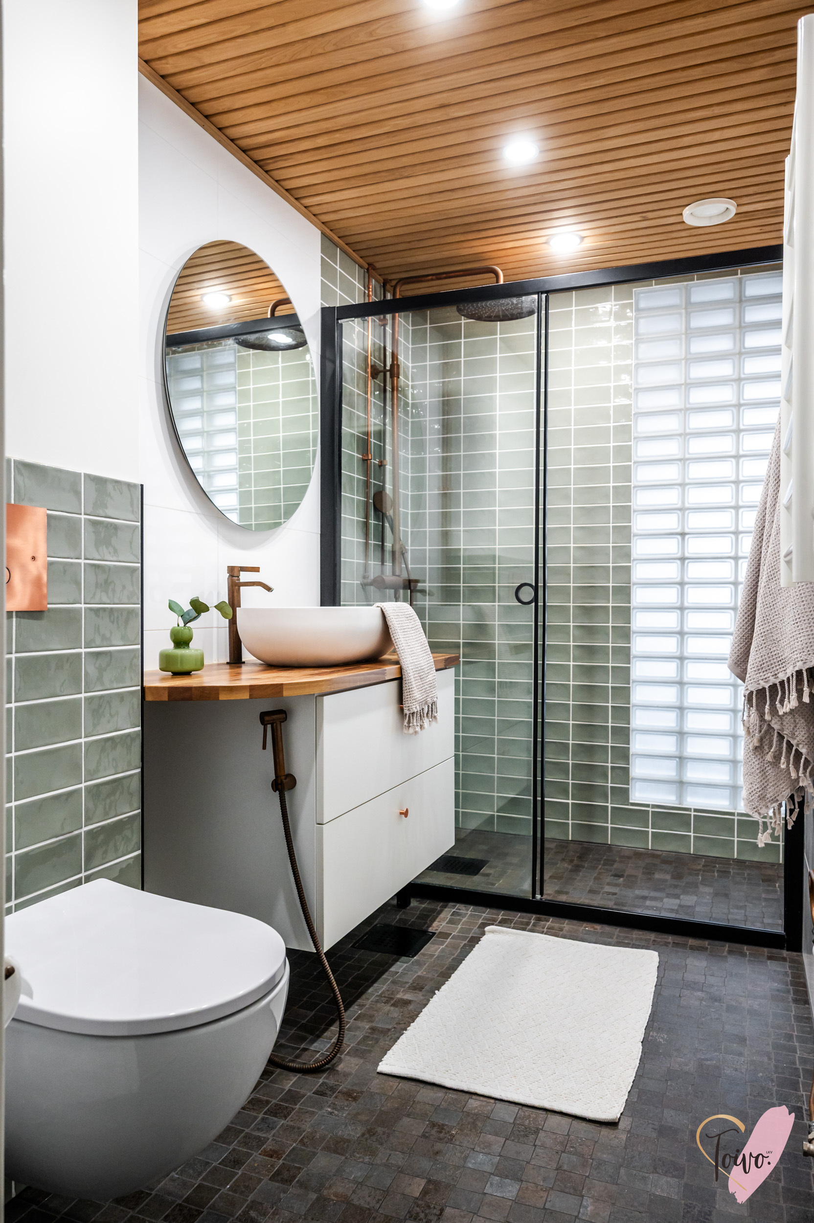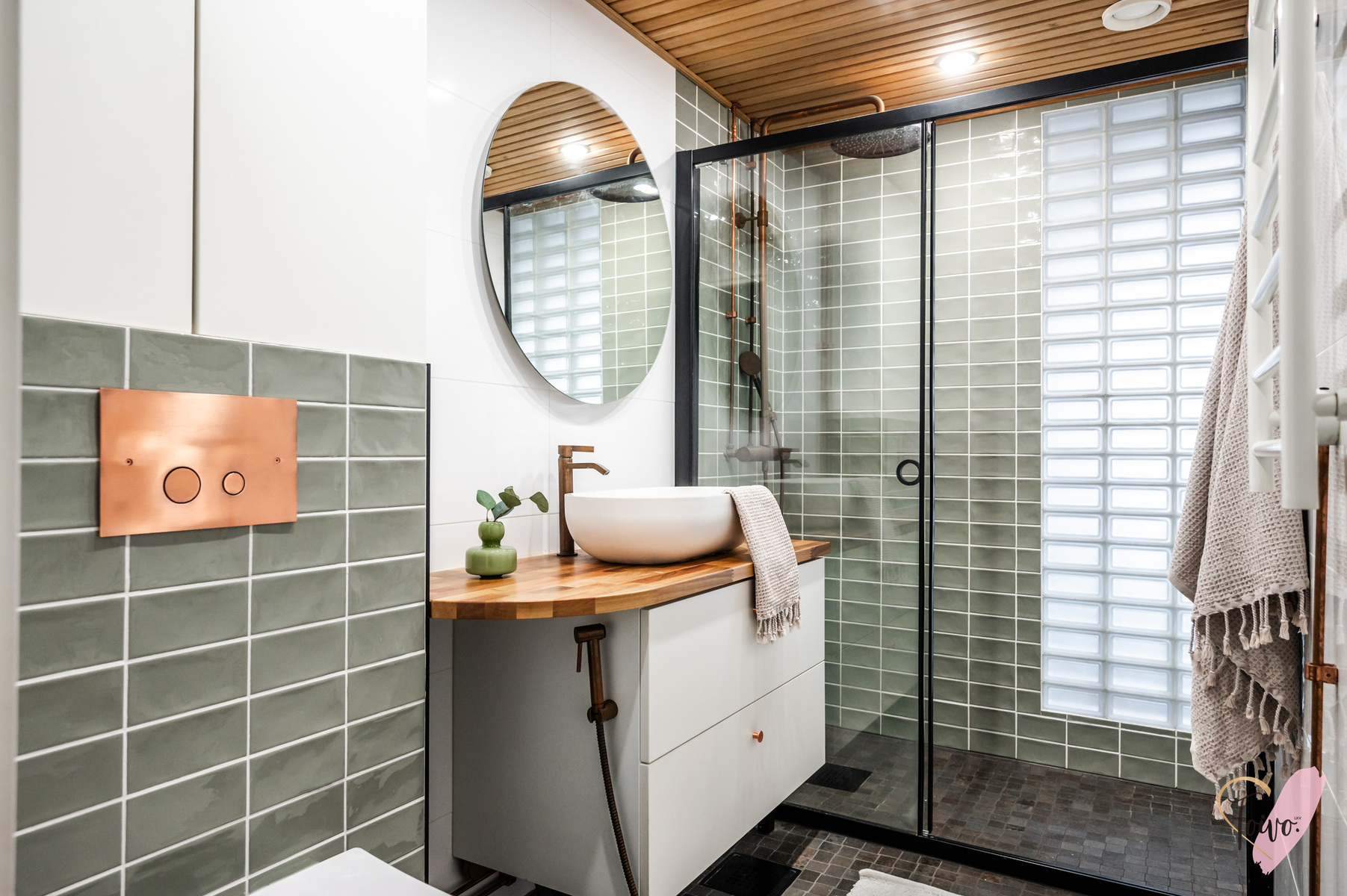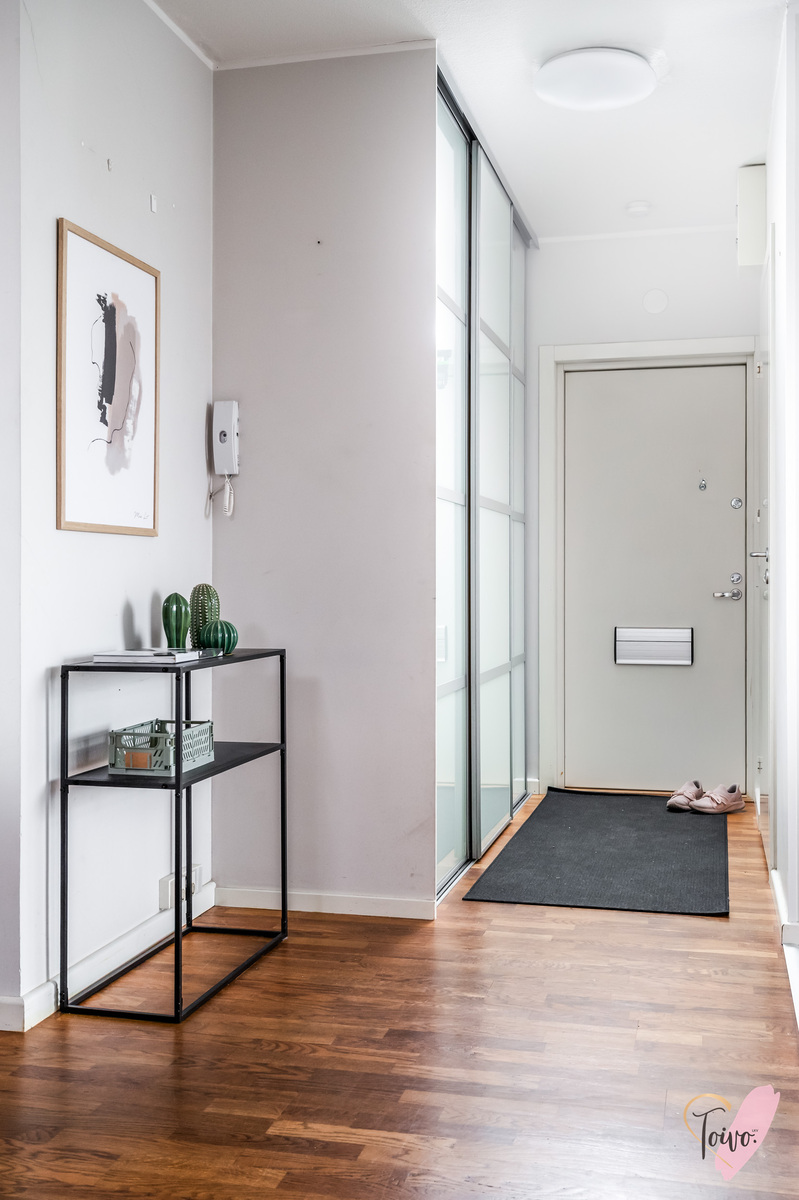 Eteinen vastaanottaa vieraansa lämmöllä sisään ja eteiskäytävän varrelle on vaatesäilytyksen lisäksi käynti kodin kylpytiloihin, johon luonnonvalo pääsee kauniisti lasitiiliseinän kautta. Tämä kodin kylpyhuone on vuonna 2023 kauttaaltaan remontoitu. Tarkkaan harkitut kuparisen sävyiset yksityiskohdat hanoissa ja käyttövesiputkissa hurmaavat ja viimeistelevät yhtenäisen kokonaisuuden. Tämä tila on aivan ihana!