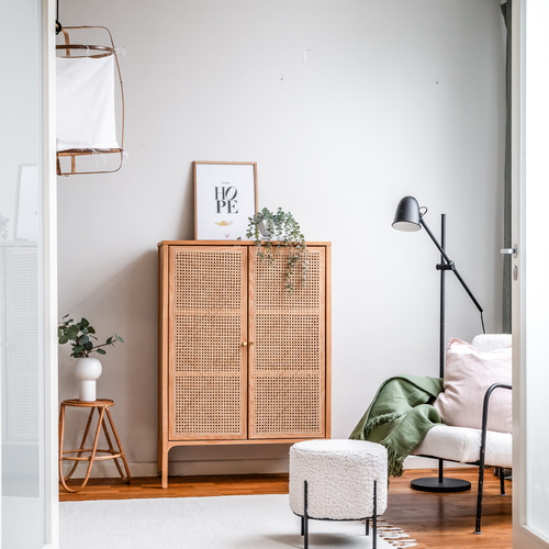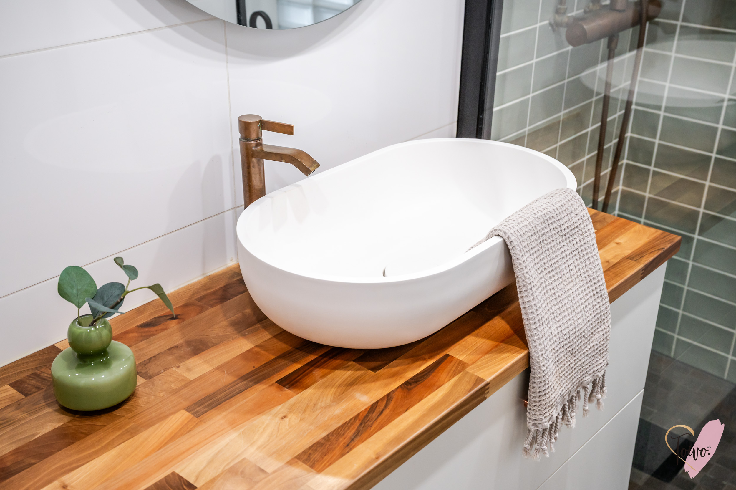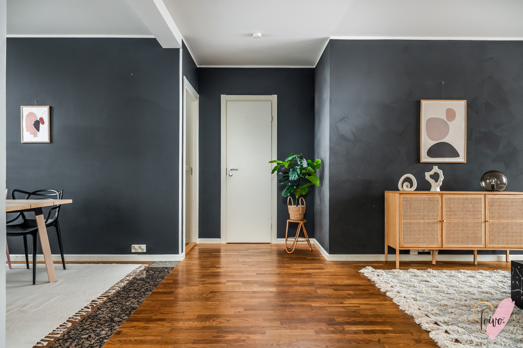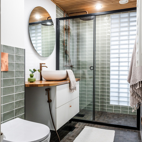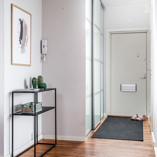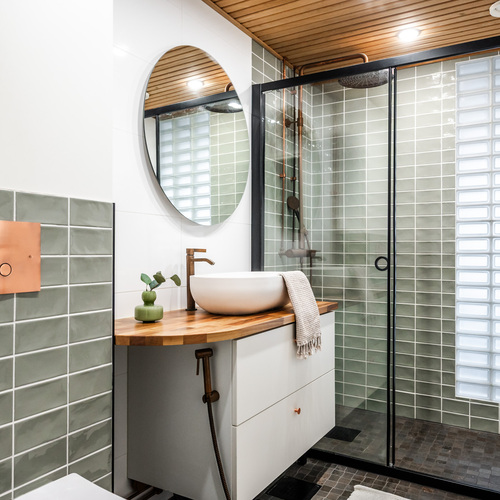 Eteinen vastaanottaa vieraansa lämmöllä sisään ja eteiskäytävän varrelle on vaatesäilytyksen lisäksi käynti kodin kylpytiloihin, johon luonnonvalo pääsee kauniisti lasitiiliseinän kautta. Tämä kodin kylpyhuone on vuonna 2023 kauttaaltaan remontoitu. Tarkkaan harkitut kuparisen sävyiset yksityiskohdat hanoissa ja käyttövesiputkissa hurmaavat ja viimeistelevät yhtenäisen kokonaisuuden. Tämä tila on aivan ihana!