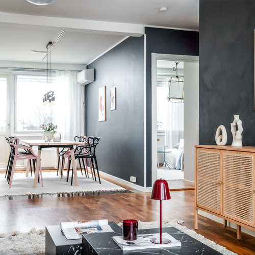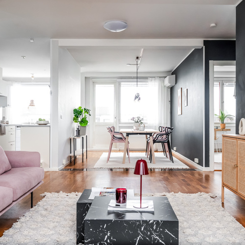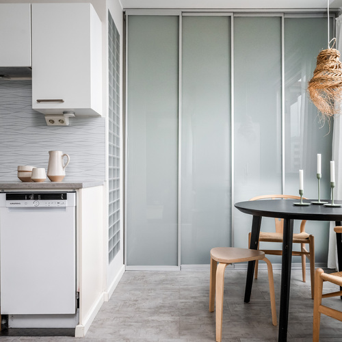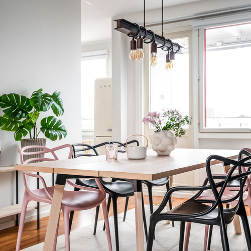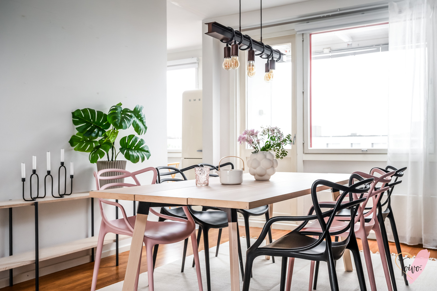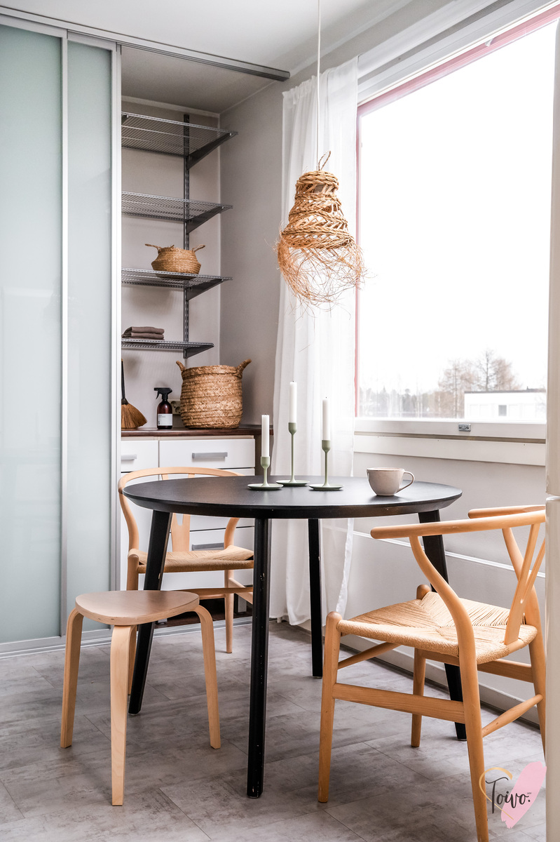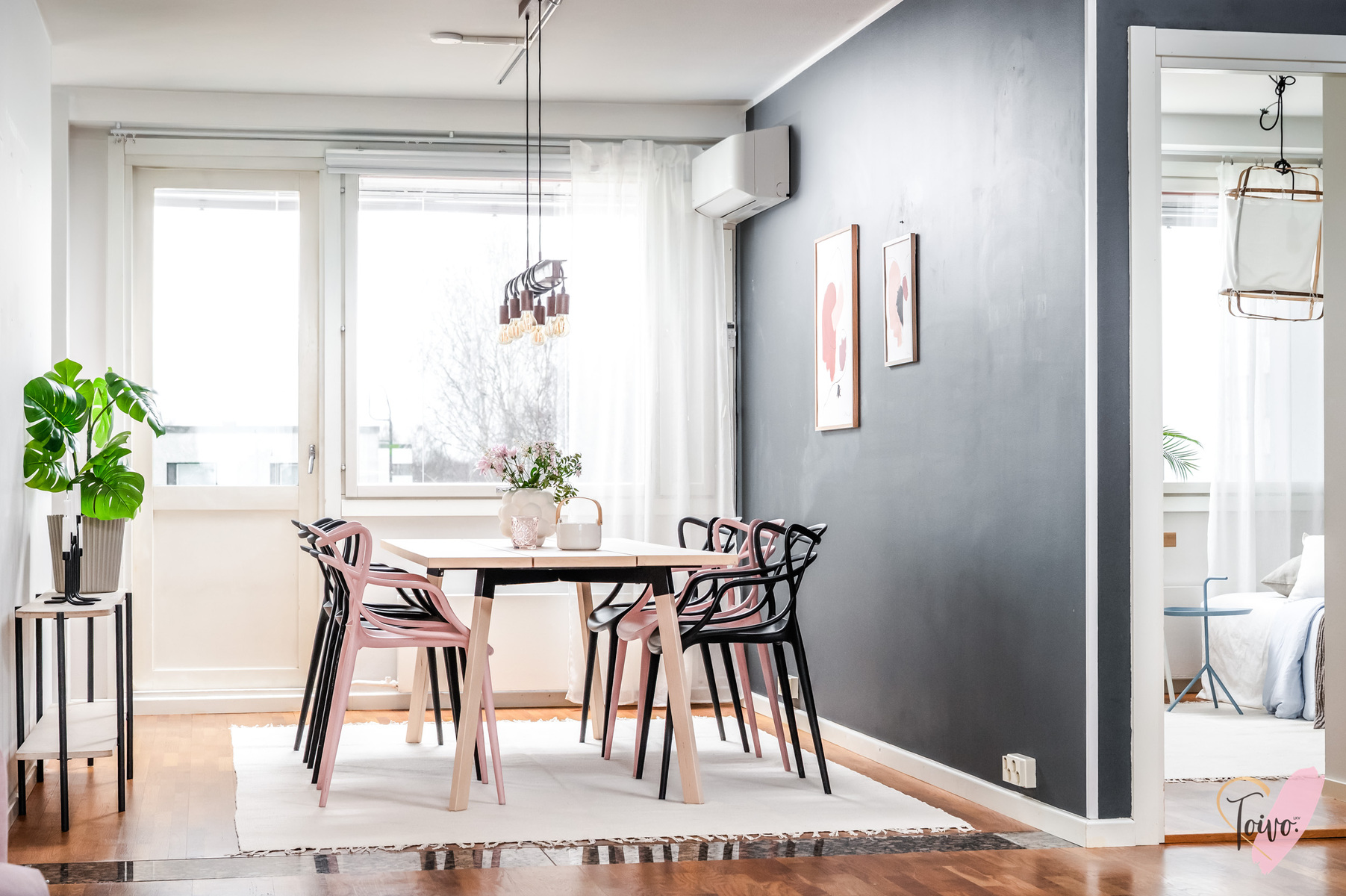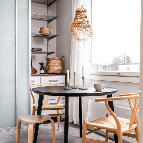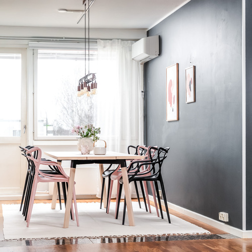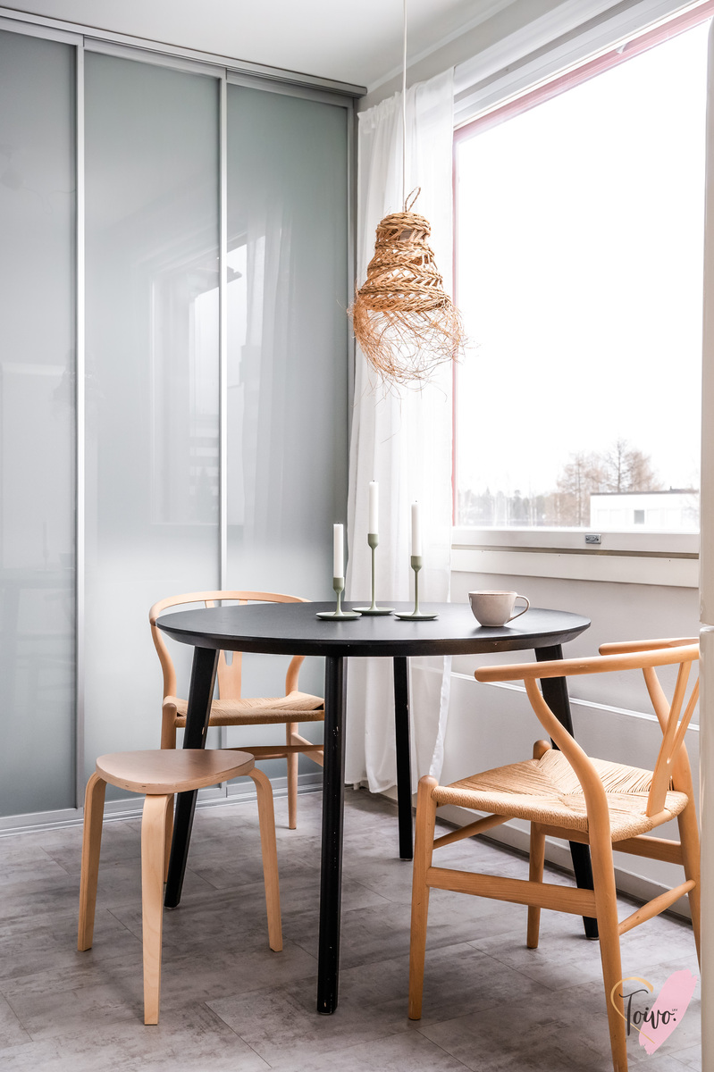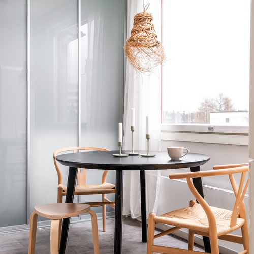 Erillinen, näyttävä ruokailutila on keittiön jatkeena ja tämä onkin mitä ihanin perheen arkeen sekä juhlaan. Mikäli lisähuoneille on tarvetta, tästä tilasta on helppo muokata oma erillinen makuuhuone. Ruokailutilasta on myös käynti pitkälle lasitetulle parvekkeelle, jossa on mukava nauttia aamukahvit.