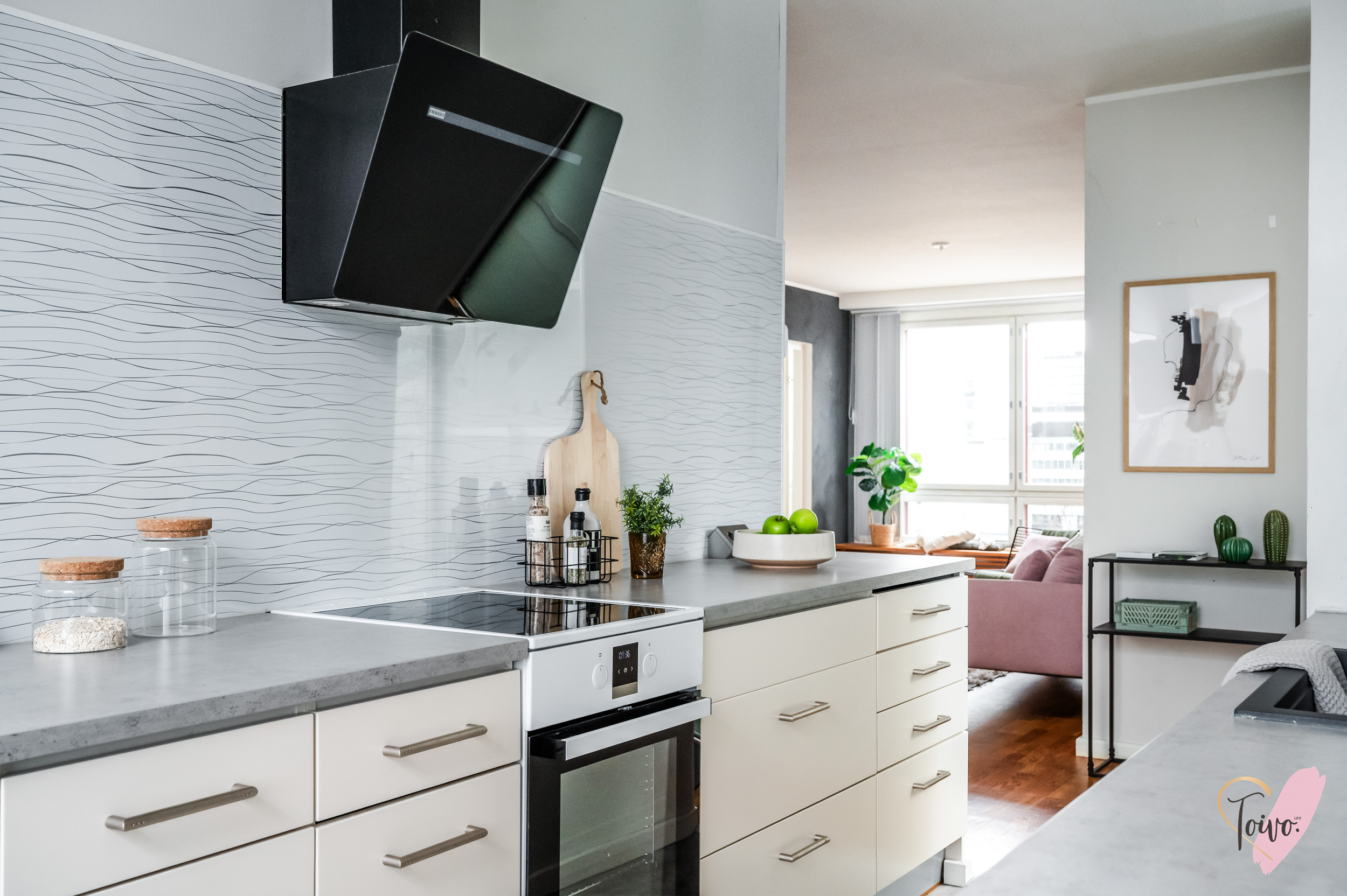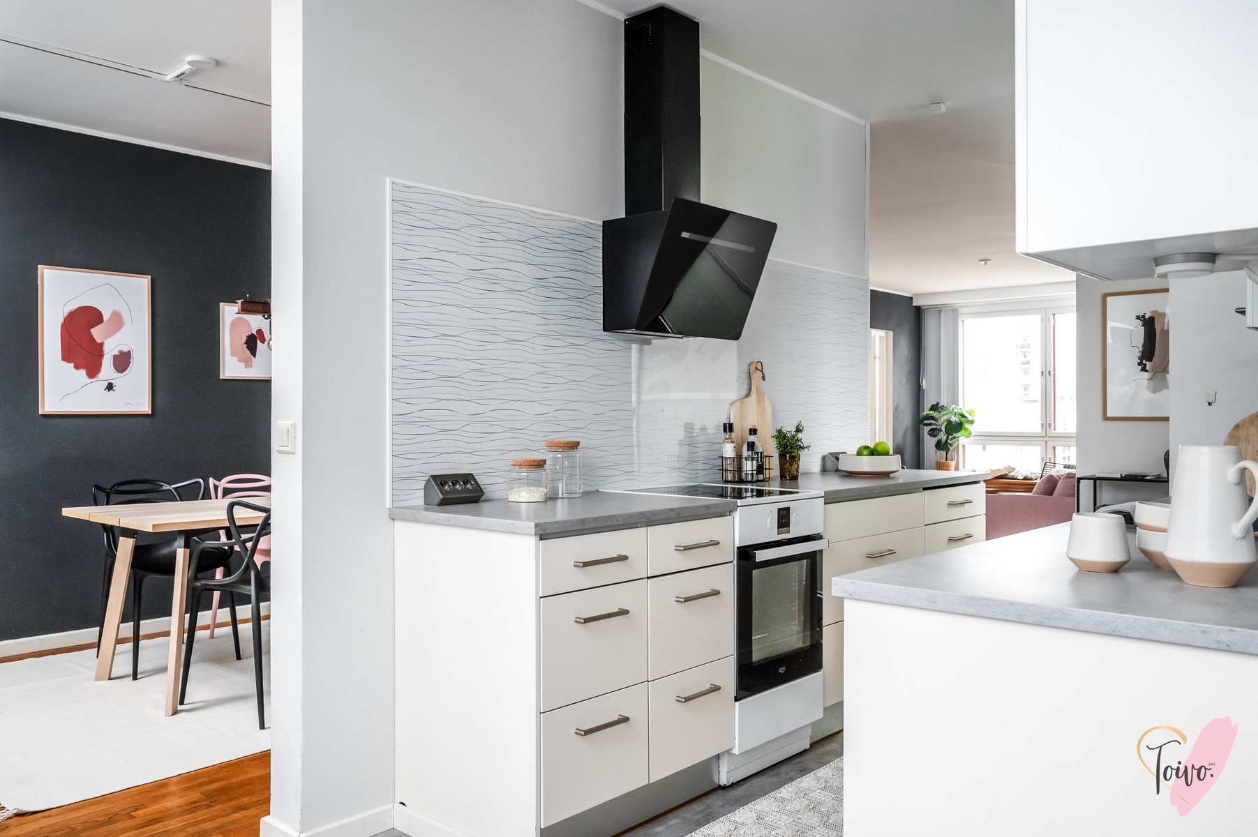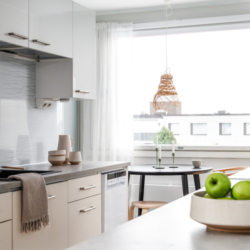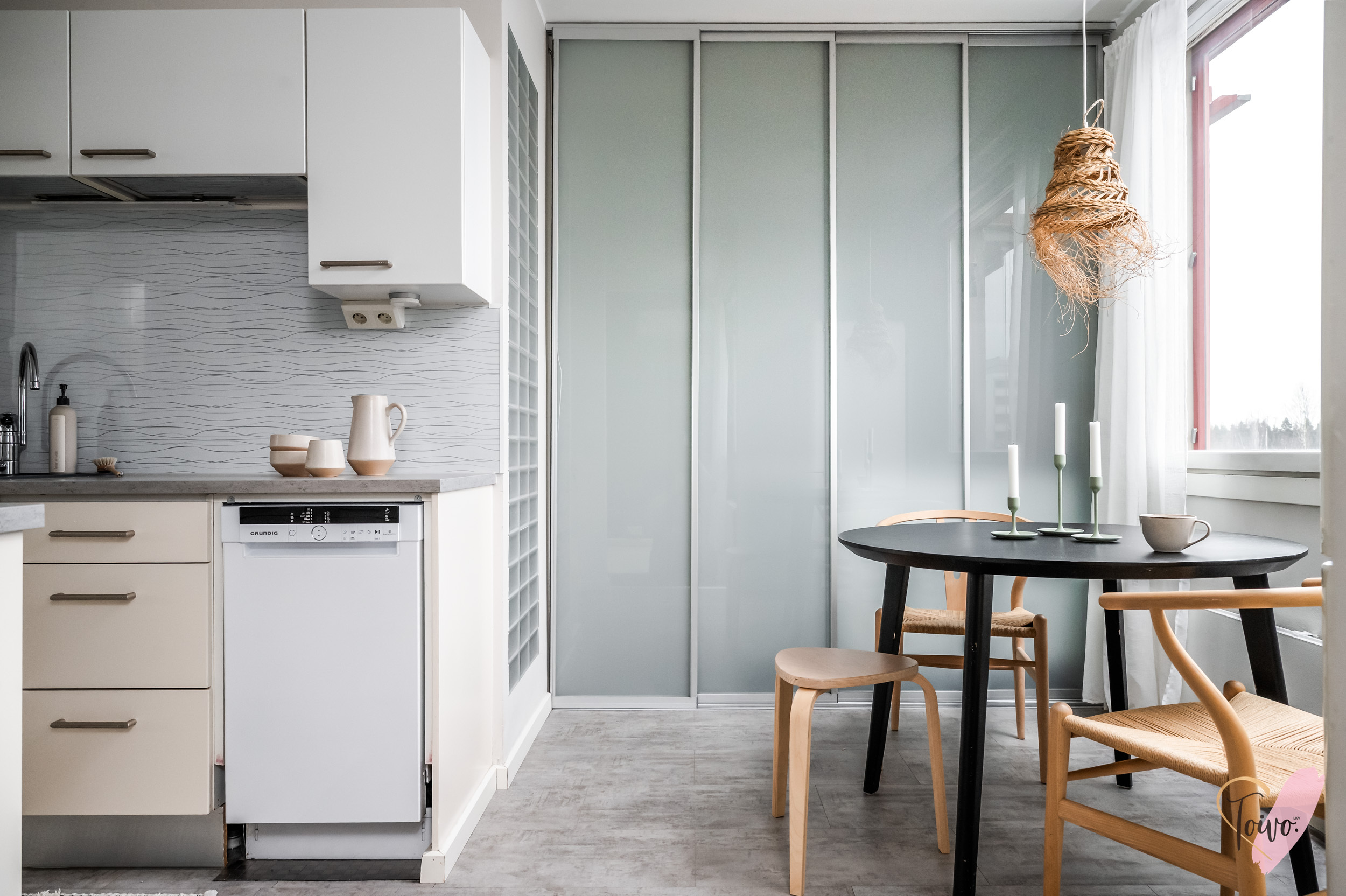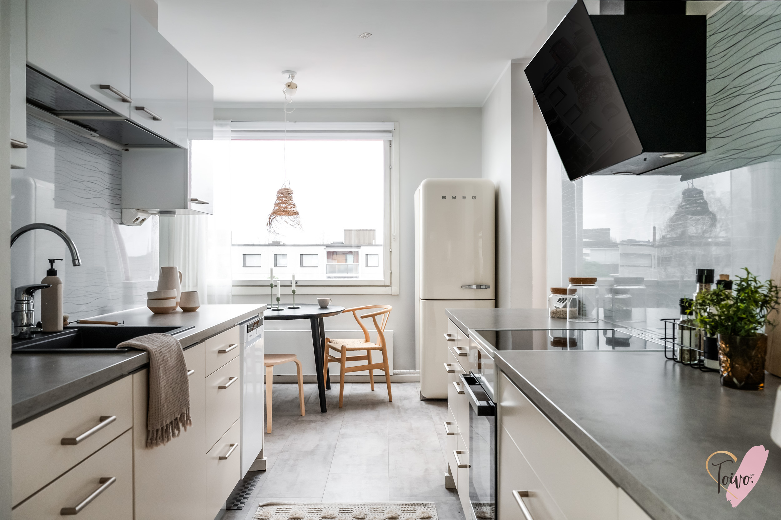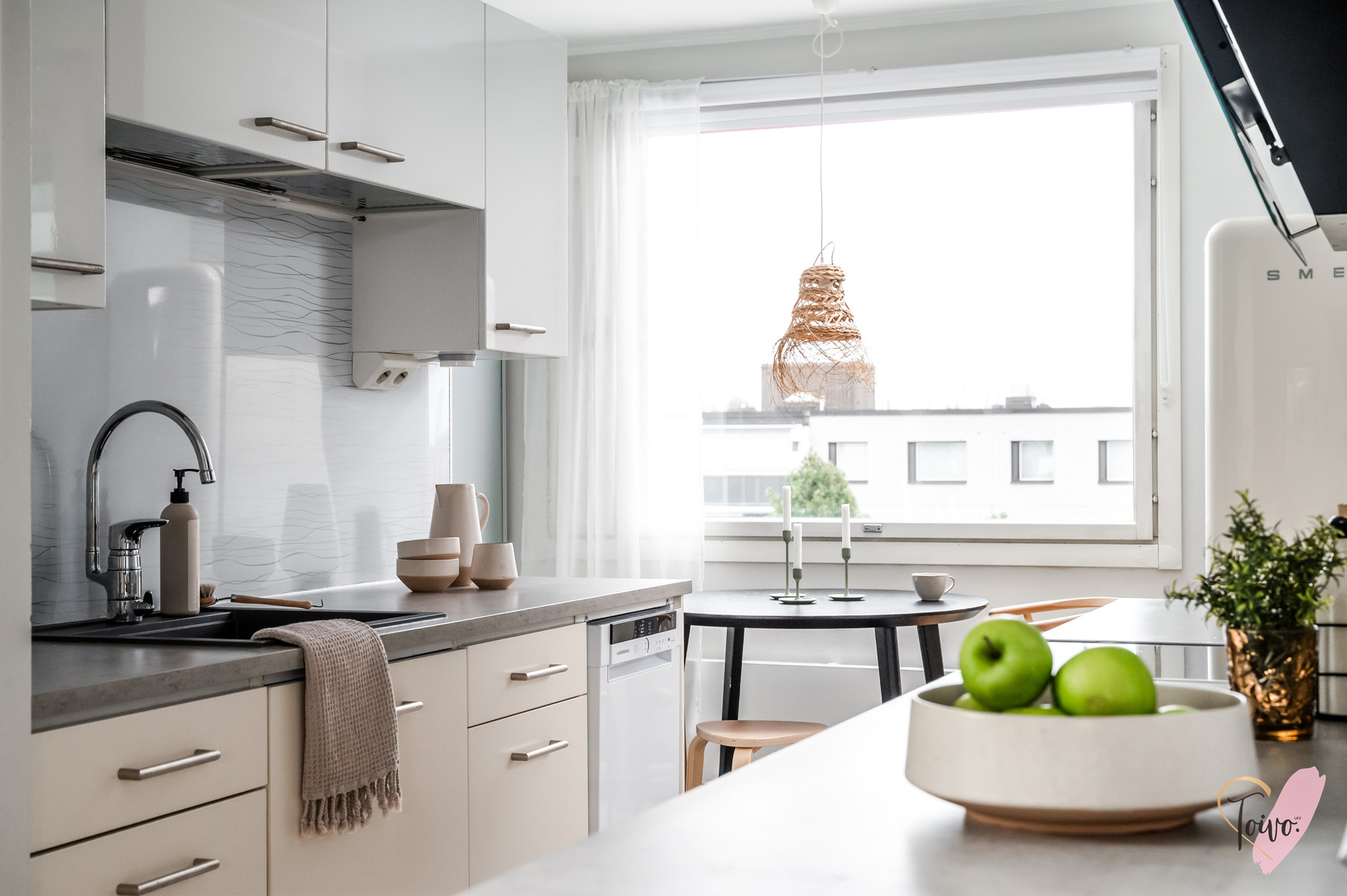 Eteisestä avautuu kulku kauniin vaaleaan keittiöön, jossa on ihana kokkailla, sillä tila on upean avara. Aamupäivän aurinko herättelee keittiössä puuhailevaa ja ilta-aurinko loistaa ihanasti sisään olohuoneen isoista ikkunoista. Tilavassa keittiössä on huomioitu myös kodinhoito, sillä liukuovikaapiston taakse on saatu mahtumaan oma tilansa kodinhoidolle.