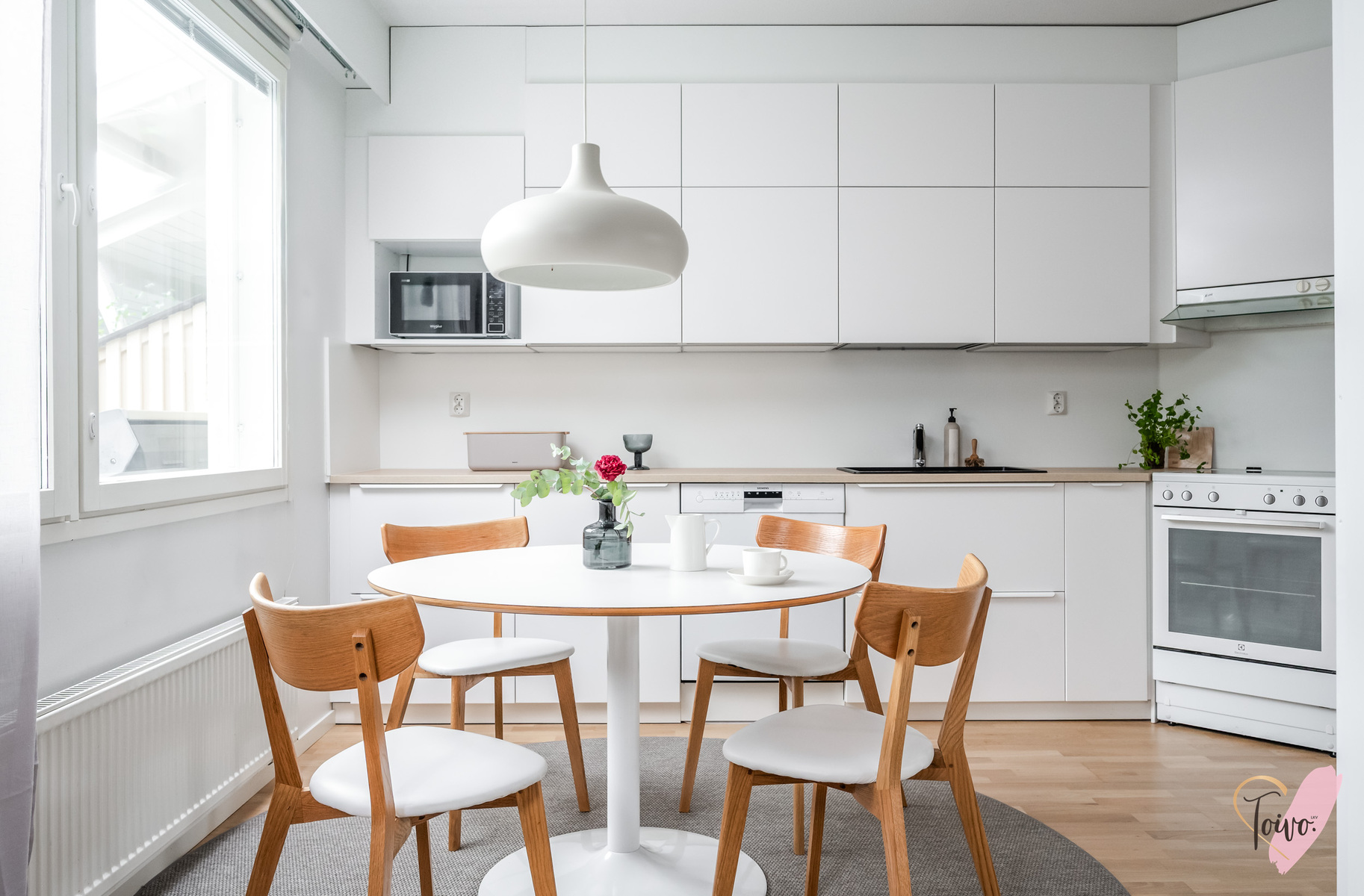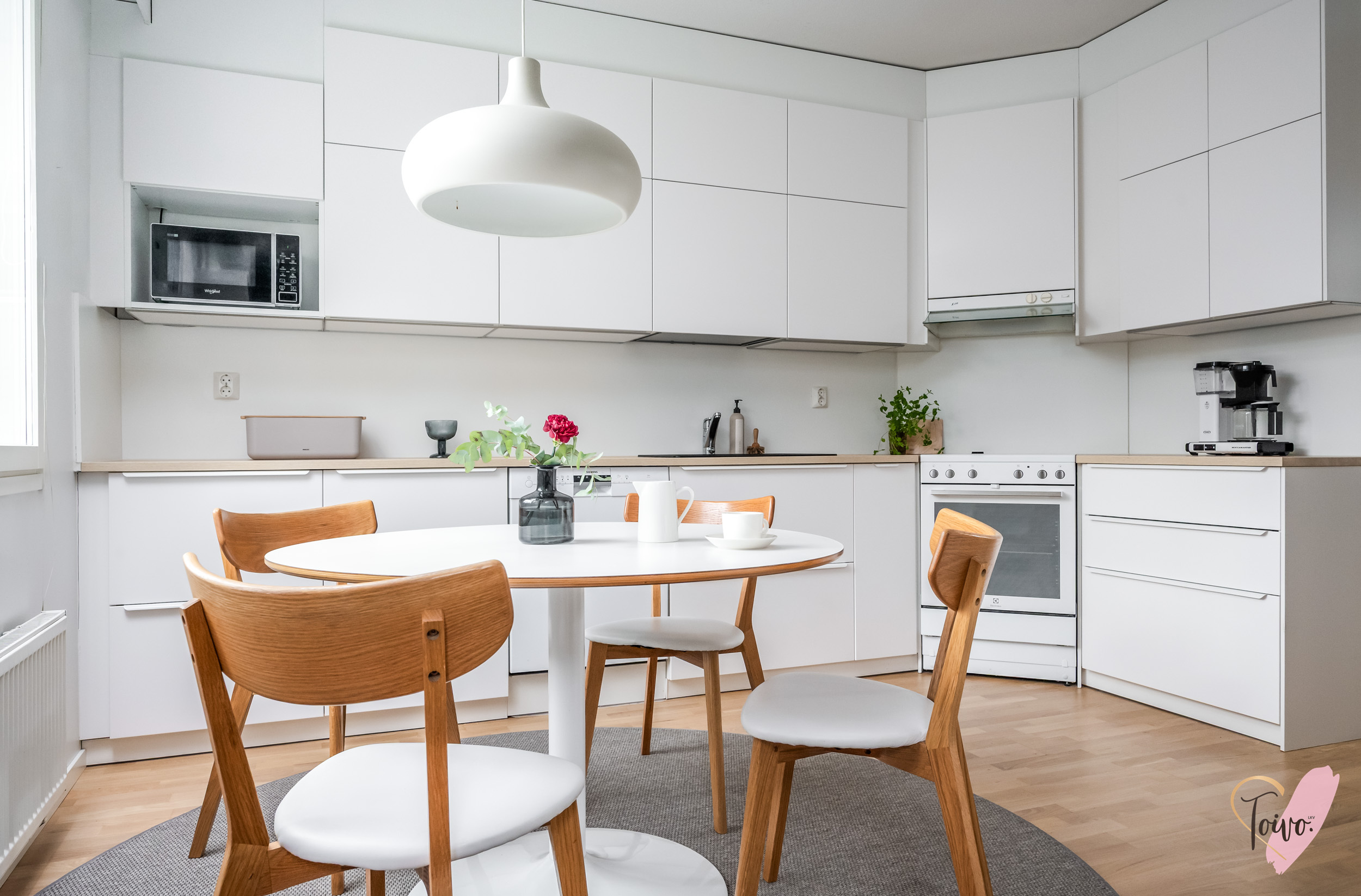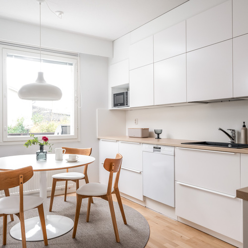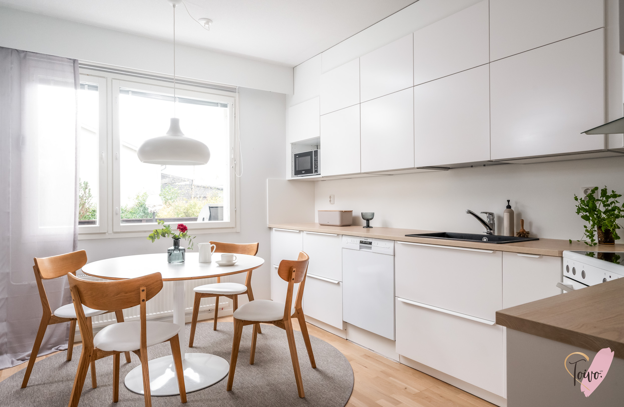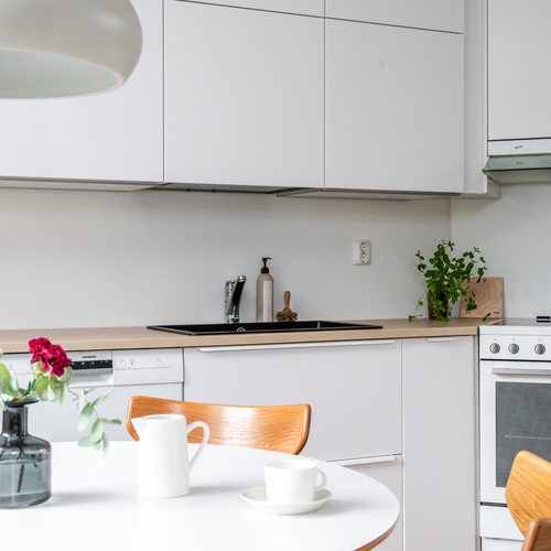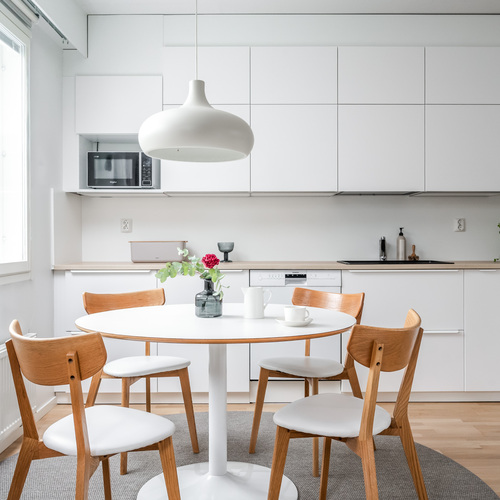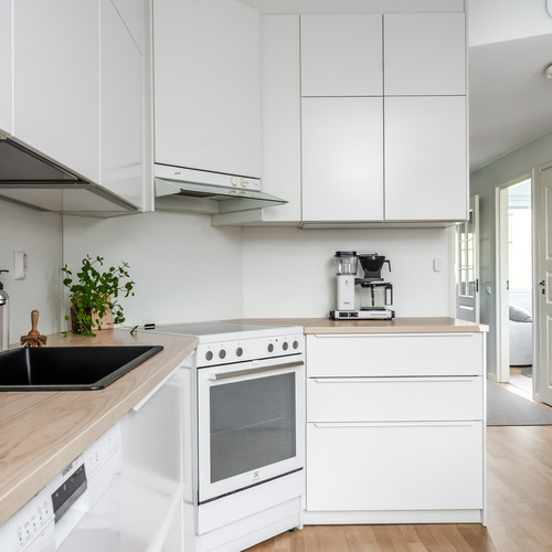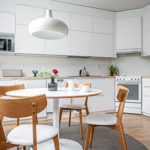 Keittiö on todellinen helmi. Valkoiset korkeakiiltoiset kaapistot yhdistettynä lämpimänsävyiseen puutasoon tekee tilasta modernin mutta kodikkaan. Ruokailutila sijoittuu suurien ikkunoiden äärelle, josta avautuu näkymä suojaisalle takapihalle.