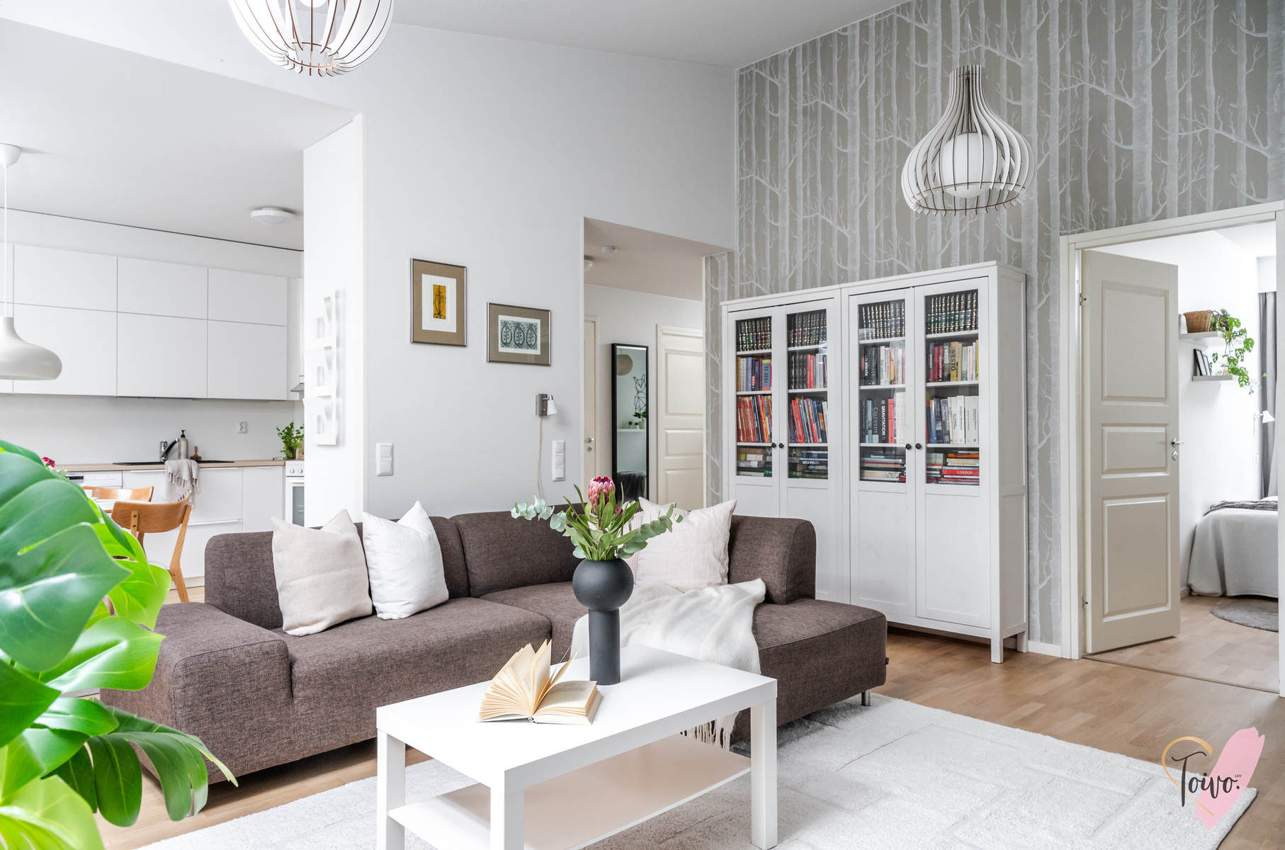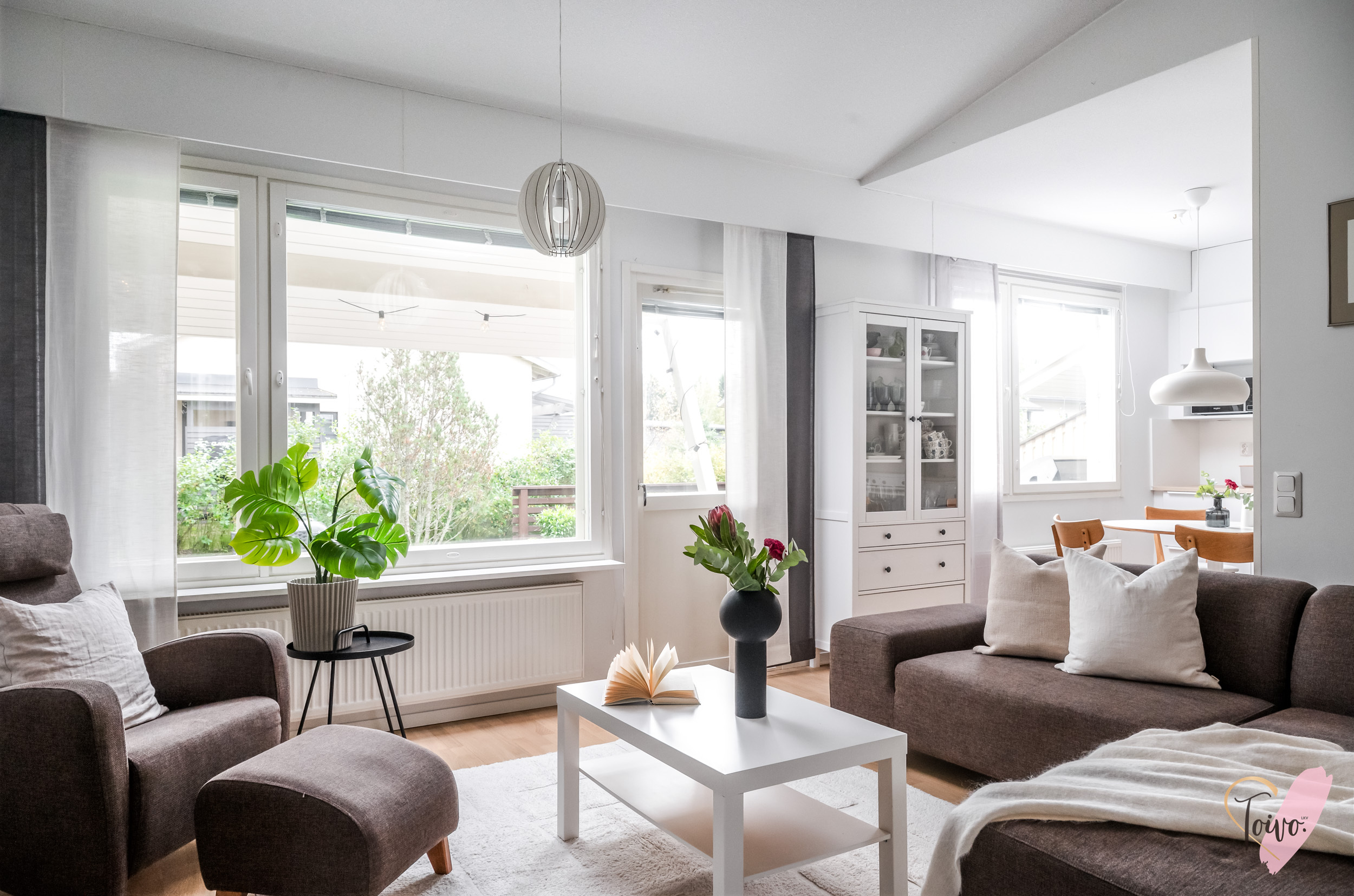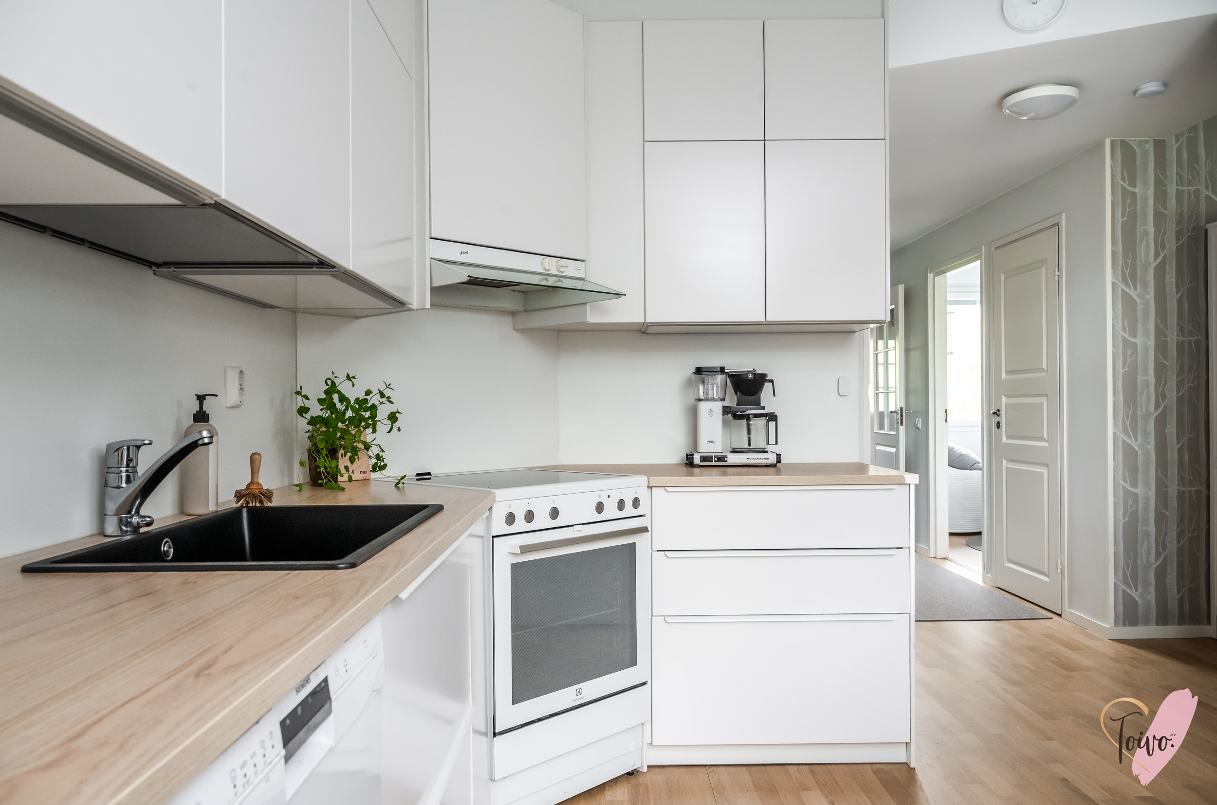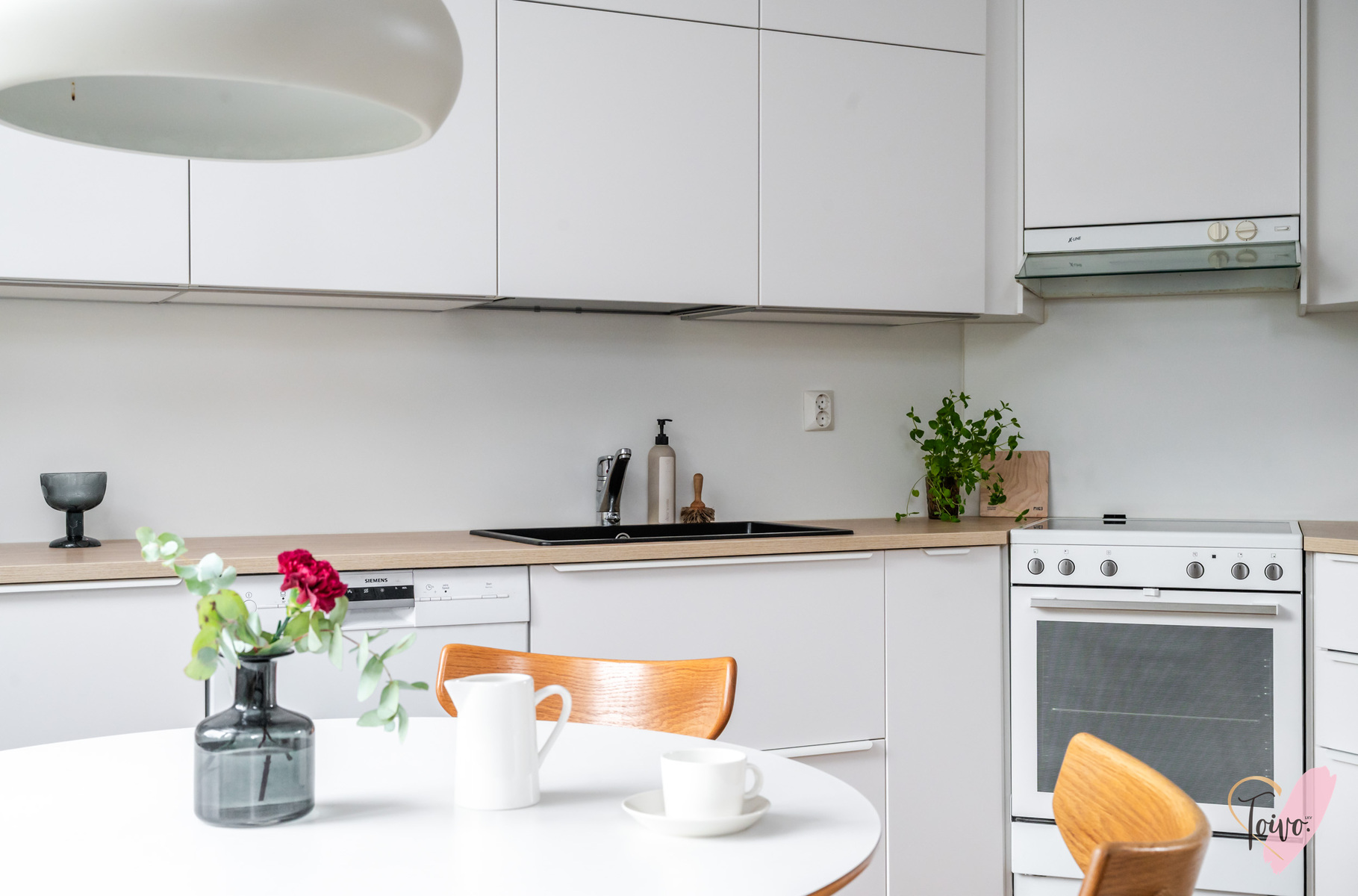 Keittiö on todellinen helmi. Valkoiset korkeakiiltoiset kaapistot yhdistettynä lämpimänsävyiseen puutasoon tekee tilasta modernin mutta kodikkaan. Ruokailutila sijoittuu suurien ikkunoiden äärelle, josta avautuu näkymä suojaisalle takapihalle.