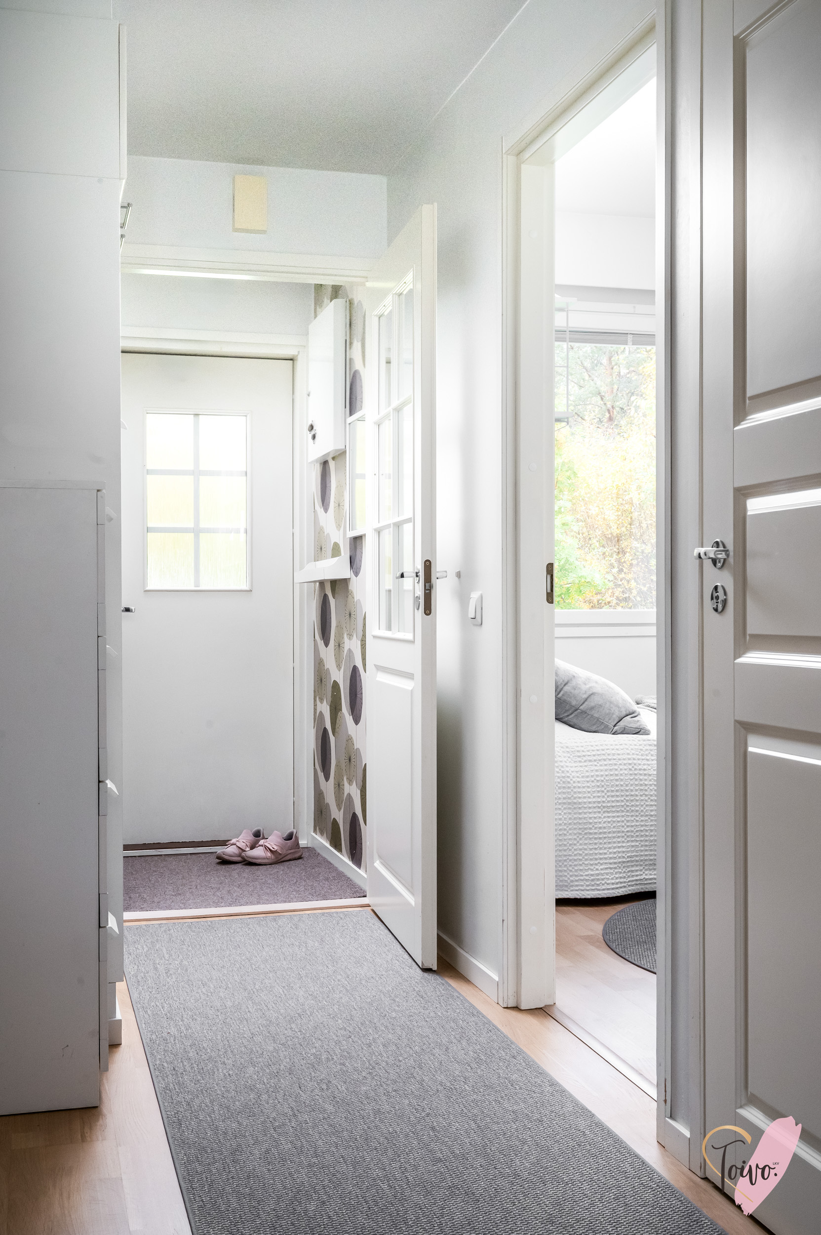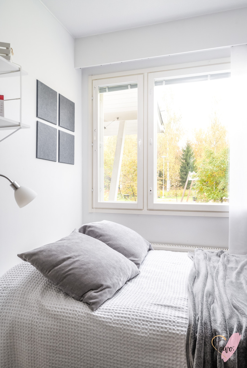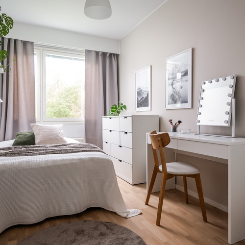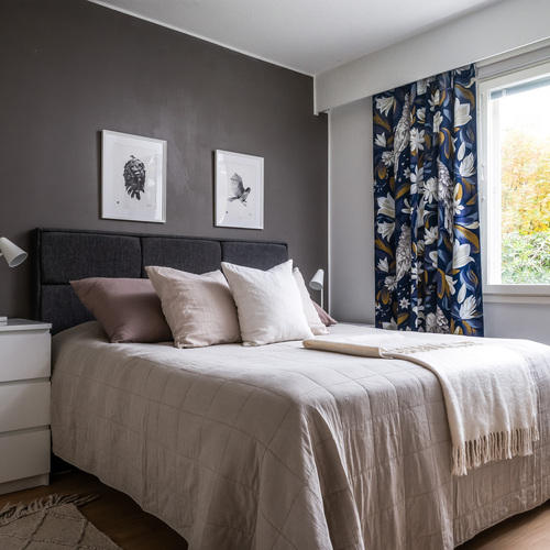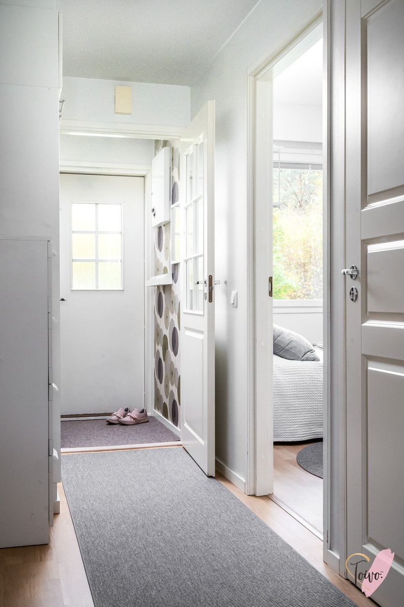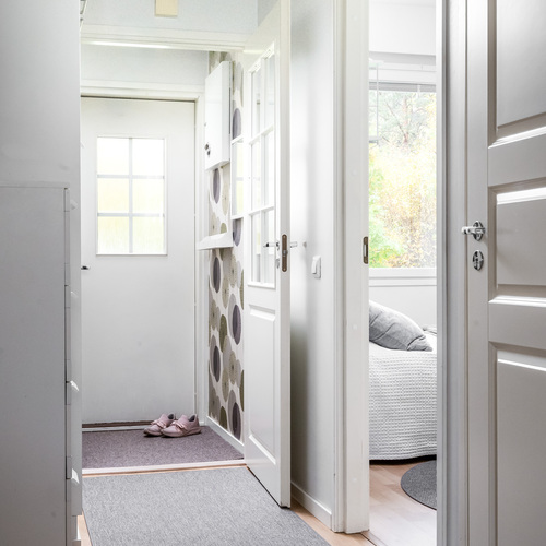 Kodin pohjaratkaisu on suunniteltu fiksusti. Makuuhuoneet sijoittuvat eteiskäytävän molemmin puolin tarjoten yksityisyyttä ja toiminnallisuutta. Toisessa makuuhuoneessa on oma vaatehuone, joka antaa mukavasti lisäsäilytystilaa. Vasemmalle jää erillinen wc, ja sen jatkeena kodin uudistettu kylpyhuone ja kodinhoitotila, jotka yhdistyvät saumattomasti tummaan saunaan, jossa on miellyttävät löylyt tarjoava sähkökiuas.