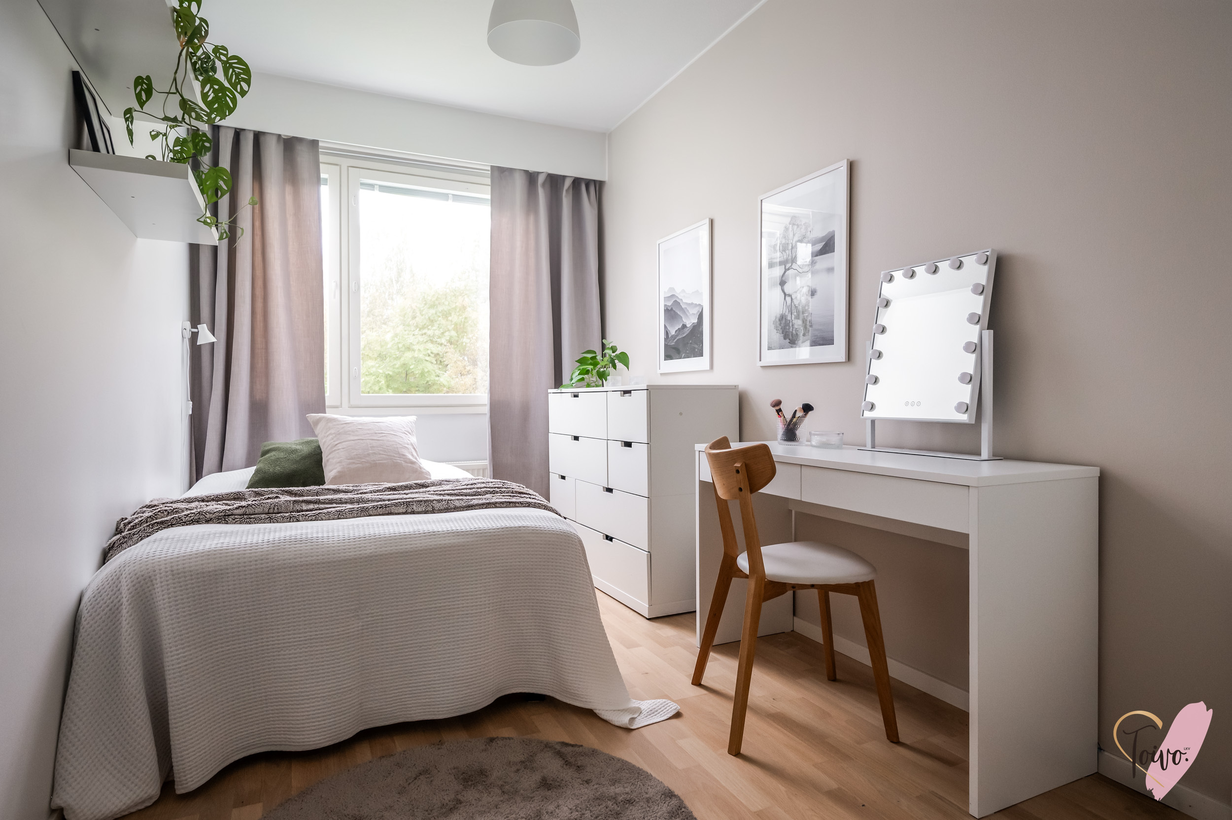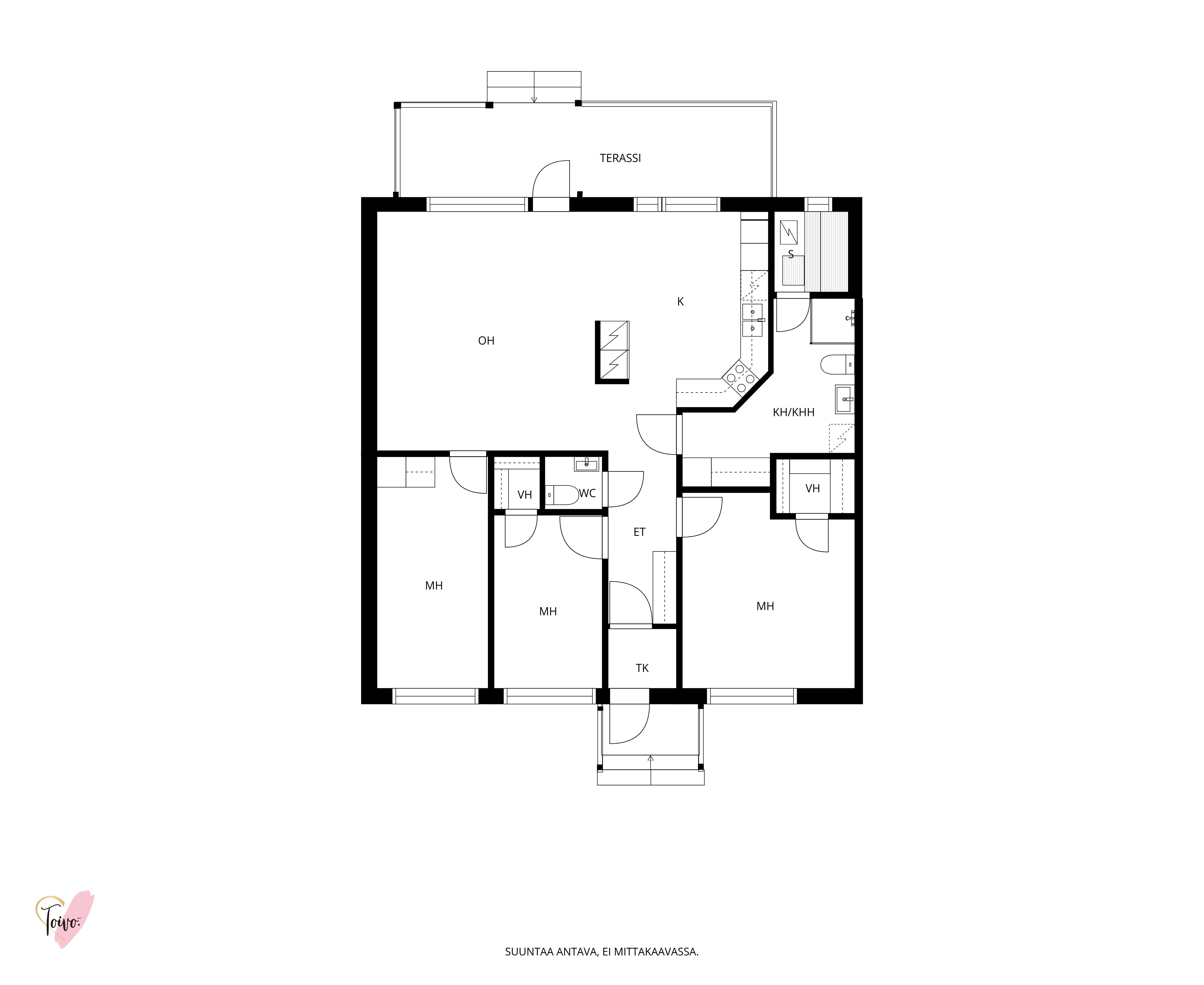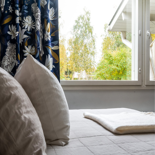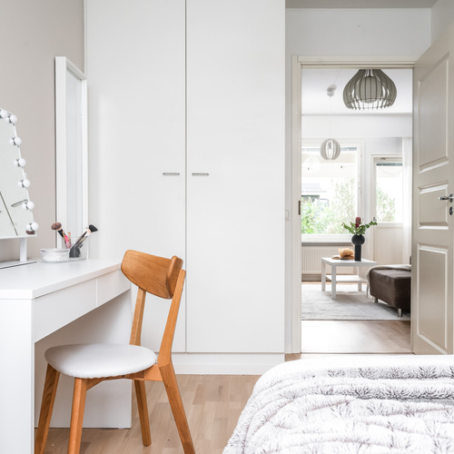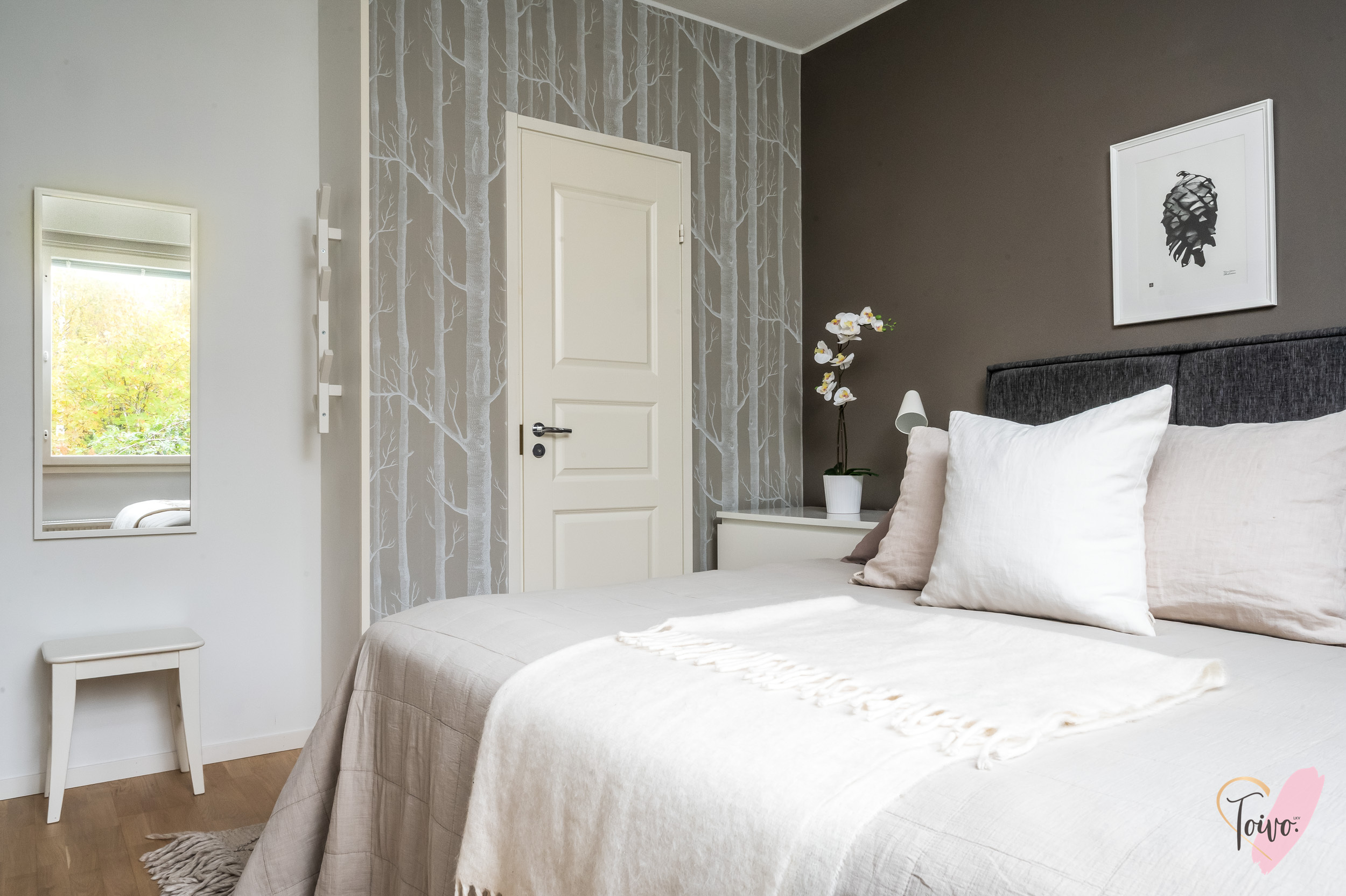 Kodin pohjaratkaisu on suunniteltu fiksusti. Makuuhuoneet sijoittuvat eteiskäytävän molemmin puolin tarjoten yksityisyyttä ja toiminnallisuutta. Toisessa makuuhuoneessa on oma vaatehuone, joka antaa mukavasti lisäsäilytystilaa. Vasemmalle jää erillinen wc, ja sen jatkeena kodin uudistettu kylpyhuone ja kodinhoitotila, jotka yhdistyvät saumattomasti tummaan saunaan, jossa on miellyttävät löylyt tarjoava sähkökiuas.