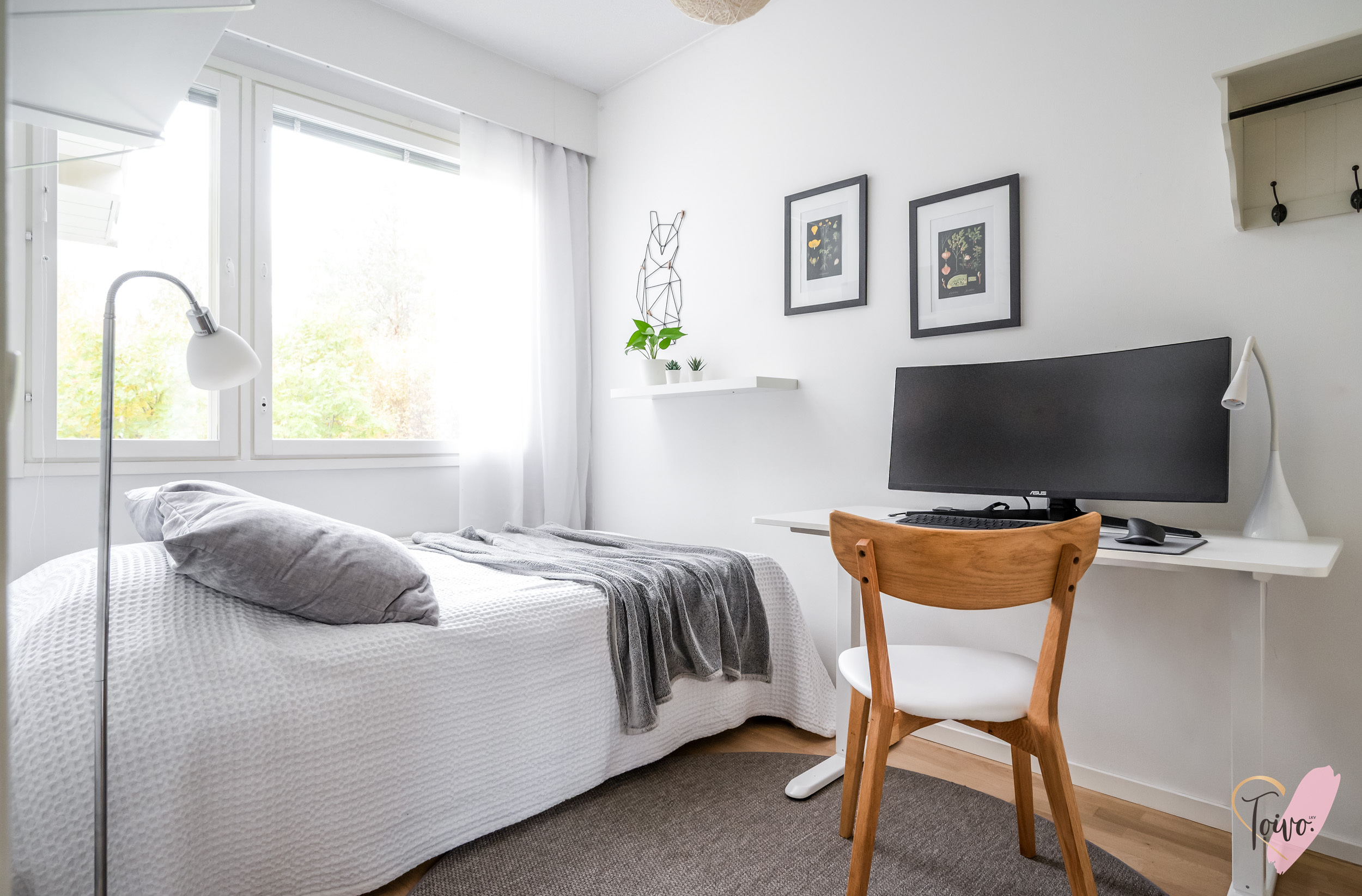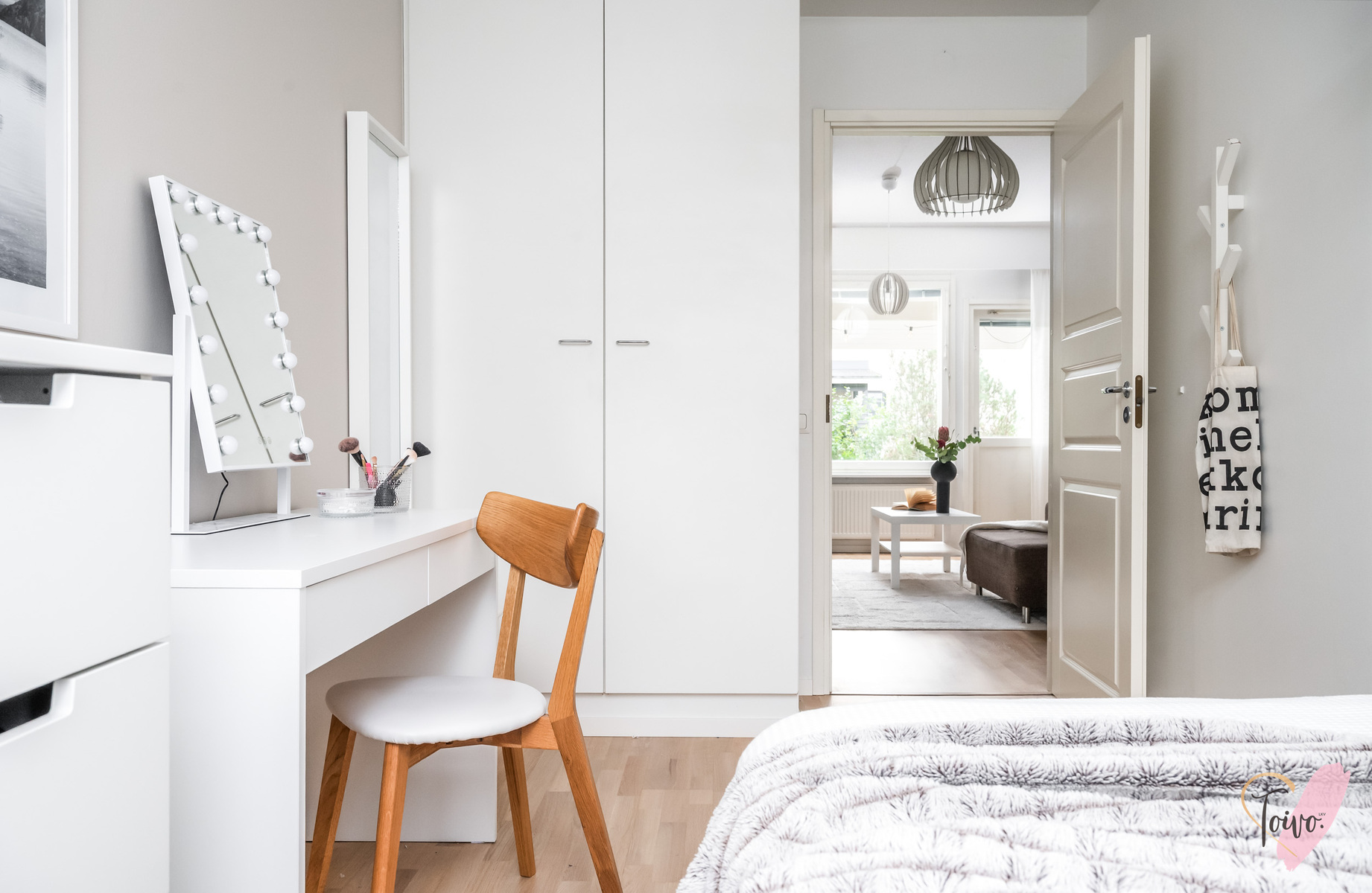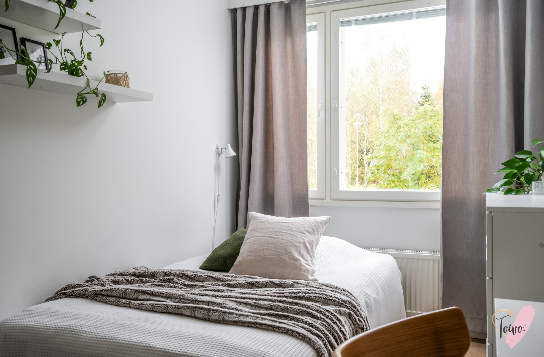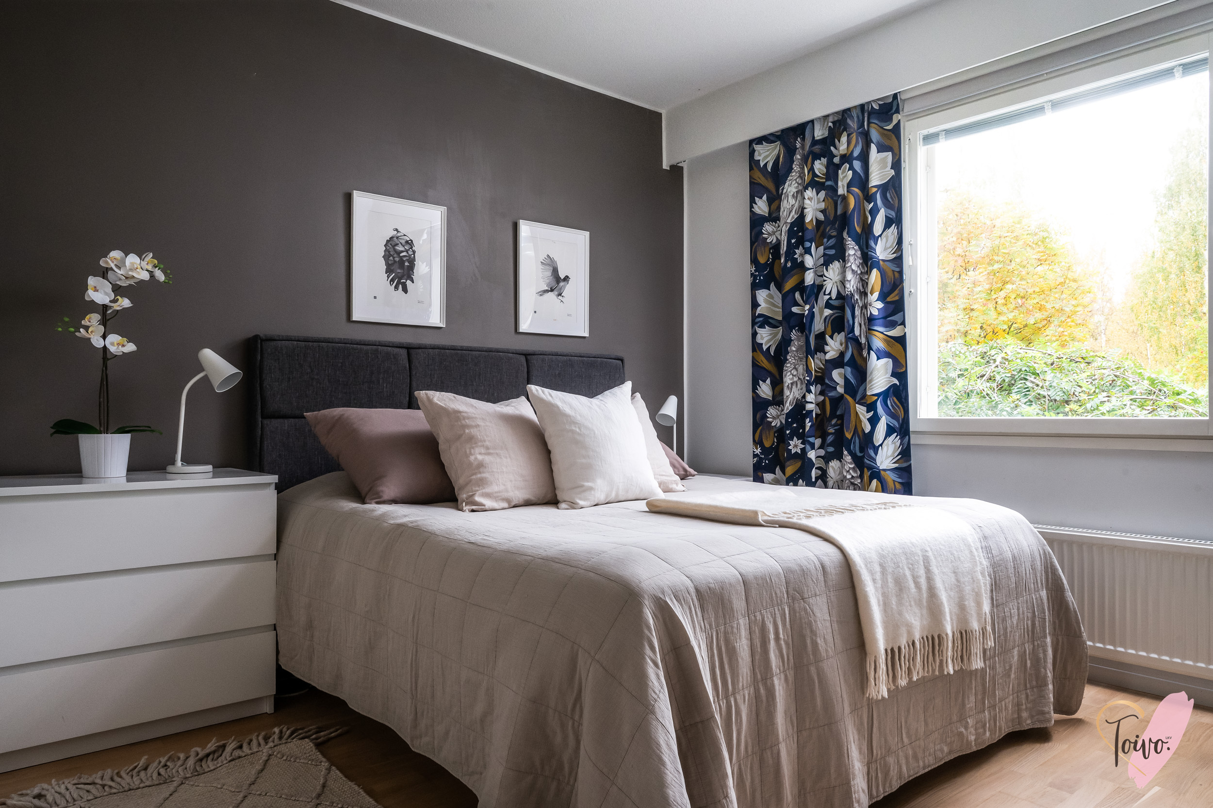 Kodin pohjaratkaisu on suunniteltu fiksusti. Makuuhuoneet sijoittuvat eteiskäytävän molemmin puolin tarjoten yksityisyyttä ja toiminnallisuutta. Toisessa makuuhuoneessa on oma vaatehuone, joka antaa mukavasti lisäsäilytystilaa. Vasemmalle jää erillinen wc, ja sen jatkeena kodin uudistettu kylpyhuone ja kodinhoitotila, jotka yhdistyvät saumattomasti tummaan saunaan, jossa on miellyttävät löylyt tarjoava sähkökiuas.