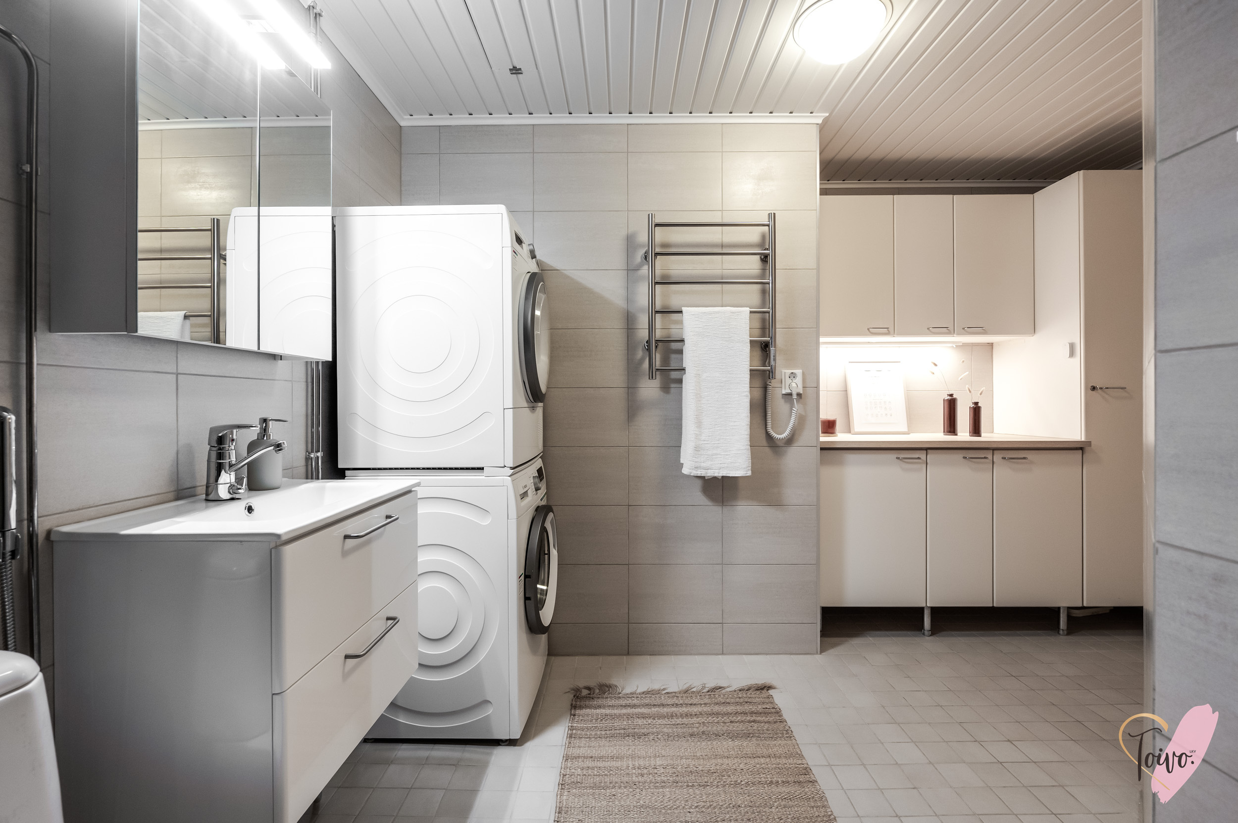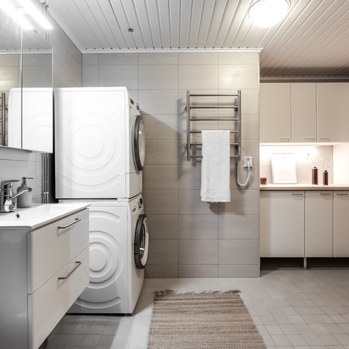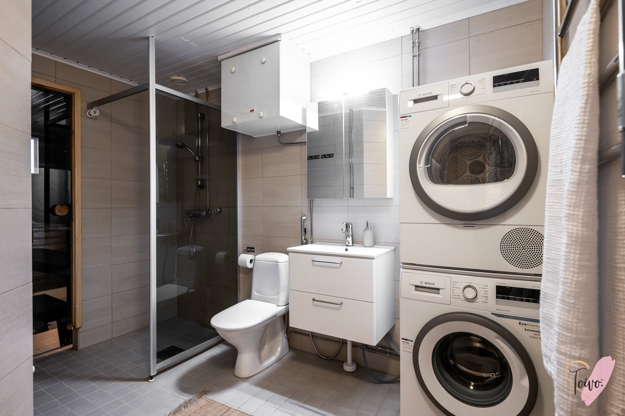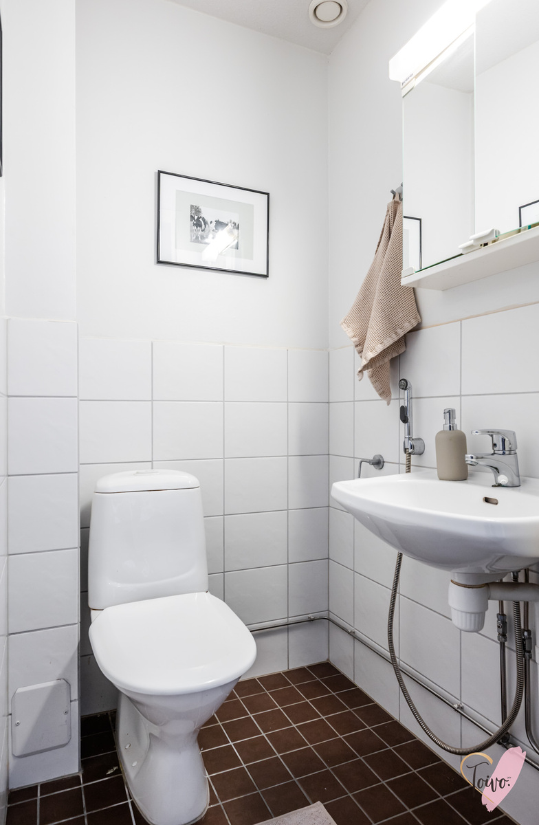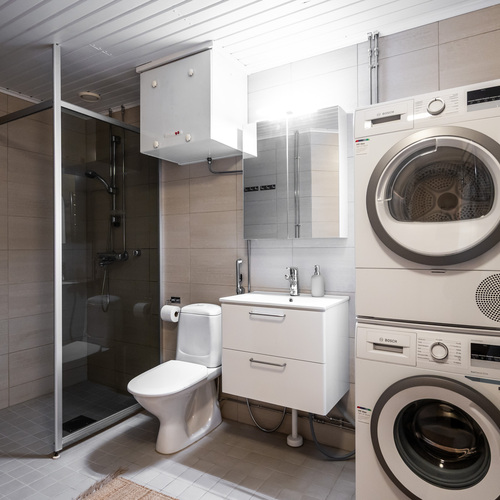 Varusteet: pesukoneliitäntä, lattialämmitys, wc-istuin, suihku, peilikaappi, kiinteät valaisimet, kylpyhuonekaapisto