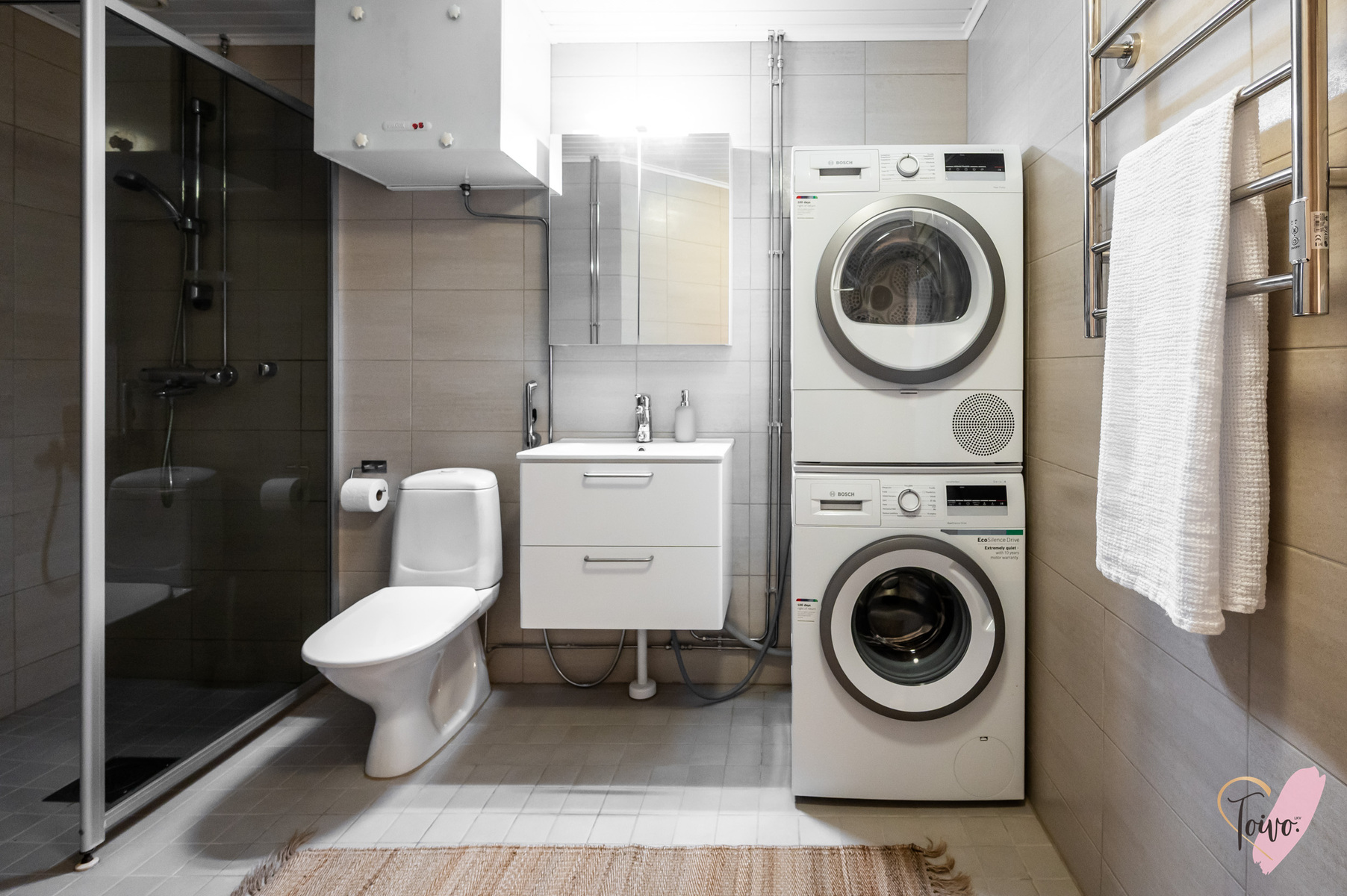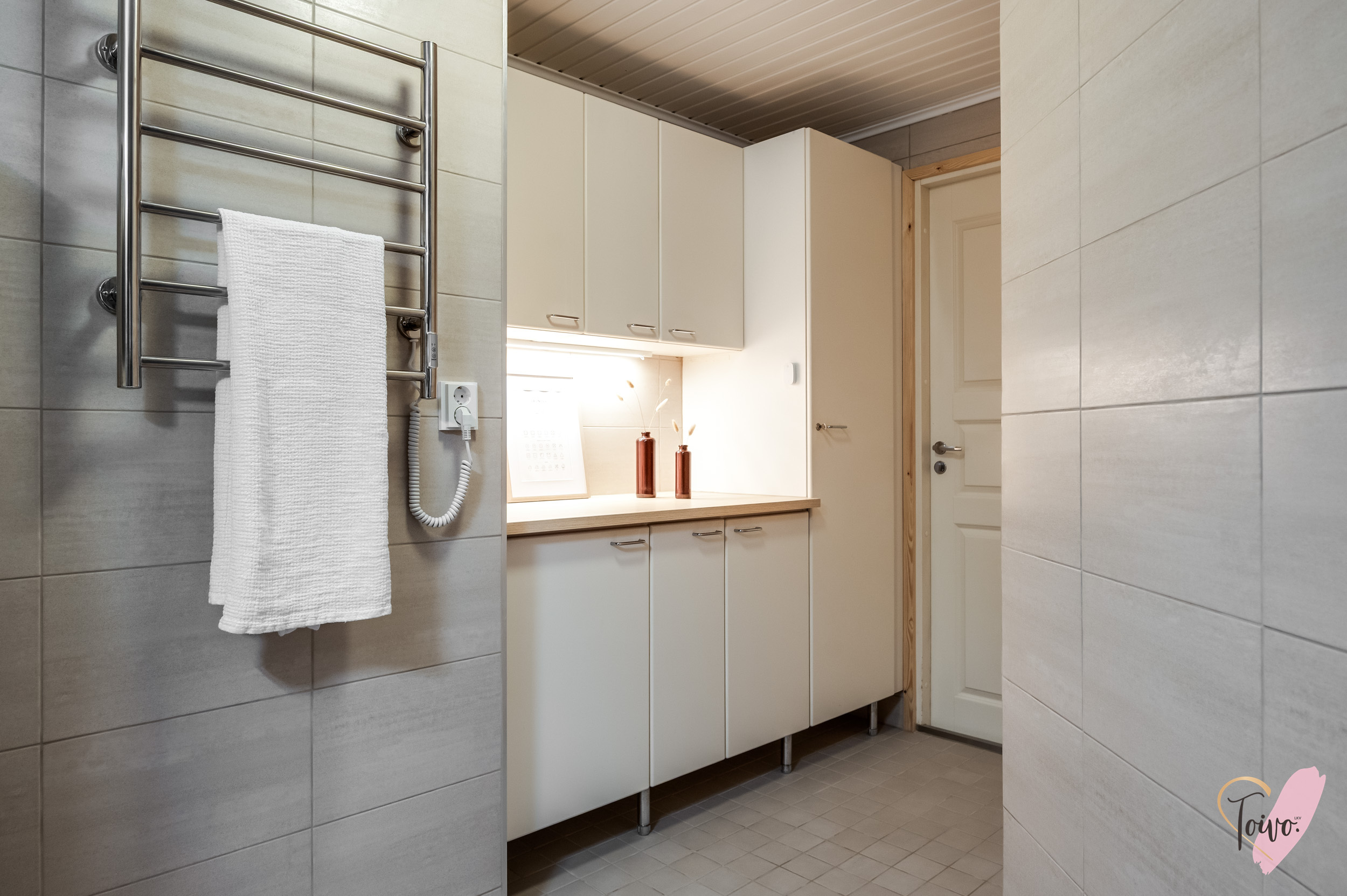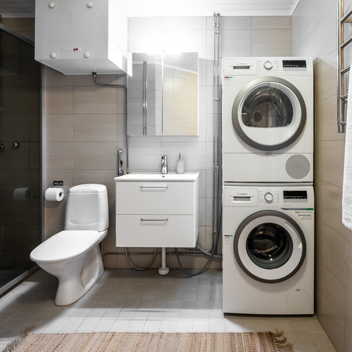 Varusteet: pesukoneliitäntä, lattialämmitys, wc-istuin, suihku, peilikaappi, kiinteät valaisimet, kylpyhuonekaapisto