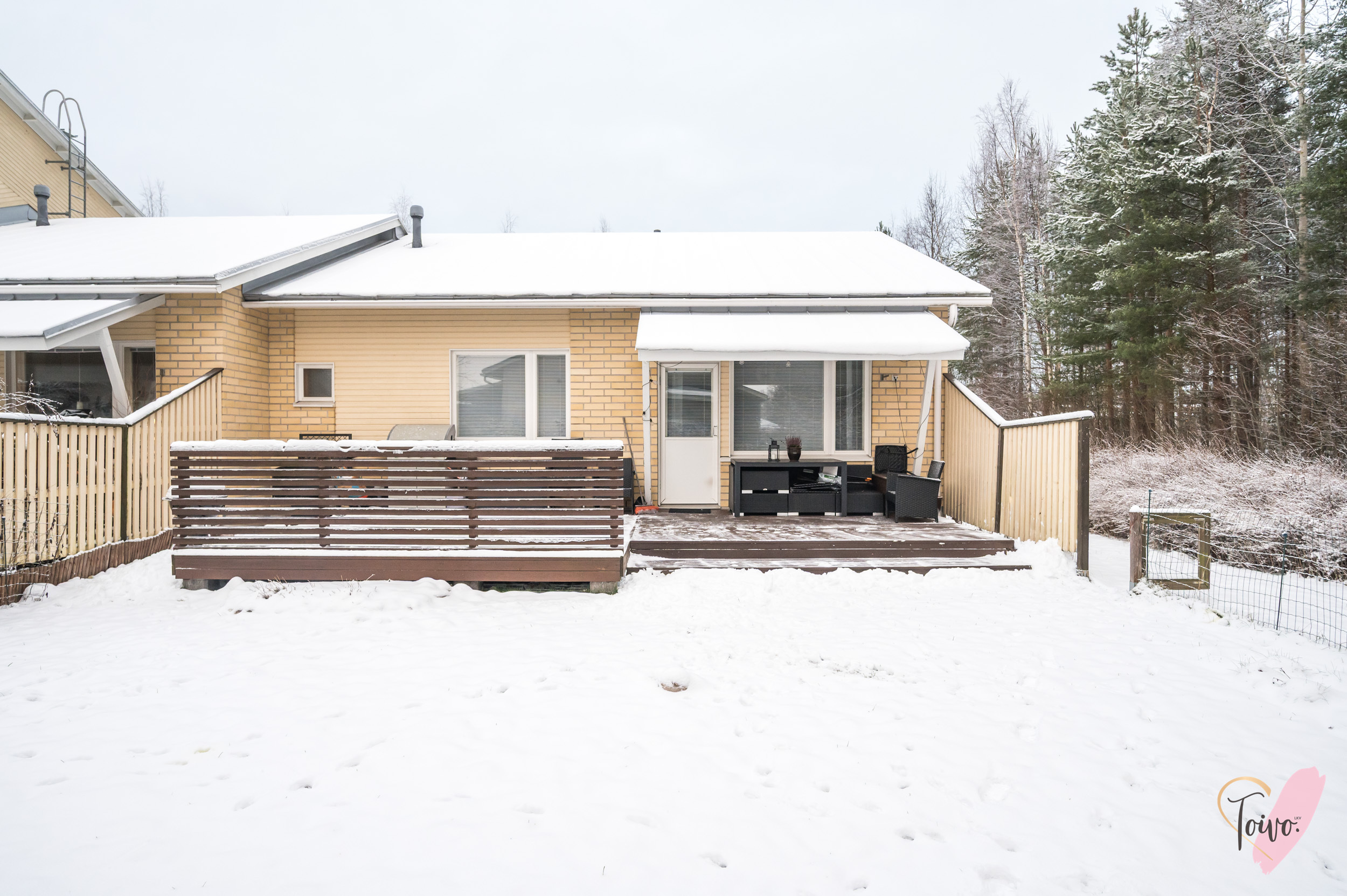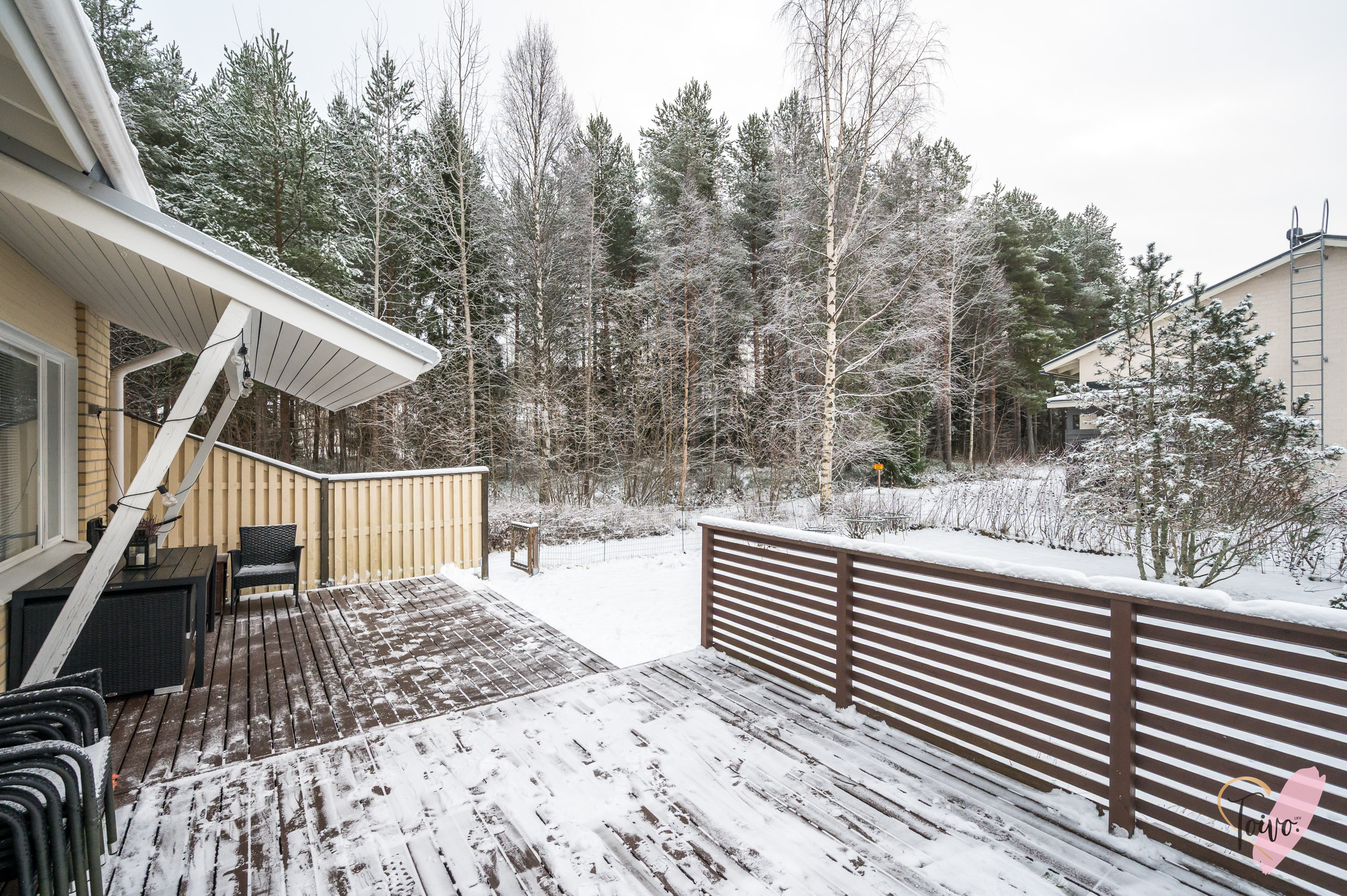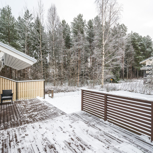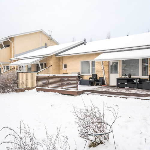 Olohuoneessa huomio kiinnittyy viistoon, korkeaan kattoon, joka antaa tilalle ilmavuutta ja avaruutta. Olohuoneesta on kulku kodin kolmanteen makuuhuoneeseen sekä toiselta puolelta tilaa suoraan takapihalle, jossa on tilava ja laajennettu terassi, sekä oma pieni piha-alue, joka kutsuu viettämään aikaa ulkona. Piha on loistava niin lasten leikkeihin kuin aikuisen rentoutumishetkiin.