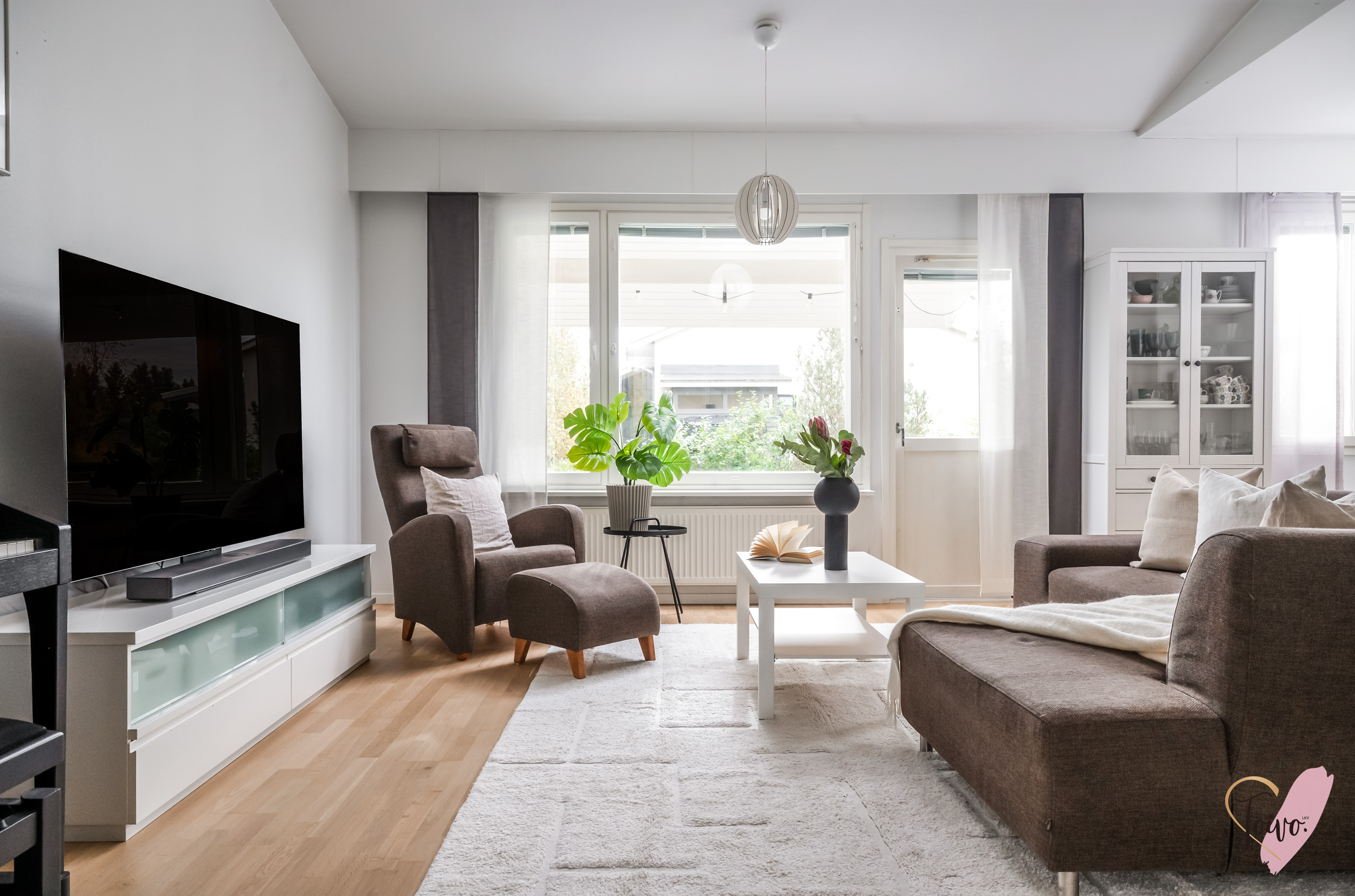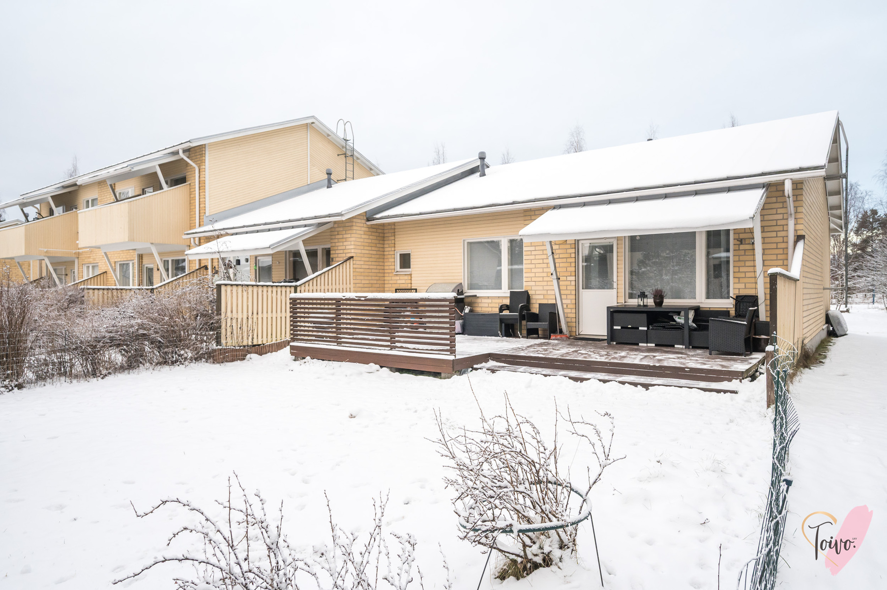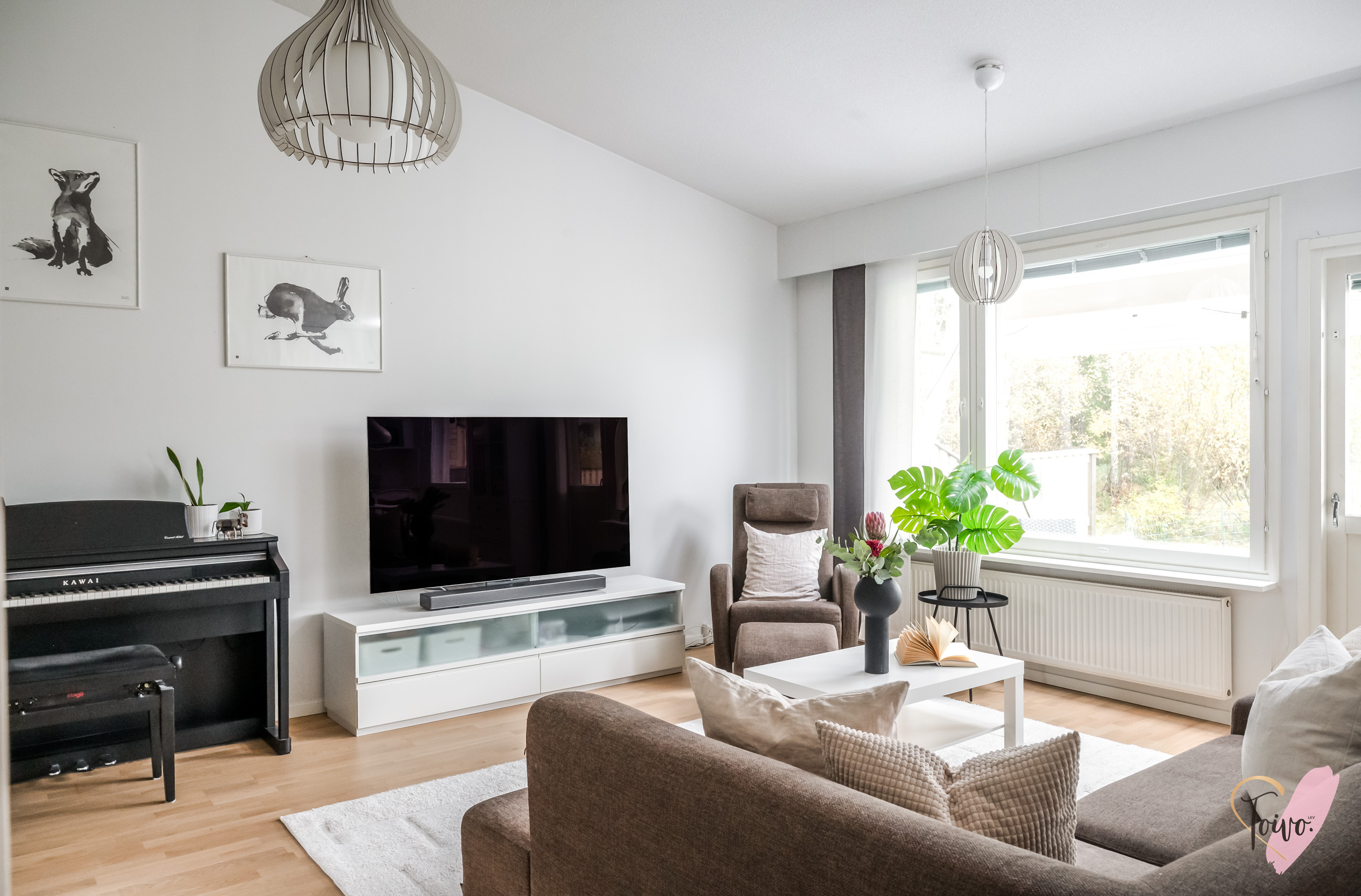 Olohuoneessa huomio kiinnittyy viistoon, korkeaan kattoon, joka antaa tilalle ilmavuutta ja avaruutta. Olohuoneesta on kulku kodin kolmanteen makuuhuoneeseen sekä toiselta puolelta tilaa suoraan takapihalle, jossa on tilava ja laajennettu terassi, sekä oma pieni piha-alue, joka kutsuu viettämään aikaa ulkona. Piha on loistava niin lasten leikkeihin kuin aikuisen rentoutumishetkiin.