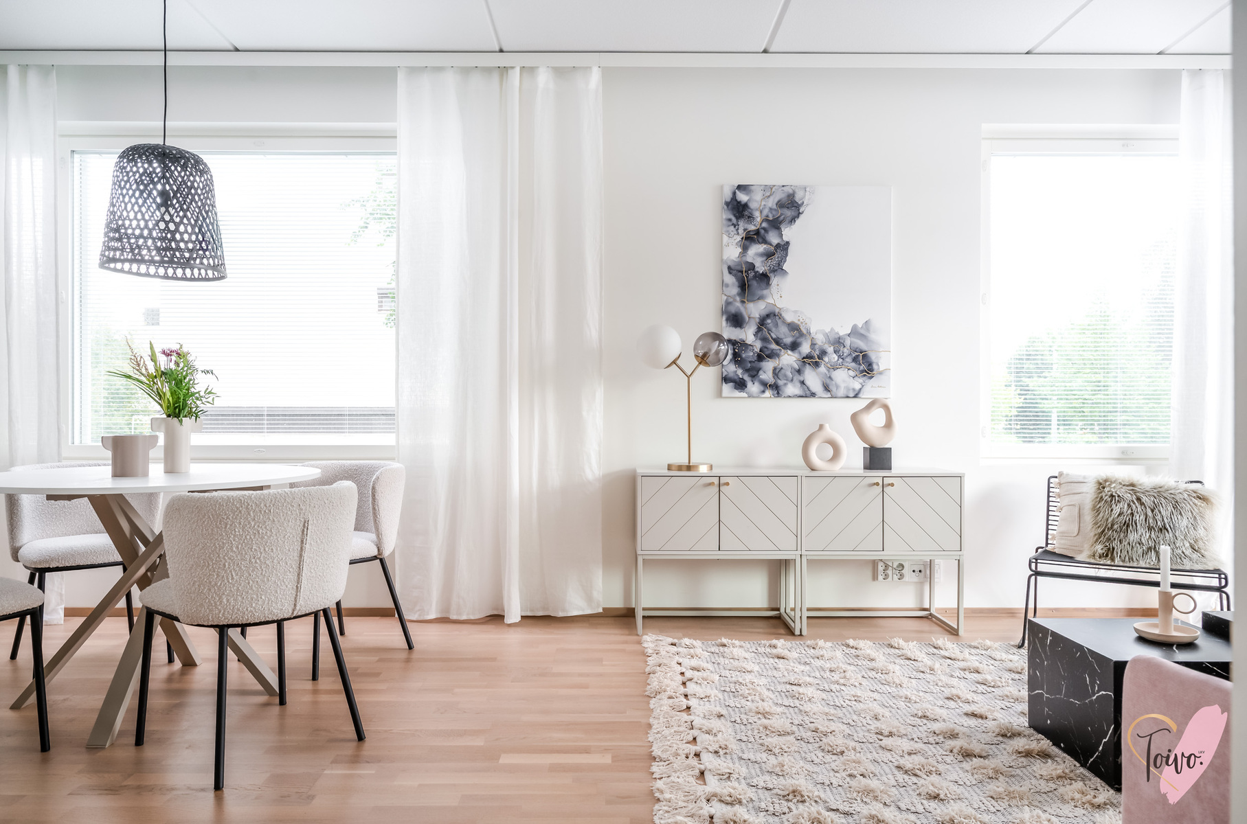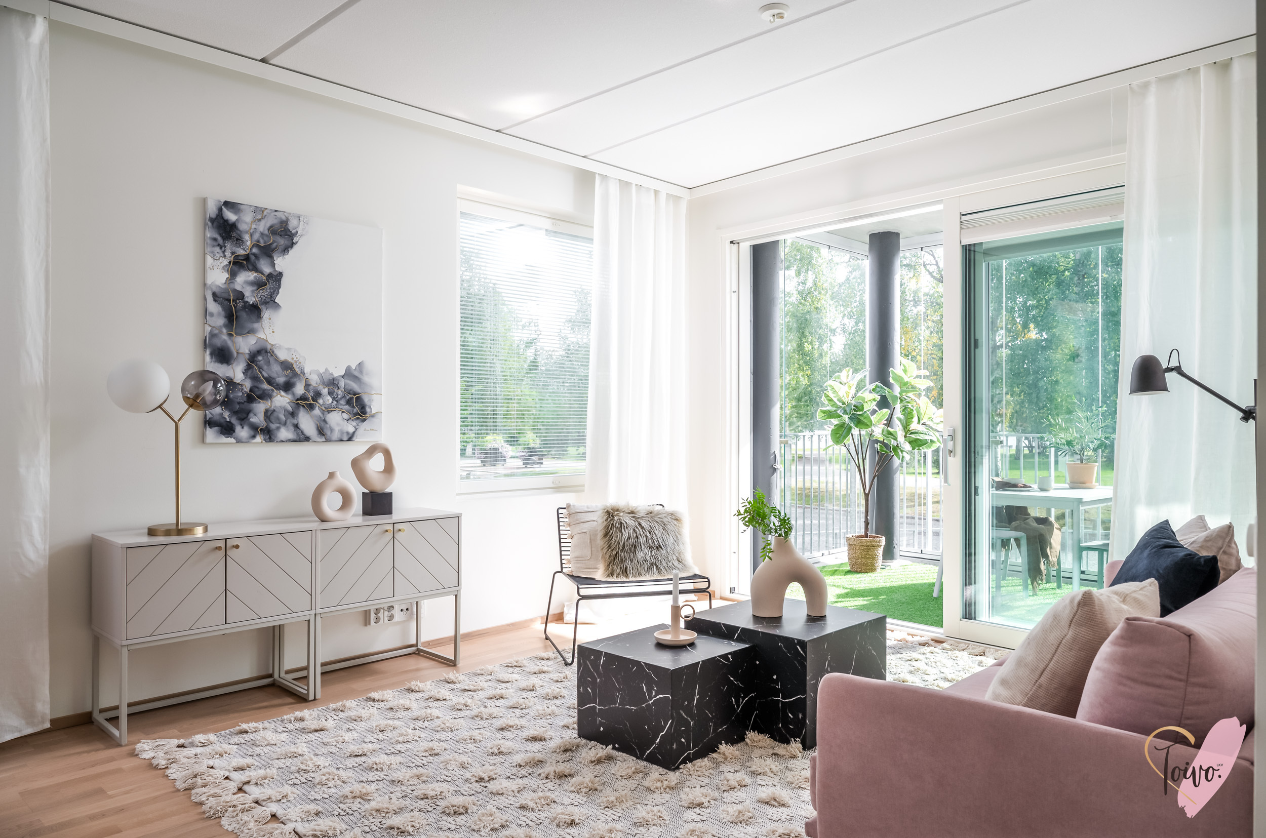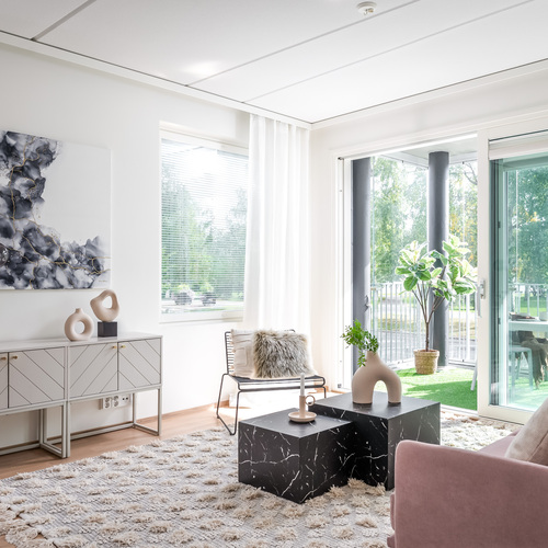 Olohuone on saumattomasti keittiön ja ruokailutilan jatkeena. Tähän valoisaan maisemaan saat luotua mitä ihanimman paikan rentoutumiseen ja yhdessäoloon.