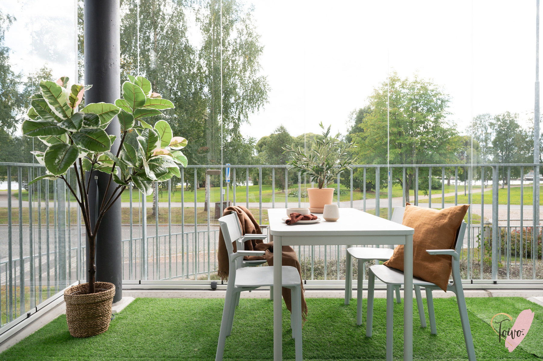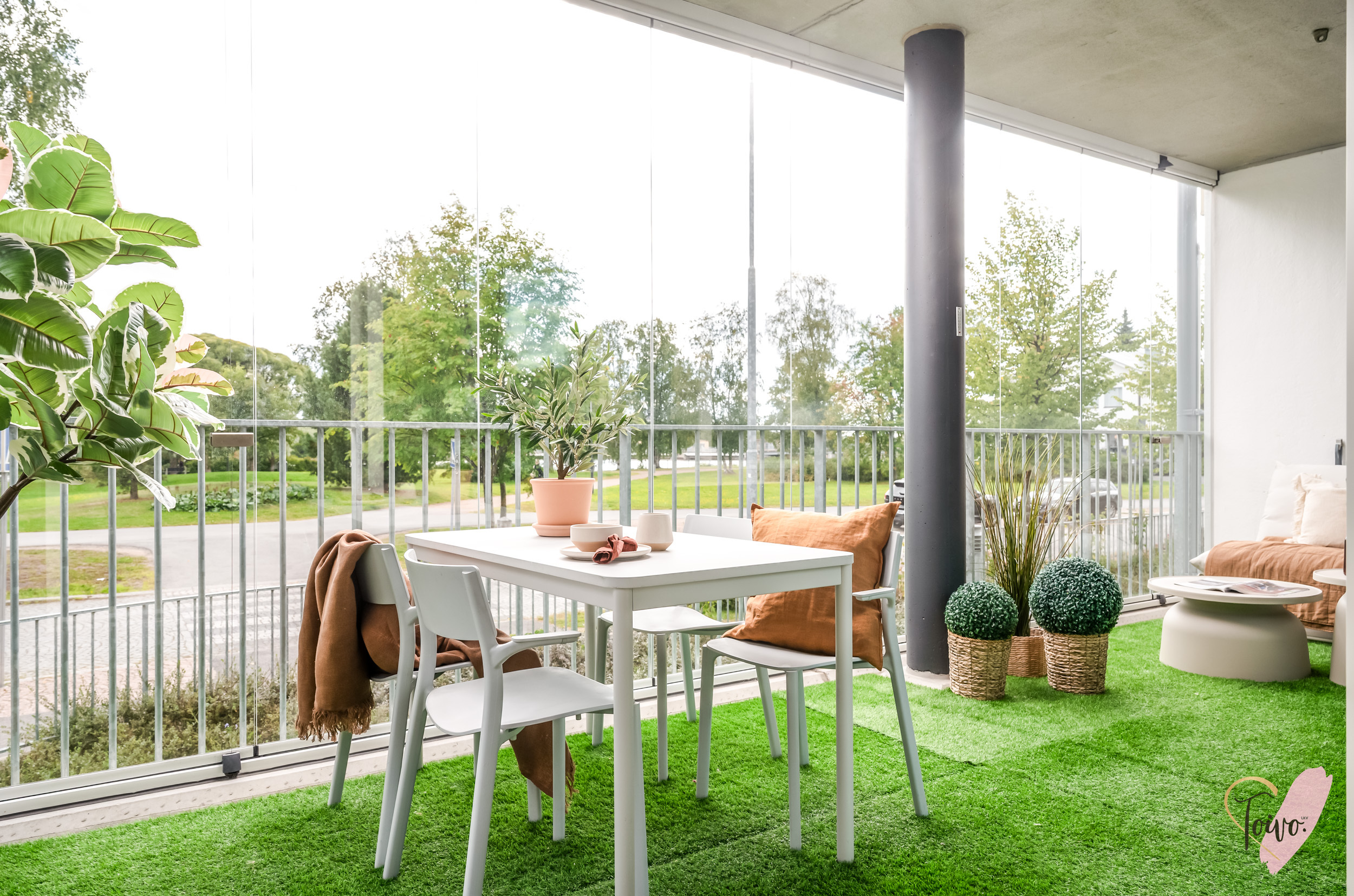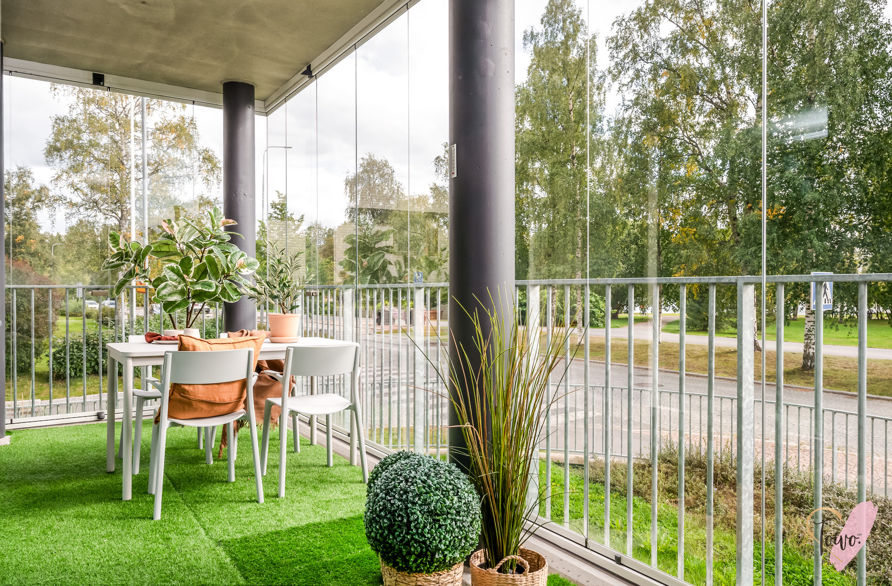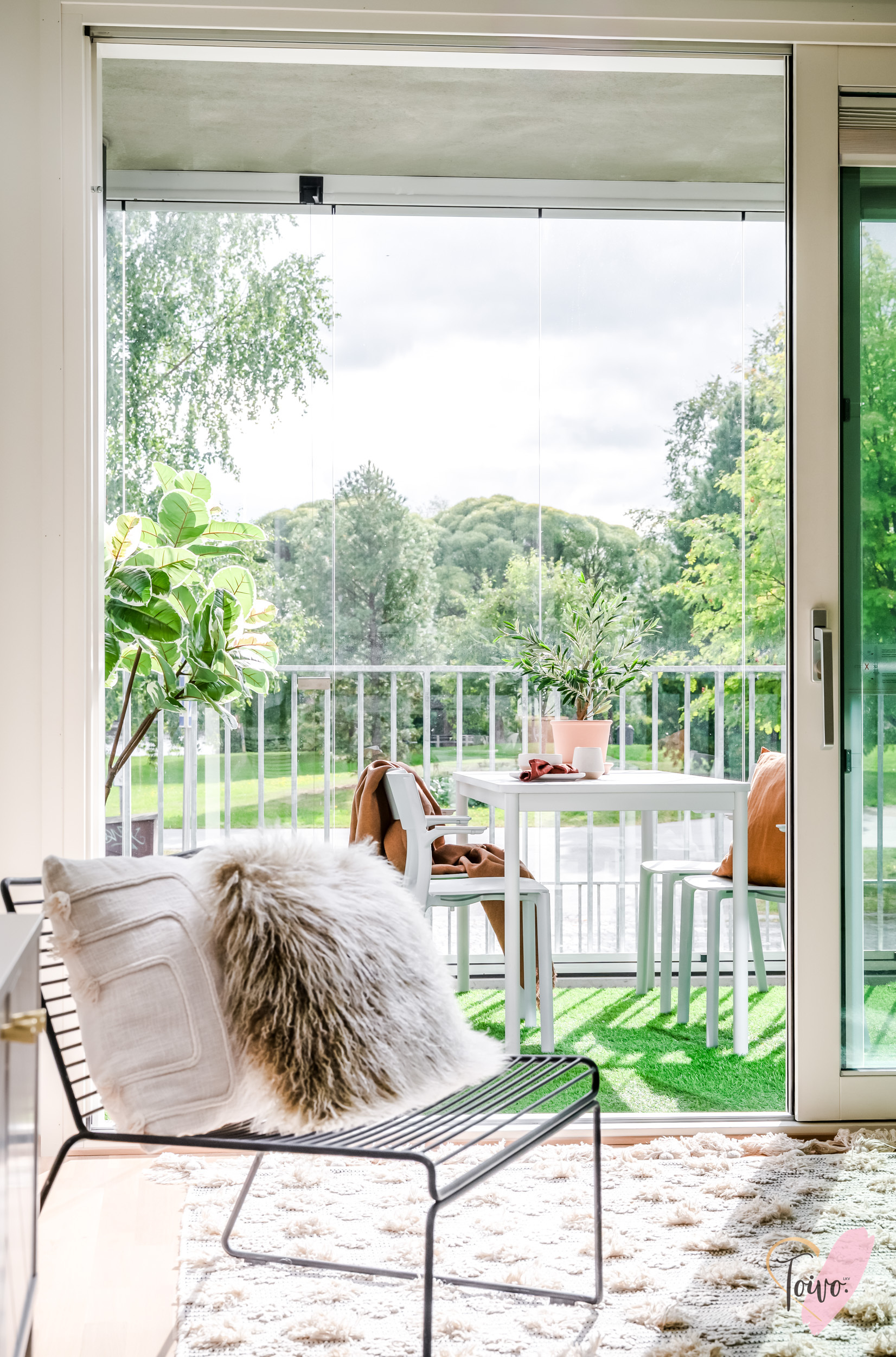 Avarat oleskelutilat jatkuvat olohuoneesta isolle lasitetulle parvekkeelle. Parveke on todella huikean kokoinen, sinne on ihanaa sisustaa viihtyisä kesäkeidas ja luoda kausivaloilla tunnelmaa pimeneviin syysiltoihin.