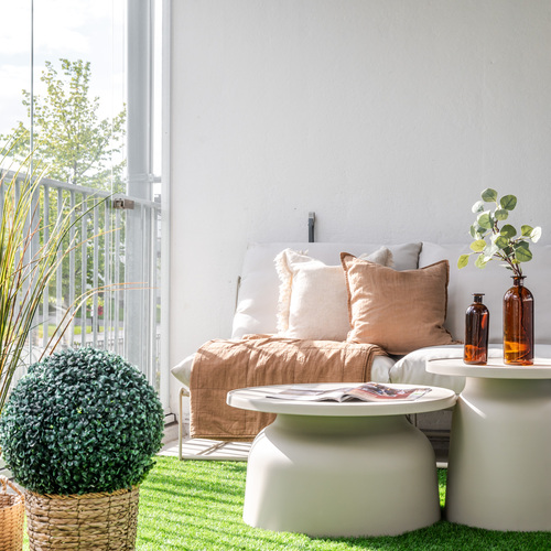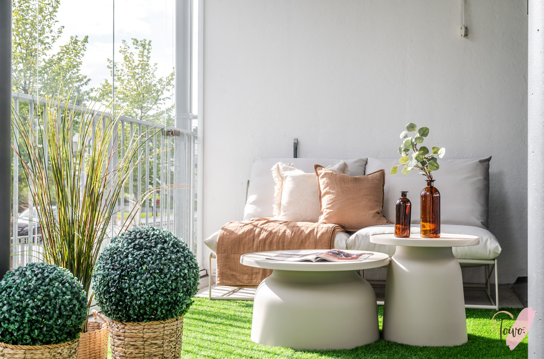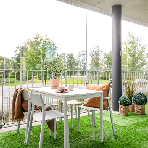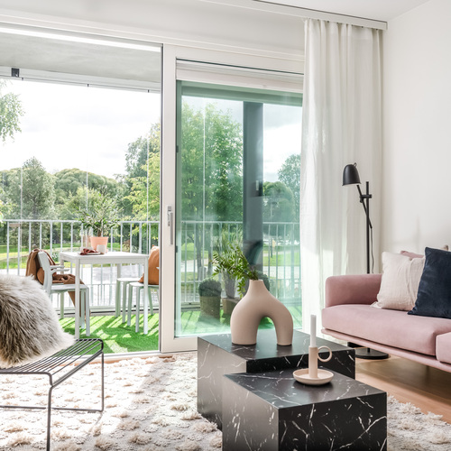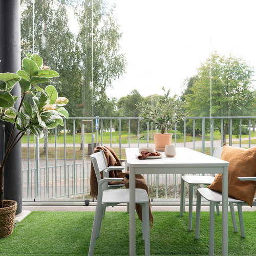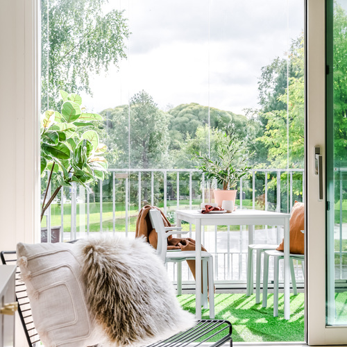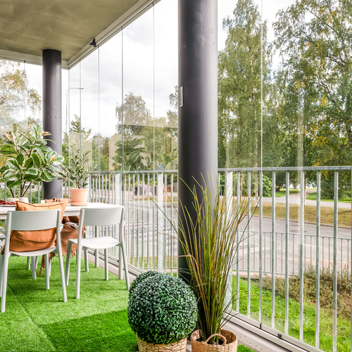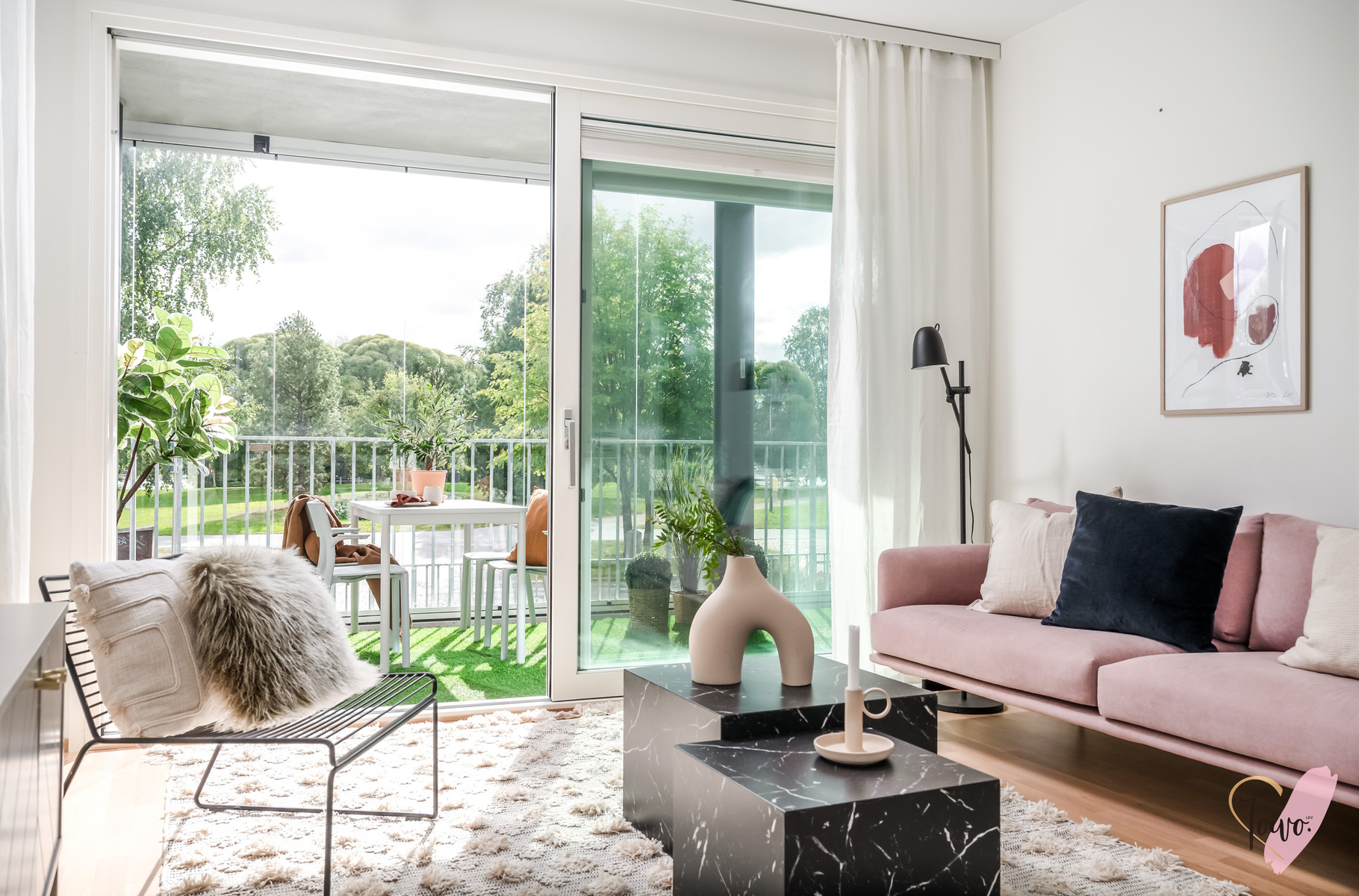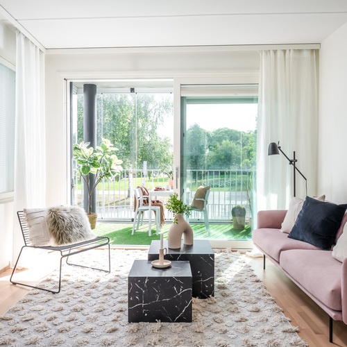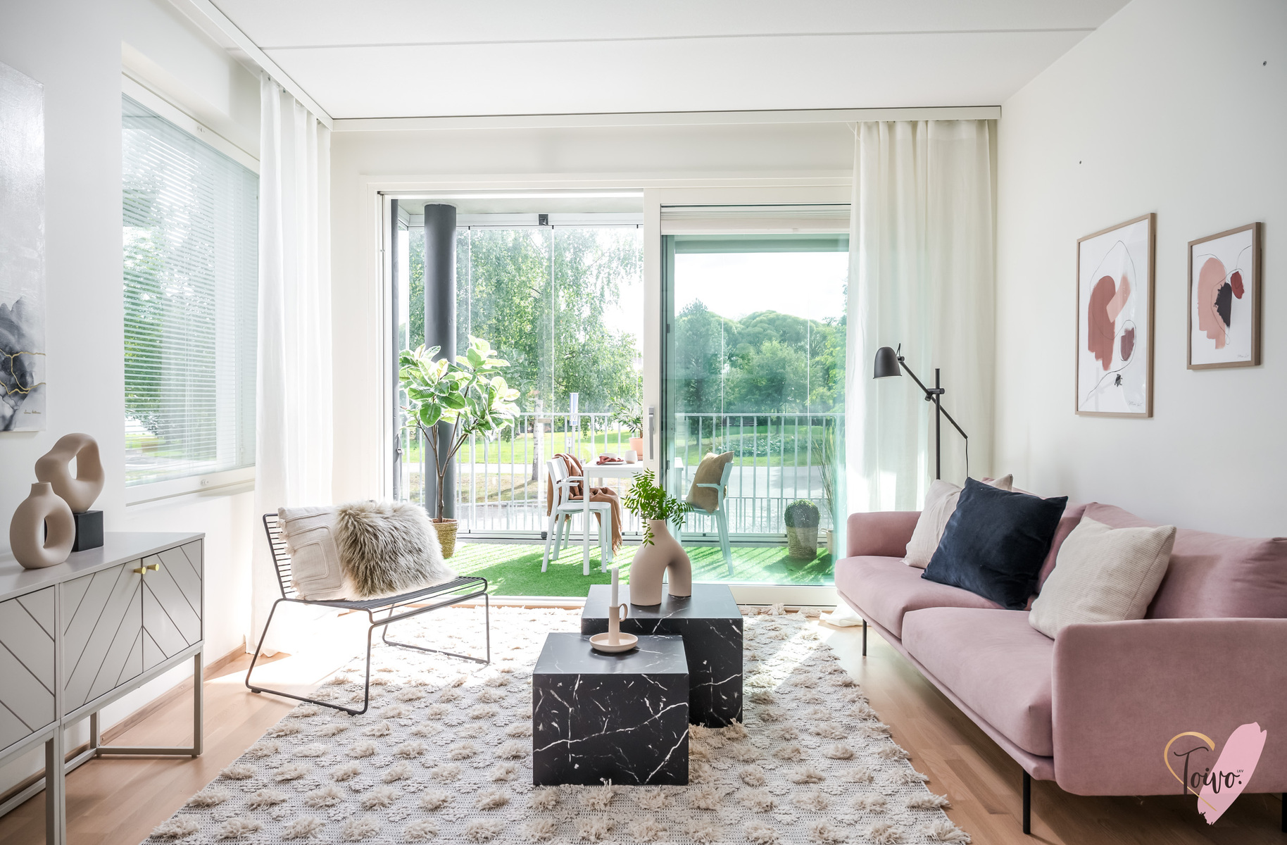 Avarat oleskelutilat jatkuvat olohuoneesta isolle lasitetulle parvekkeelle. Parveke on todella huikean kokoinen, sinne on ihanaa sisustaa viihtyisä kesäkeidas ja luoda kausivaloilla tunnelmaa pimeneviin syysiltoihin.