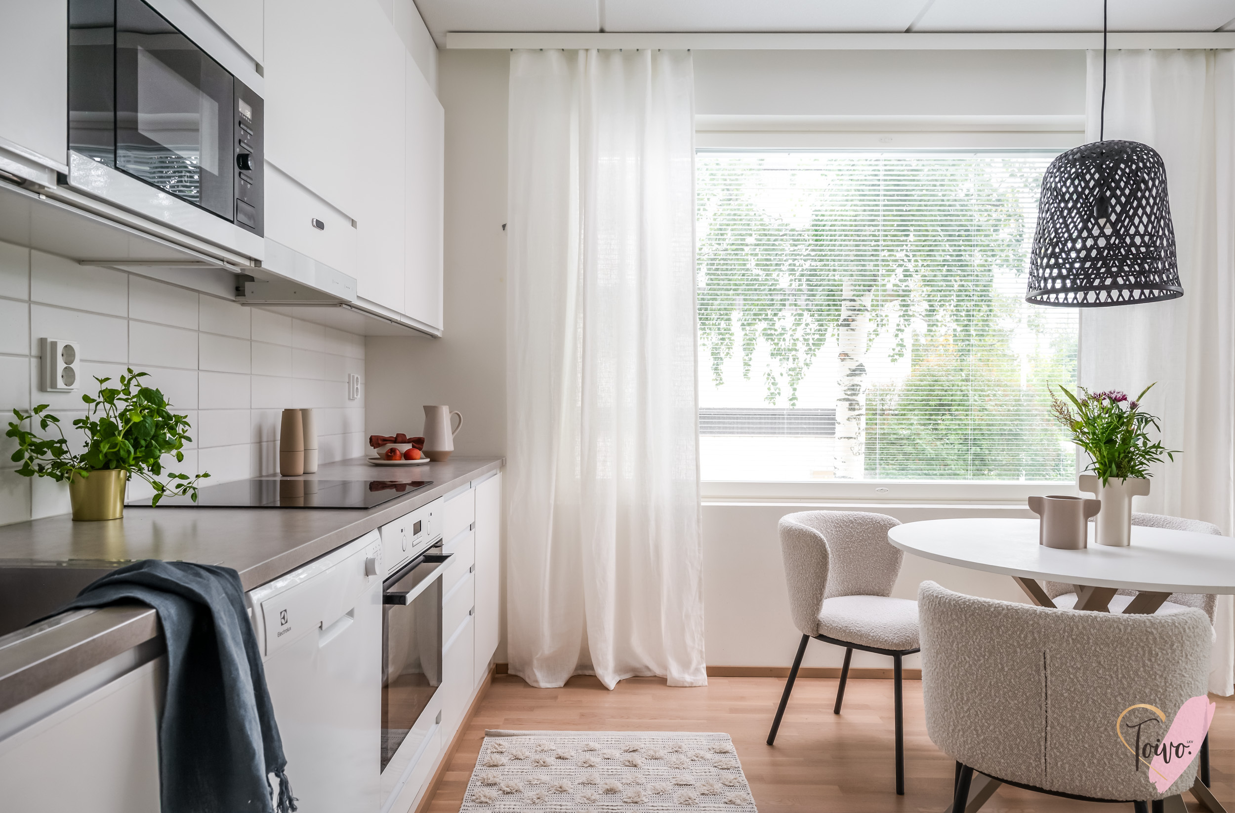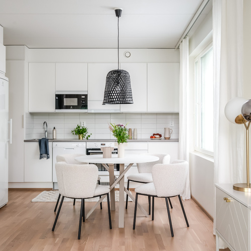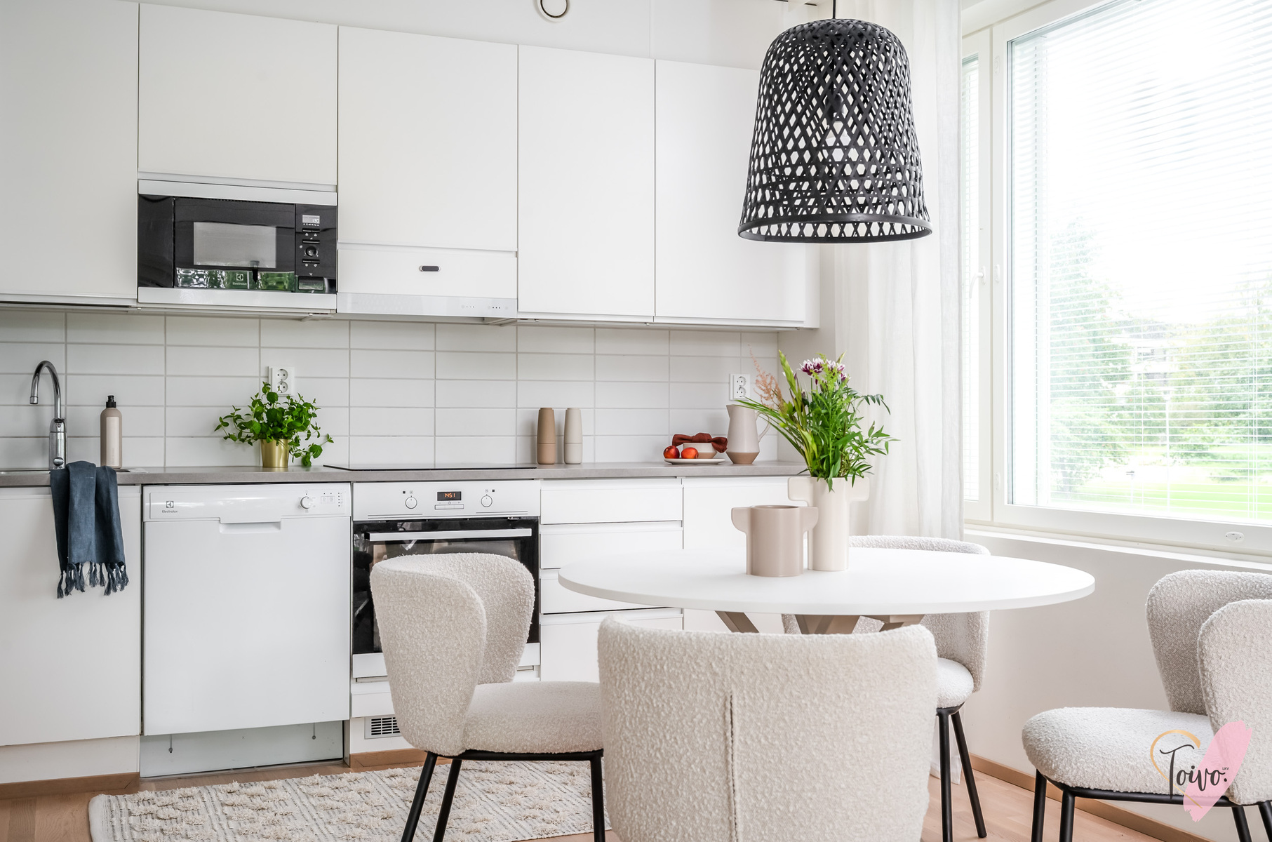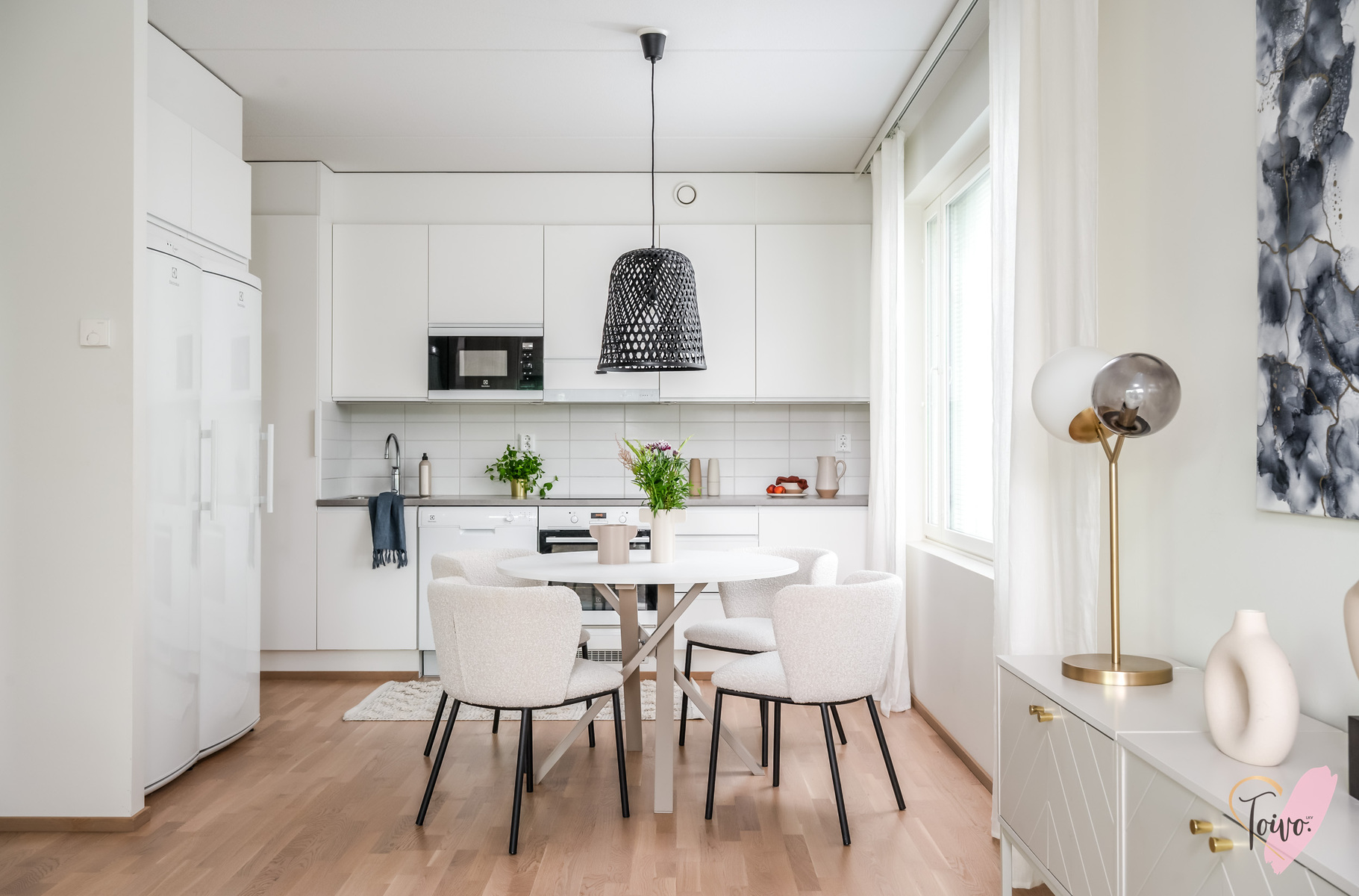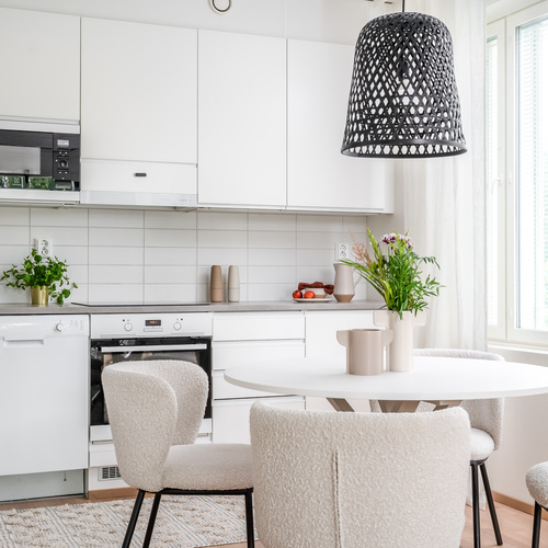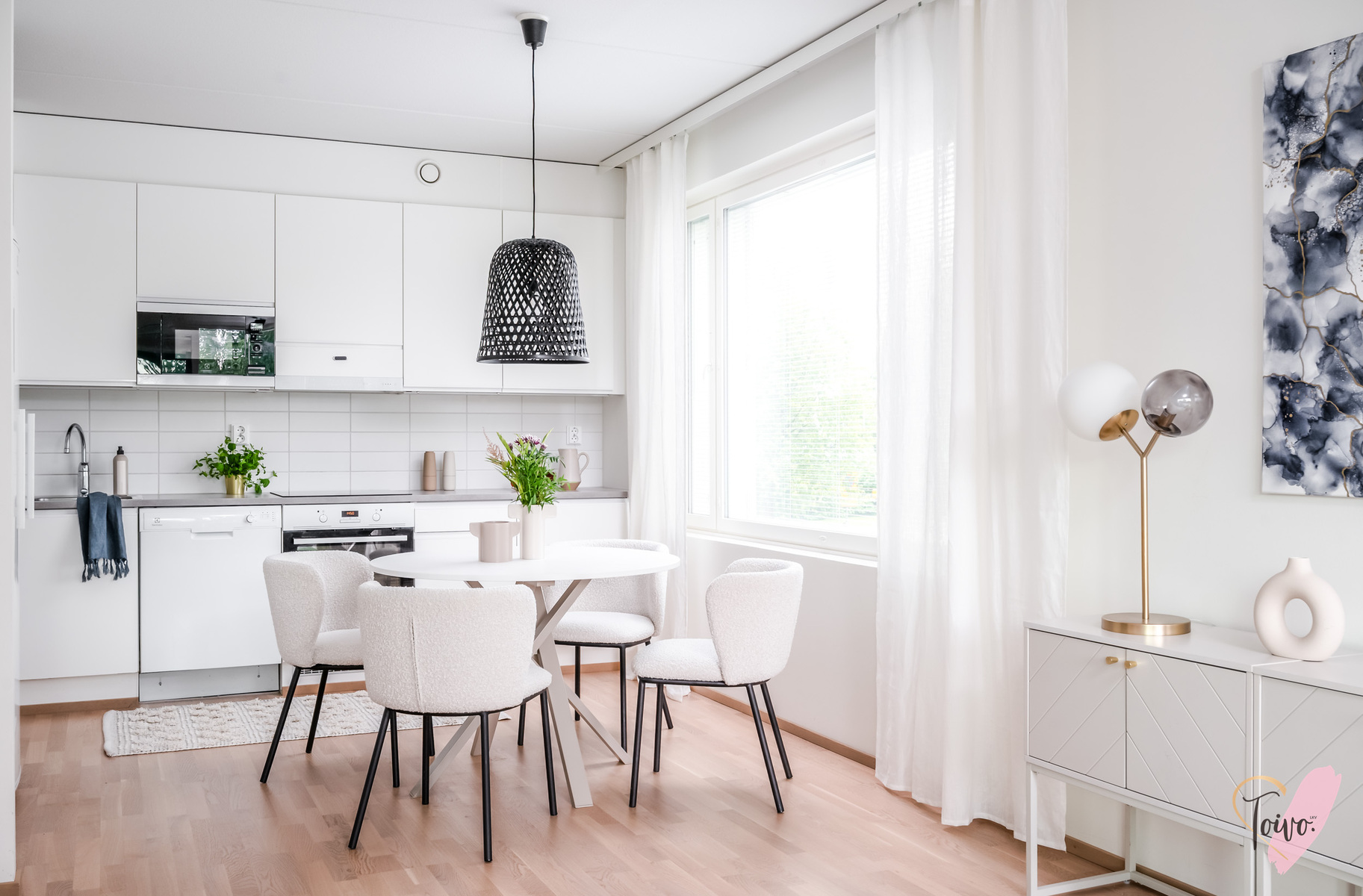 Vaalea skandityylinen keittiö ja ruokailutila muodostavat yhtenäisen ja tilavan kokonaisuuden, jossa on reilusti kaappi- ja laskutilaa. Suuremmankin ruokapöydän ääreen mahtuu vaivatta seurustelemaan ja nauttimaan kodikkaasta tunnelmasta.