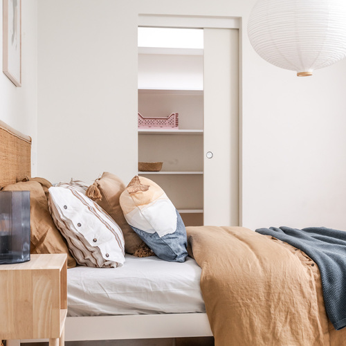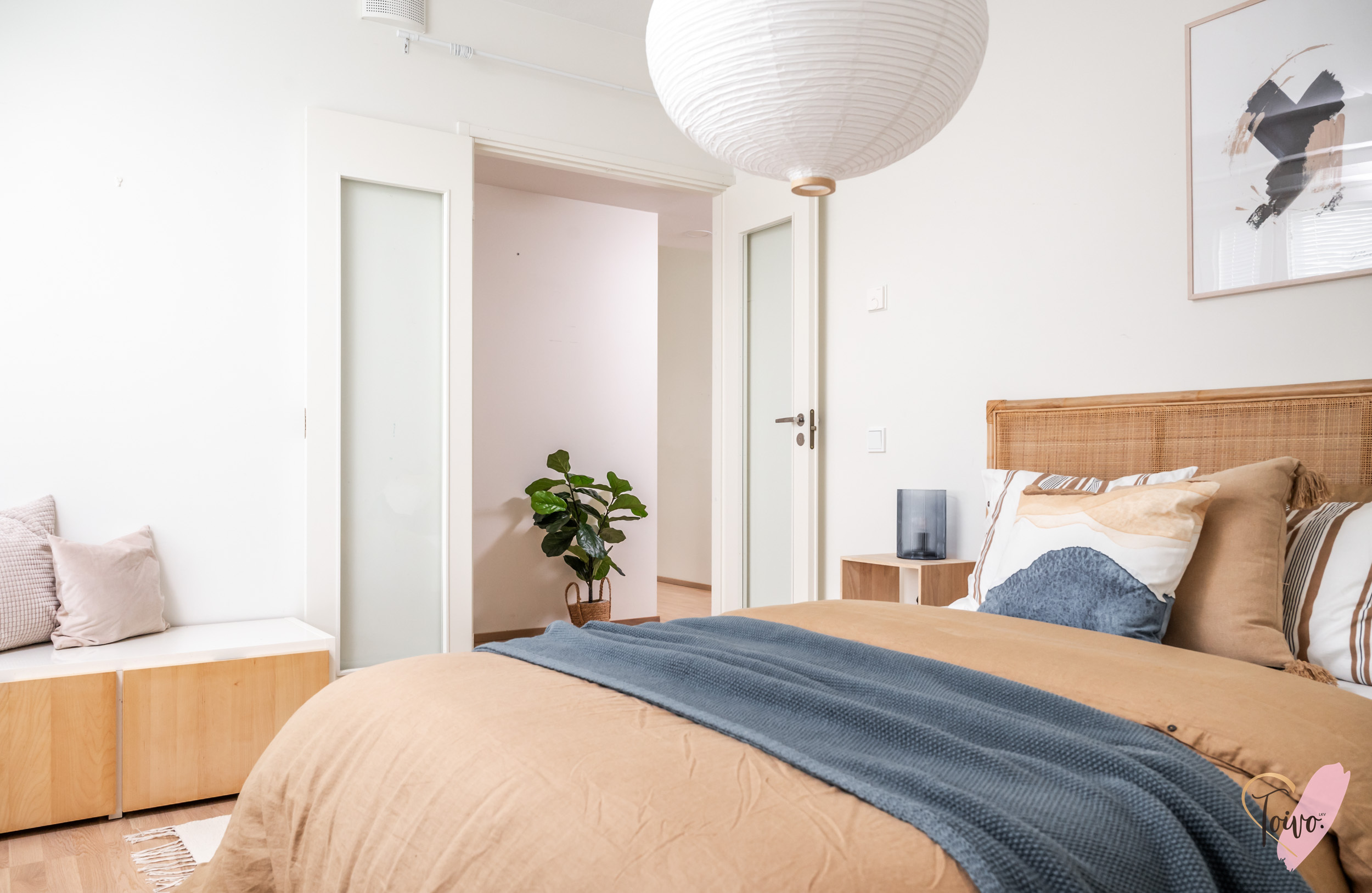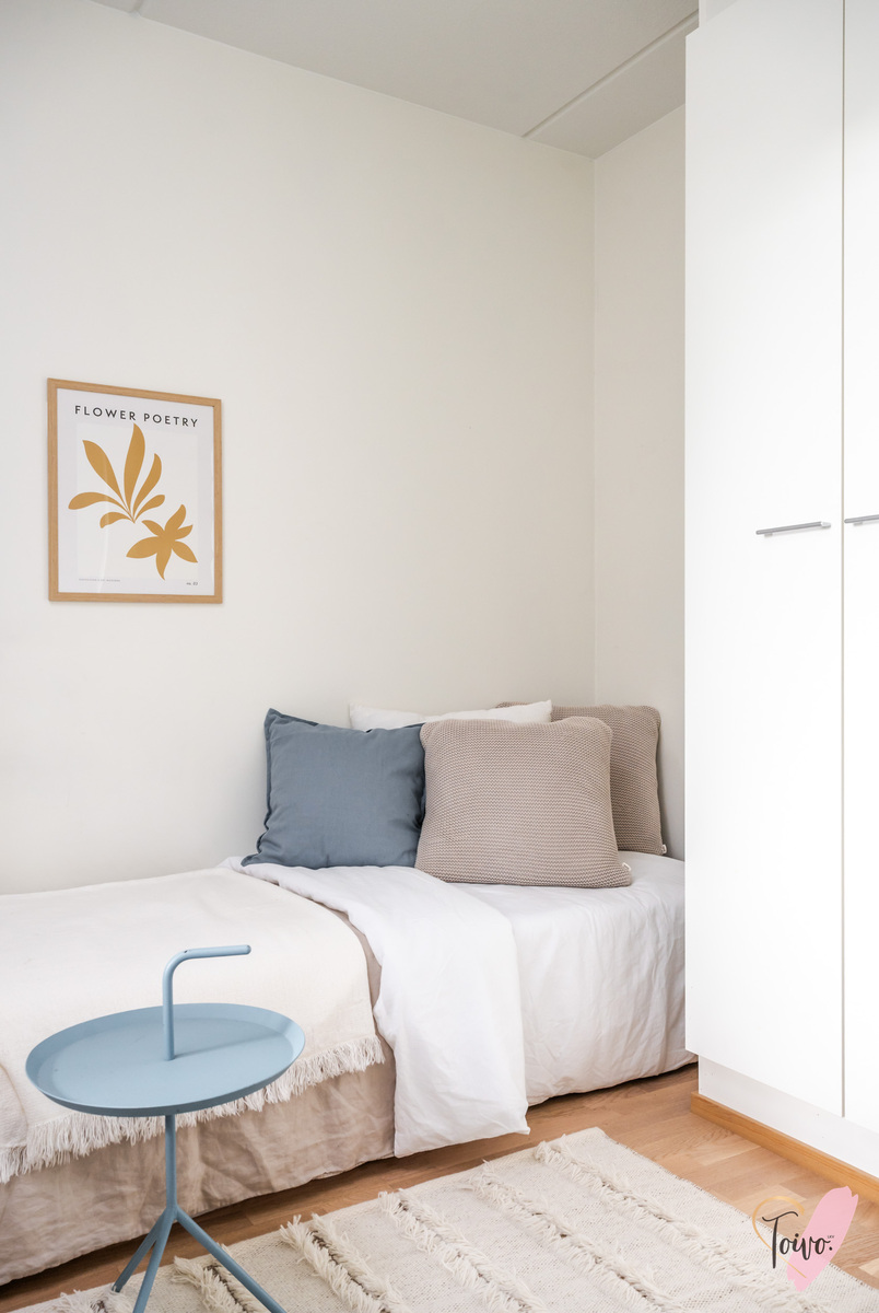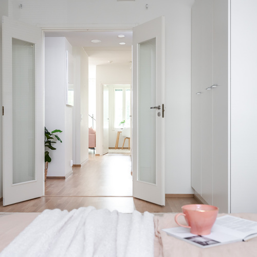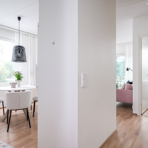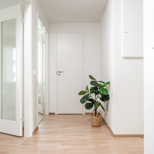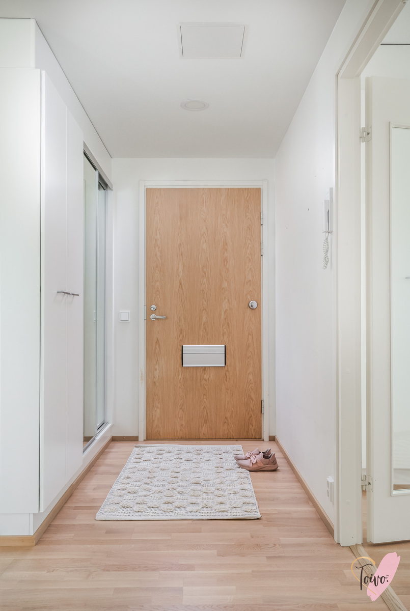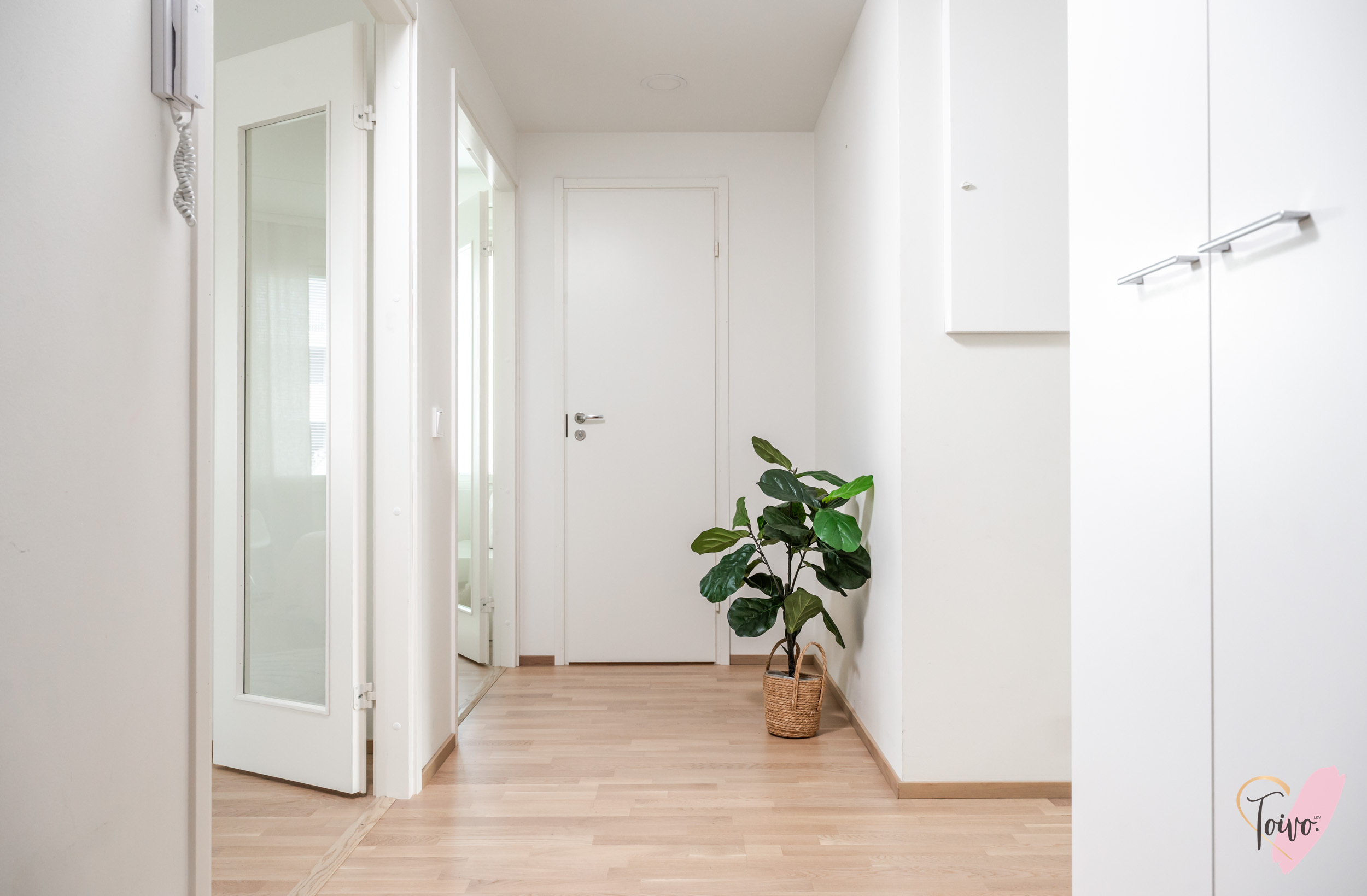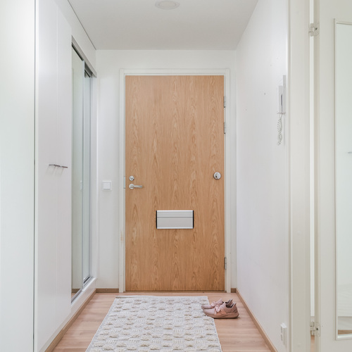 Koti ottaa sinut lämpimään syleilyynsä heti, kun astut sisään. Voit sujauttaa takit ja kengät katseilta piiloon tilavaan liukuovikaapistoon.
