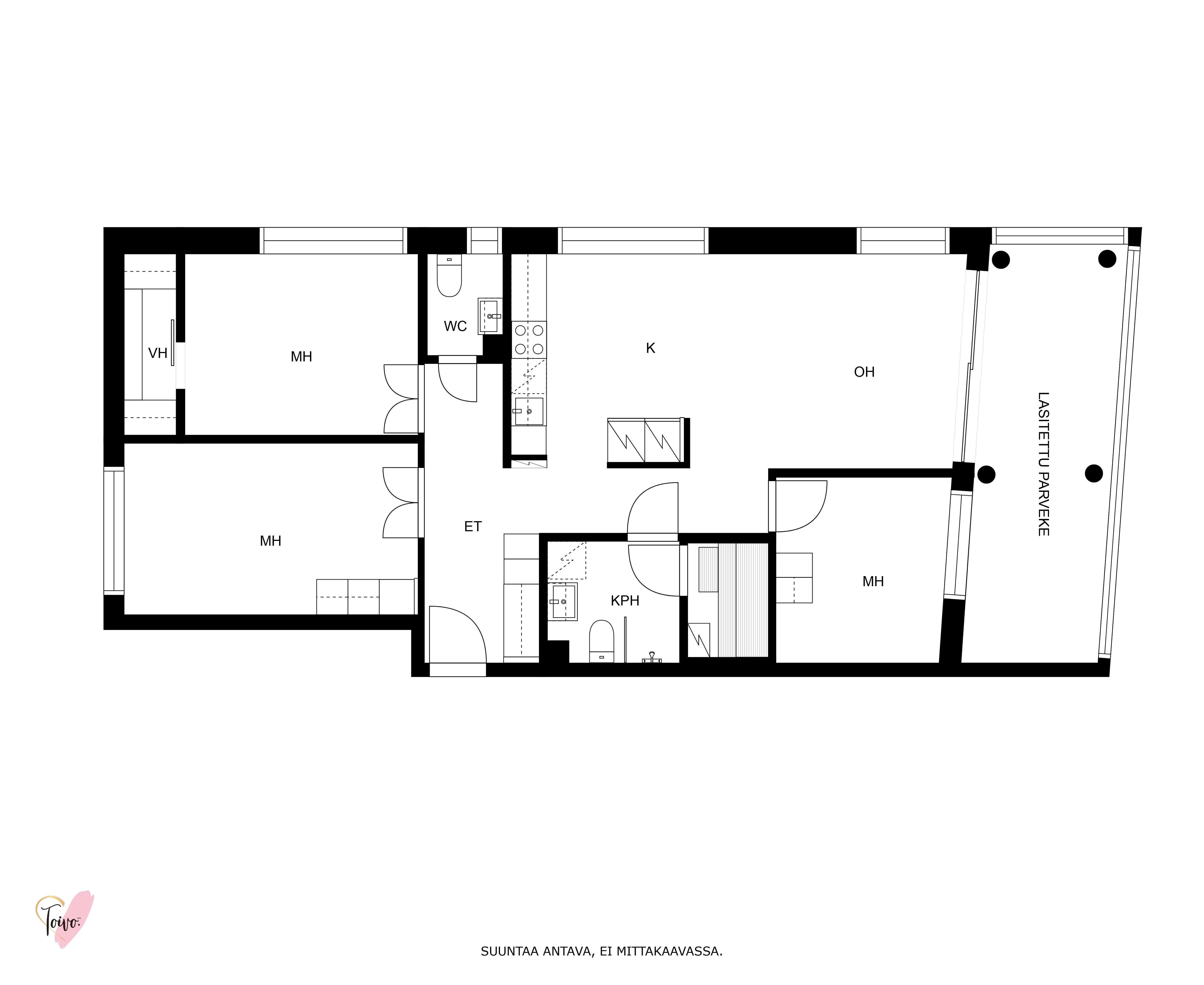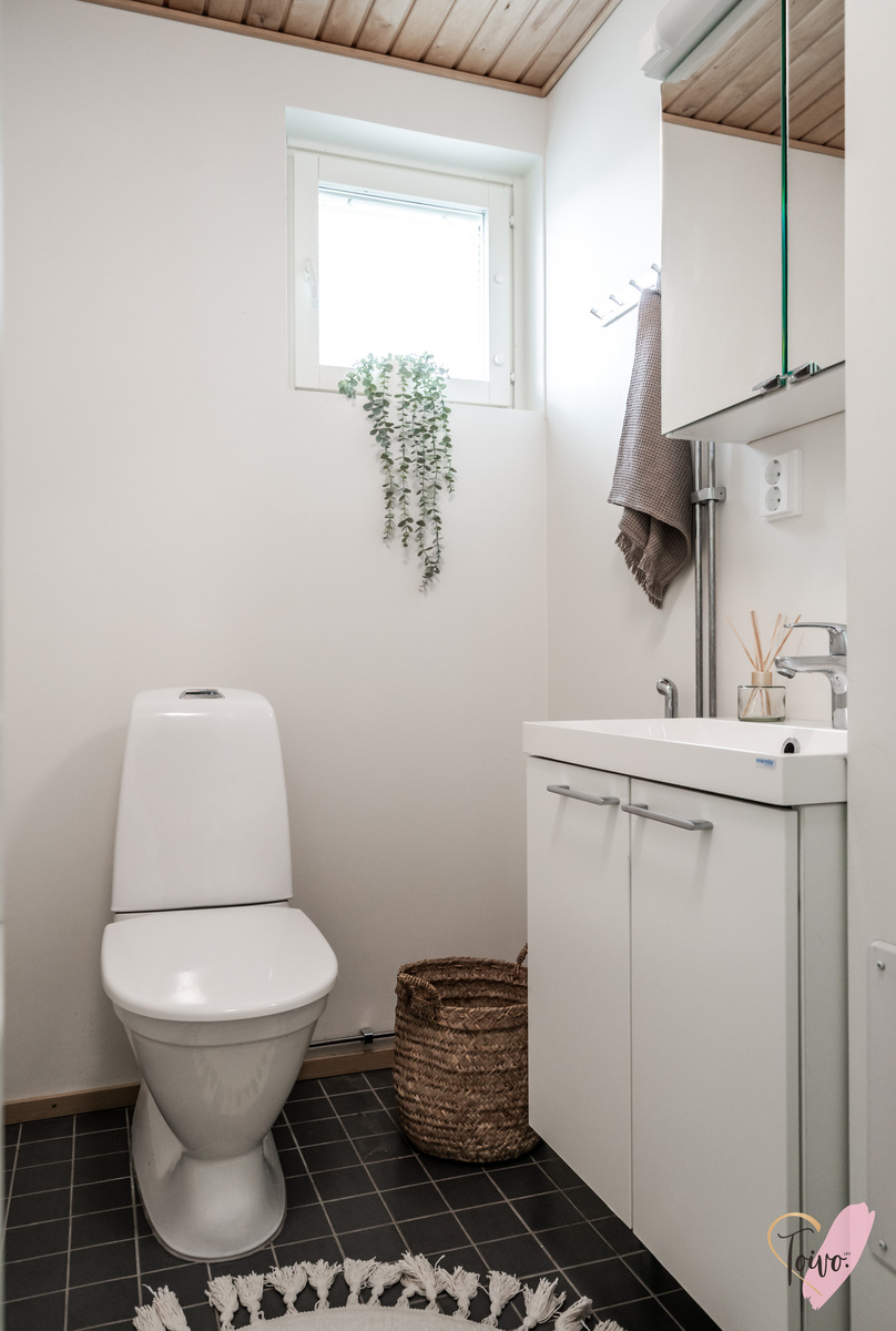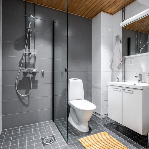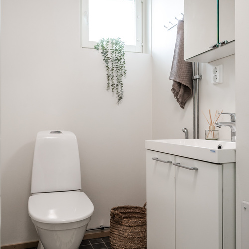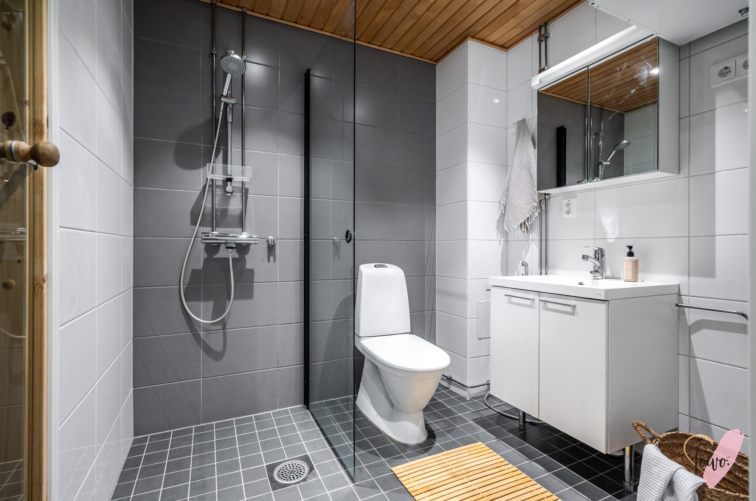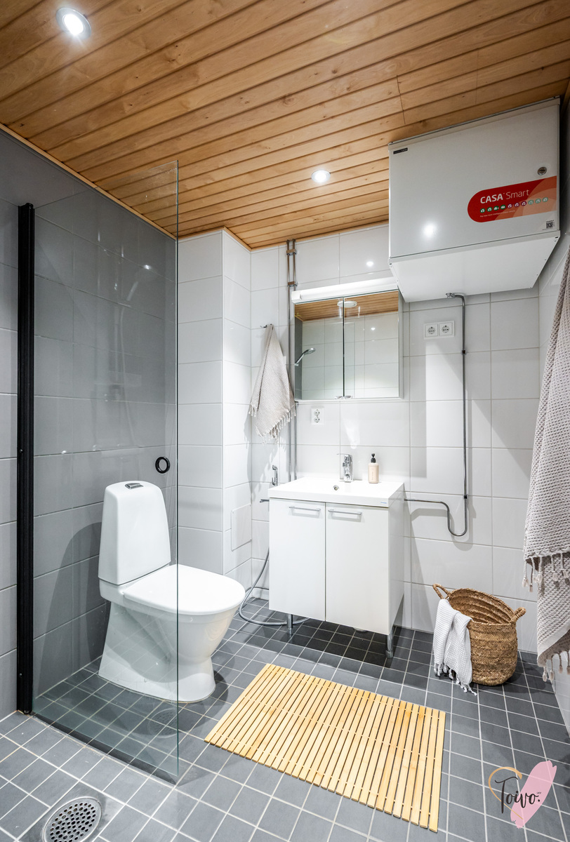 Varusteet: pesukoneliitäntä, lattialämmitys, wc-istuin, suihku, peili