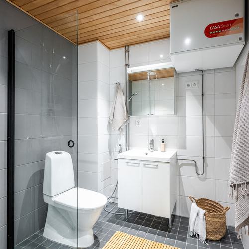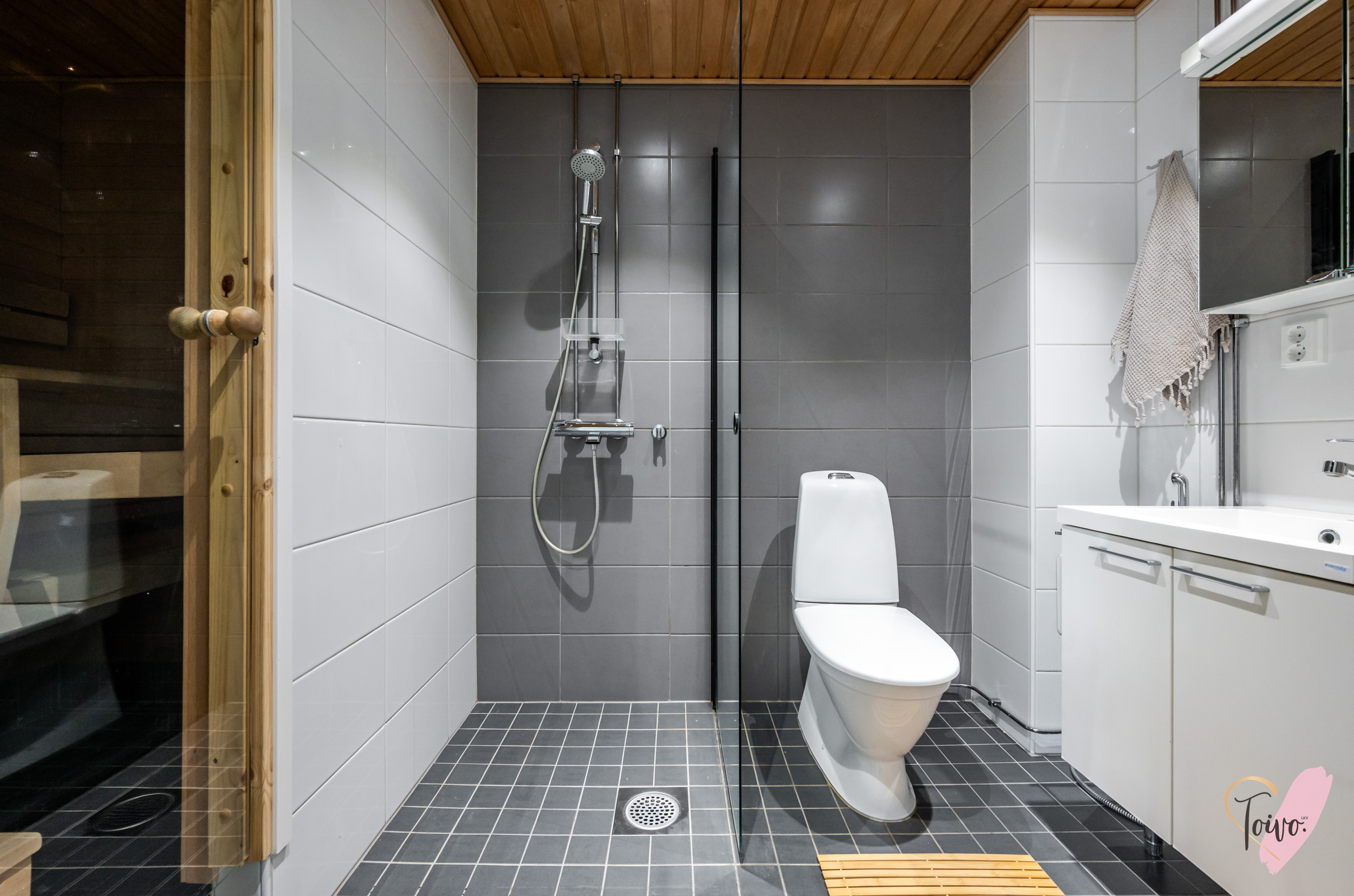 Tyylikäs kylpyhuone on suunniteltu toiminnallisuus mielessä ja sen yhteydessä on mukavasti tilaa kodinhoidolle. Tunnelmallisen oman saunan löylyissä on ihanaa rentoutua päivän päätteeksi.