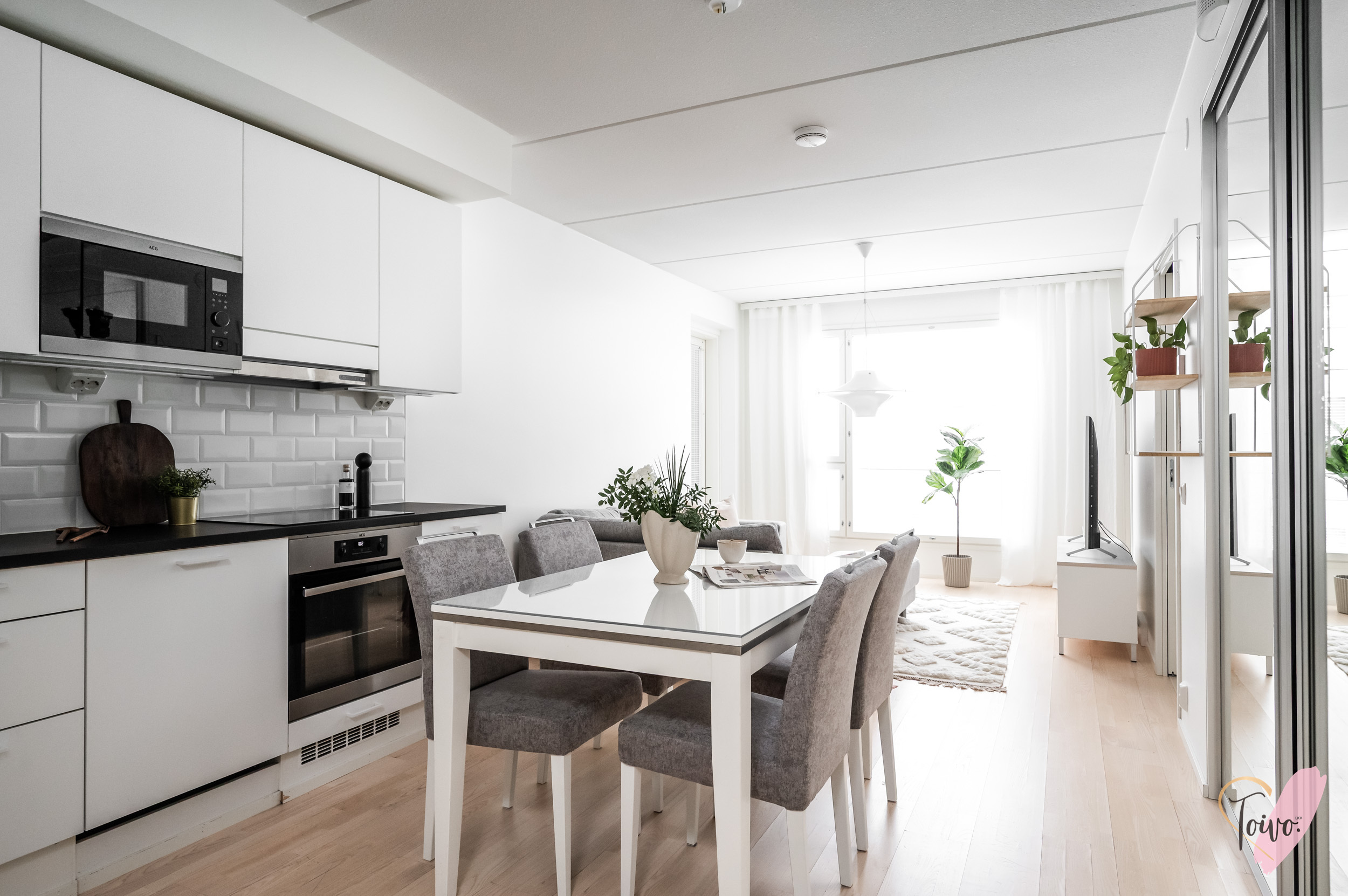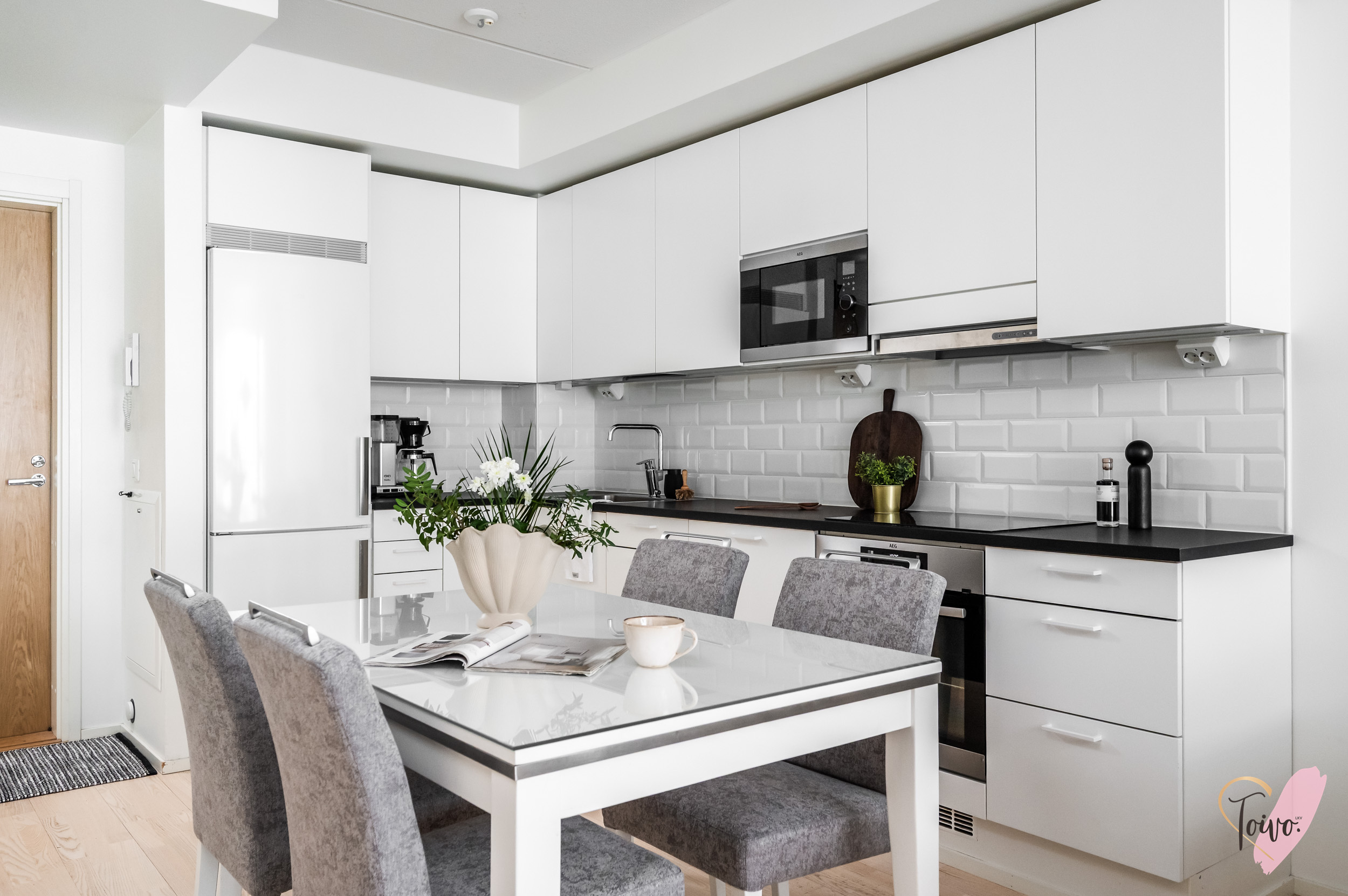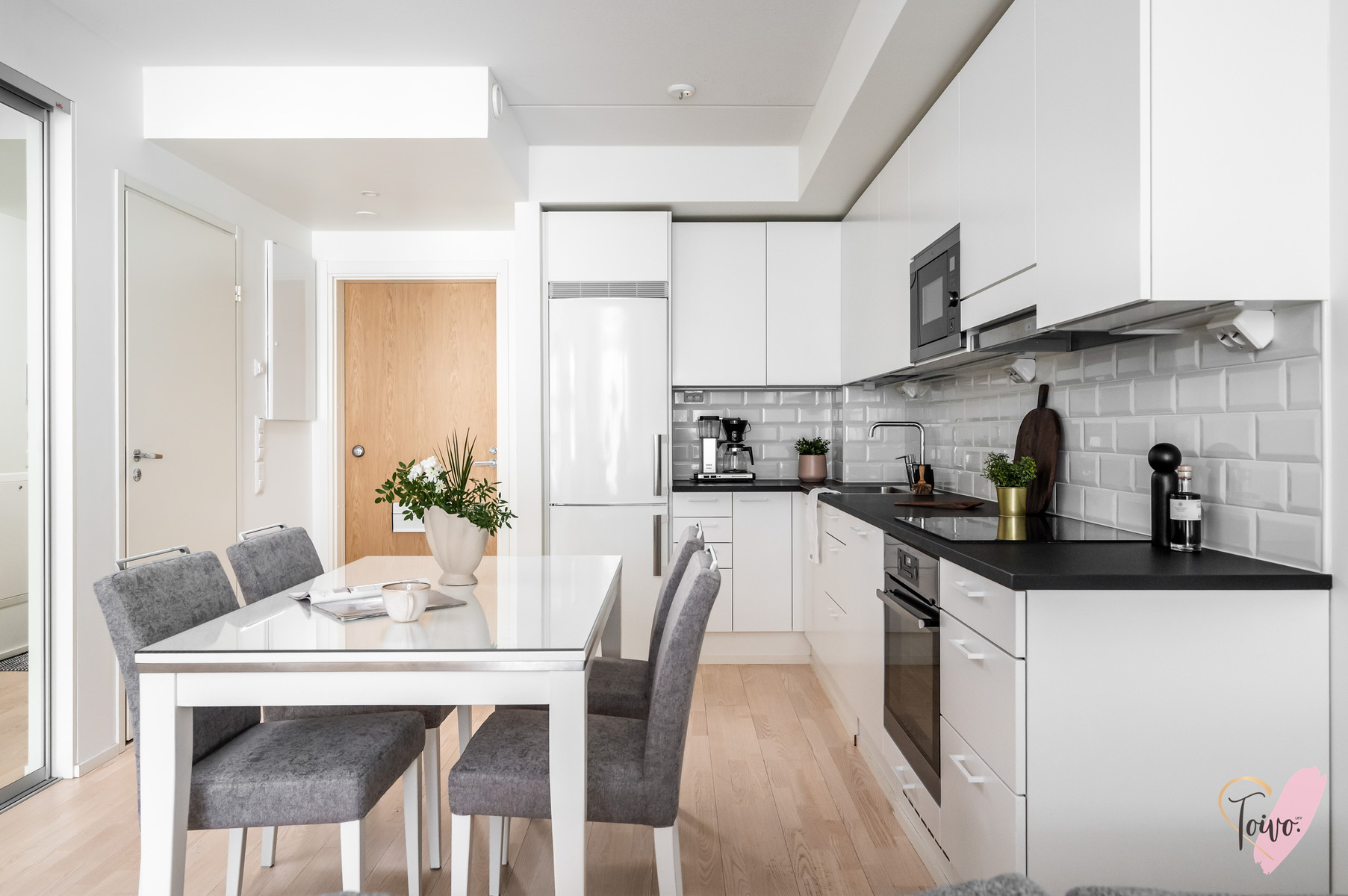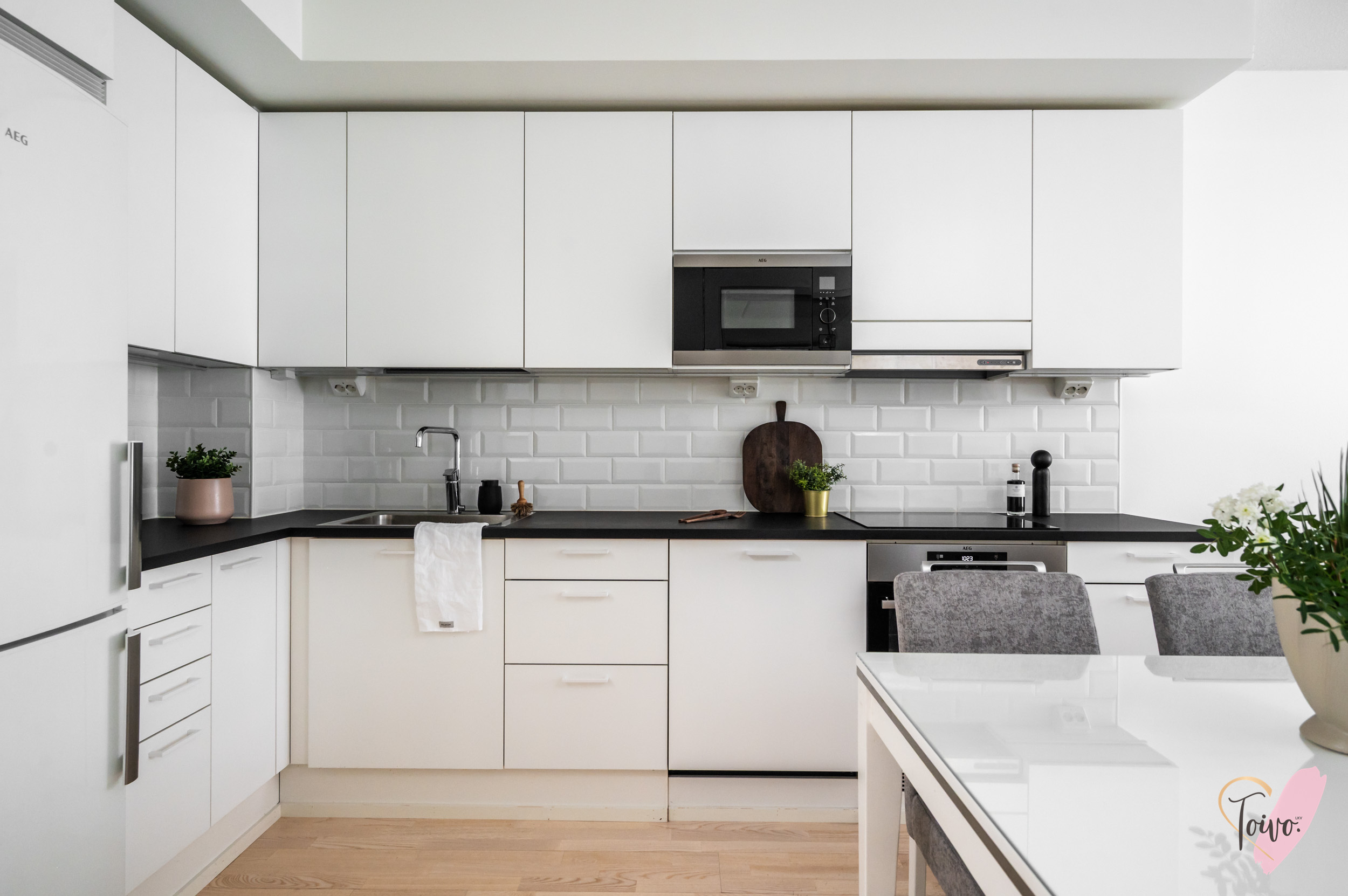 Sisään tullessa katse kiinnittyy vaaleaan keittiöön. Selkeät linjat ja rauhallinen värimaailma kestävät aikaa. Kaappitilaa on runsaasti, joten tavaroille löytyy oma paikkansa. Ruokapöydän ääreen mahtuu viettämään hitaita sunnuntaiaamuja sekä nauruntäyteisiä iltoja läheisten seurassa.