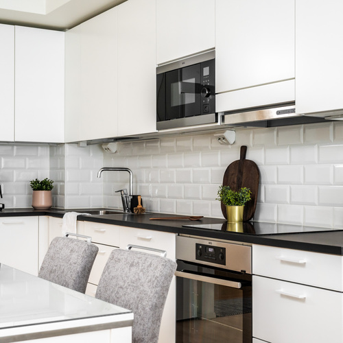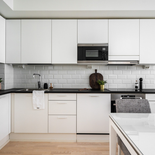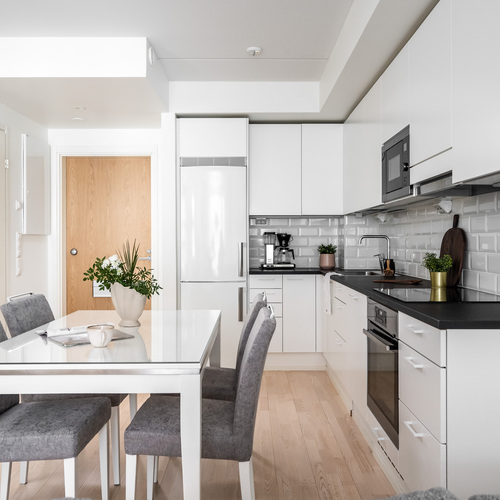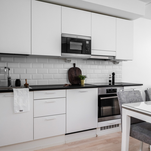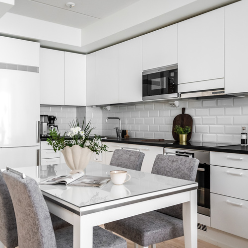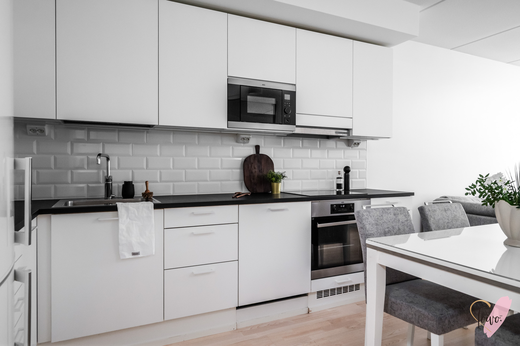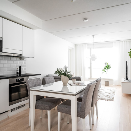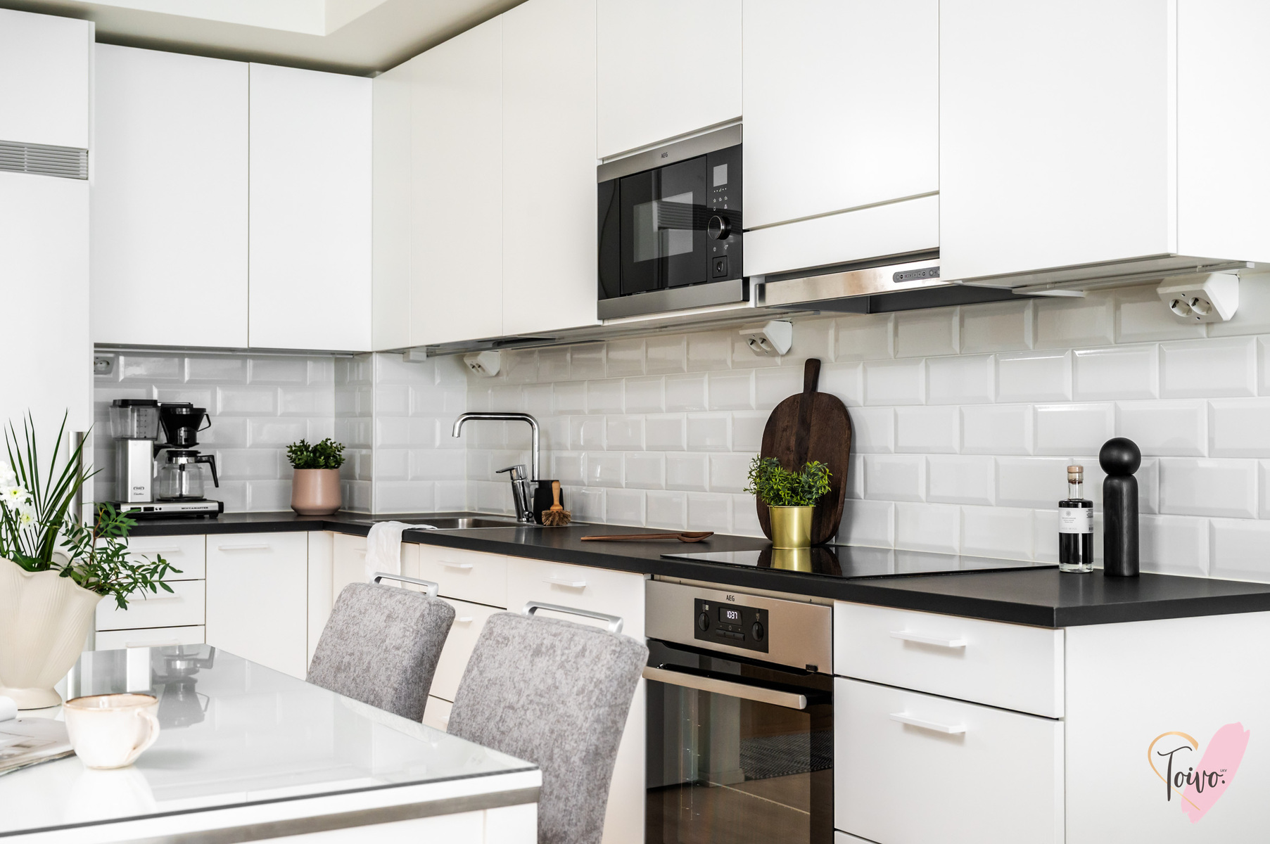 Sisään tullessa katse kiinnittyy vaaleaan keittiöön. Selkeät linjat ja rauhallinen värimaailma kestävät aikaa. Kaappitilaa on runsaasti, joten tavaroille löytyy oma paikkansa. Ruokapöydän ääreen mahtuu viettämään hitaita sunnuntaiaamuja sekä nauruntäyteisiä iltoja läheisten seurassa.
