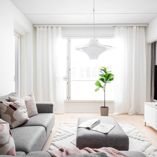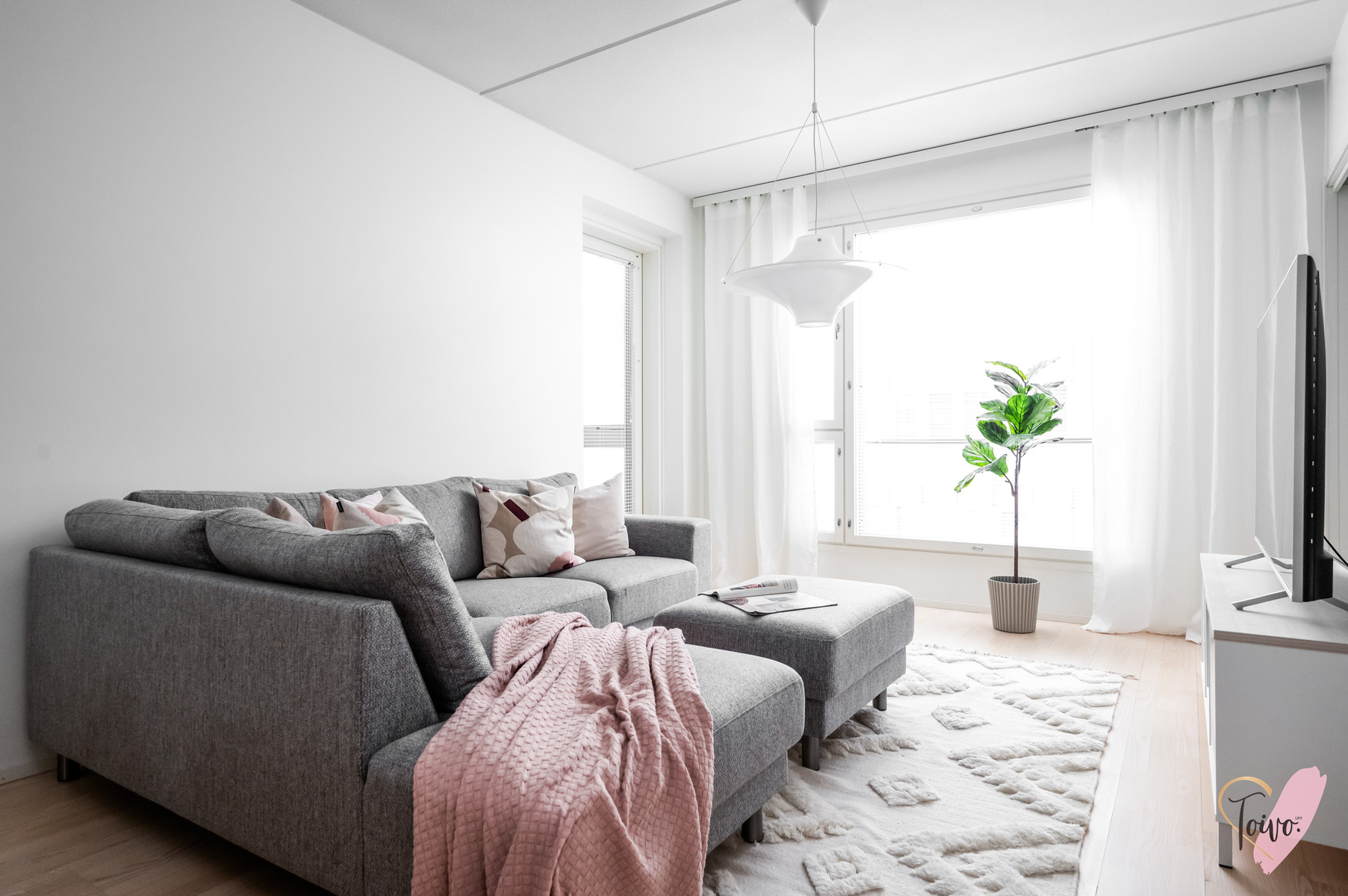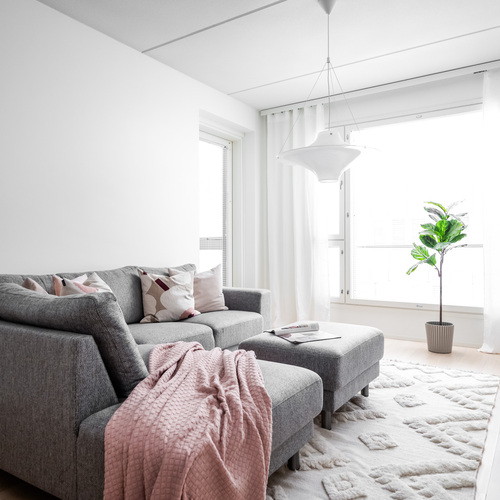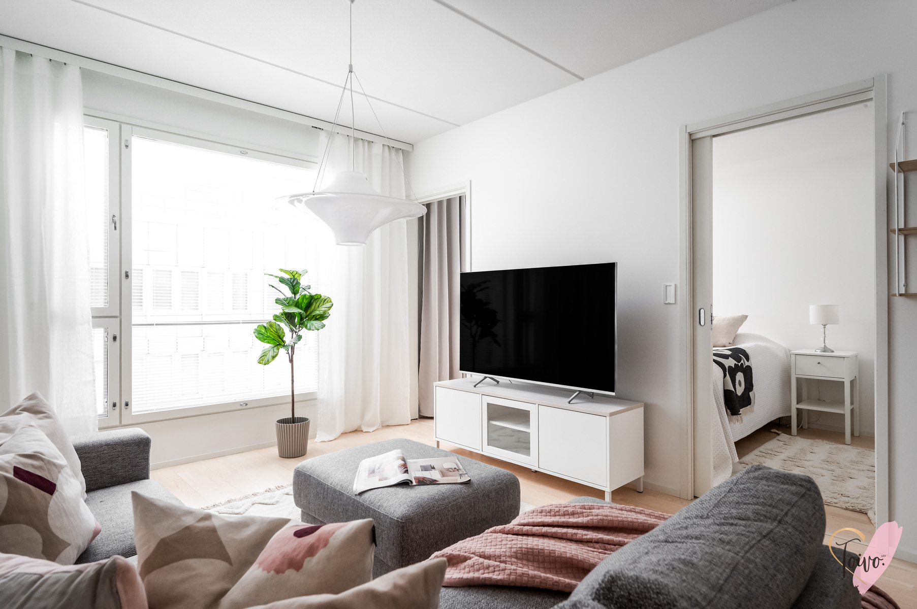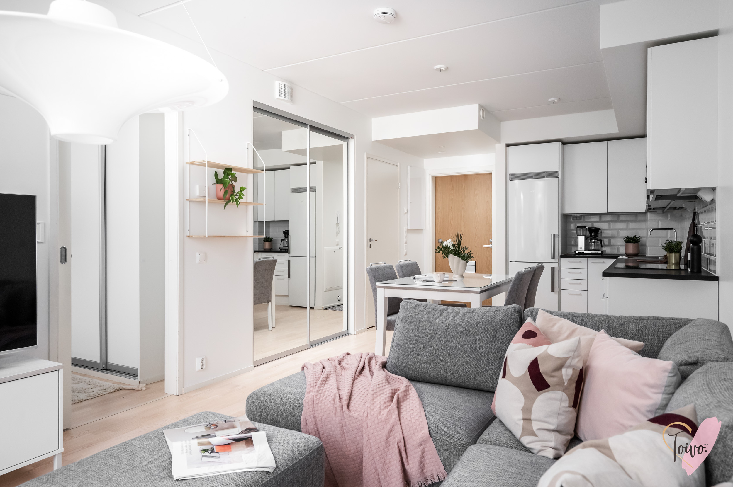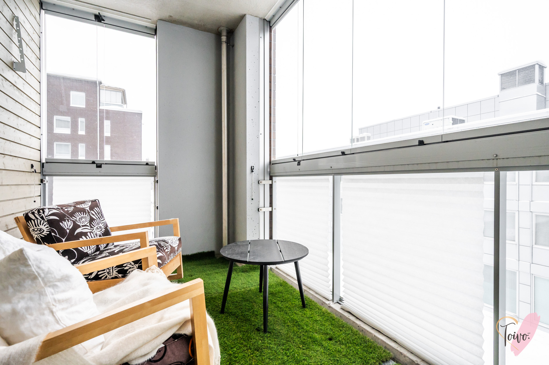 Olohuone levittäytyy suurten ikkunoiden eteen. Päivänvalo muuttaa sävyään vuodenaikojen mukaan ja tuo tilaan eloa. Lasitettu, länsi-lounaaseen suuntaava parveke jatkaa oleskelutilaa ja kutsuu luomaan oman suojaisan kesänurkkauksen ja tunnelmoimaan viileinä syysiltoina lyhtyjen valossa. Siellä on helppo hengähtää pitkän päivän jälkeen.