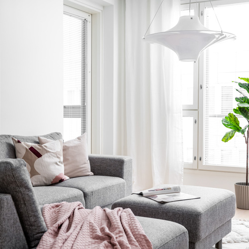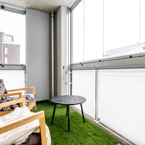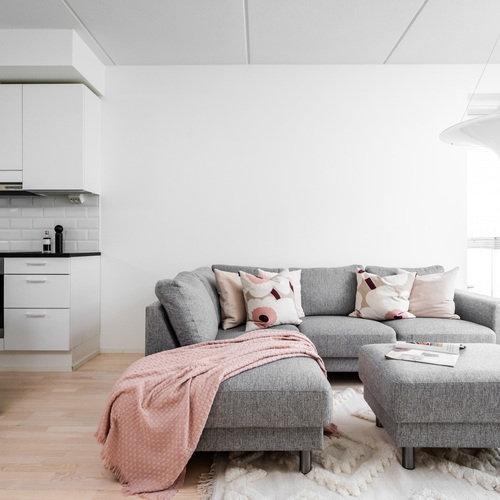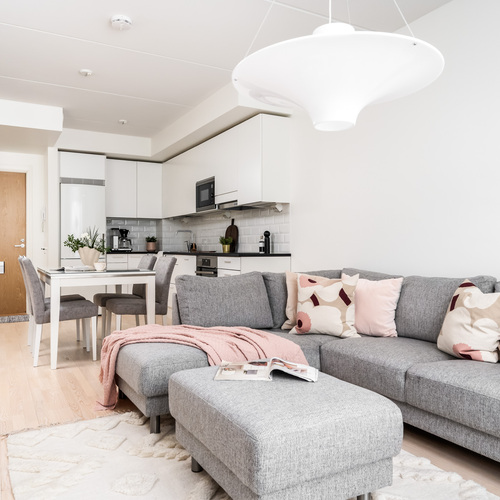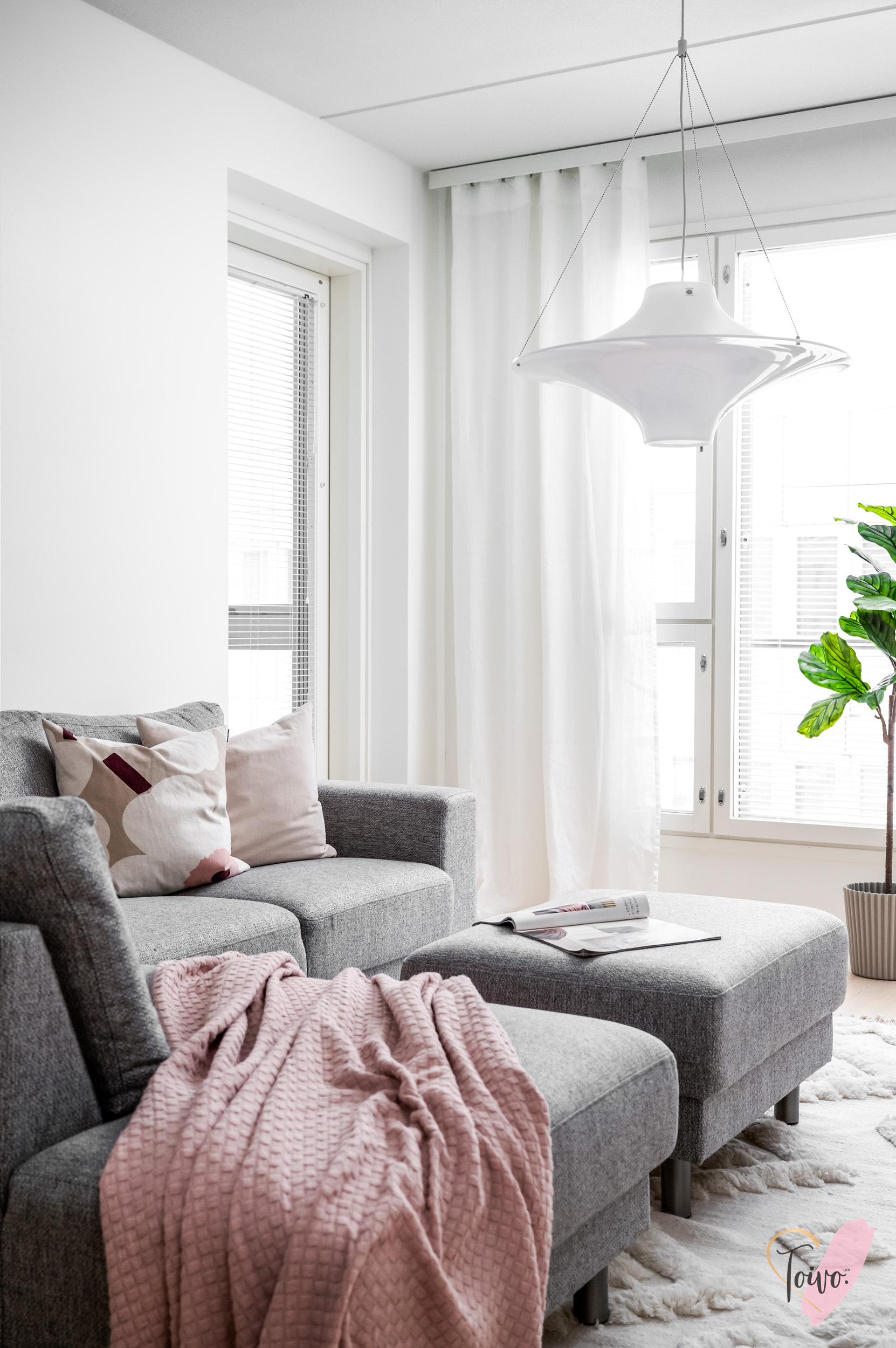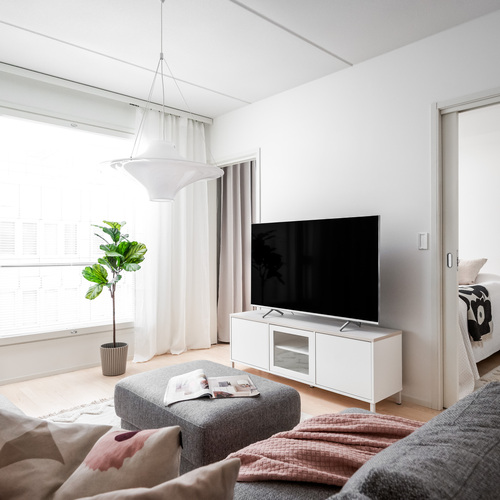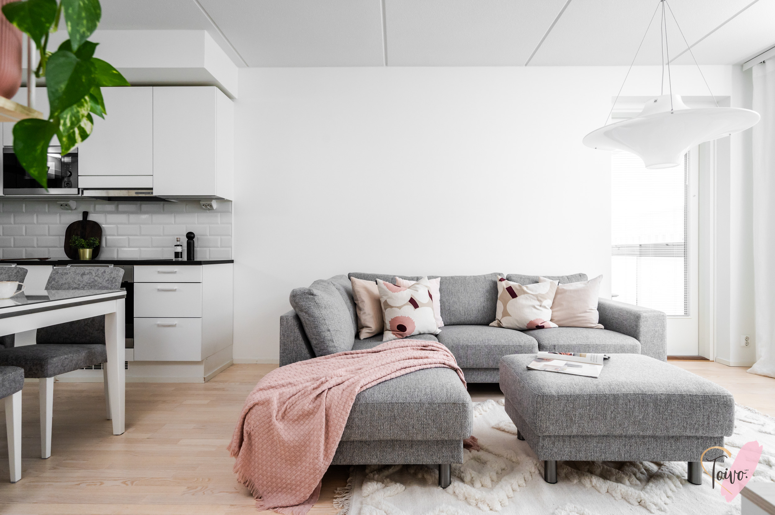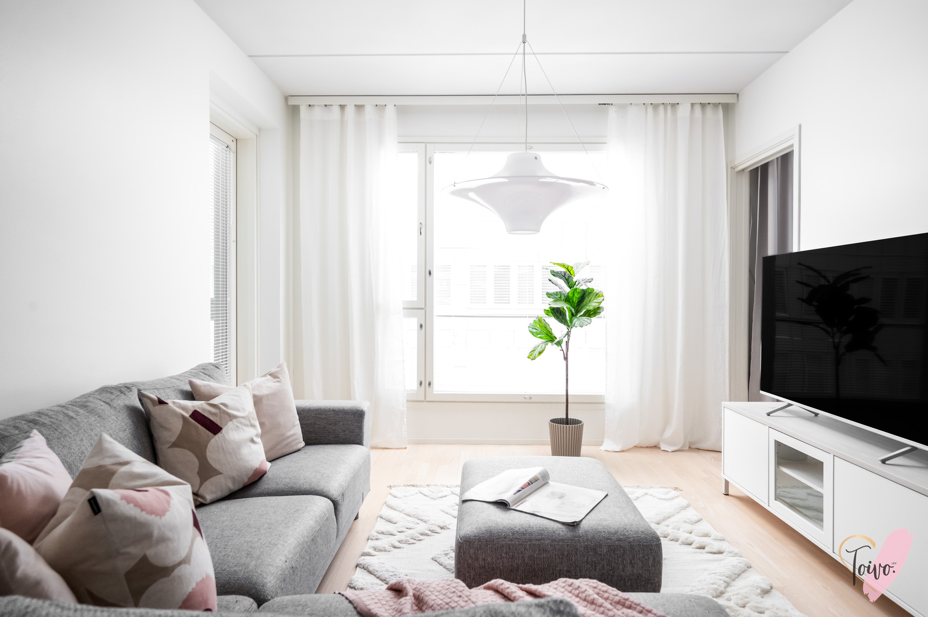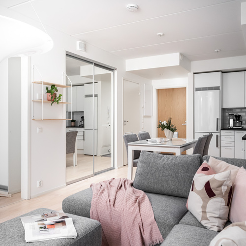 Olohuone levittäytyy suurten ikkunoiden eteen. Päivänvalo muuttaa sävyään vuodenaikojen mukaan ja tuo tilaan eloa. Lasitettu, länsi-lounaaseen suuntaava parveke jatkaa oleskelutilaa ja kutsuu luomaan oman suojaisan kesänurkkauksen ja tunnelmoimaan viileinä syysiltoina lyhtyjen valossa. Siellä on helppo hengähtää pitkän päivän jälkeen.