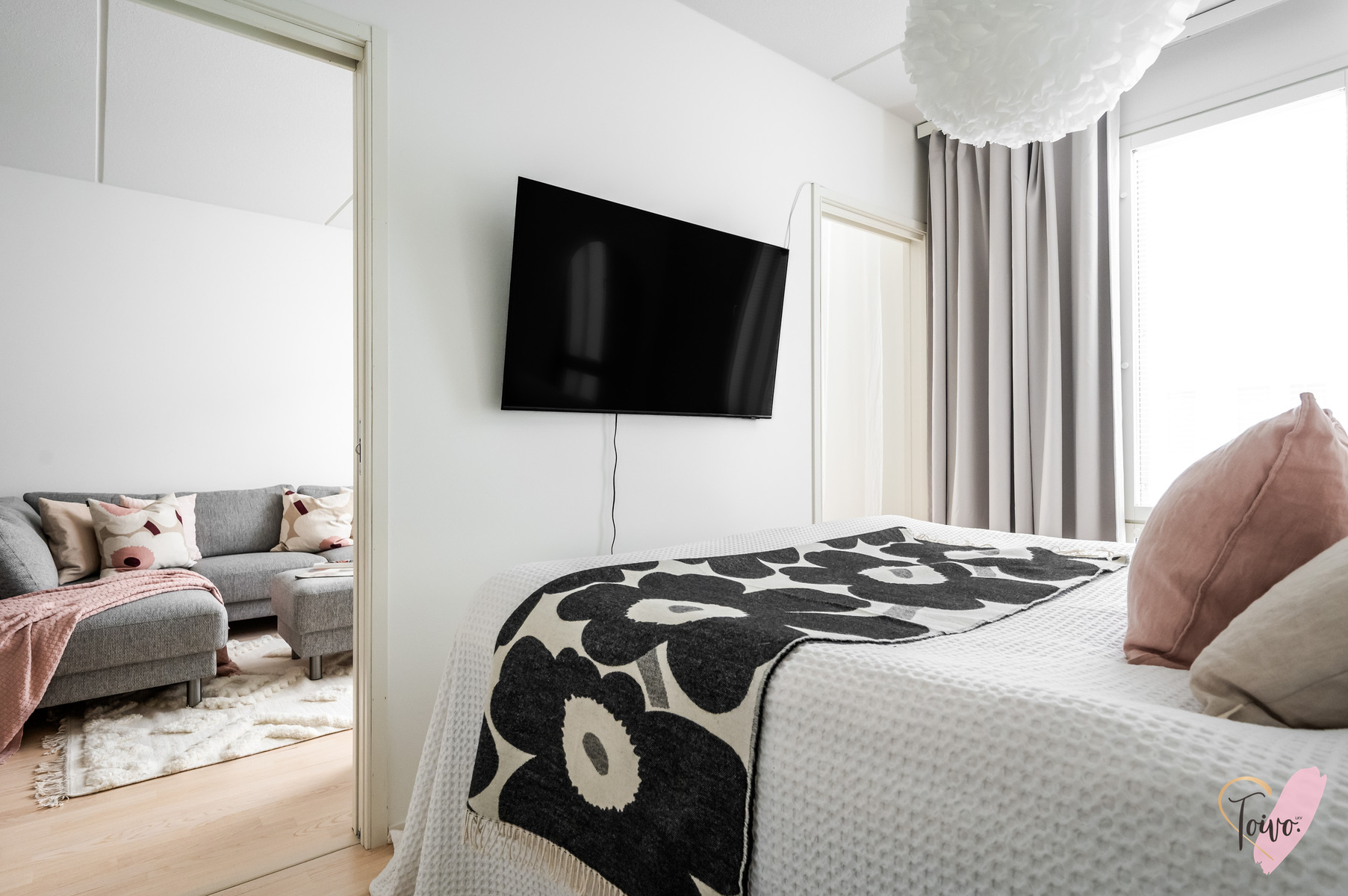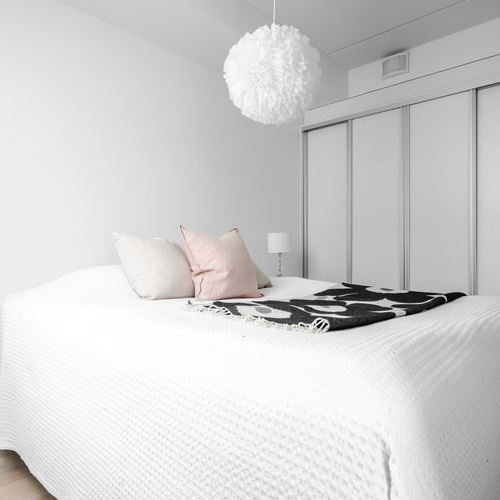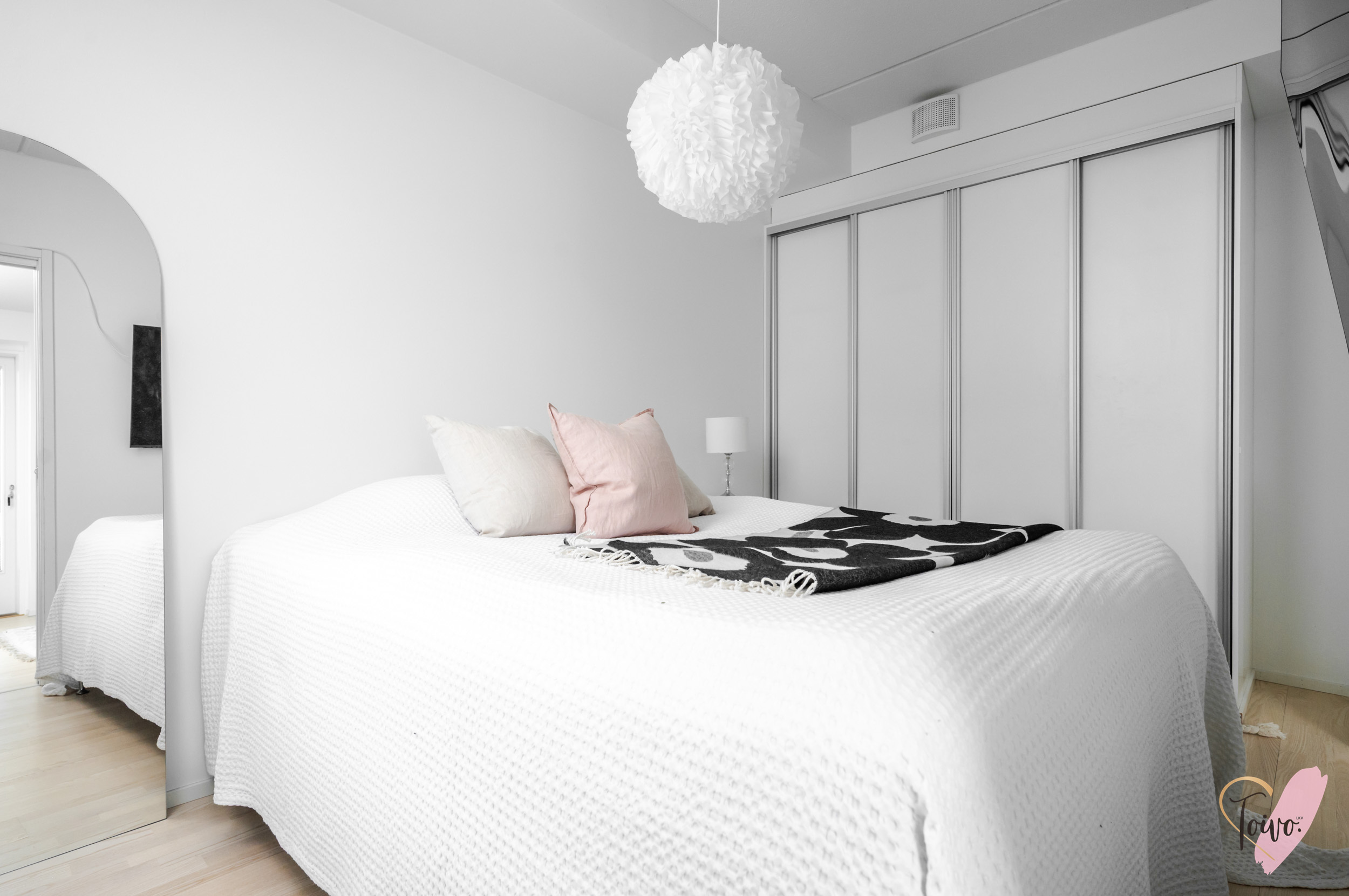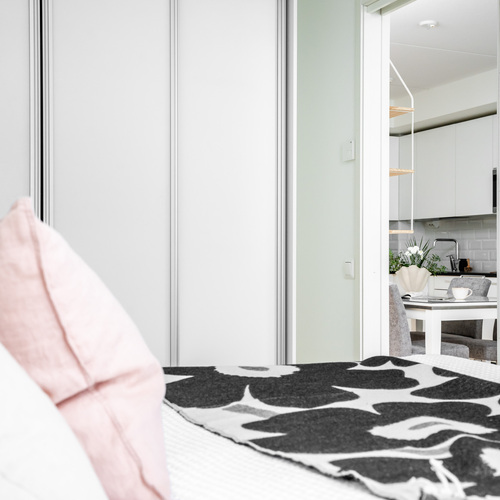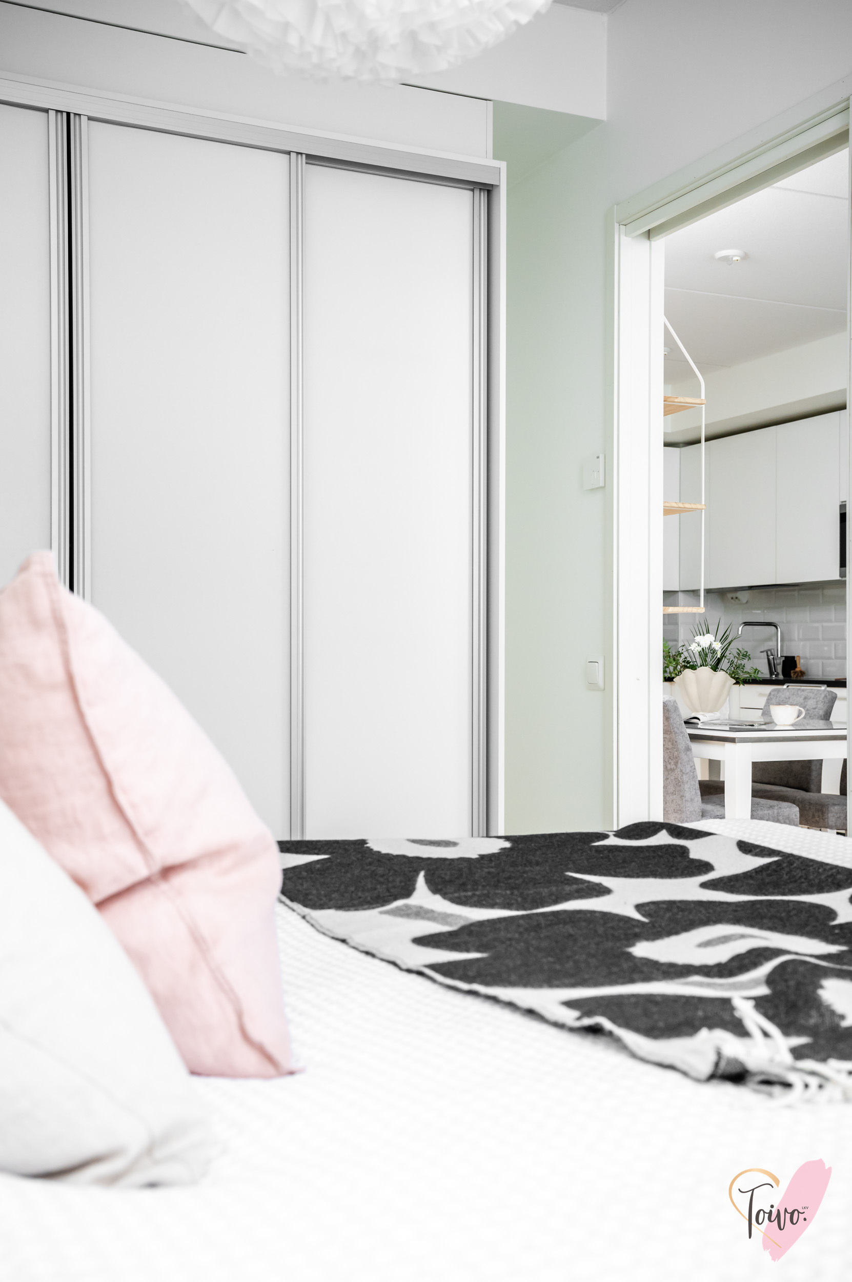 Makuuhuone jää rauhallisesti kahden liukuoven taakse. Sinne mahtuu tilava vuode ja kaapistot pitävät arjen selkeänä. Myös eteisessä säilytys on mietitty valmiiksi, joten koti pysyy siistinä ilman ylimääräistä vaivaa.