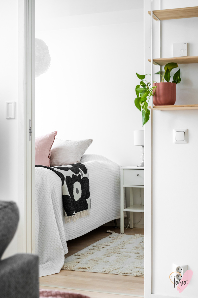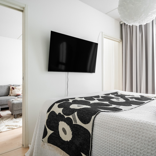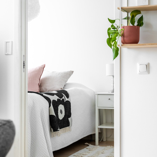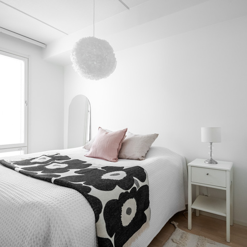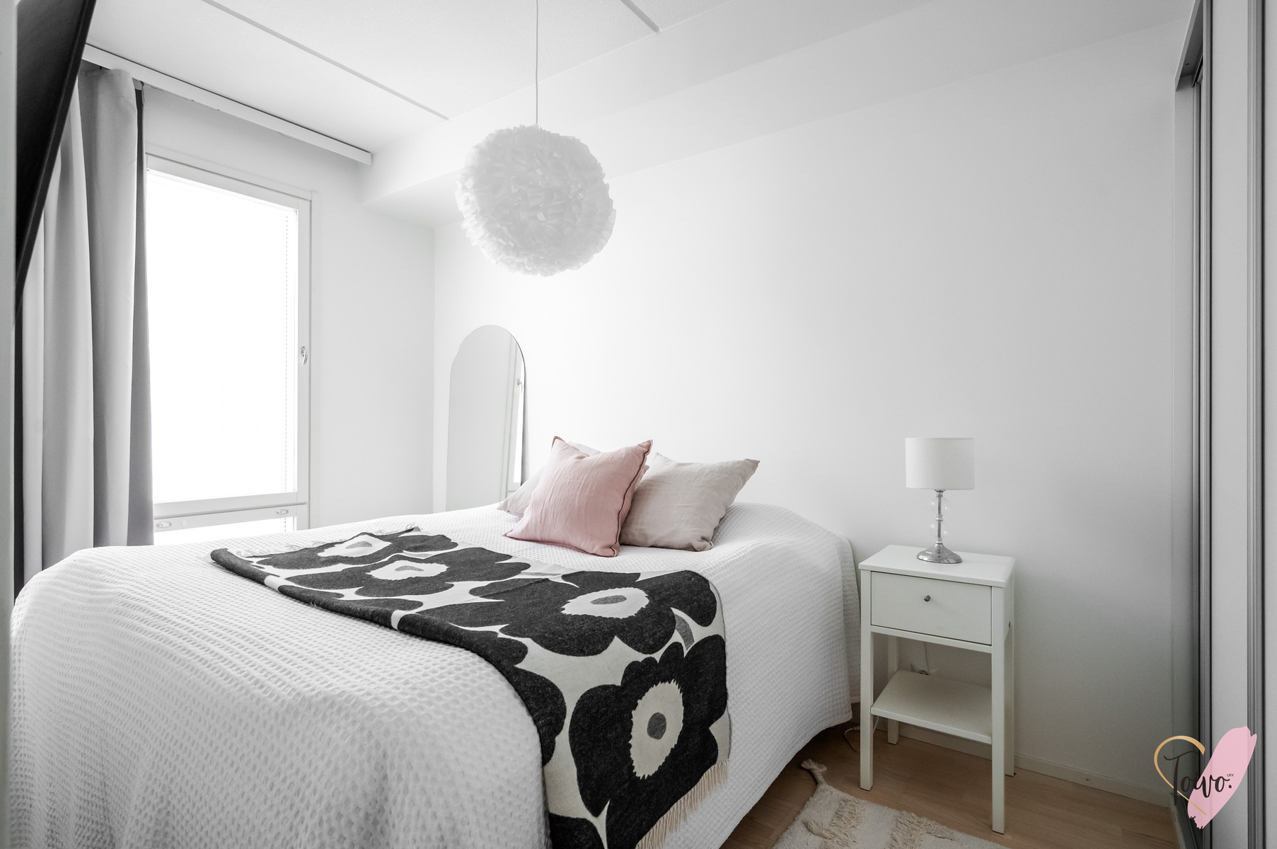 Makuuhuone jää rauhallisesti kahden liukuoven taakse. Sinne mahtuu tilava vuode ja kaapistot pitävät arjen selkeänä. Myös eteisessä säilytys on mietitty valmiiksi, joten koti pysyy siistinä ilman ylimääräistä vaivaa.