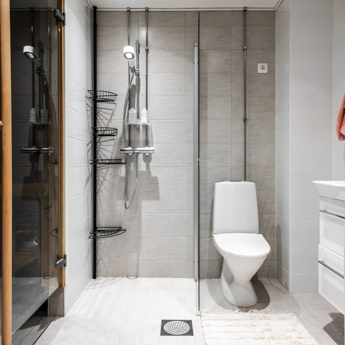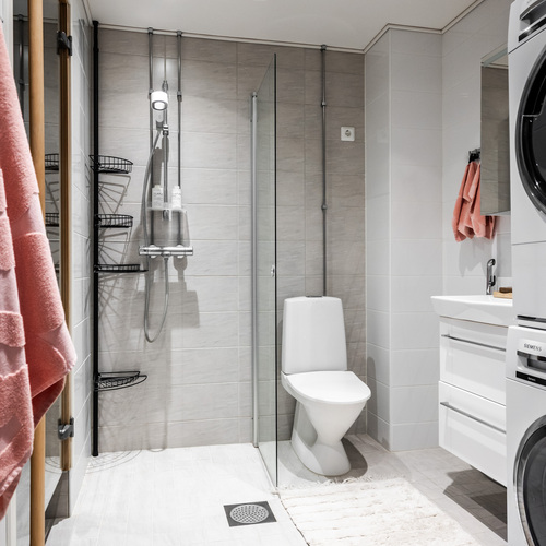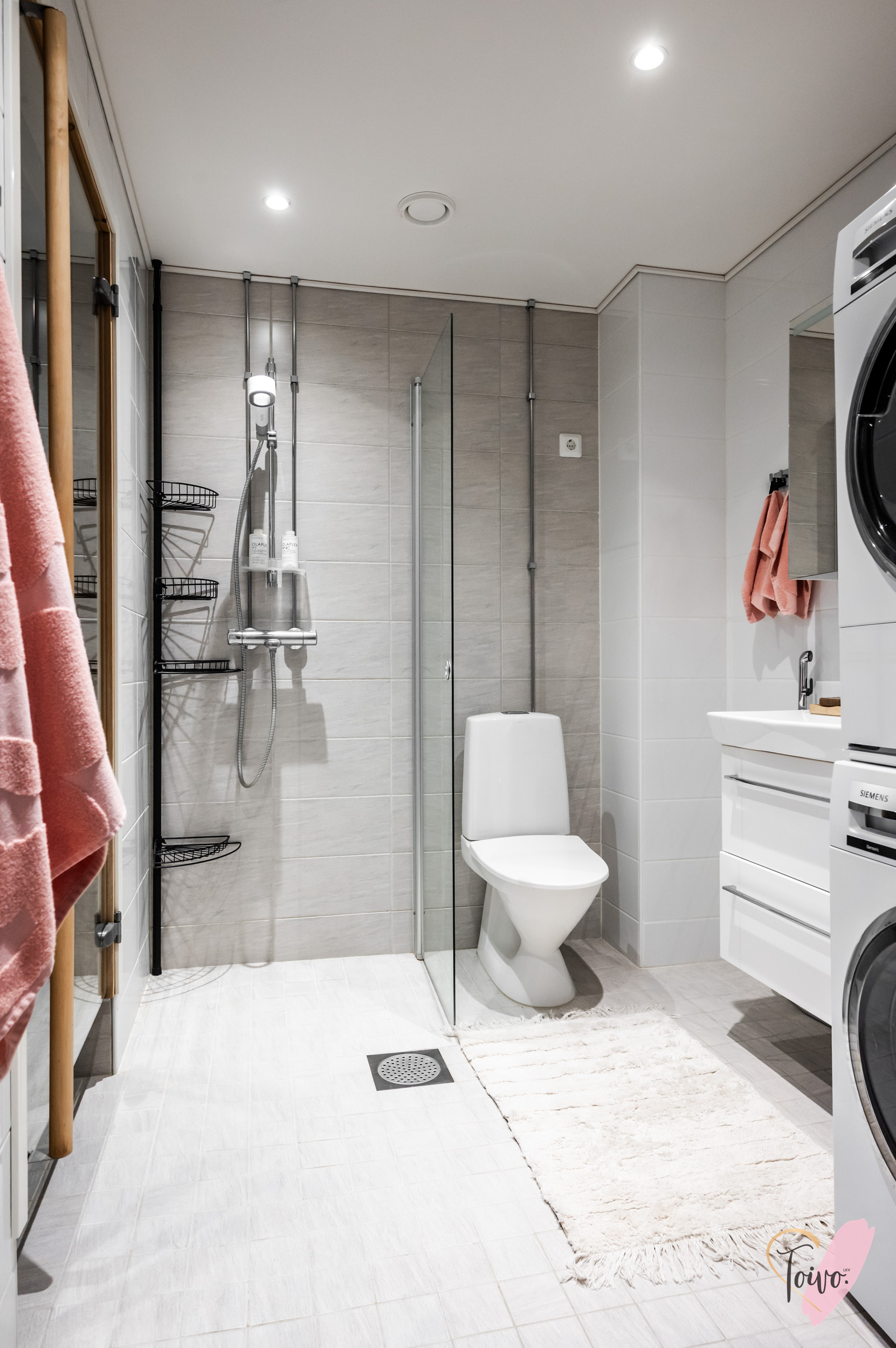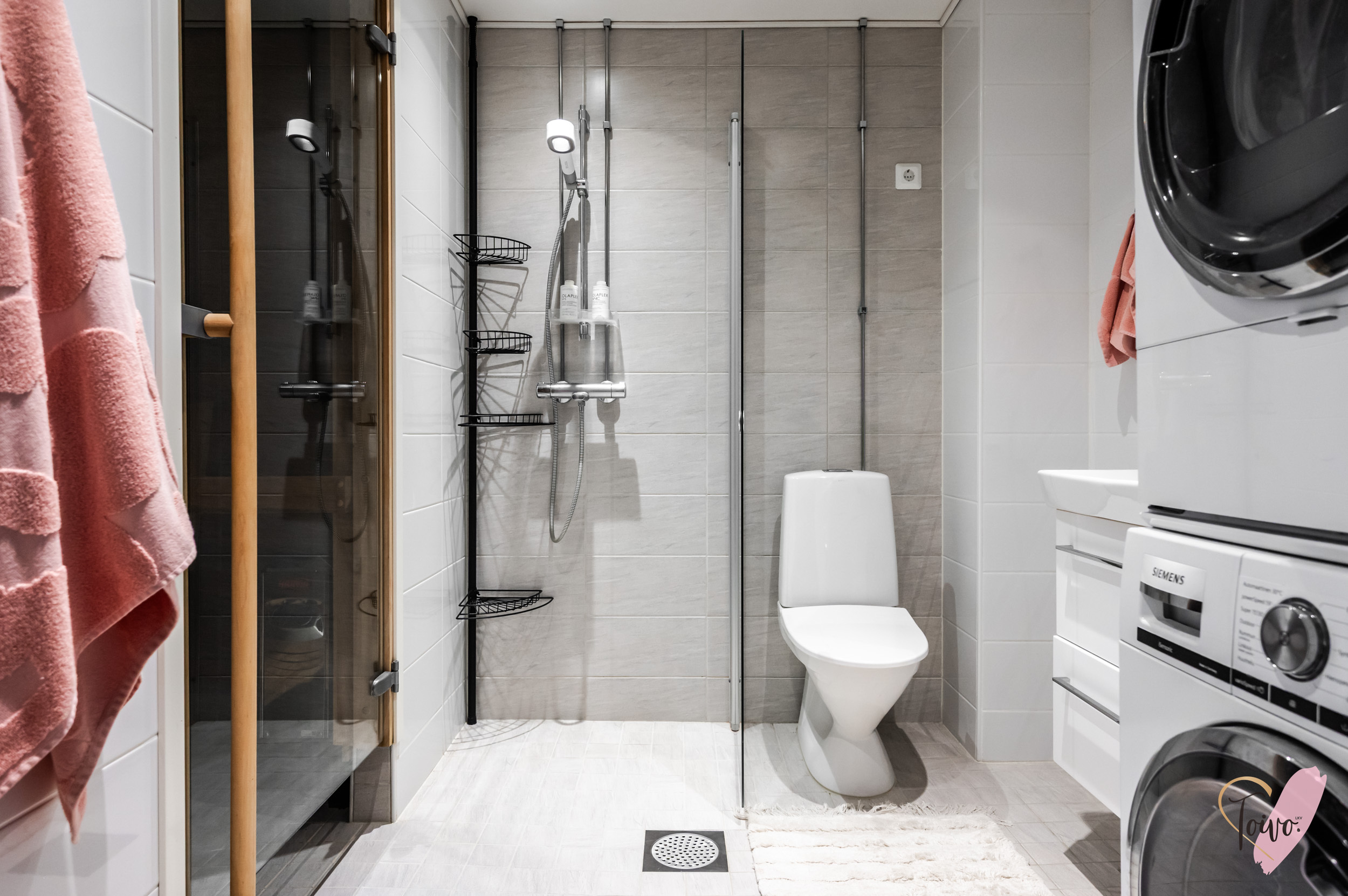 Varusteet: suihkuseinä, pesukoneliitäntä, lattialämmitys, wc-istuin, suihku