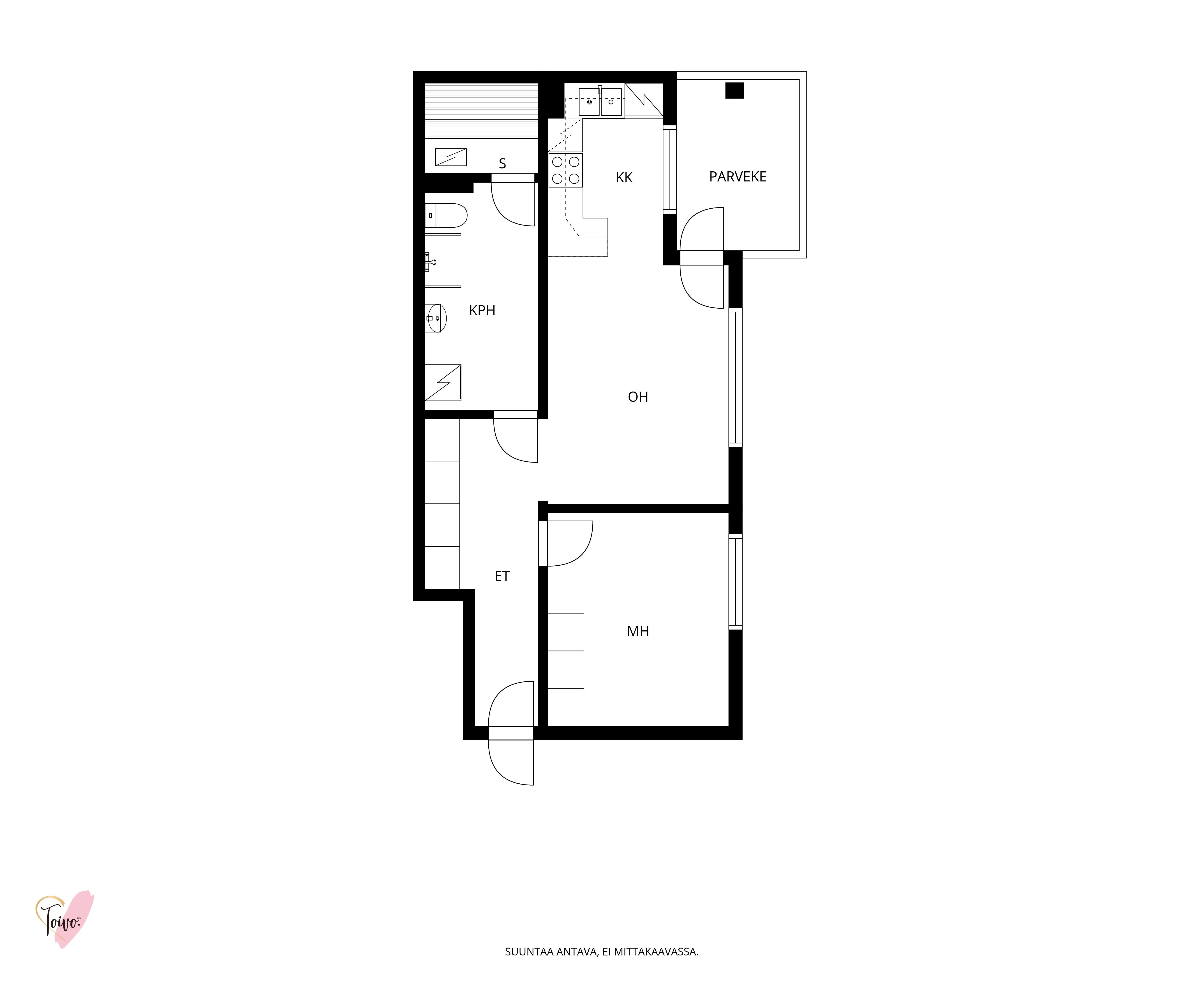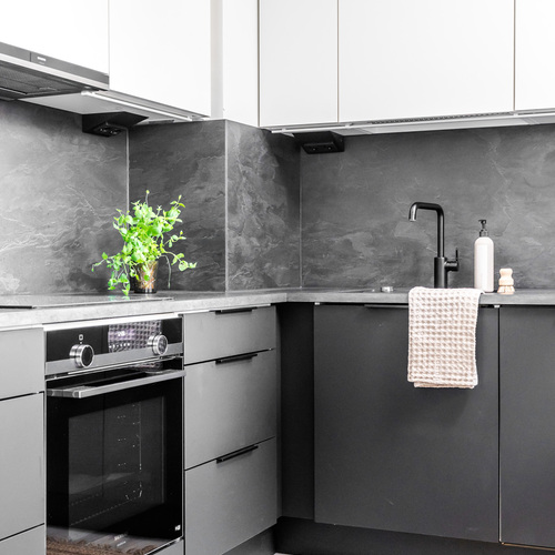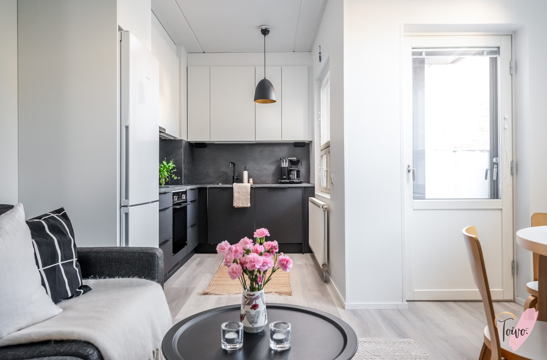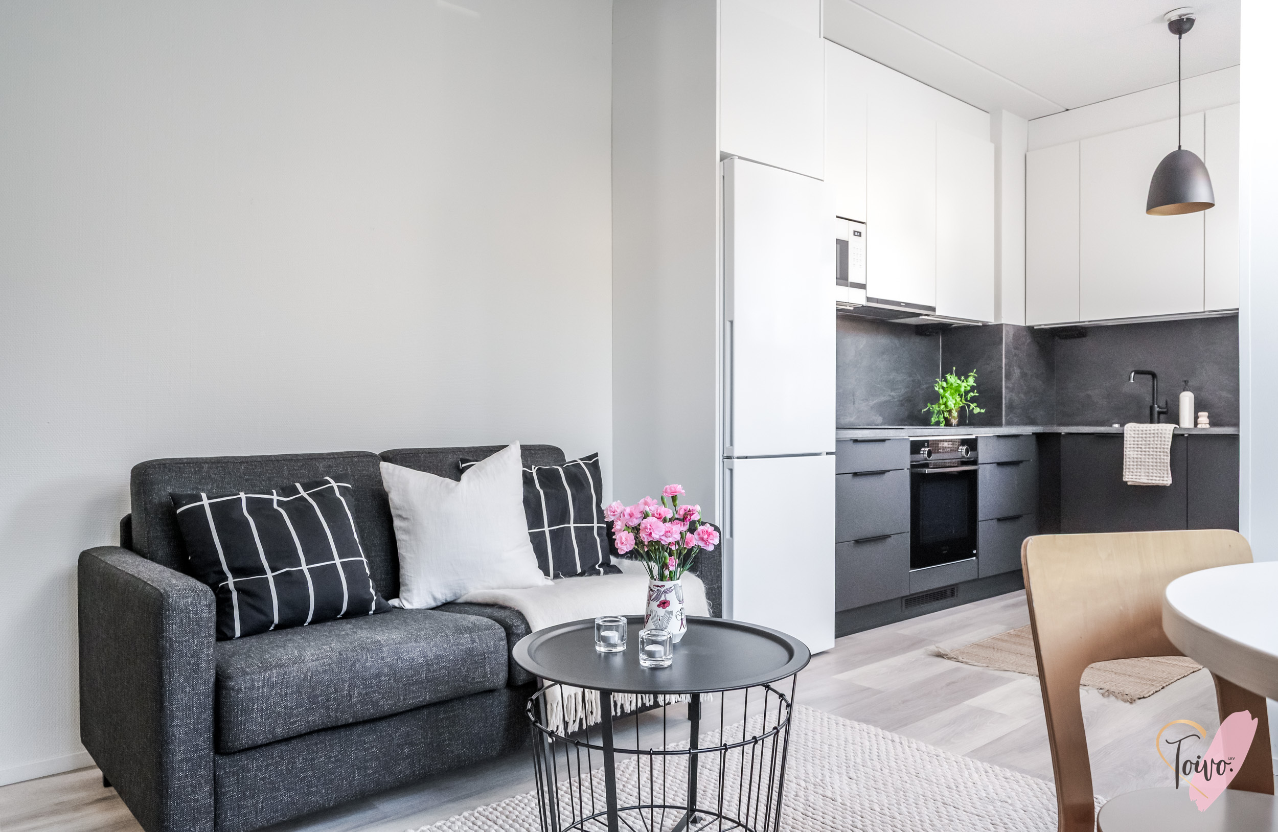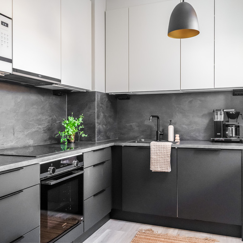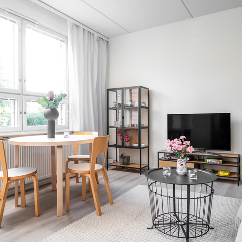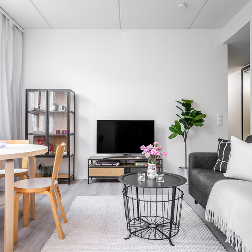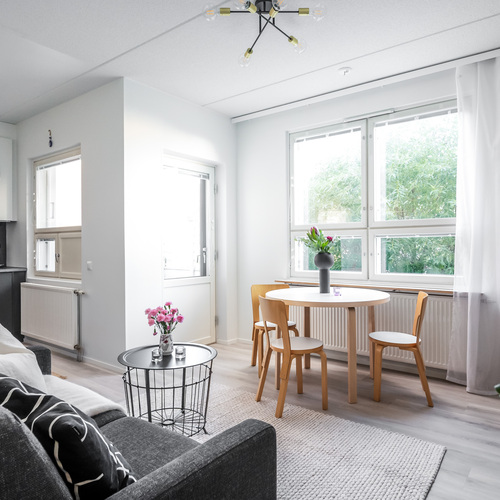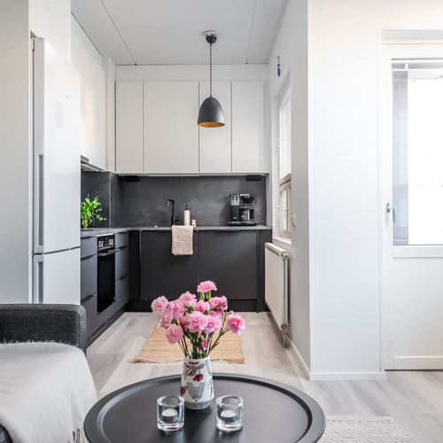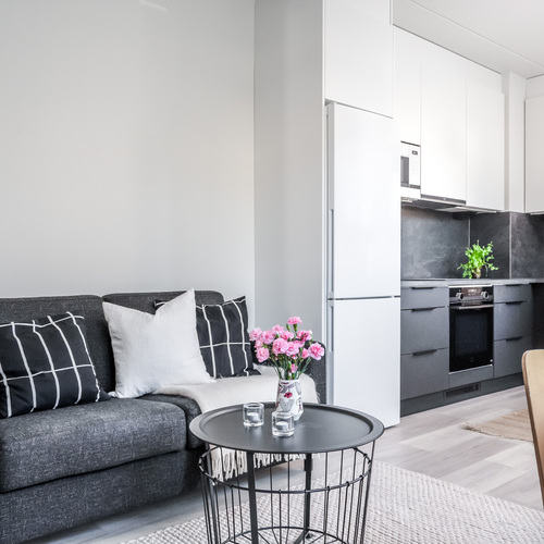 Asunnon sydän on valoisa olohuone, josta avautuu sujuvasti yhteys moderniin, tummansävyiseen keittiöön. Keittiössä yhdistyvät tyyli ja käytännöllisyys, muodostaen kompaktin kokonaisuuden, jossa on kaikki tarpeellinen ruoanlaittoon ja mahdollisuus olohuoneessa tapahtuvaan seurusteluun. Keittiön ikkunasta aukeaa näkymä asunnon parvekkeelle, jota voi silloin tällöin käyttää toisena sisäänkäyntinä. Ensimmäisen kerroksen ansiosta parvekkeelta on tehty kätevä uloskäynti, joka tuo lisämukavuutta niin arkeen kuin kesäpäivien oleskeluun.