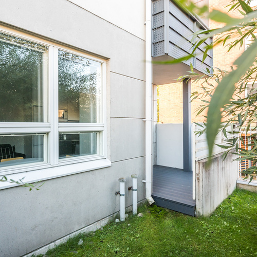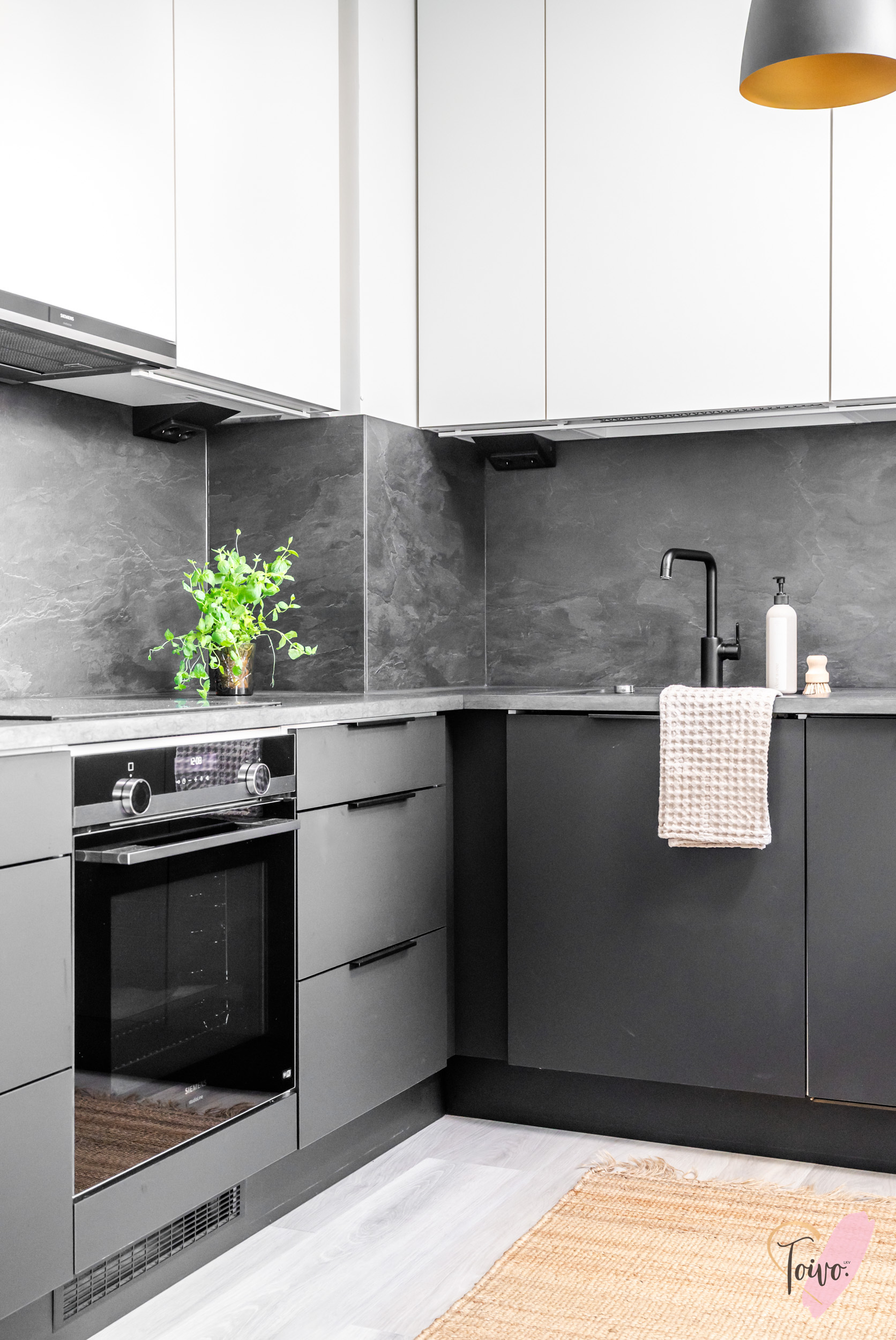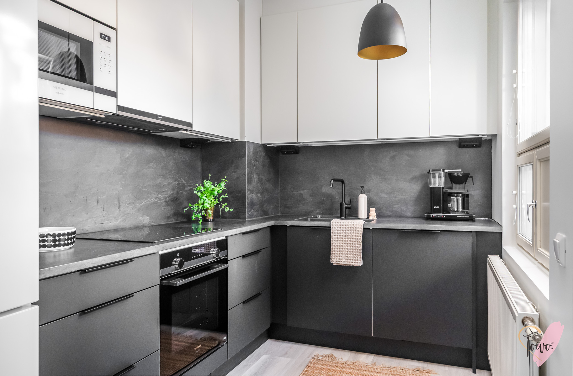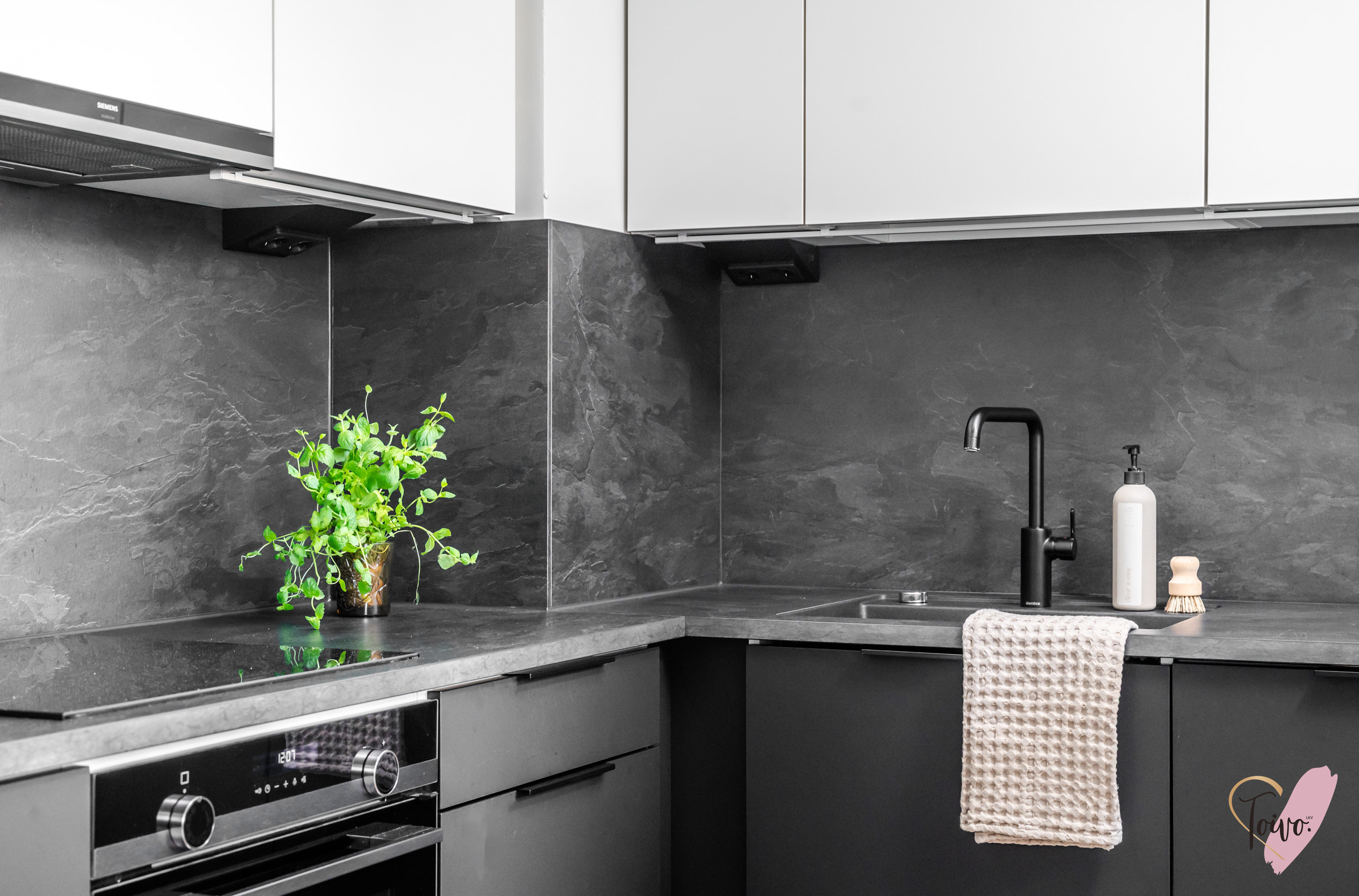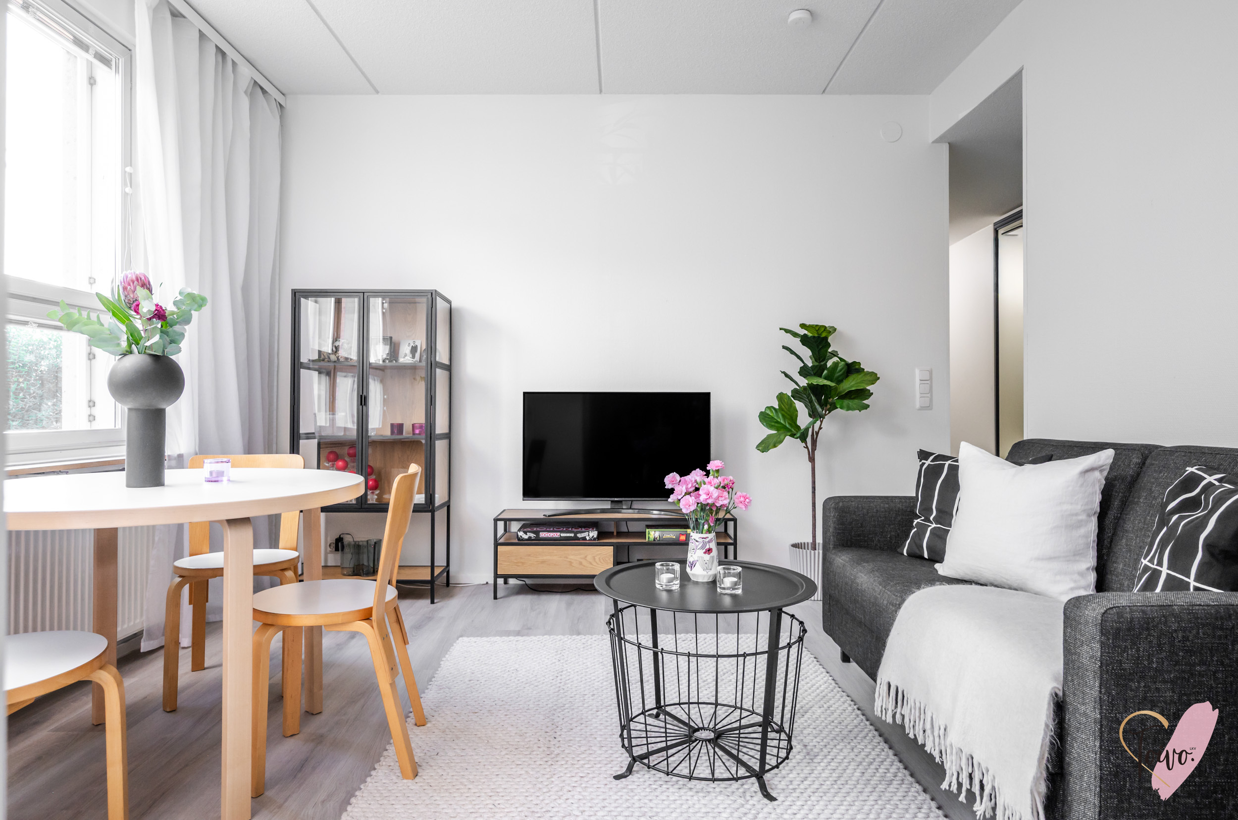 Asunnon sydän on valoisa olohuone, josta avautuu sujuvasti yhteys moderniin, tummansävyiseen keittiöön. Keittiössä yhdistyvät tyyli ja käytännöllisyys, muodostaen kompaktin kokonaisuuden, jossa on kaikki tarpeellinen ruoanlaittoon ja mahdollisuus olohuoneessa tapahtuvaan seurusteluun. Keittiön ikkunasta aukeaa näkymä asunnon parvekkeelle, jota voi silloin tällöin käyttää toisena sisäänkäyntinä. Ensimmäisen kerroksen ansiosta parvekkeelta on tehty kätevä uloskäynti, joka tuo lisämukavuutta niin arkeen kuin kesäpäivien oleskeluun.