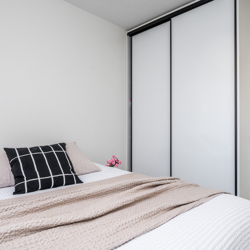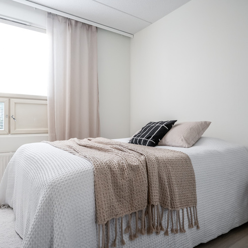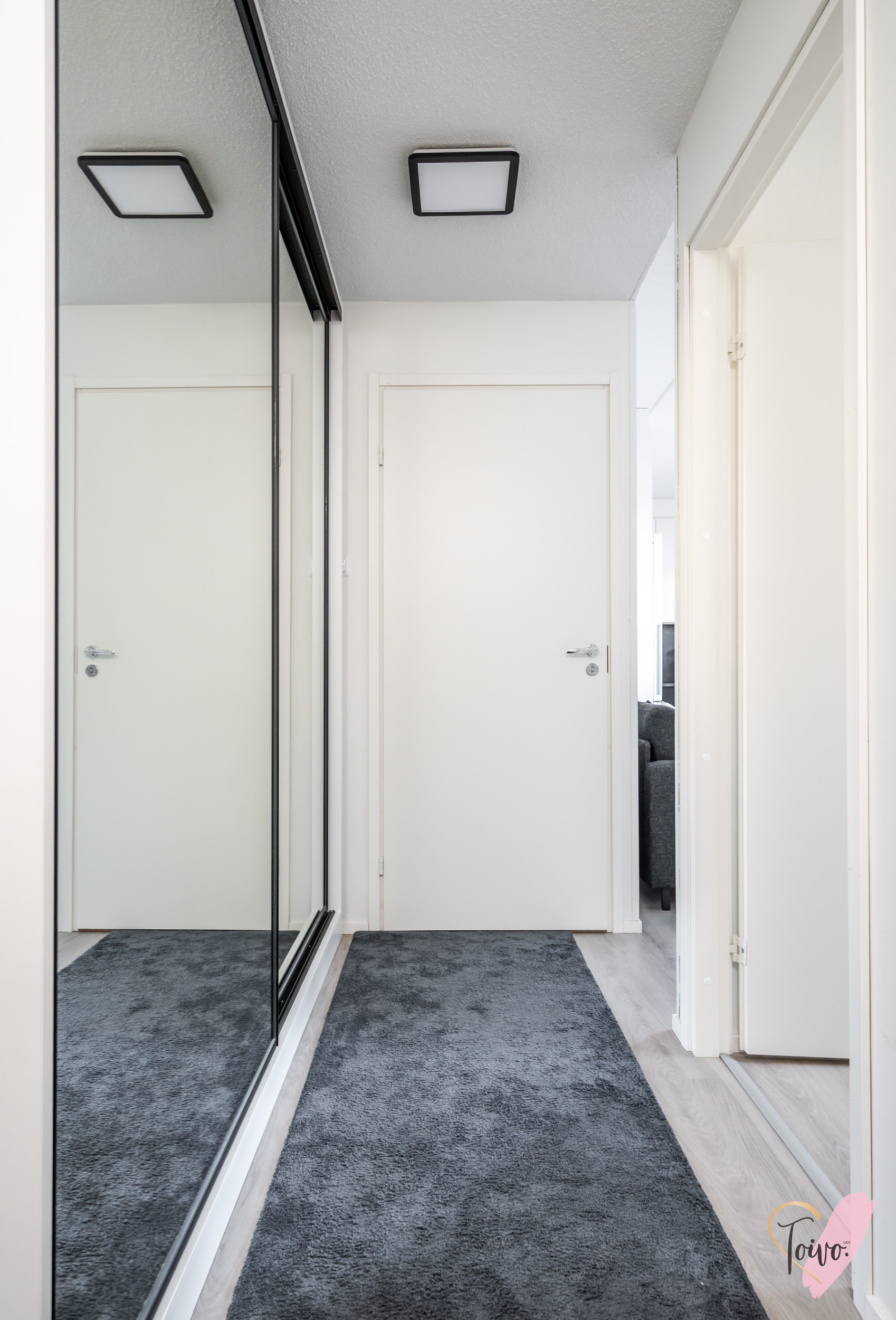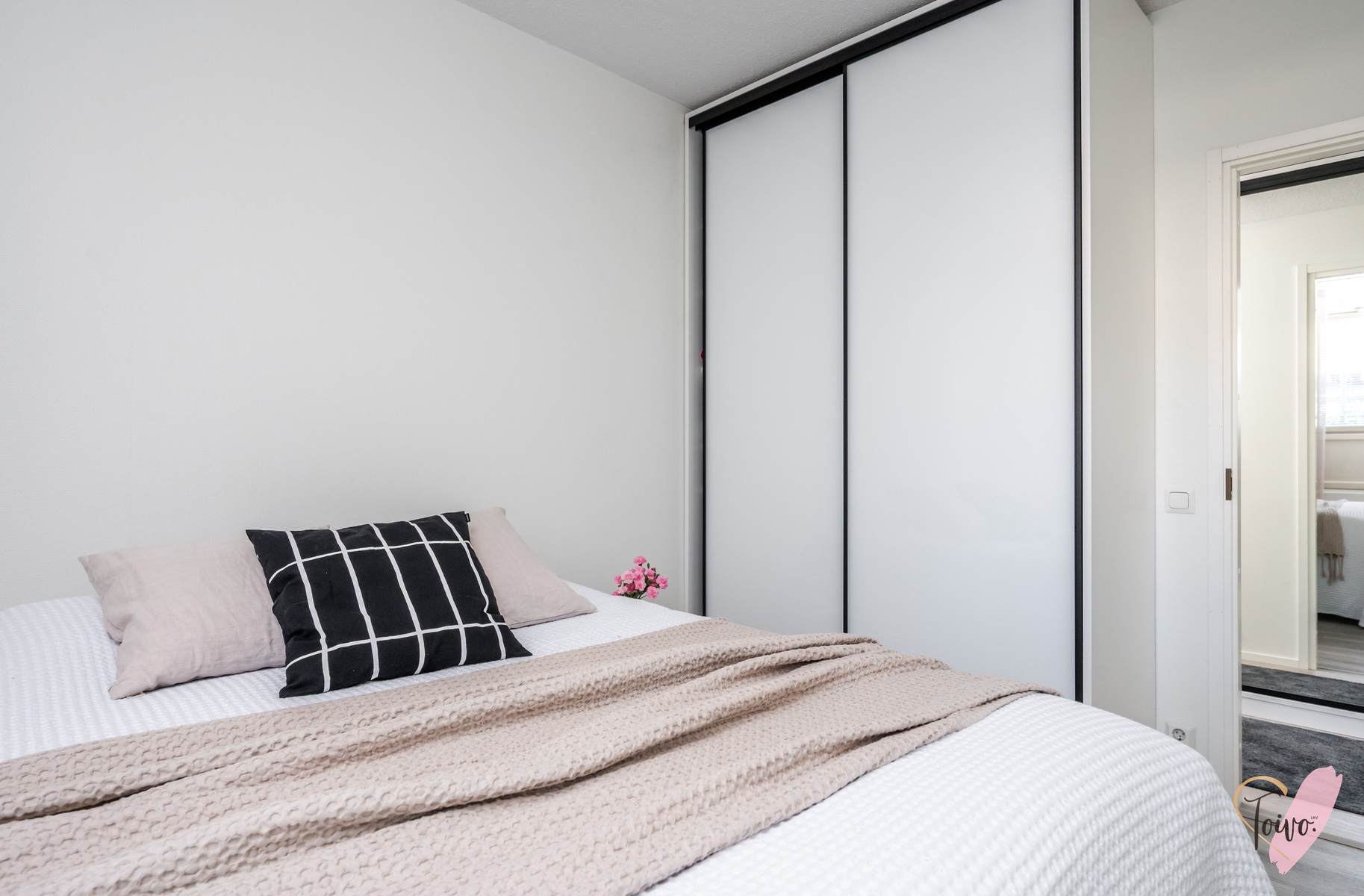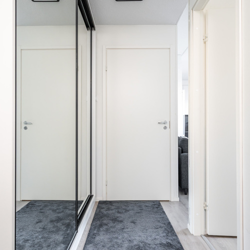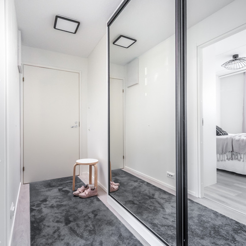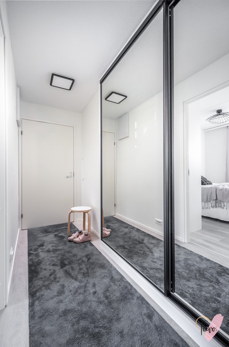Asuntoon astutaan linjakkaan eteiskäytävän kautta, jossa toisen seinustan kattoon saakka olevat peilikaapit tuovat runsaasti säilytystilaa ja avaruuden tuntua. Käytävältä aukeaa rauhallinen makuuhuone, jossa on suuri ikkuna tuomassa luonnonvaloa sekä tyylikkäät liukuovikaapistot, jotka tarjoavat erinomaisen säilytystilan myös makuuhuoneen puolella.