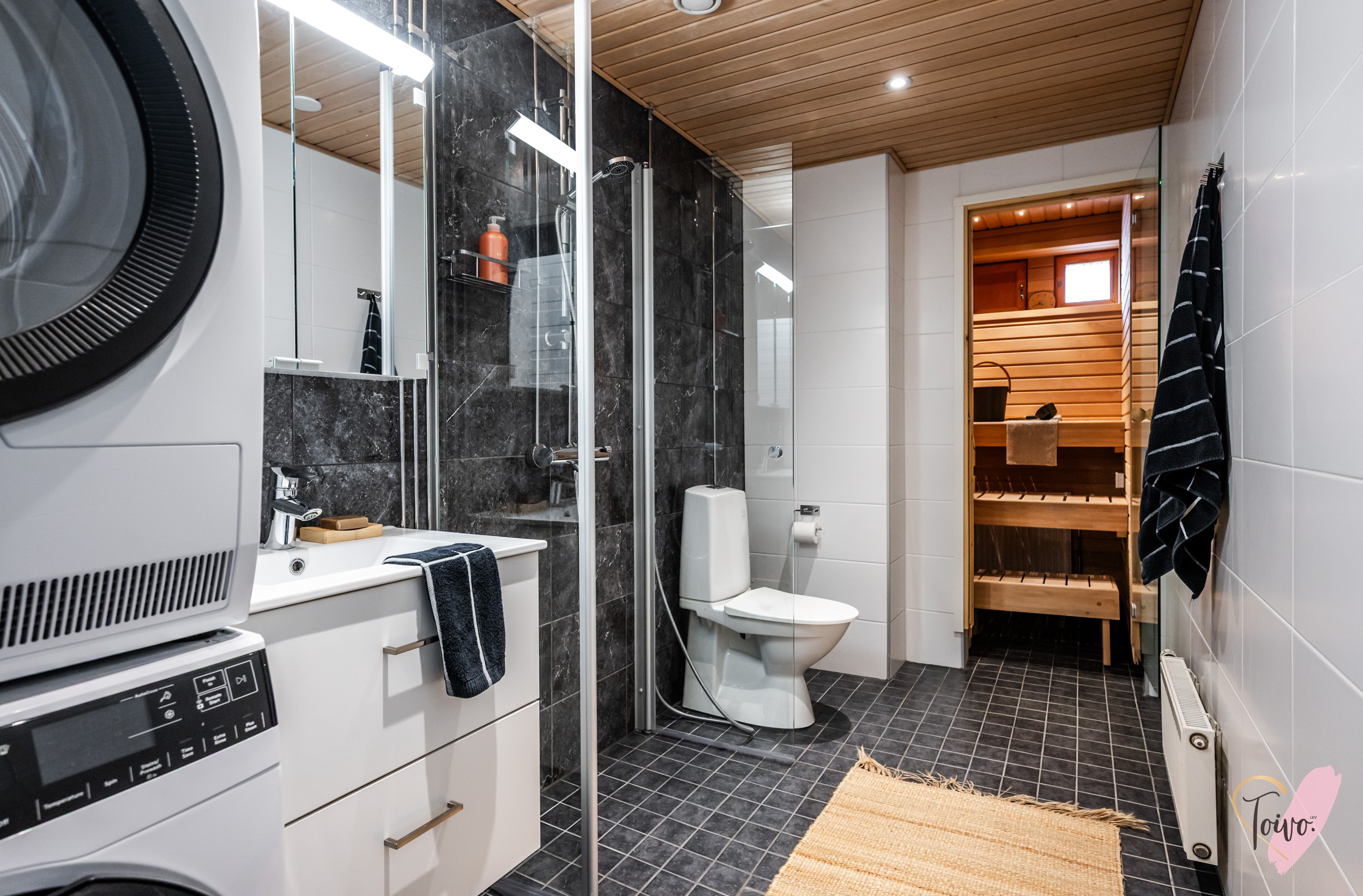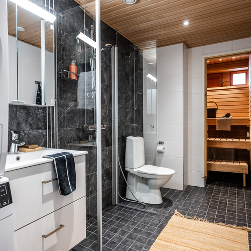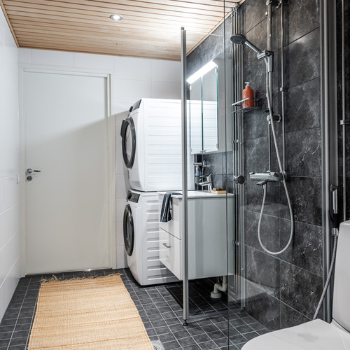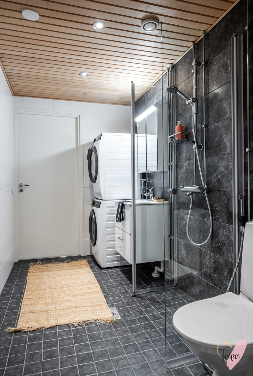 Käytävän päässä avautuu pari vuotta sitten ylellisesti remontoitu kylpyhuone, joka hurmaa spa-henkisellä tunnelmallaan. Tummat laatat ja modernit pinnat luovat täydellisen paikan rauhoittumiselle kiireisen päivän päätteeksi. Kylpytilan kruunaa oma sauna, joka kutsuu nauttimaan lämpimistä löylyistä omassa rauhassa. Arjen käytännöllisyyttä lisää tilava pesutorni, jolle on varattu oma selkeä paikkansa.