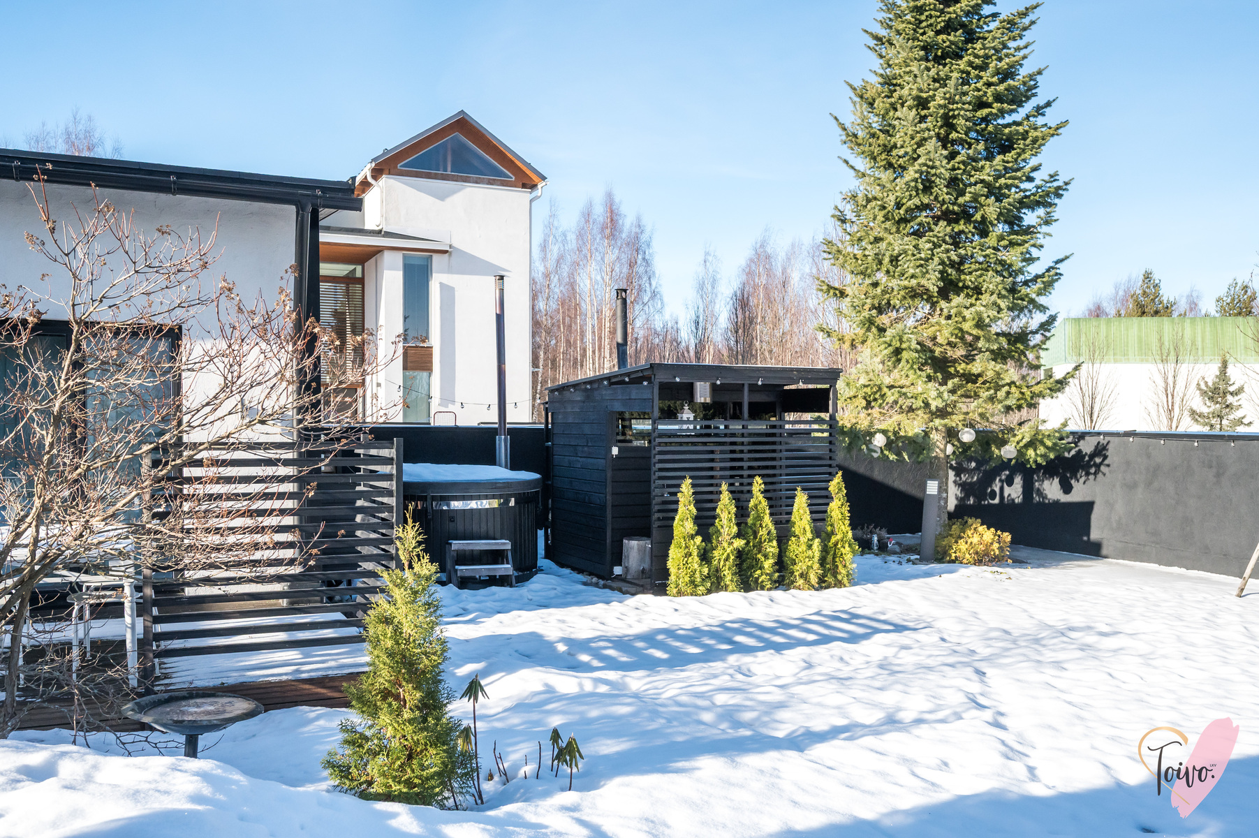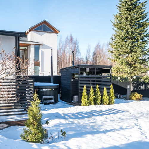 Suojainen pyöräkatos, pieni pihasauna ja palju.