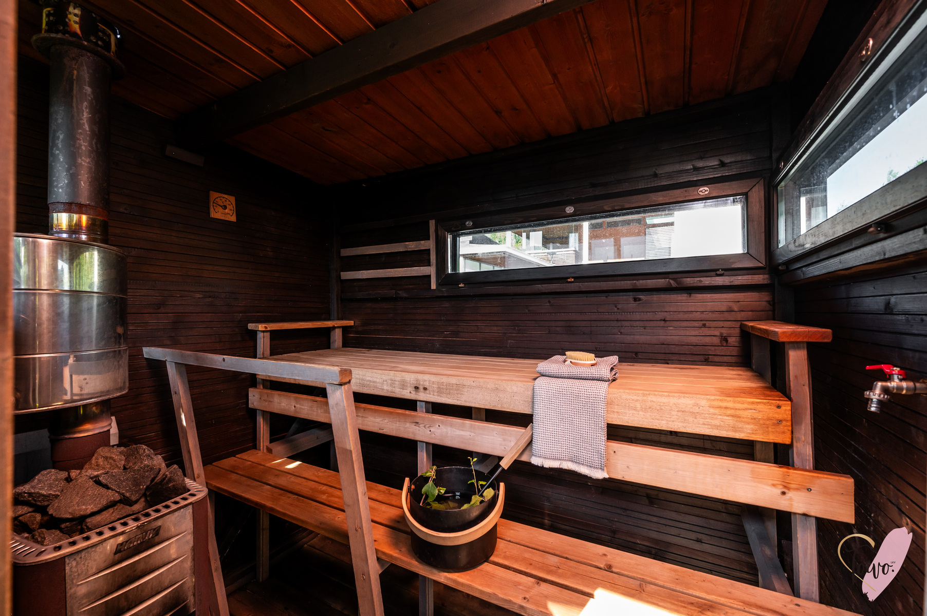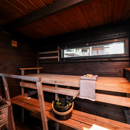 SähkökiuasOi mikä sauna! Täältä maisema avautuu Toppilansalmeen ja kesäisin ohi lipuvia veneitä on mukava seurata saunanlauteilta samalla kun kaunis pilarikiuas takaa pehmeät löylyt.