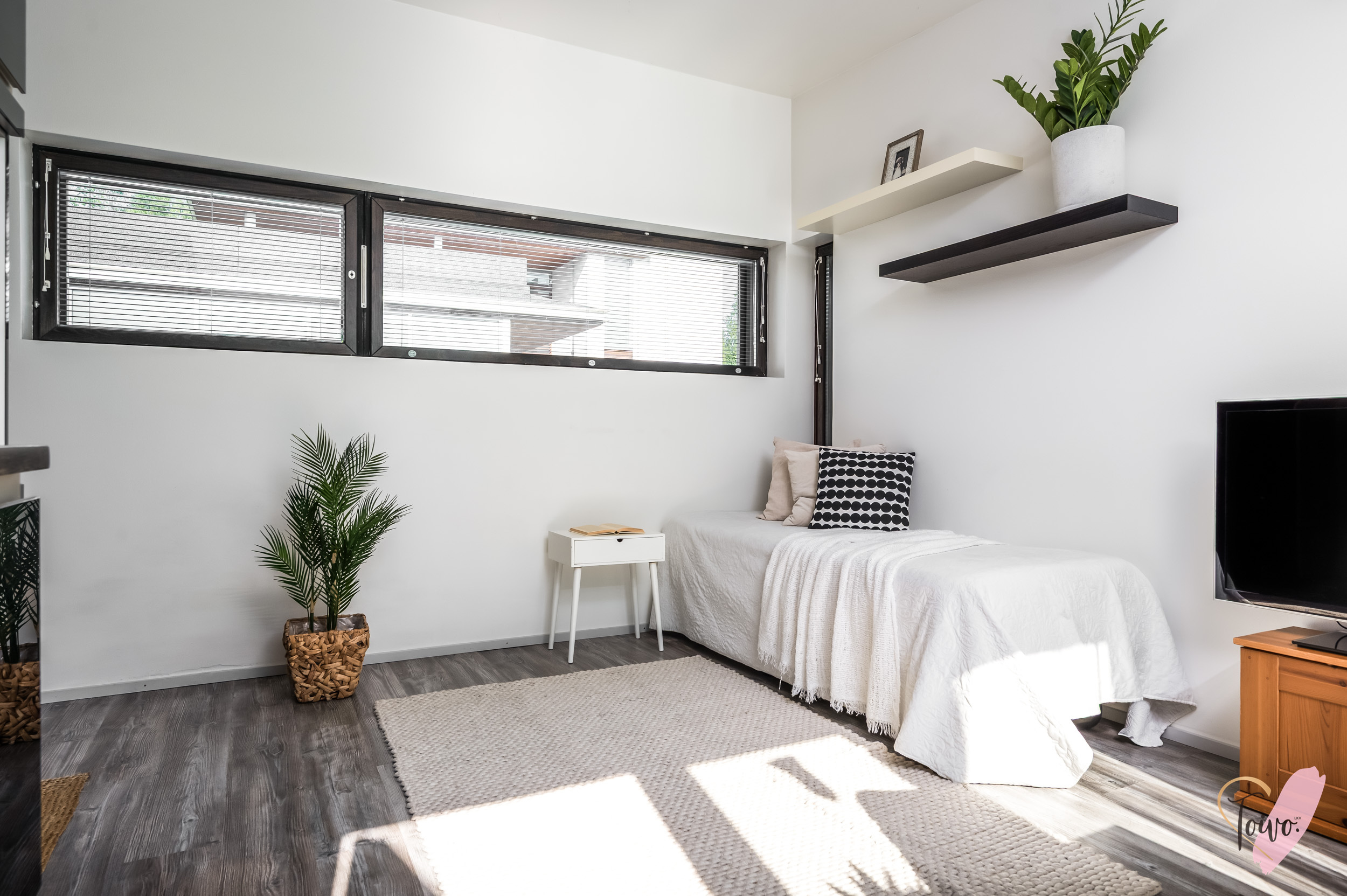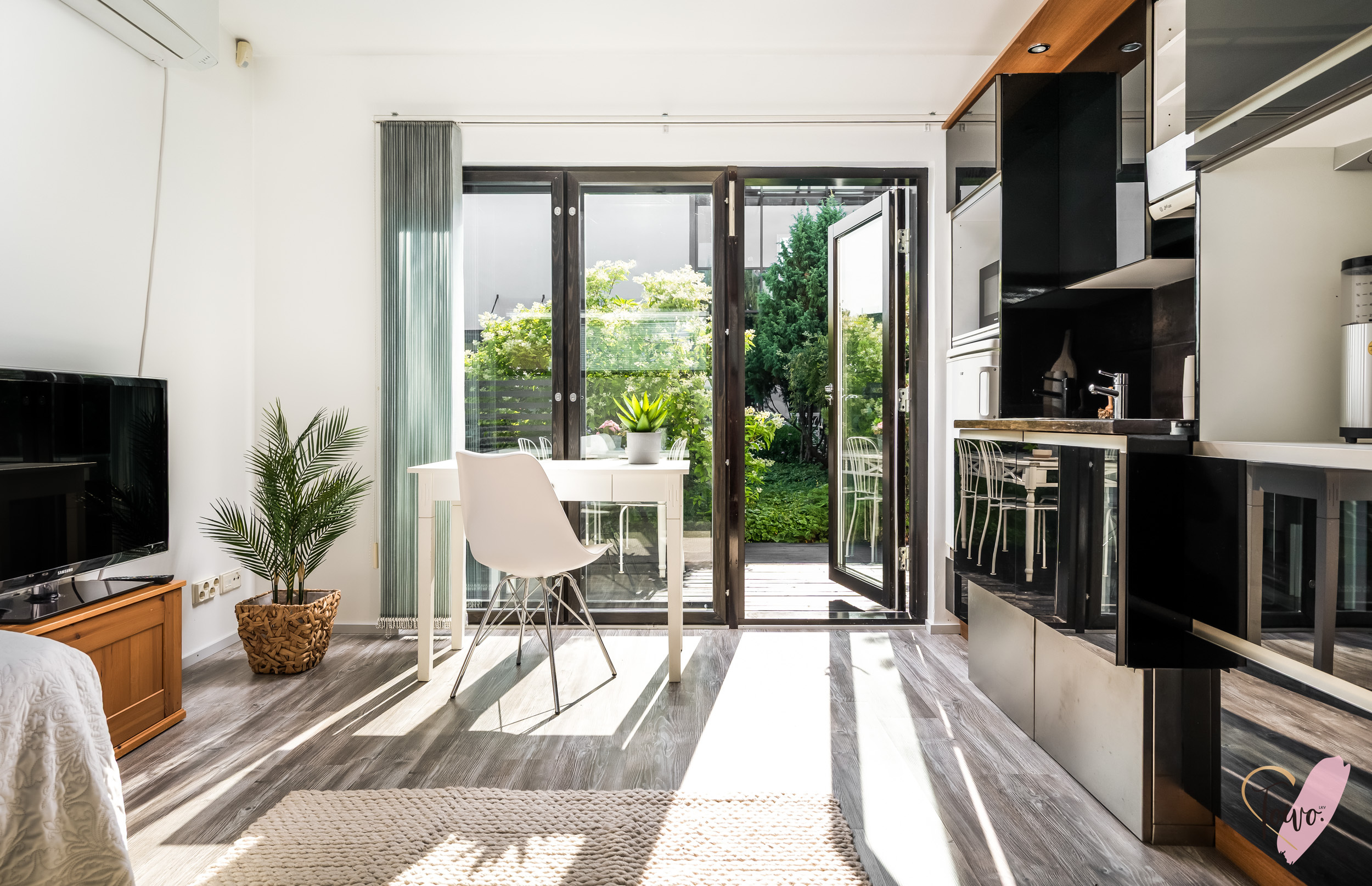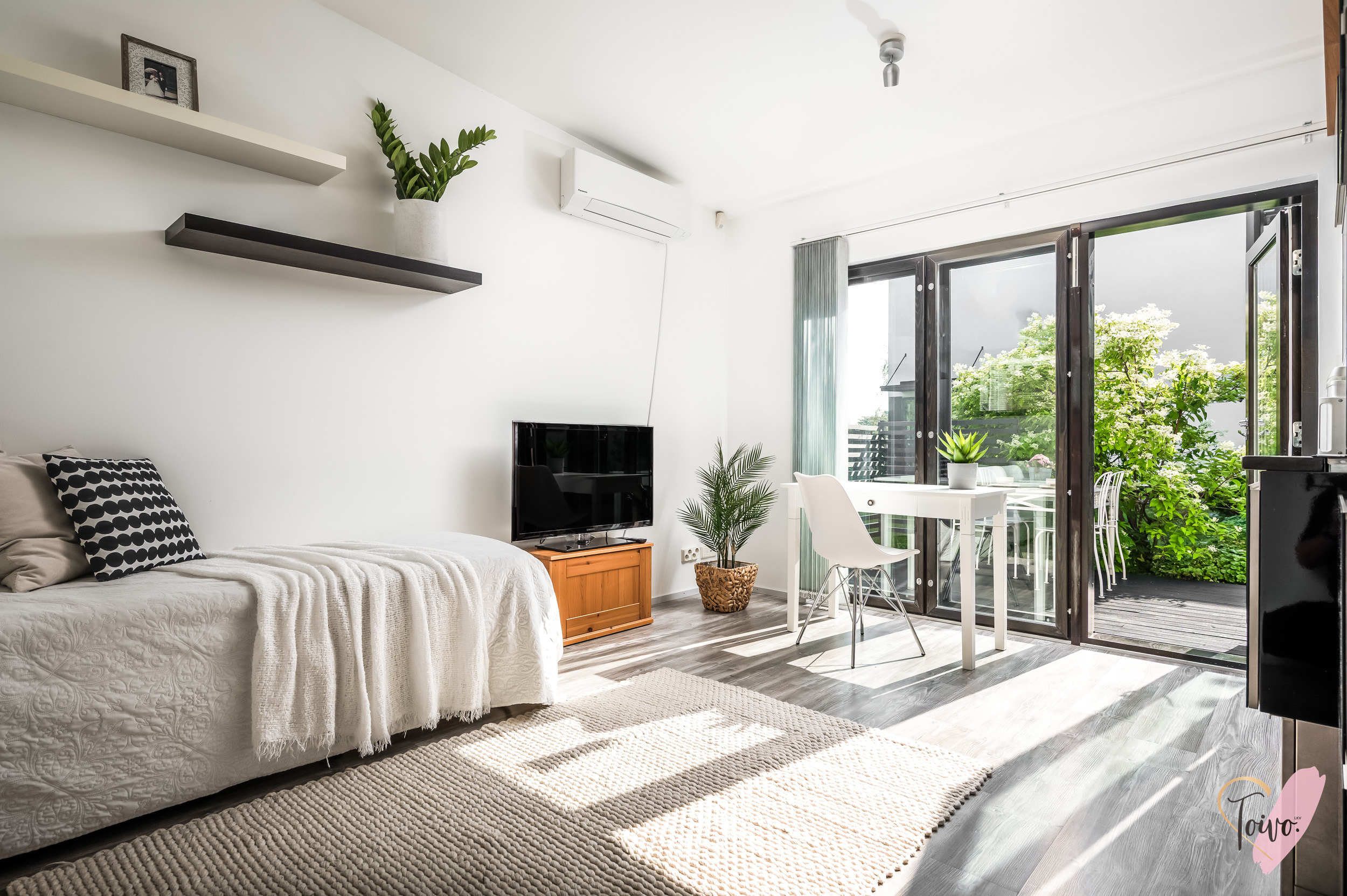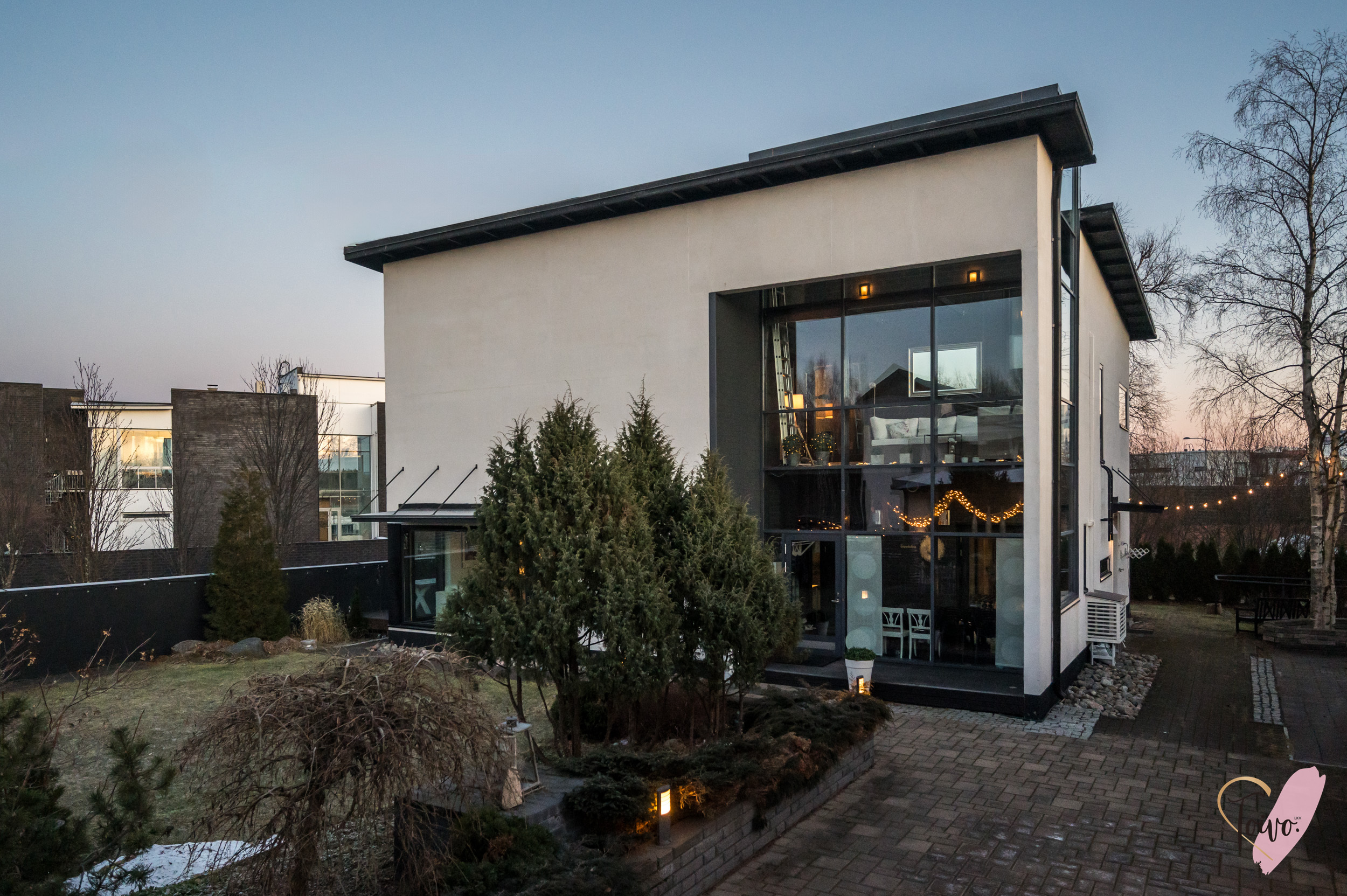 Varusteet: kaapistot, sälekaihtimet/rullaverhot, kiinteät valaisimet, ilmalämpöpumppu, istutukset