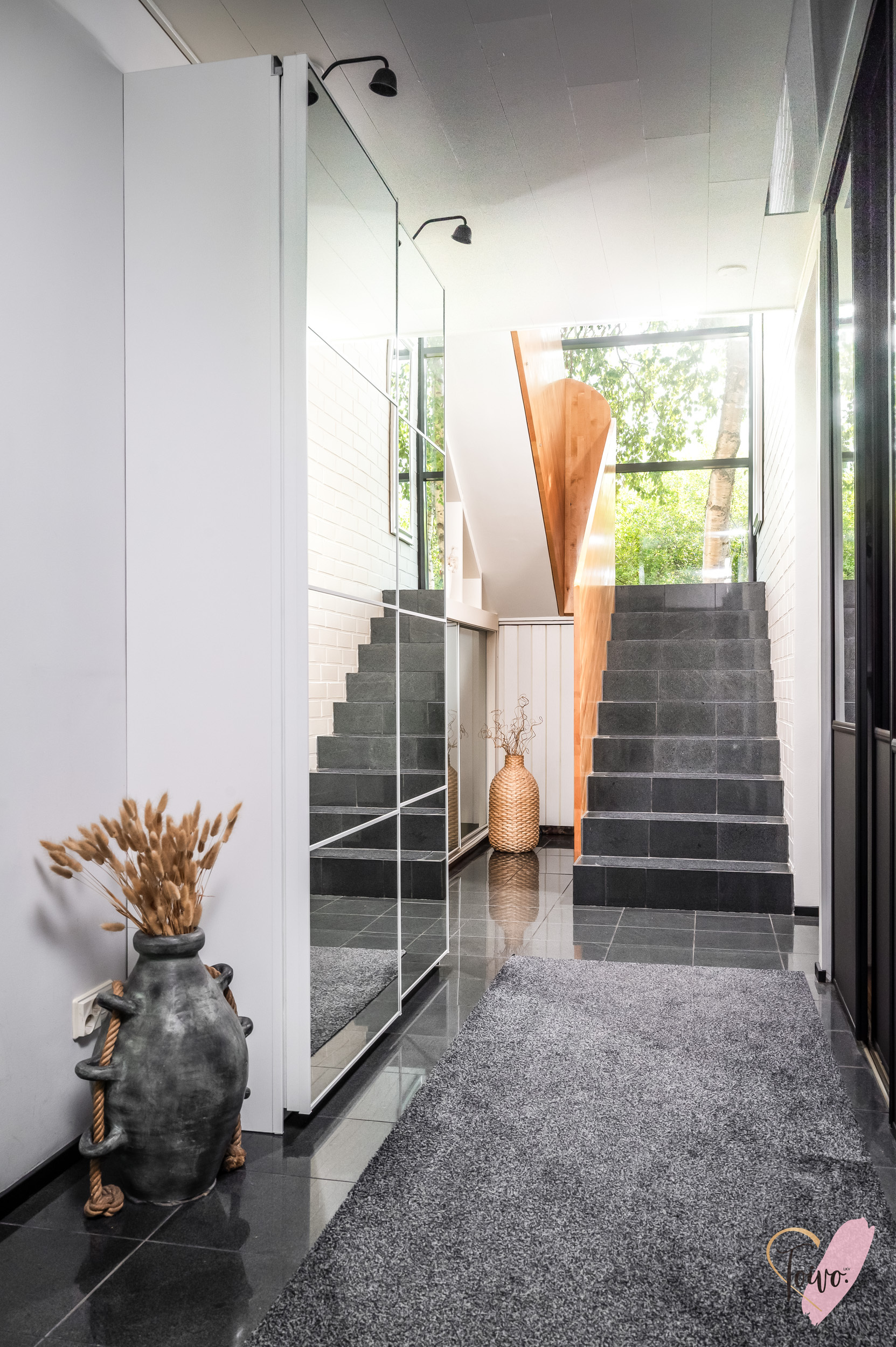 Mustat laatoitetut portaat johdattavat kodin yläkertaan, jonka porrastasanteelta avautuu kaunis näkymä Toppilansalmeen.