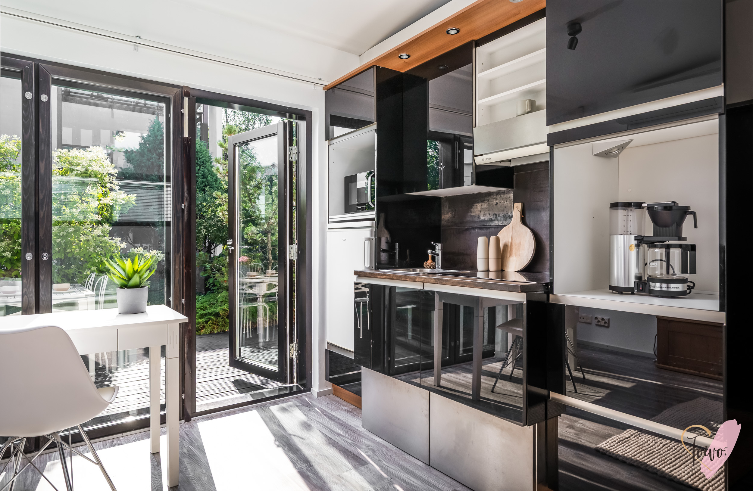 Keittiö on oma tilansa olohuoneen ja ruokailutilan välissä. Valkoiset täyspuiset kaapistot ja kalusteisiin mukavalla käyttökorkeudelle integroidut kodinkoneet takaavat miellyttävän käytettävyyden ja suora yhteys terassille tekee siitä kesäisin täydellisen paikan ruokailuun ja yhdessäoloon. Ympäri vuoden lisäksi käytössä on ihanan tilava ruokailutila, jossa huoletta voi olla 10 hengen ruokapöytä, jonka ääreen kokoontua.
