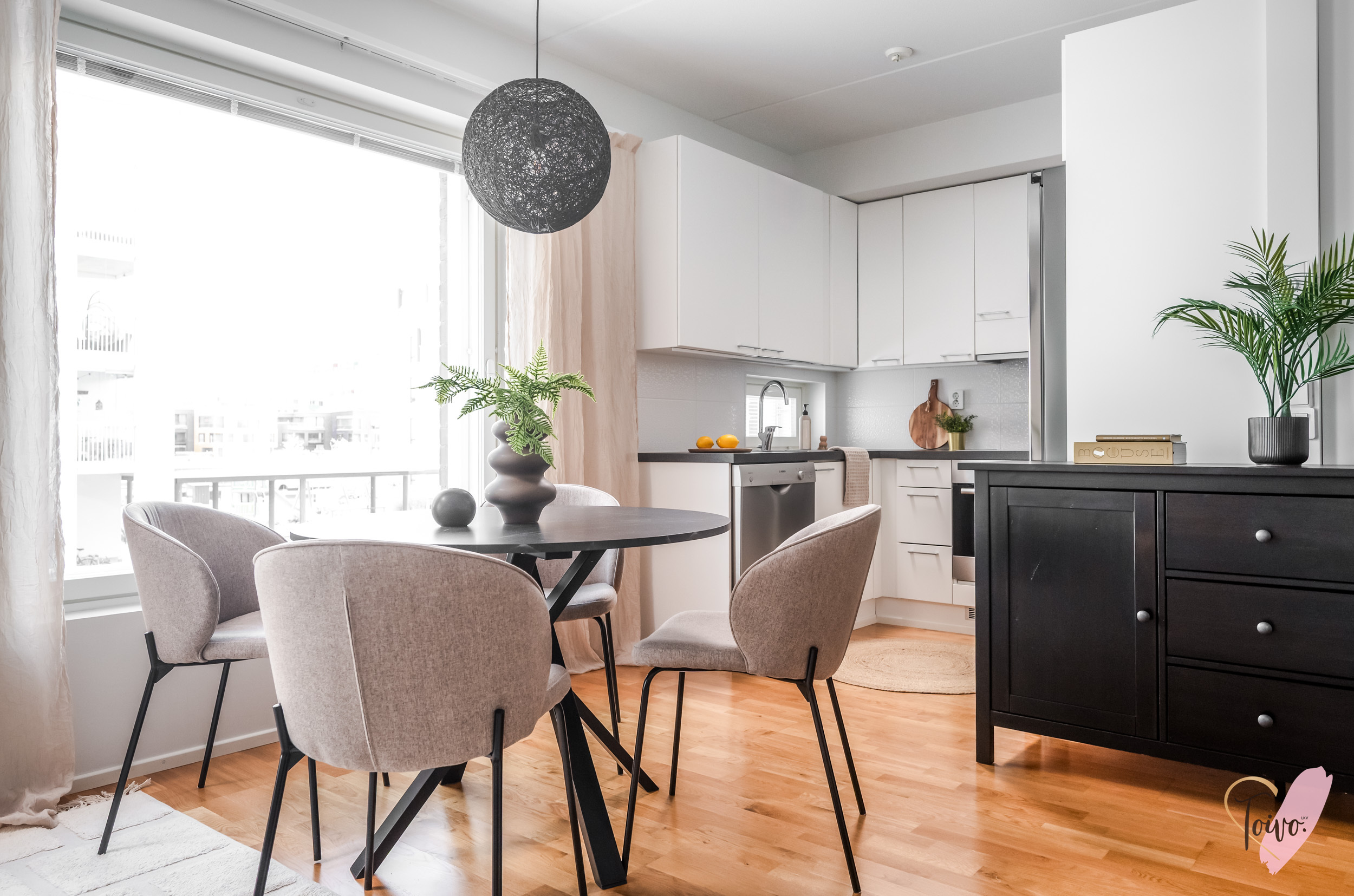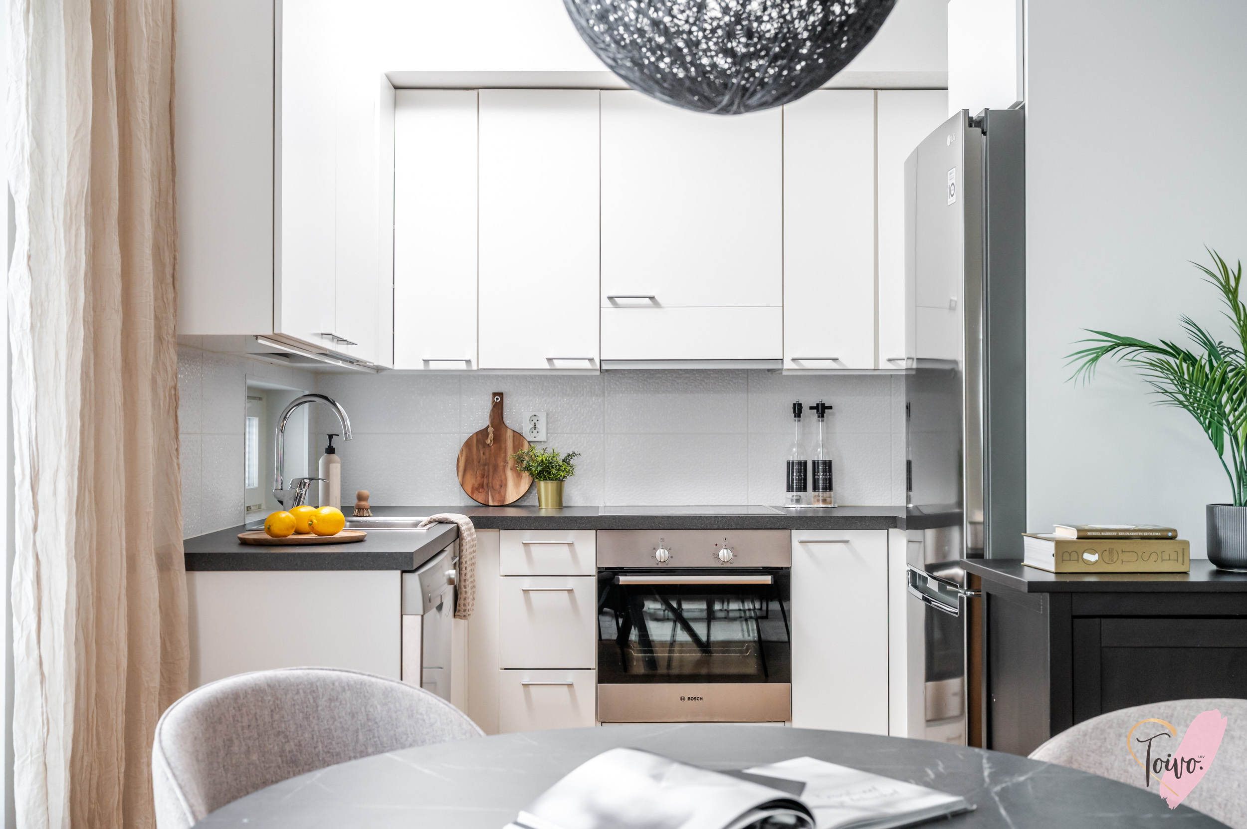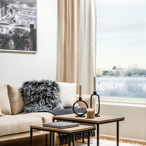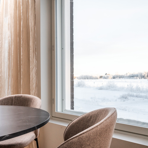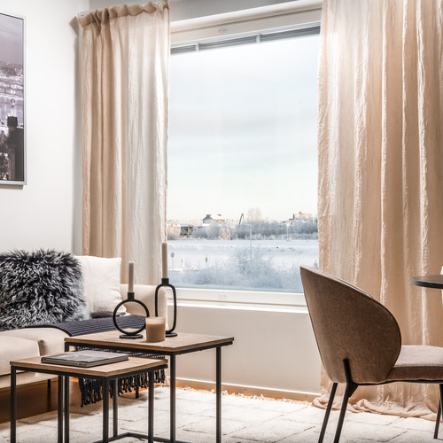 Keittiö hurmaa U-muotoisella pohjaratkaisullaan, jossa valkoiset kaapistot ja tummat työtasot muodostavat ajattoman tyylikkään kokonaisuuden. Vaakaikkunasta avautuva näkymä Toppilansalmen suuntaan tuo tilaan luonnonvaloa ja lisää avaruuden tuntua. Olohuoneen suuret maisemaikkunat päästävät valon tulvimaan sisään ja jatkuvat saumattomasti ruokailutilaan, luoden avaran ja viihtyisän sydämen kodille.